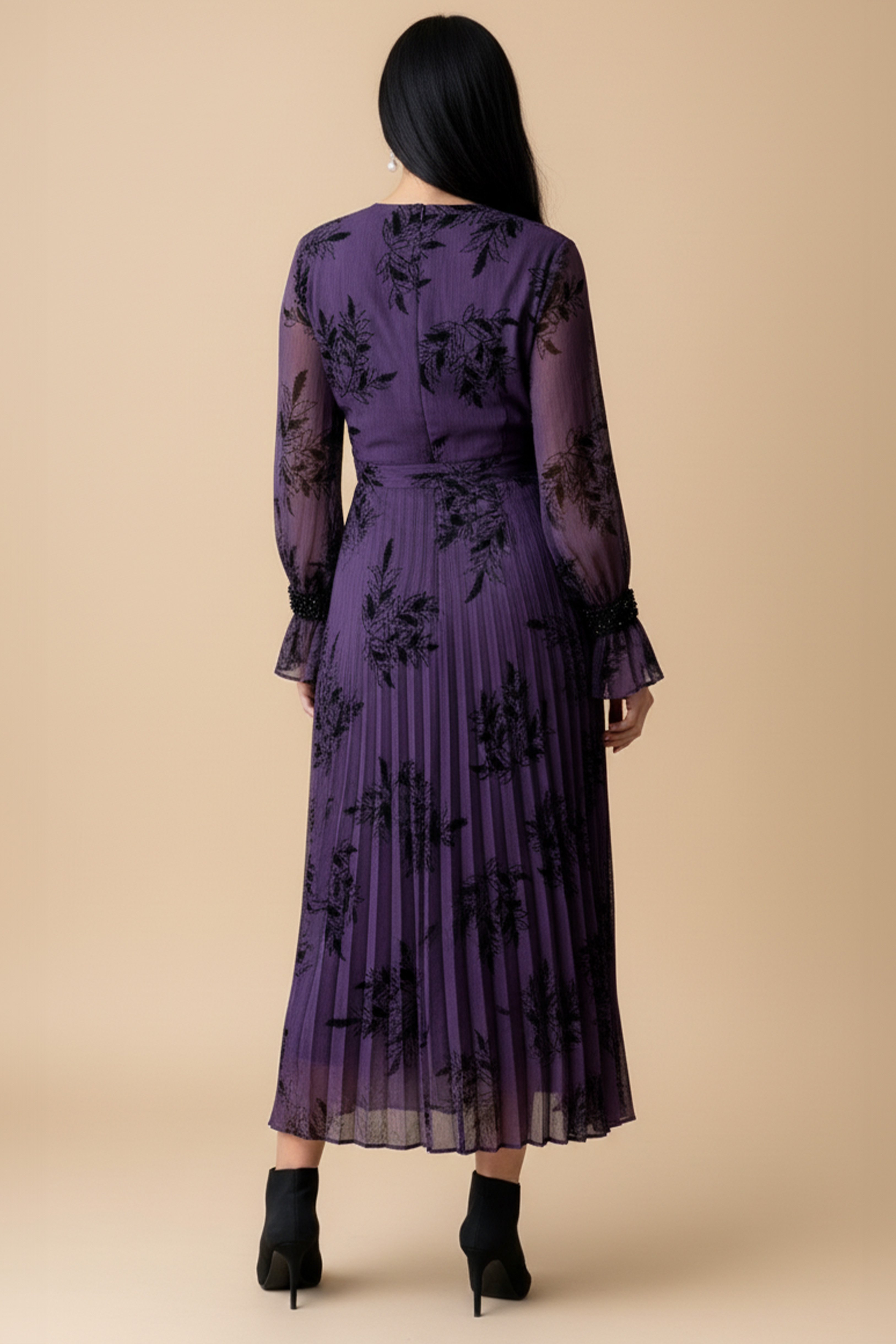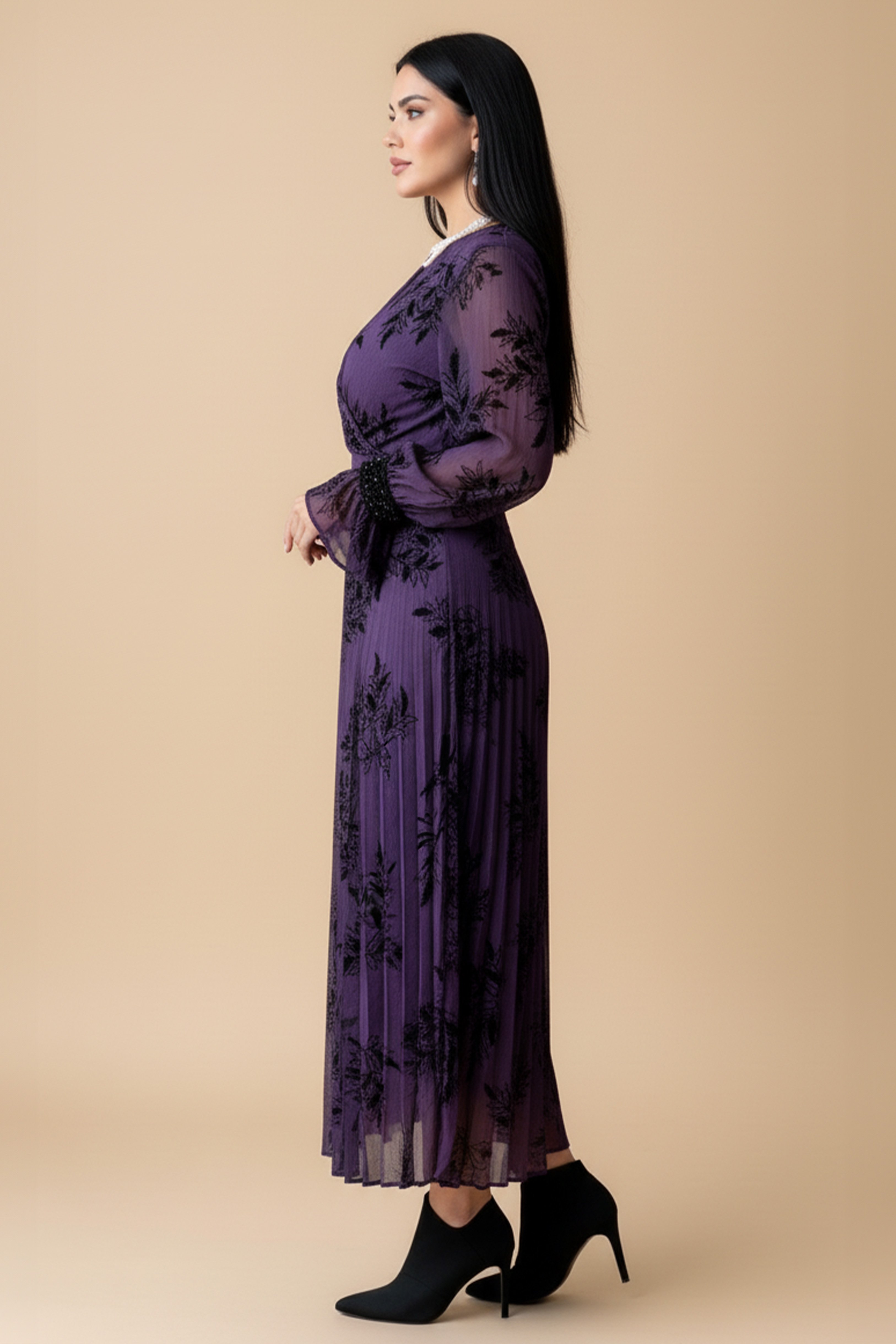نوع القصة: فستان ماكسي بطبعة ورق شجر وكسرات من الجانب مزين بكريستال أسود.
