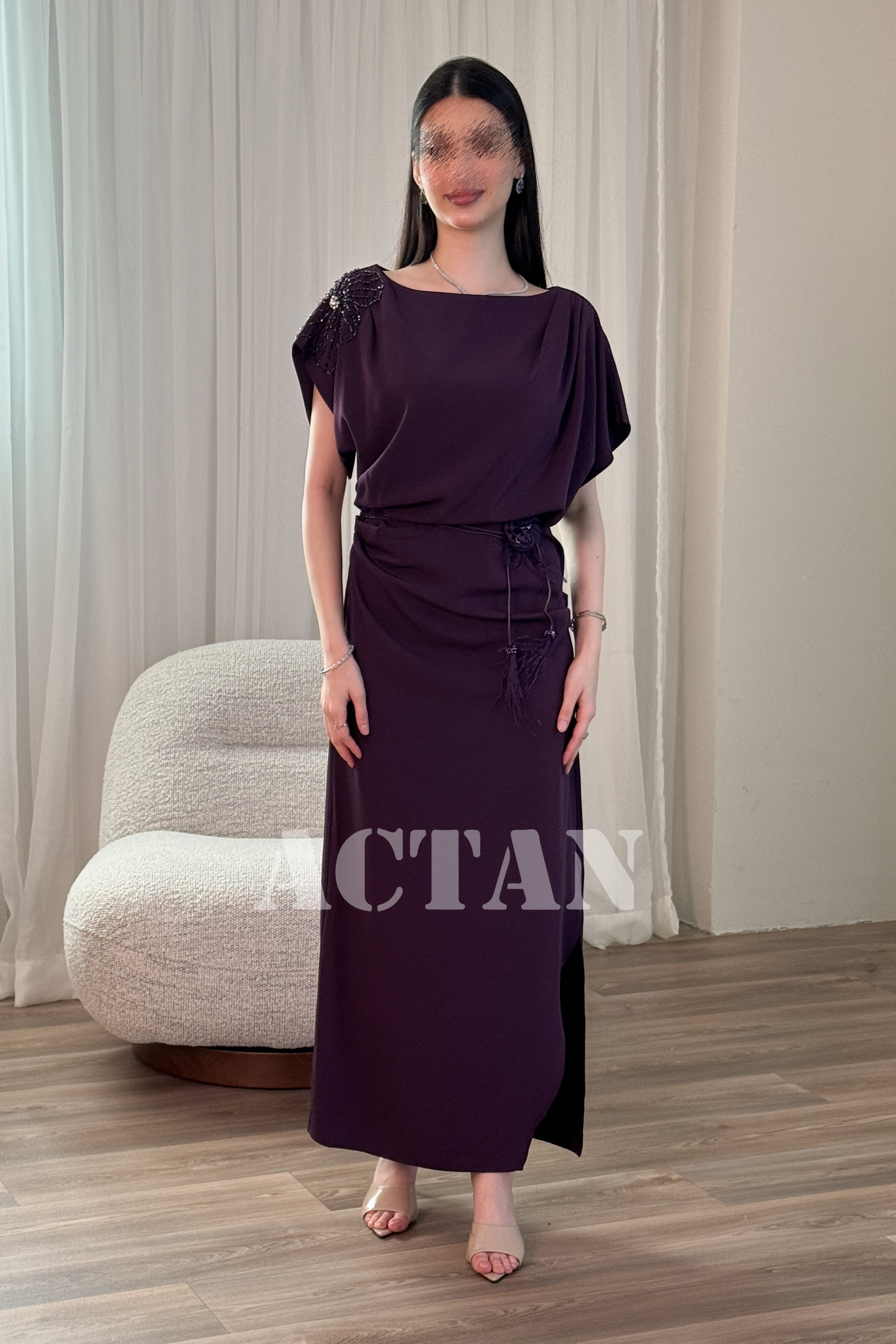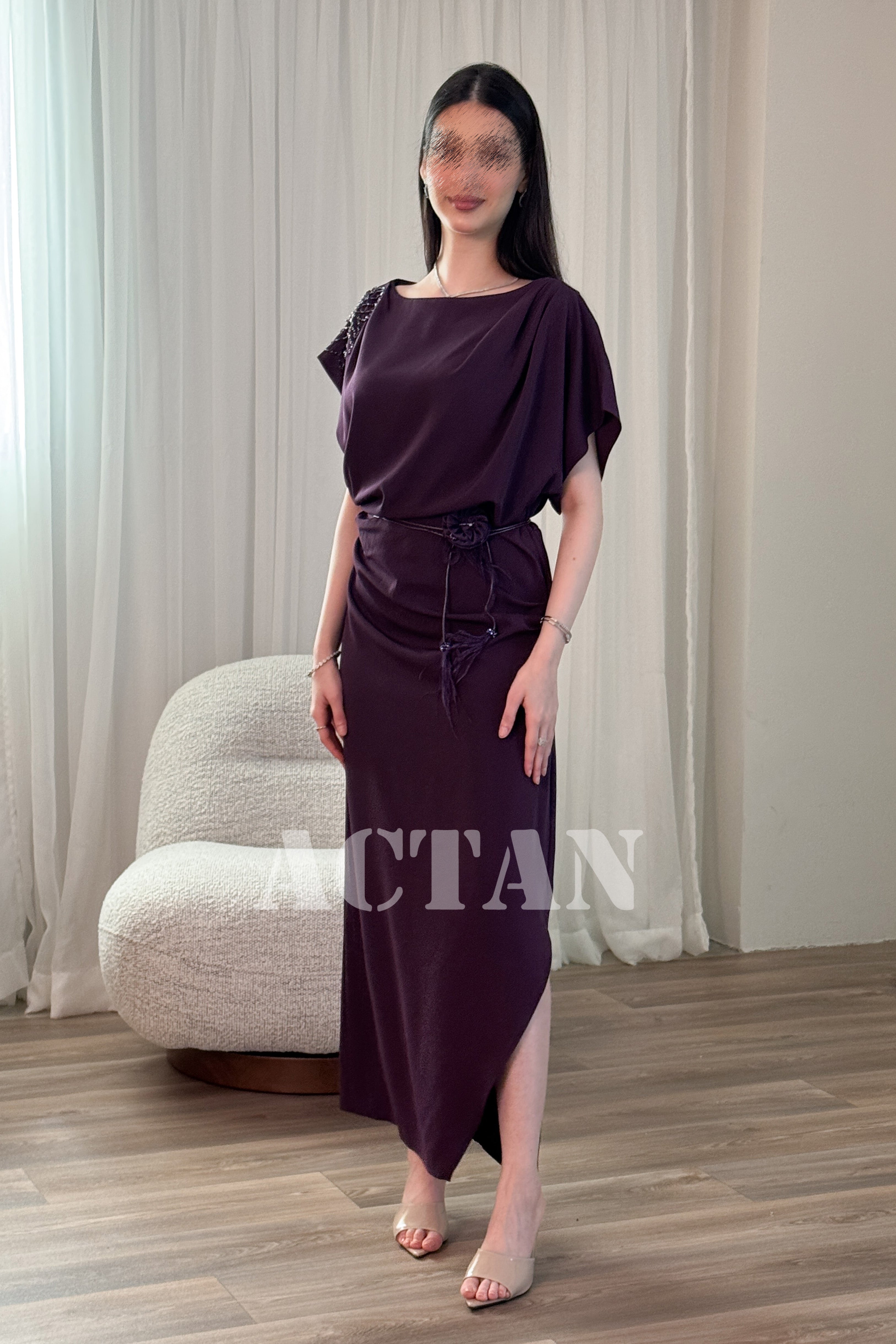 فستان ماكسي بكتف مزين بورد لون بنفسجي