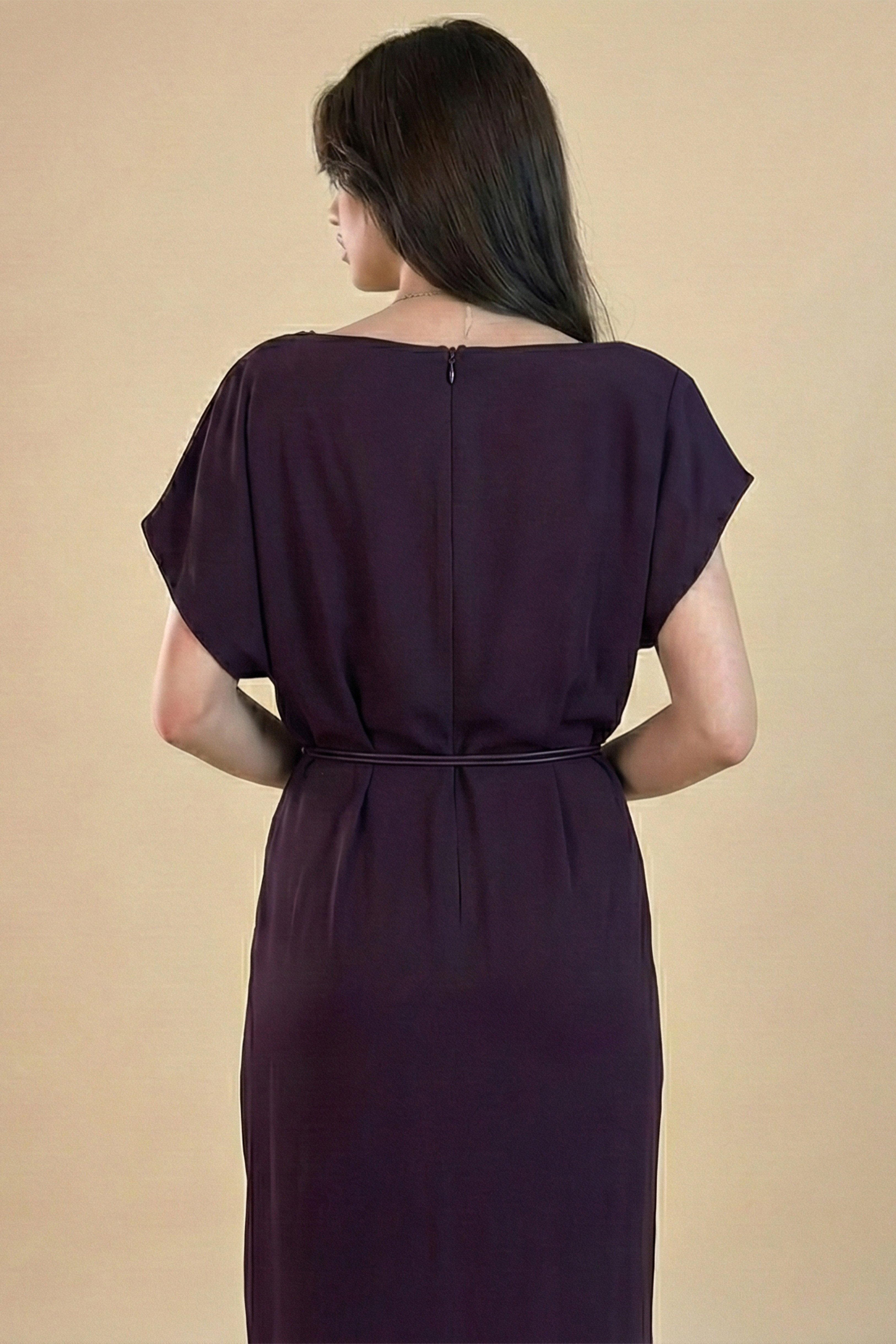 نوع القصة: فستان ماكسي كريب بحزام على شكل وردة بأكمام قصيرة وياقة دائرية