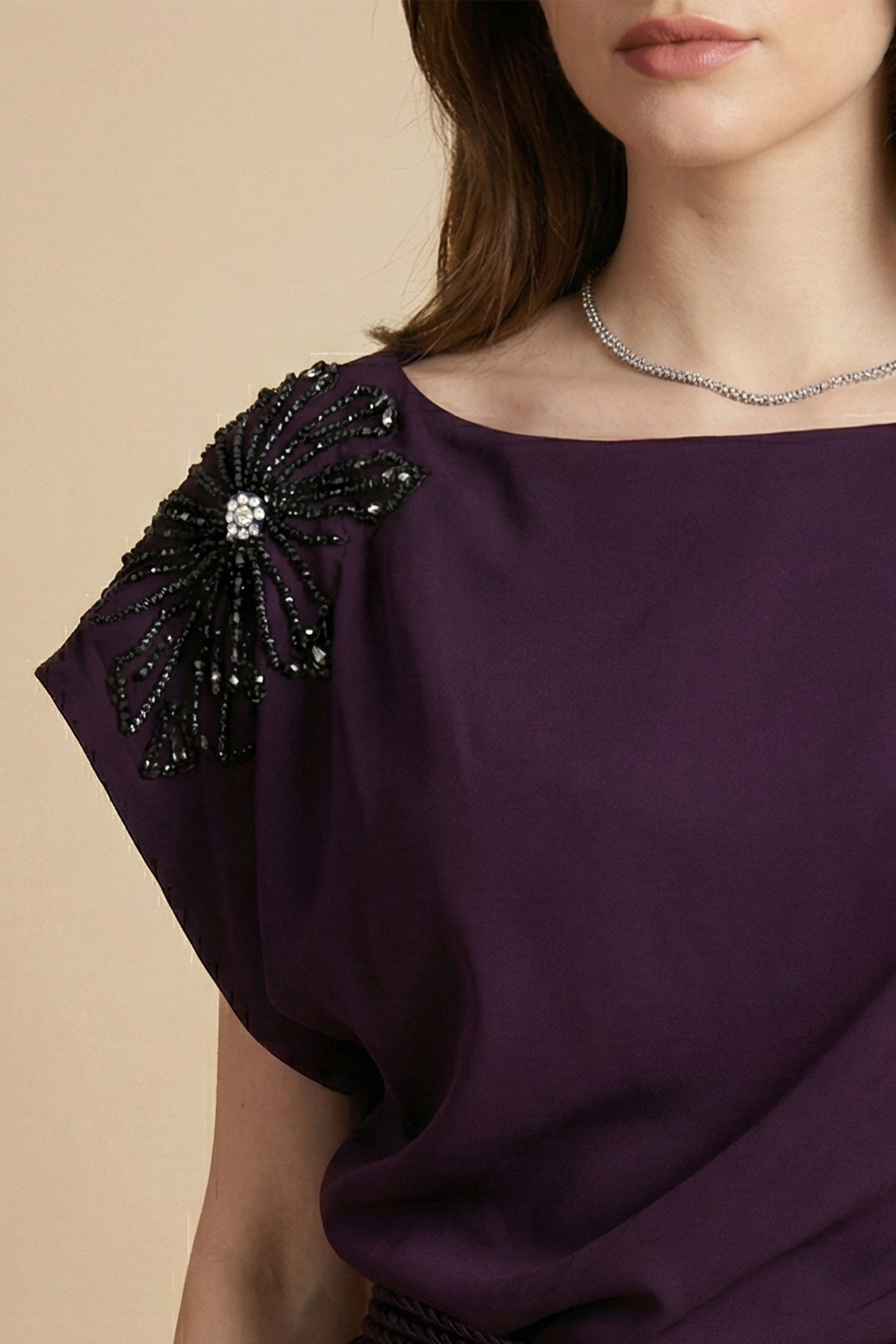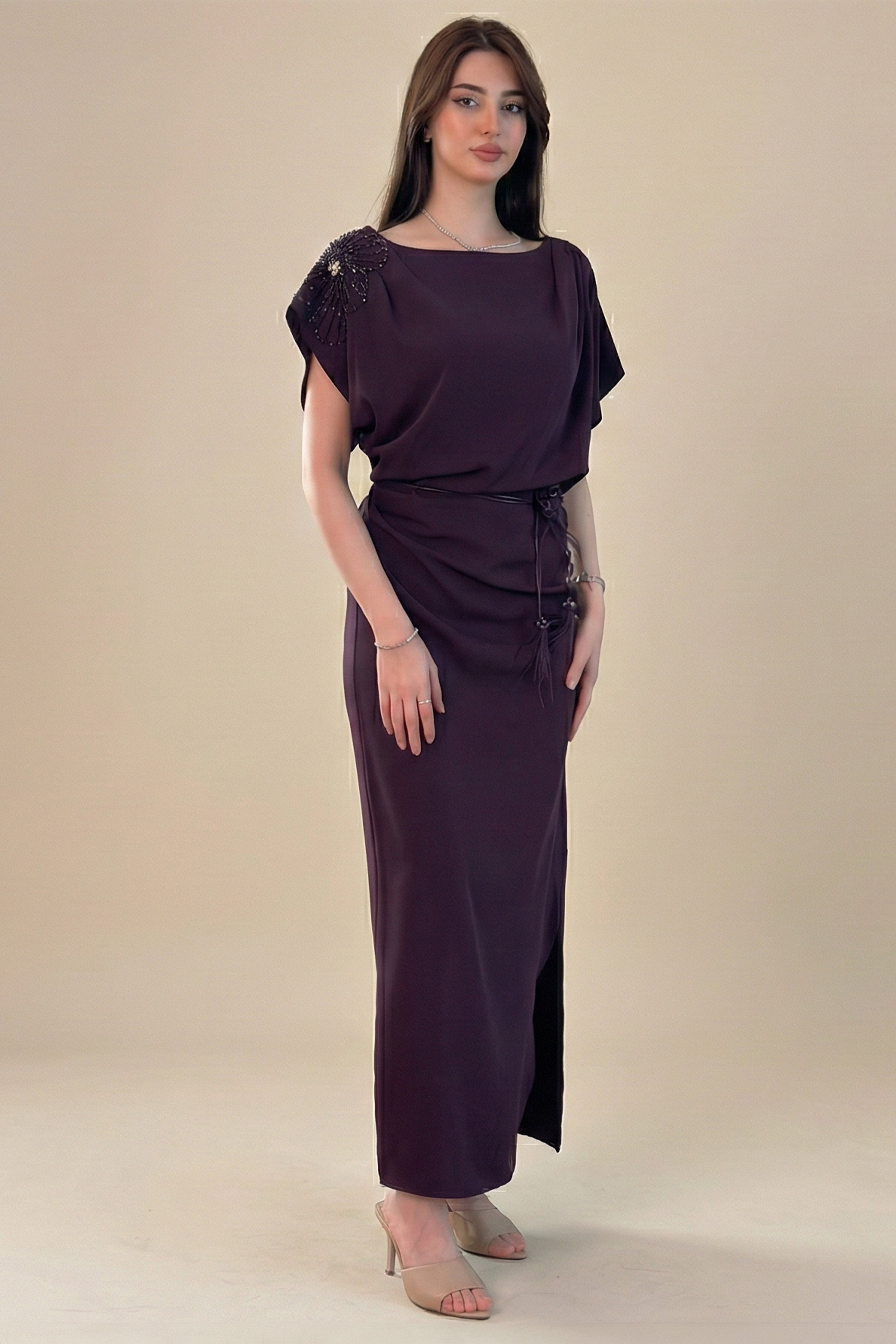 فستان ماكسي بكتف مزين بورد لون بنفسجي