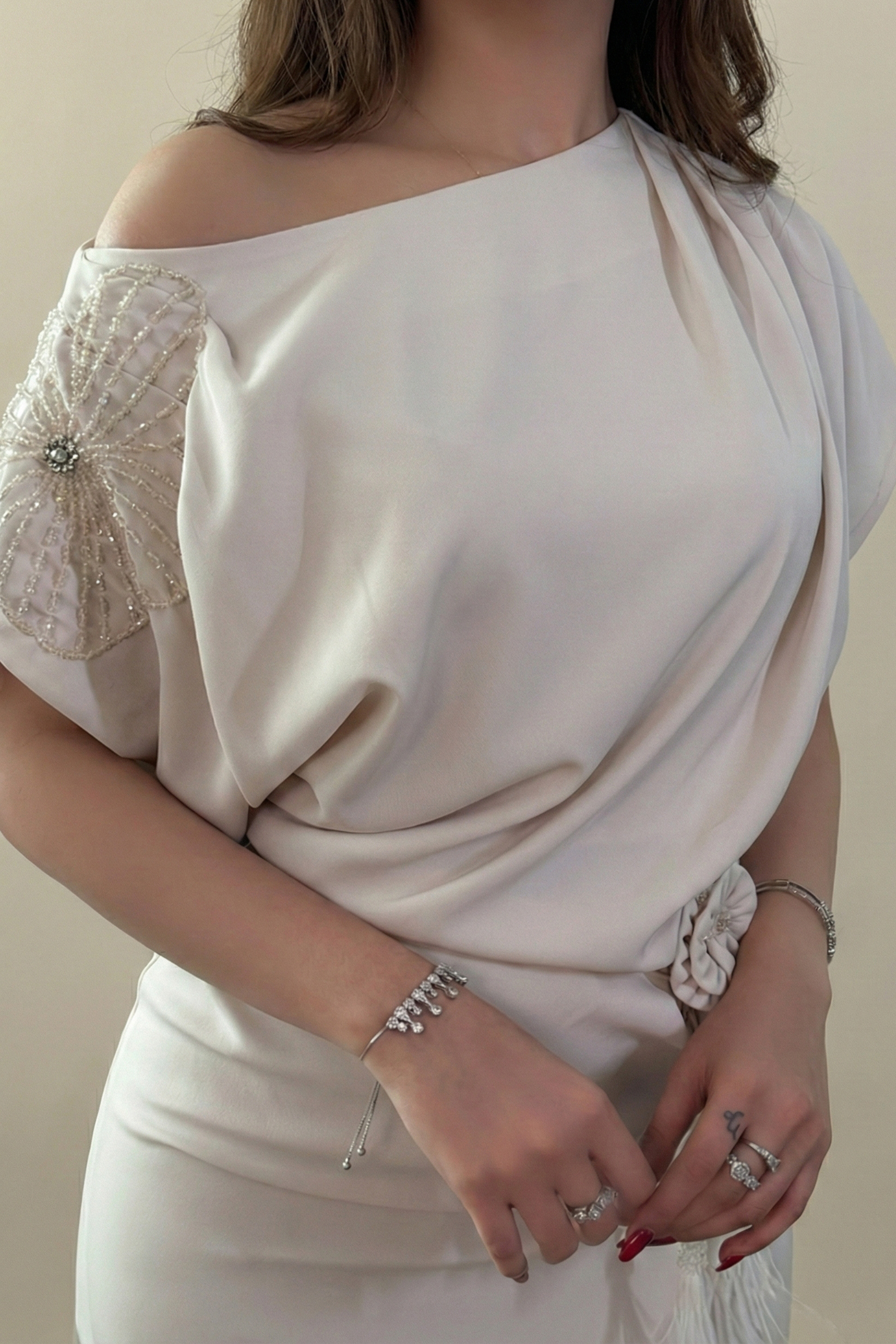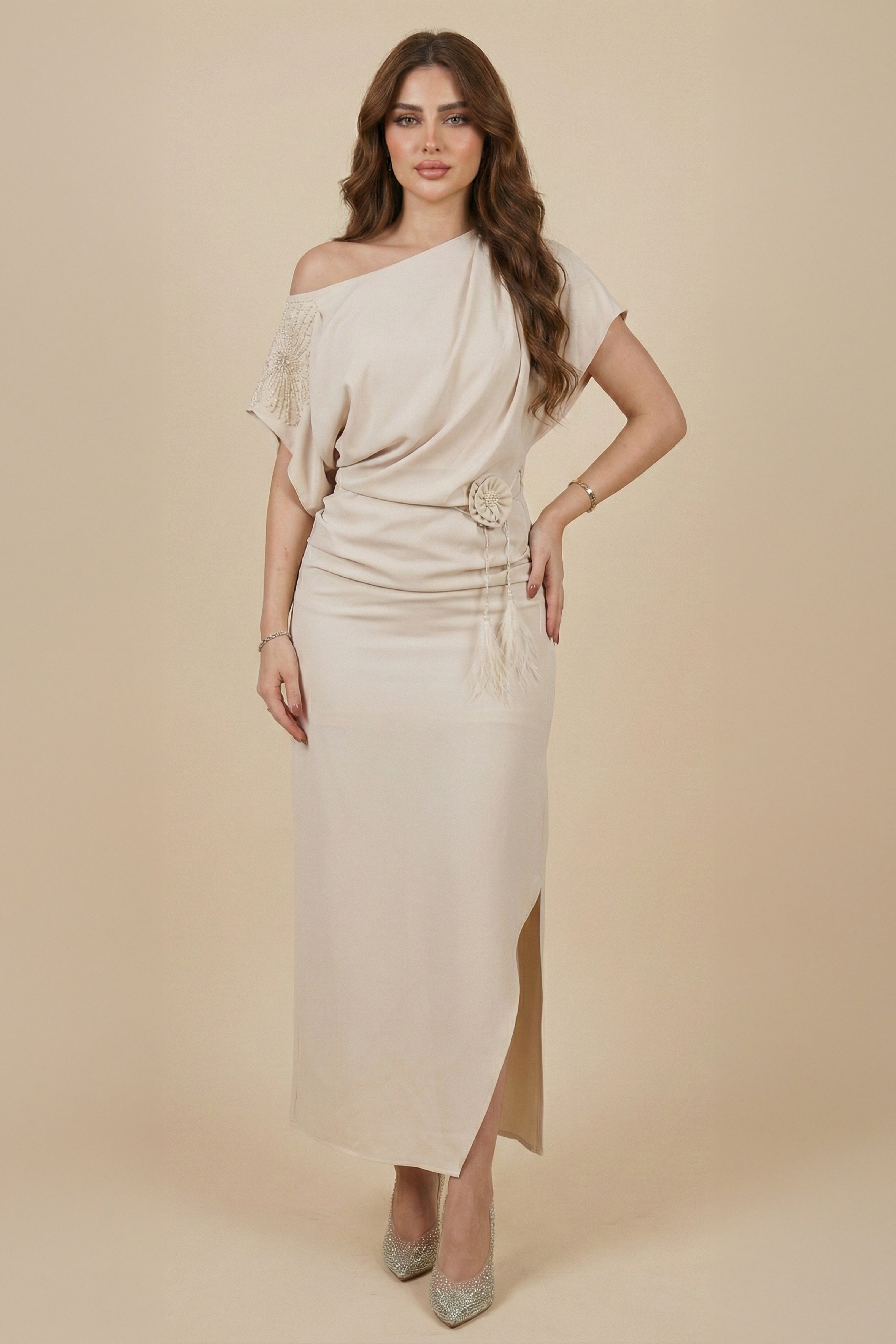 فستان ماكسي بكتف مزين بورد لون بيج