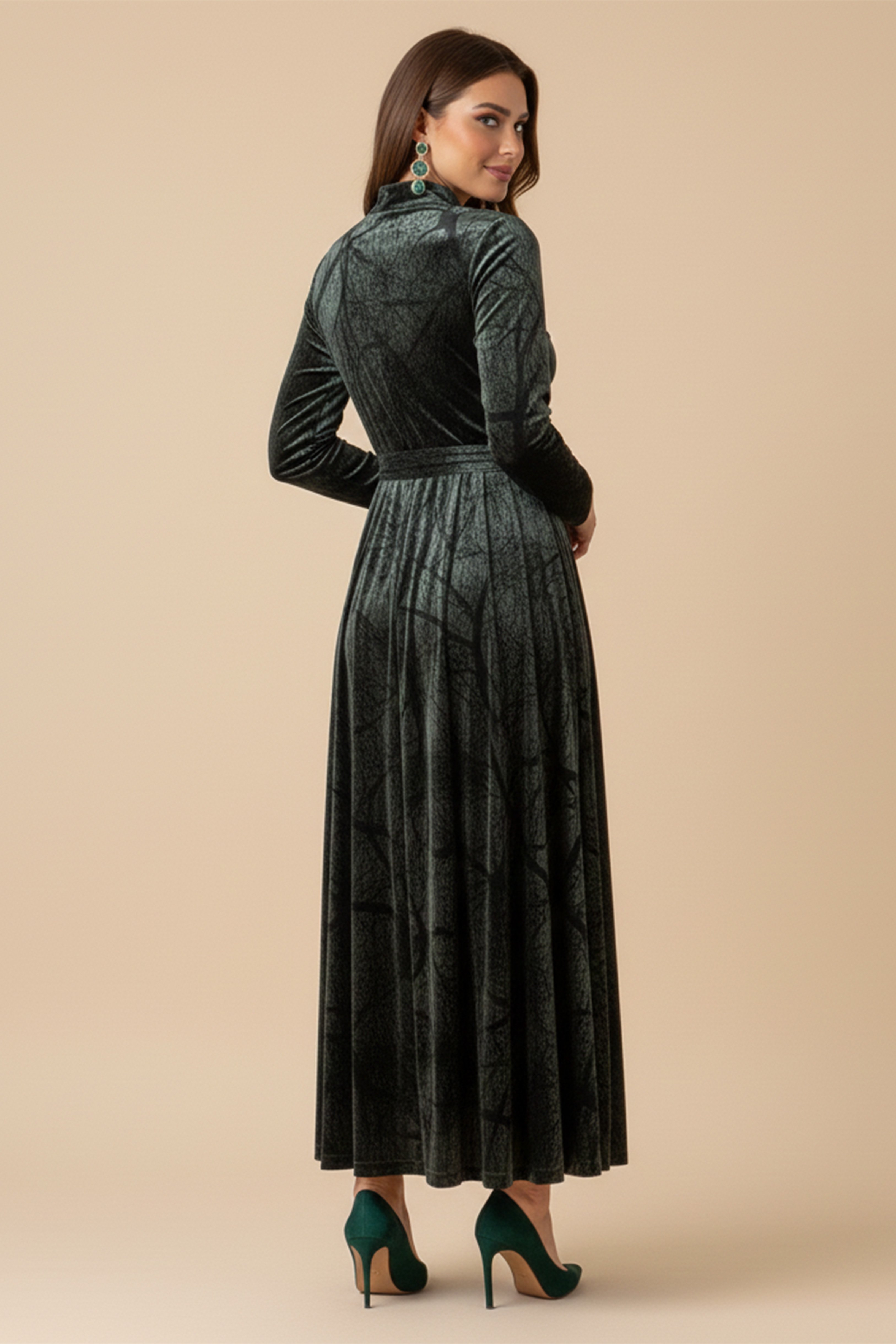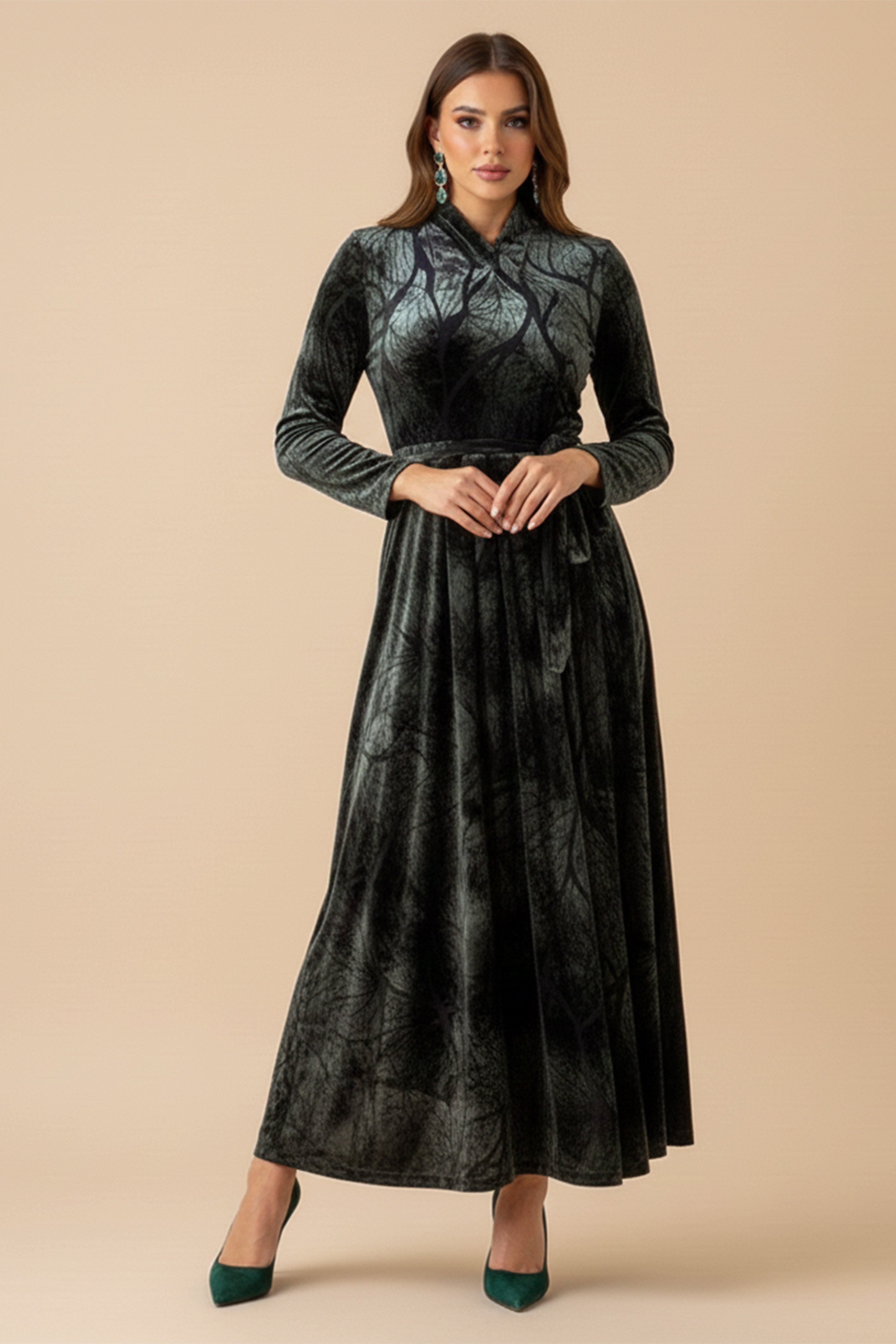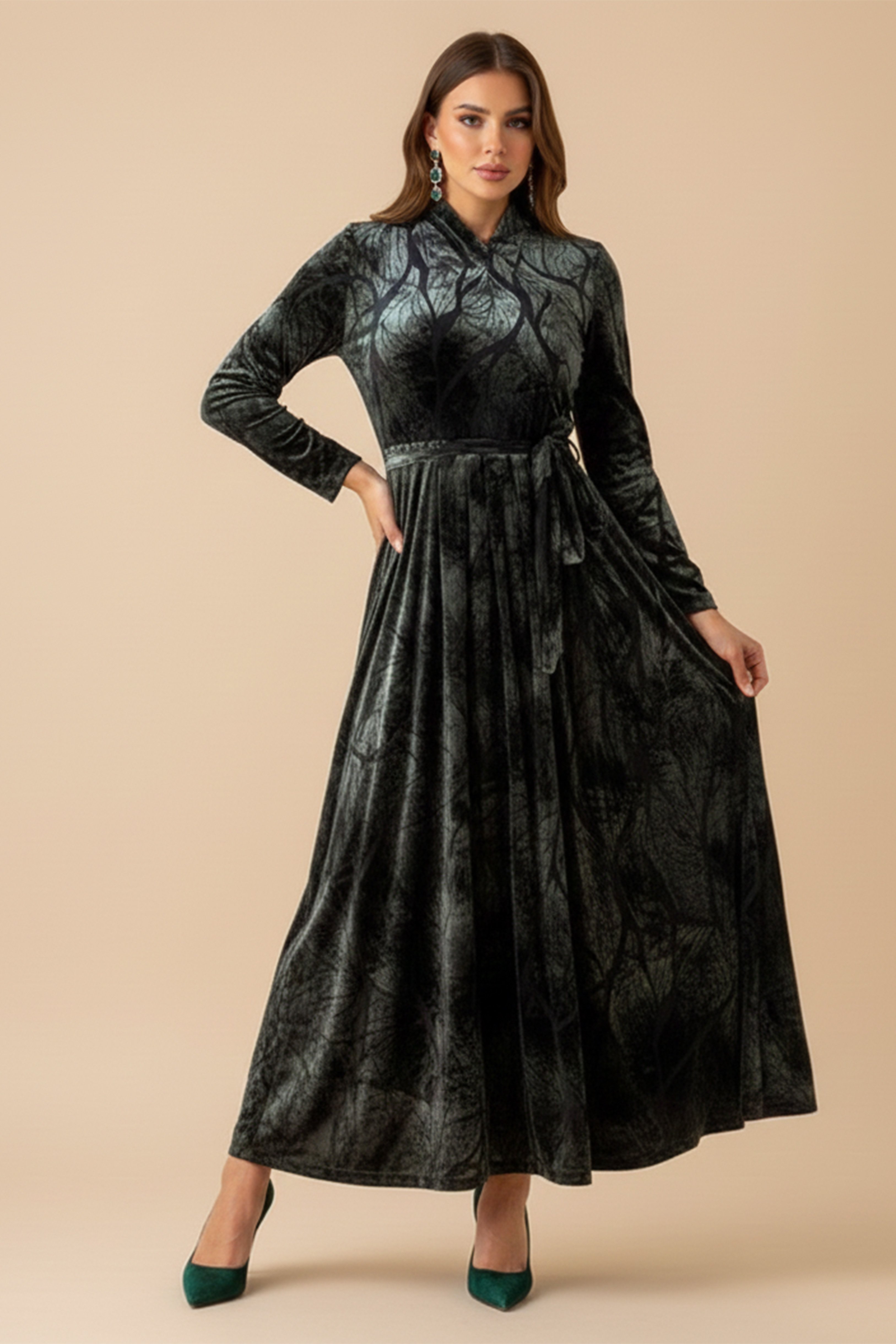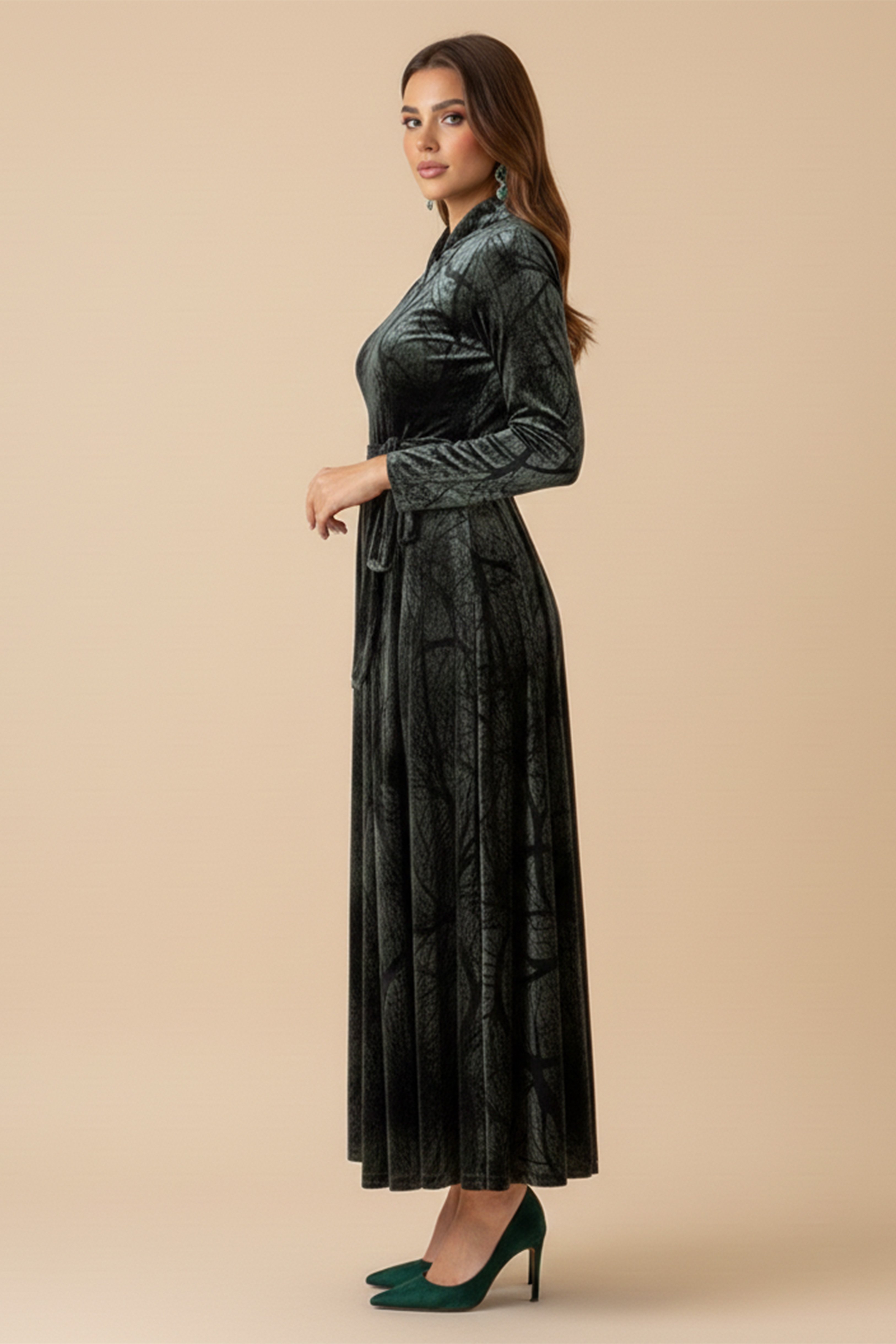 نوع القصة: فستان ماكسي مخملي بطبعة ورق شجر بكسرات مع حزام.
