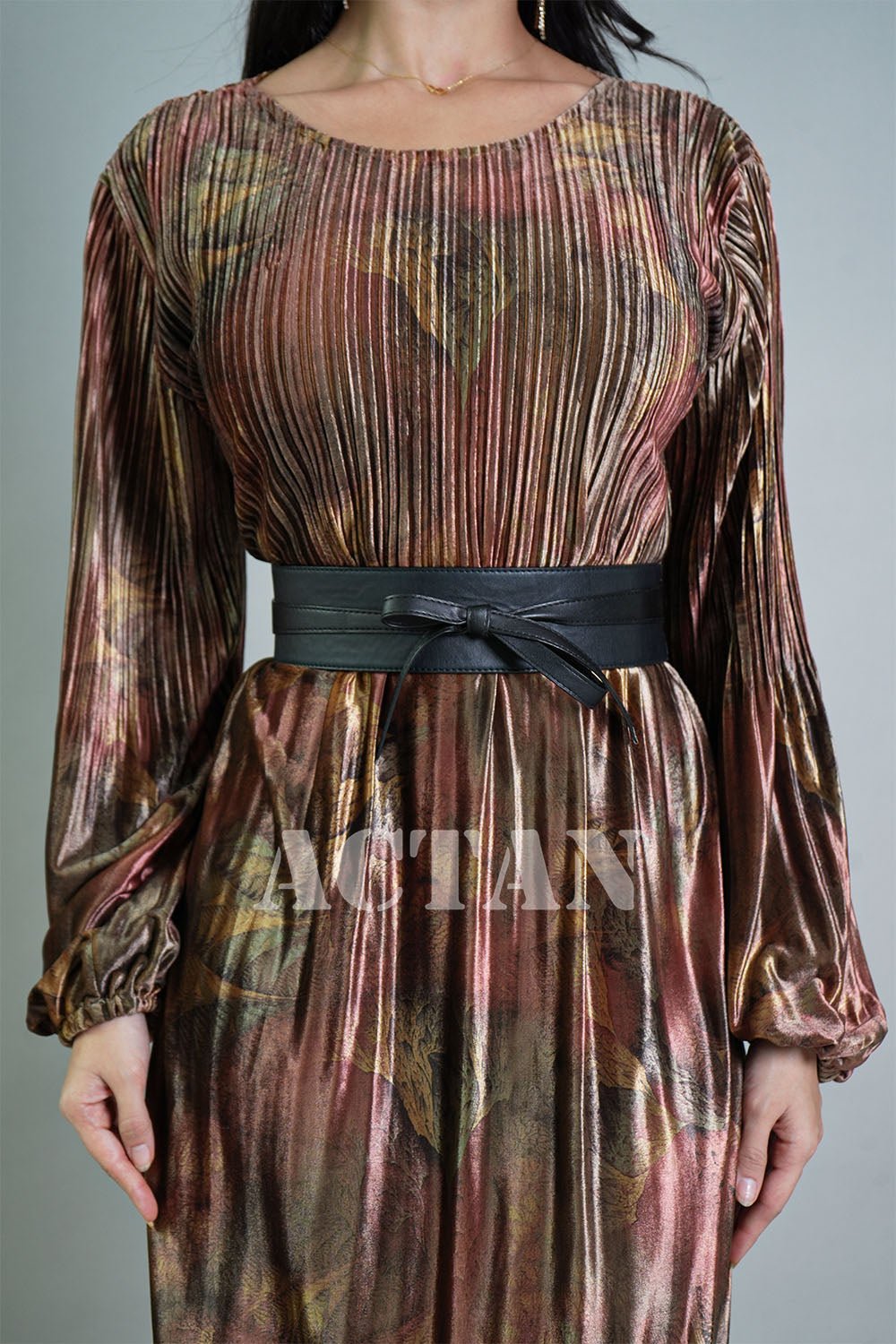 نوع القصة: فستان ماكسي مخملي بكسرات بطبعة زهور مع حزام.