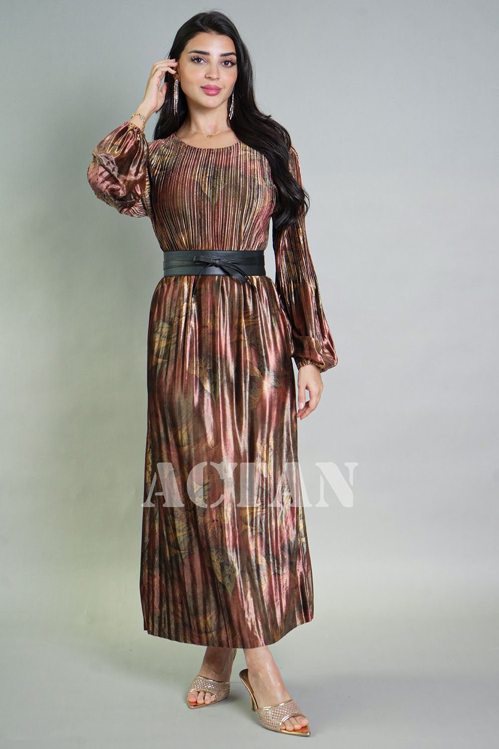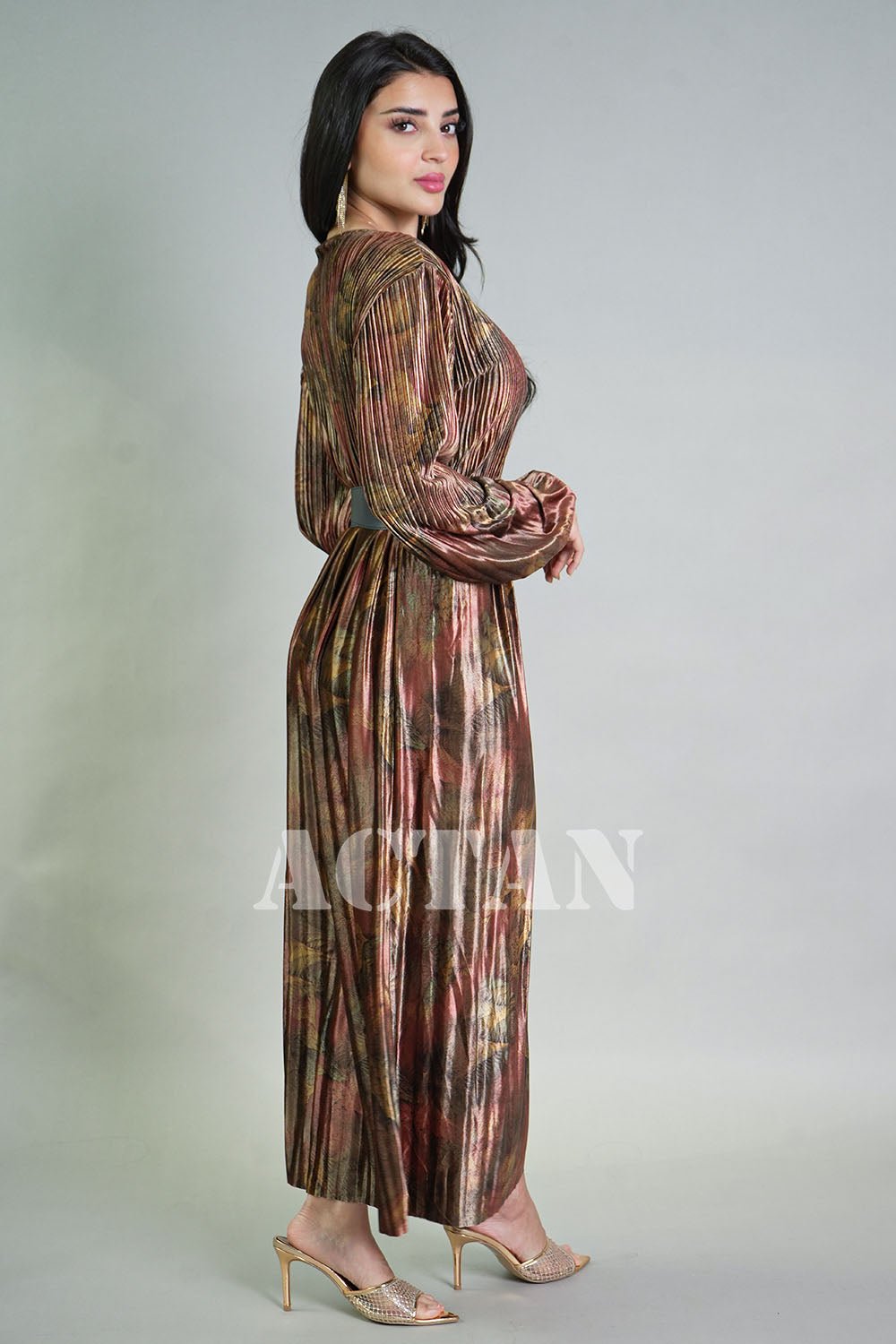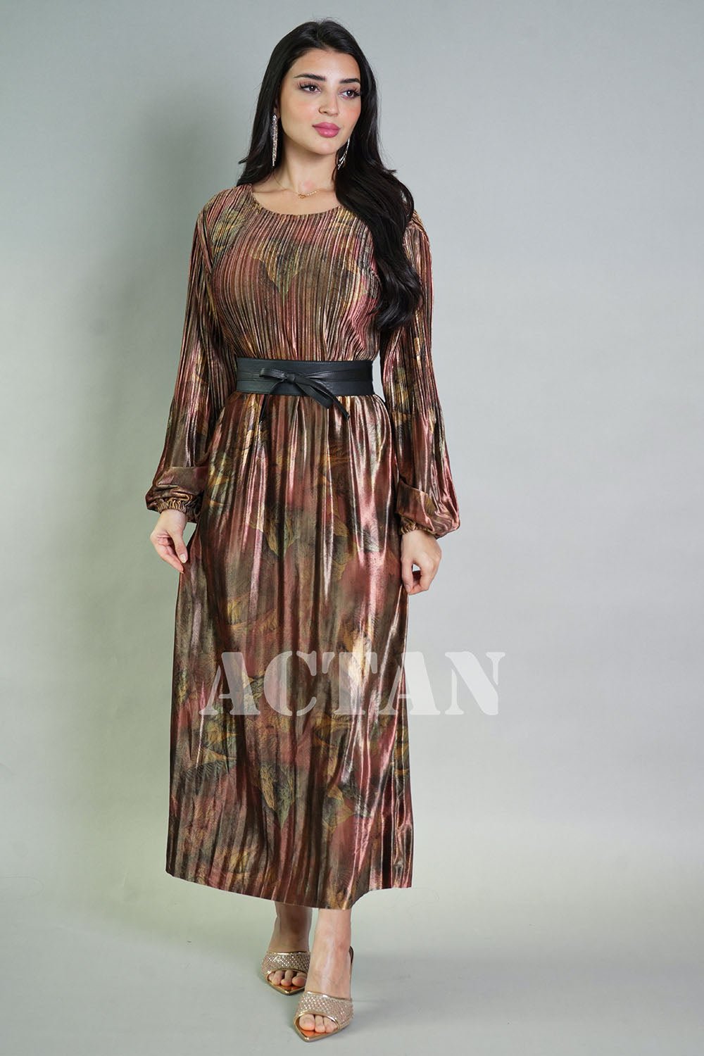 نوع التصميم: فستان ماكسي مخملي بكسرات بطبعة زهور.
