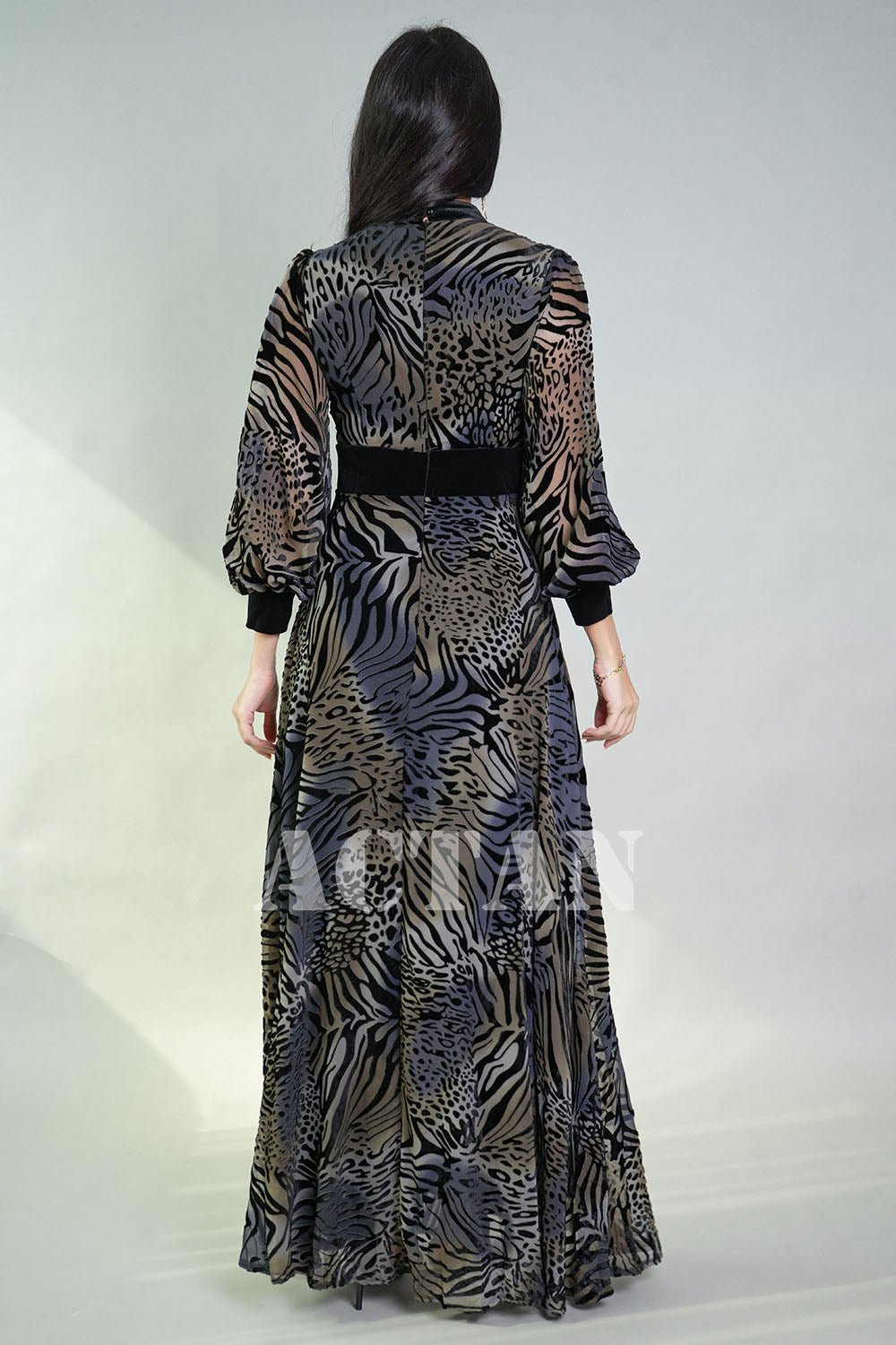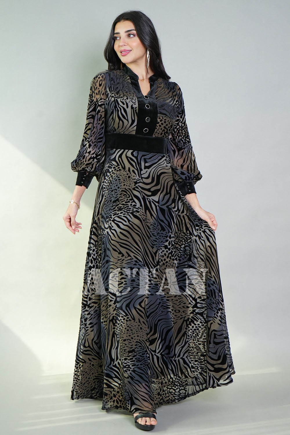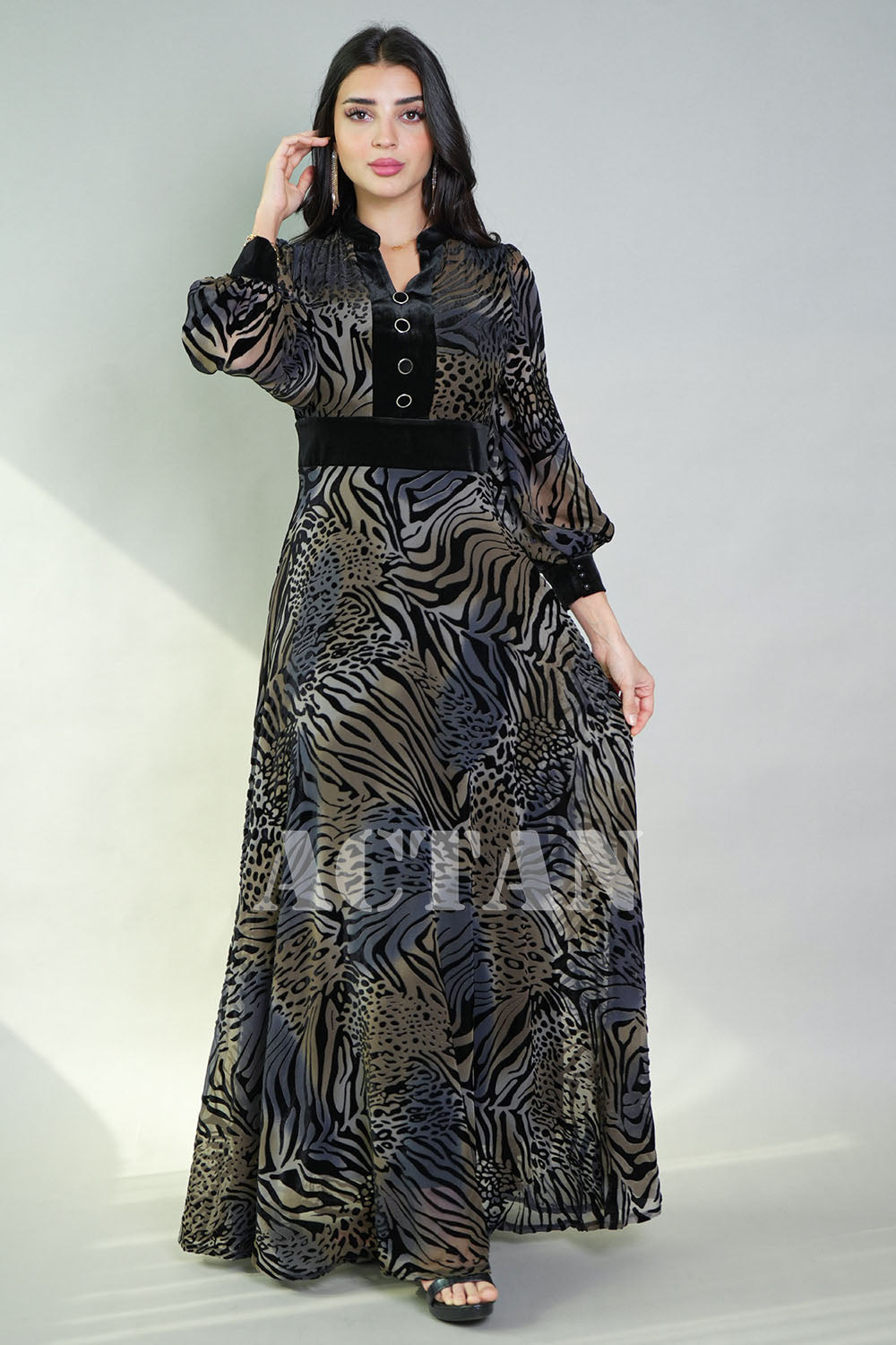 نوع التصميم فستان ماكسي مخمل بطبعة جلد النمر نوع القصة فستان ماكسي مخمل بطبعة جلد النمر المناسبه خروج عام او مناسبات خاصة الخصر ضيق الاكمام طويلة التمدد غيرقابل للتمدد الخامة مخمل إرشادات العناية يغسل ويكوى بالبخار بدرجة حراره منخفضه 40-بالمئه ويجفف بالتعليق