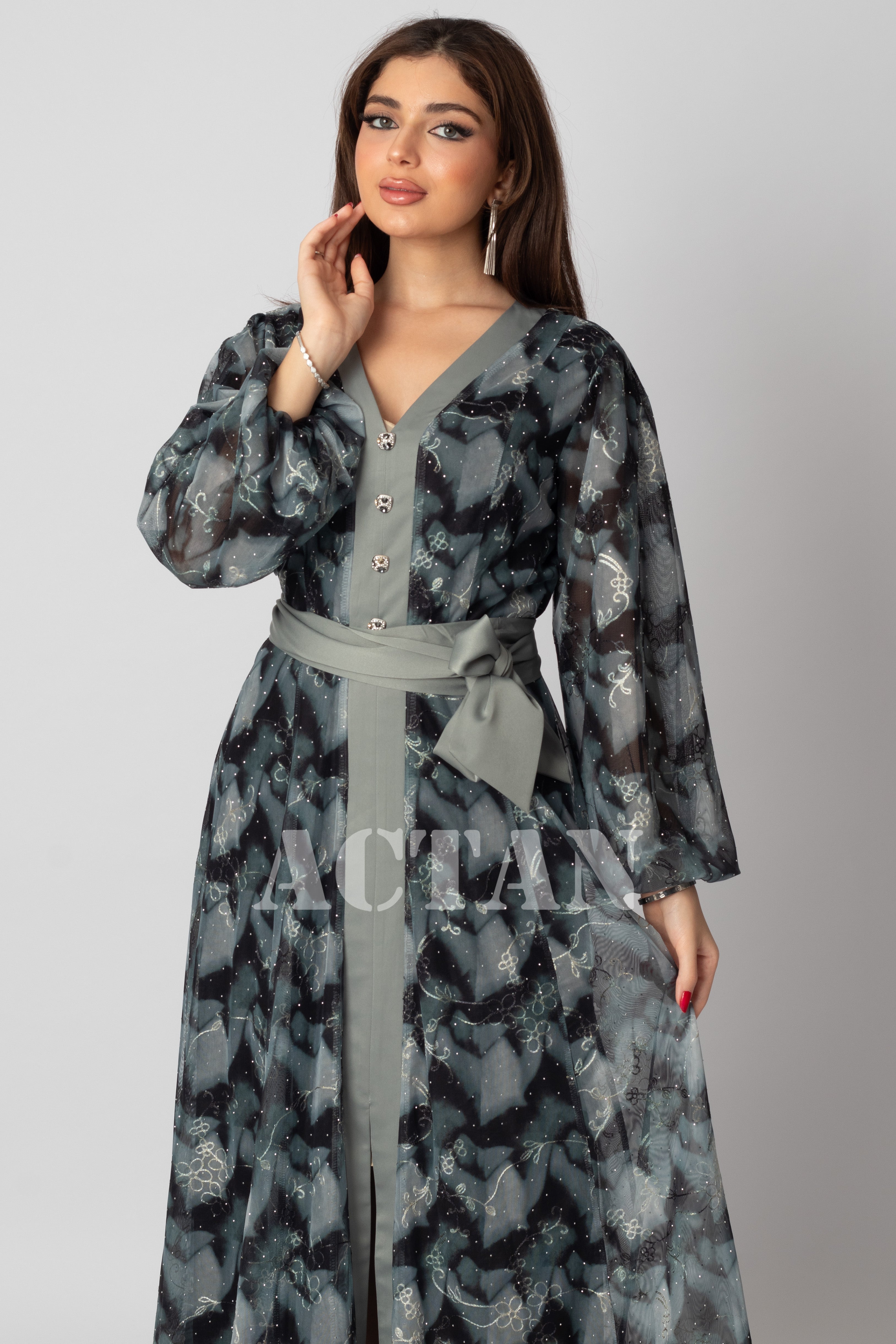 نوع القصة: فستان ماكسي طويل كلوش برباط على الخصر مزين بفصوص بأكمام طويلة وياقة V.
