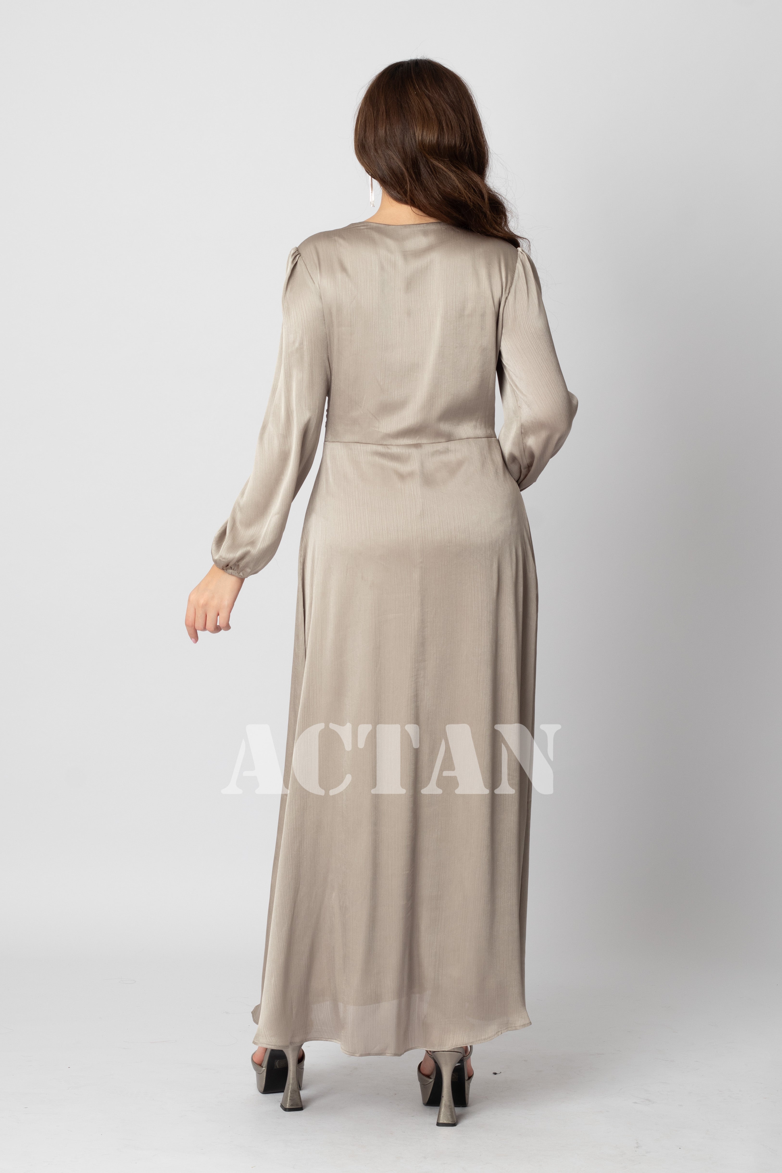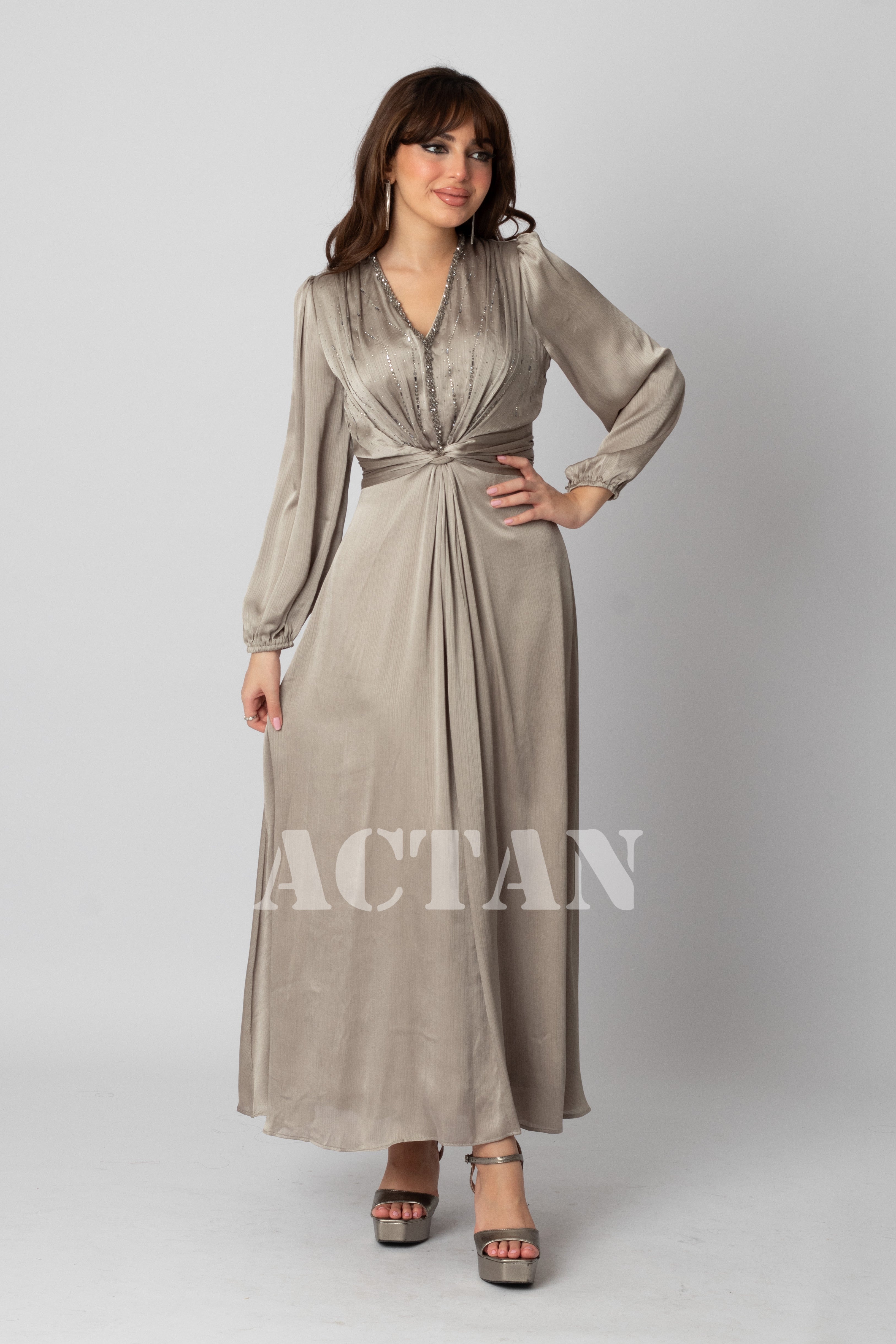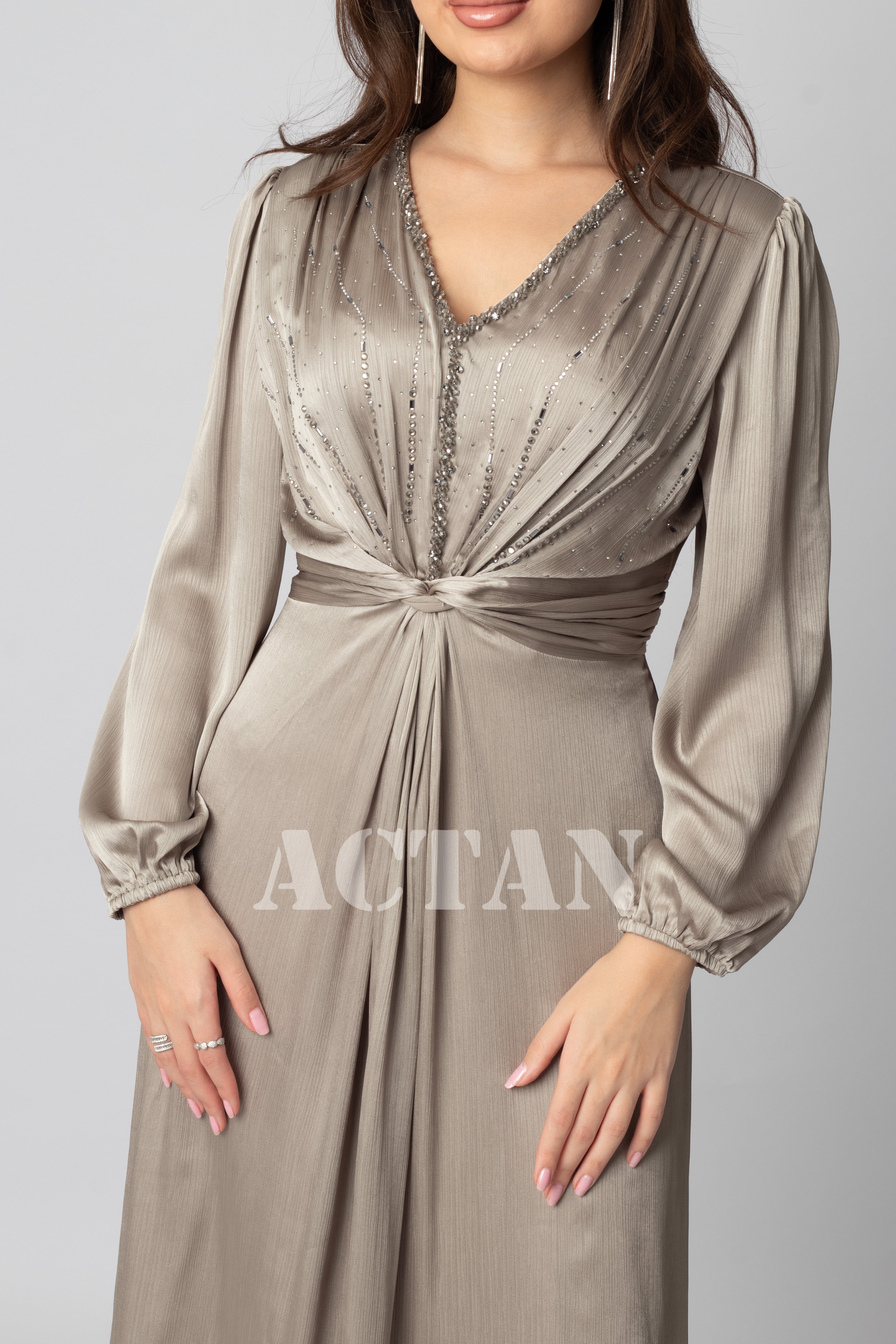 نوع القصة: فستان مخصر ماكسي مزموم مزين بفصوص بأكمام طويلة وياقة V