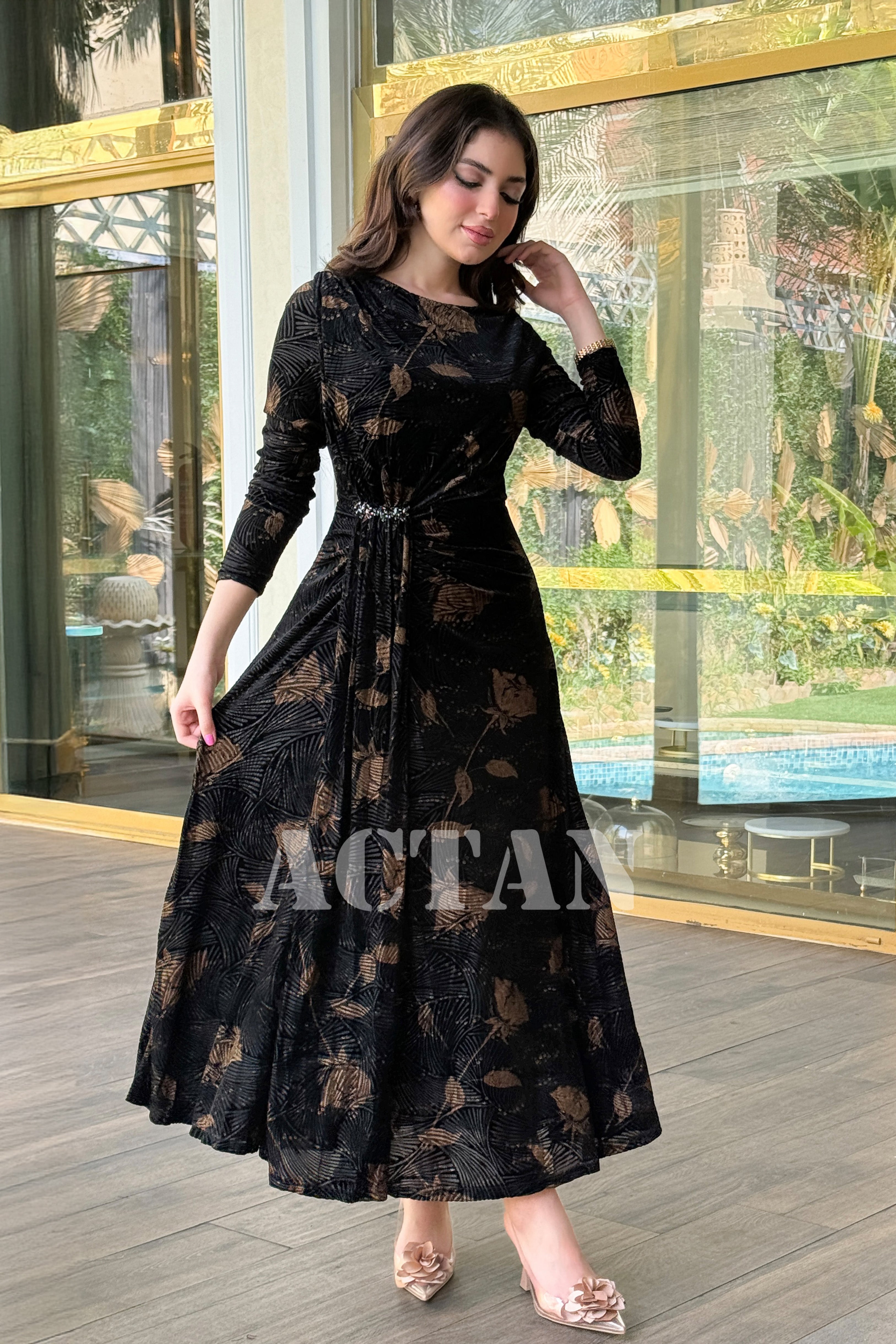 نوع التصميم: فستان مخملي بطبعة ورد مزموم من الجنب بكريستالات.