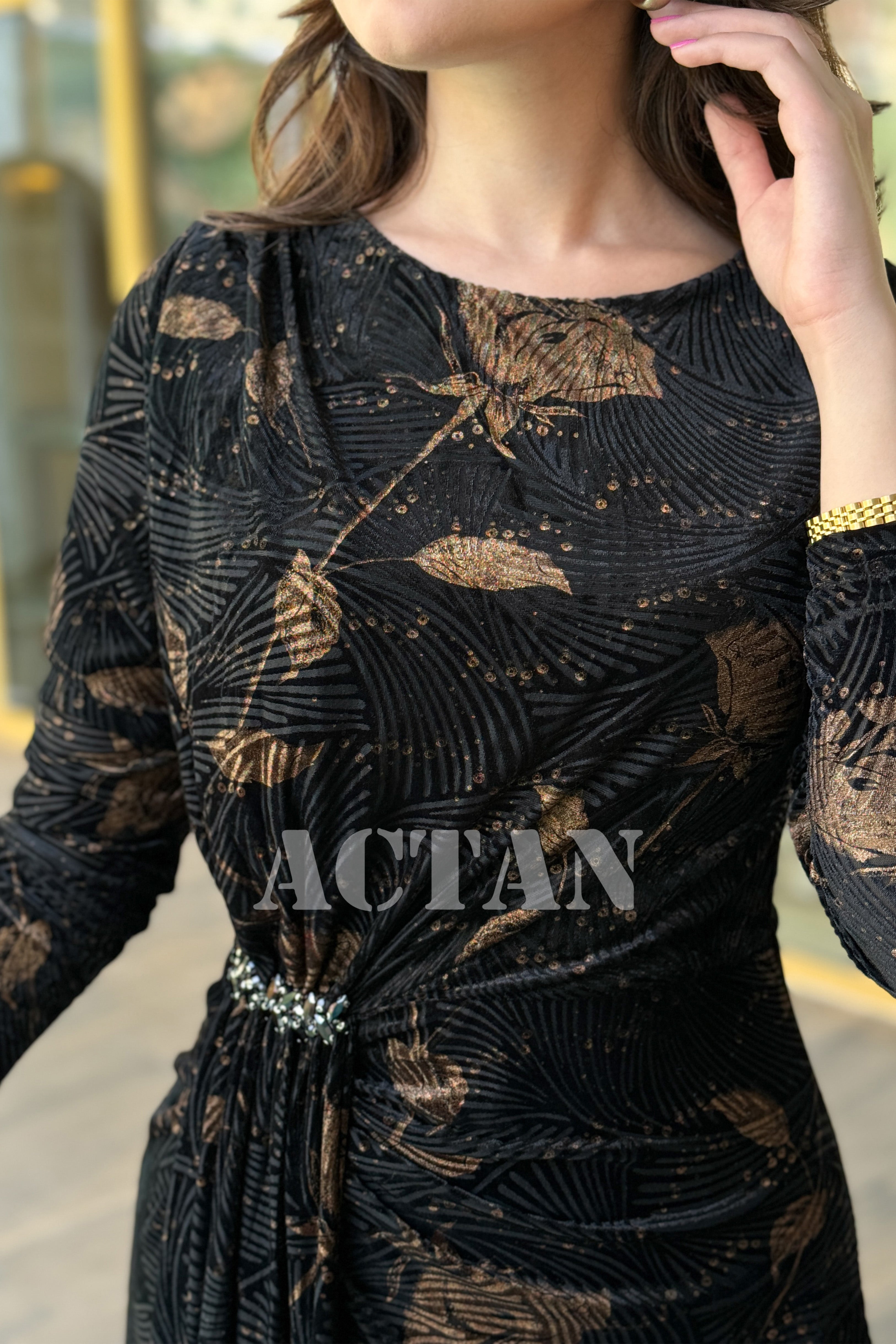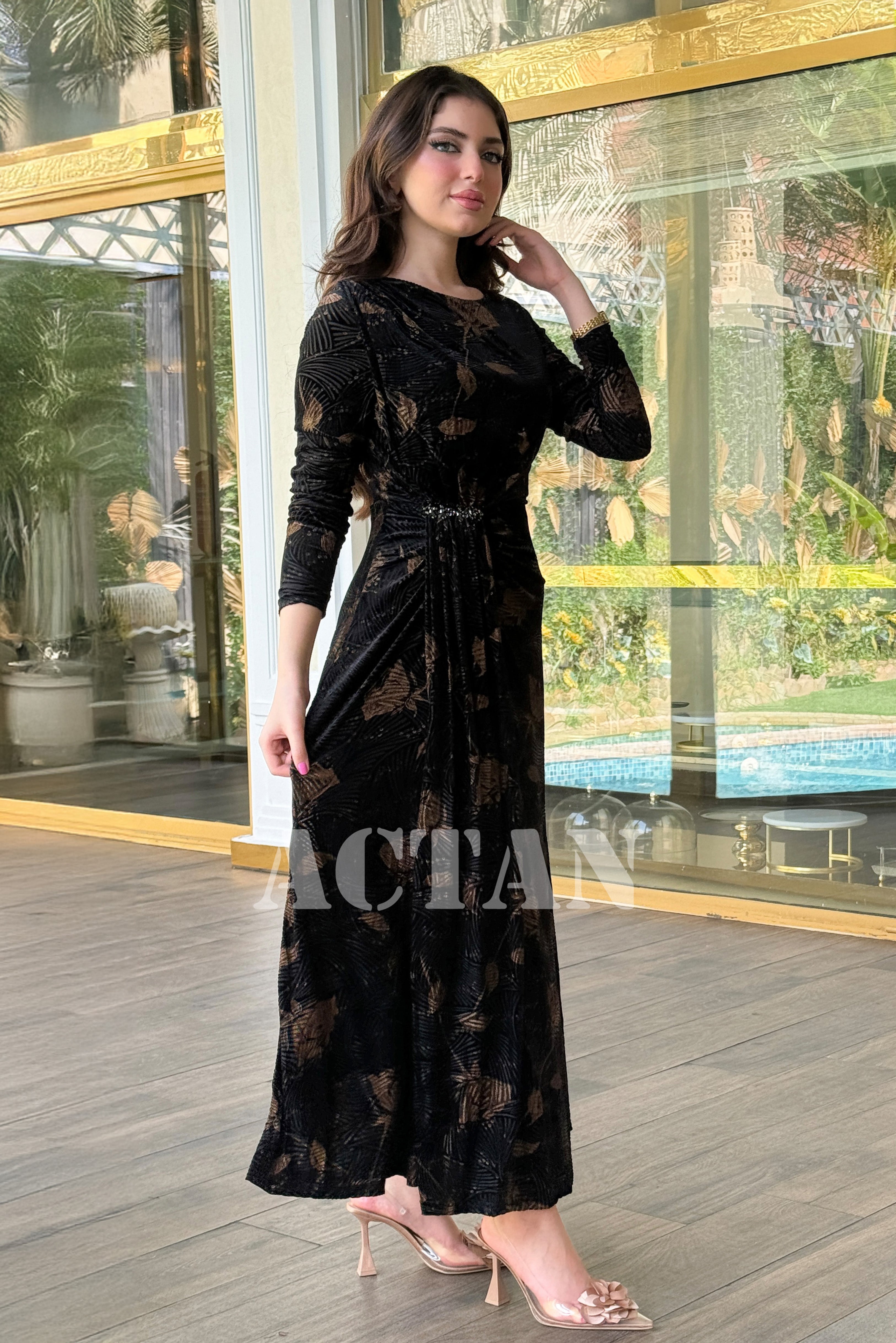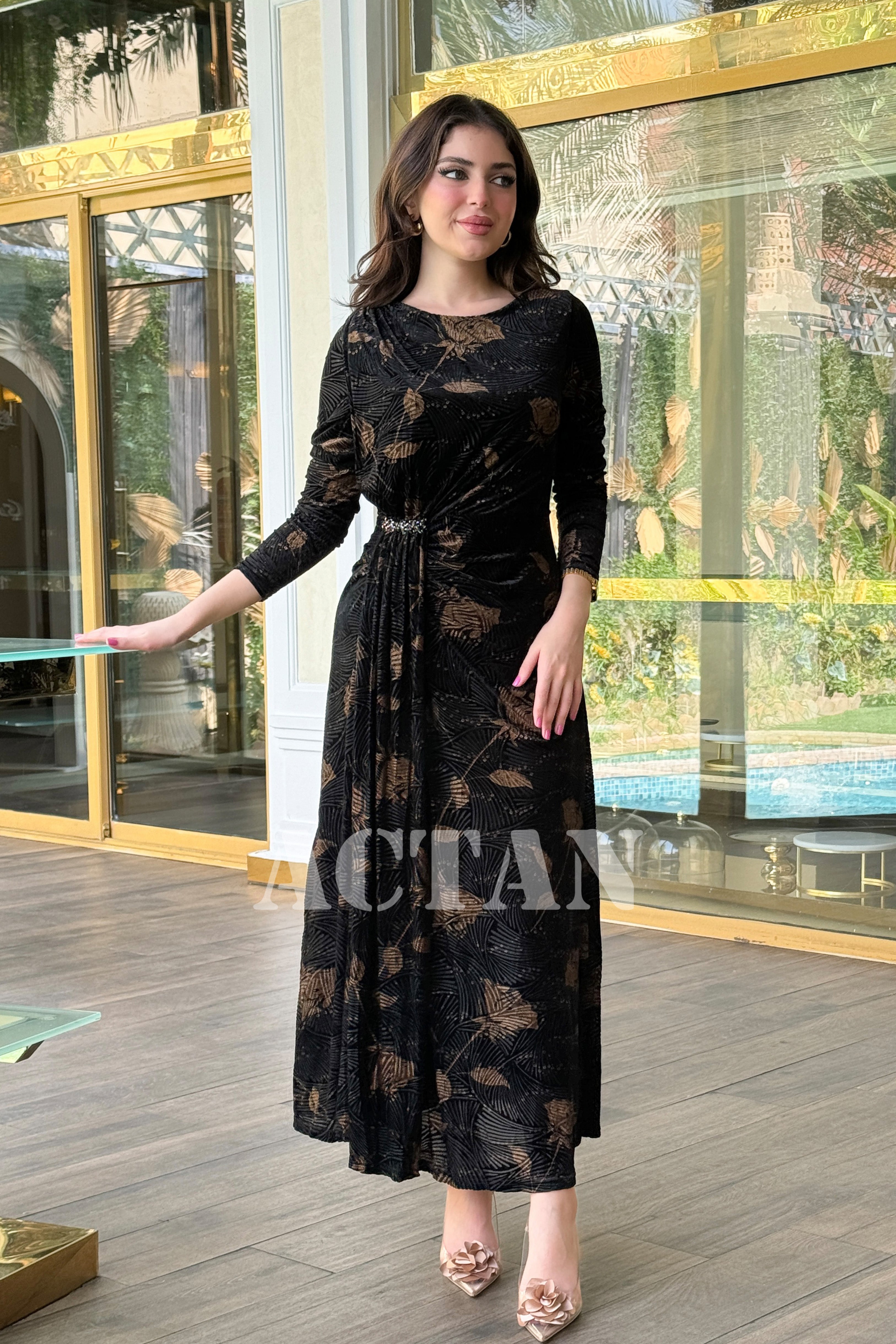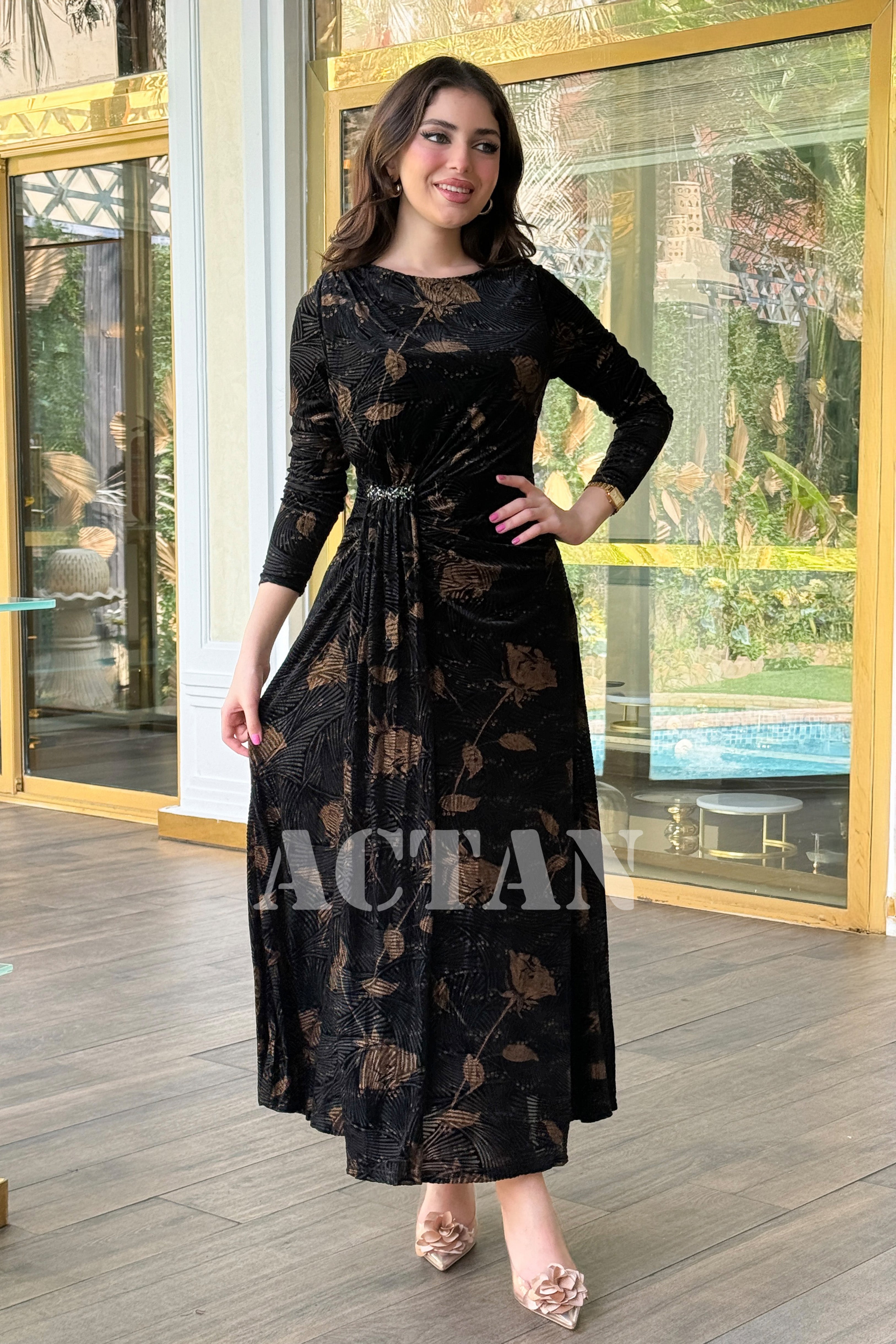 نوع القصة: فستان مخملي بطبعة ورد مزموم من الجنب بكريستالات بأكمام طويلة.