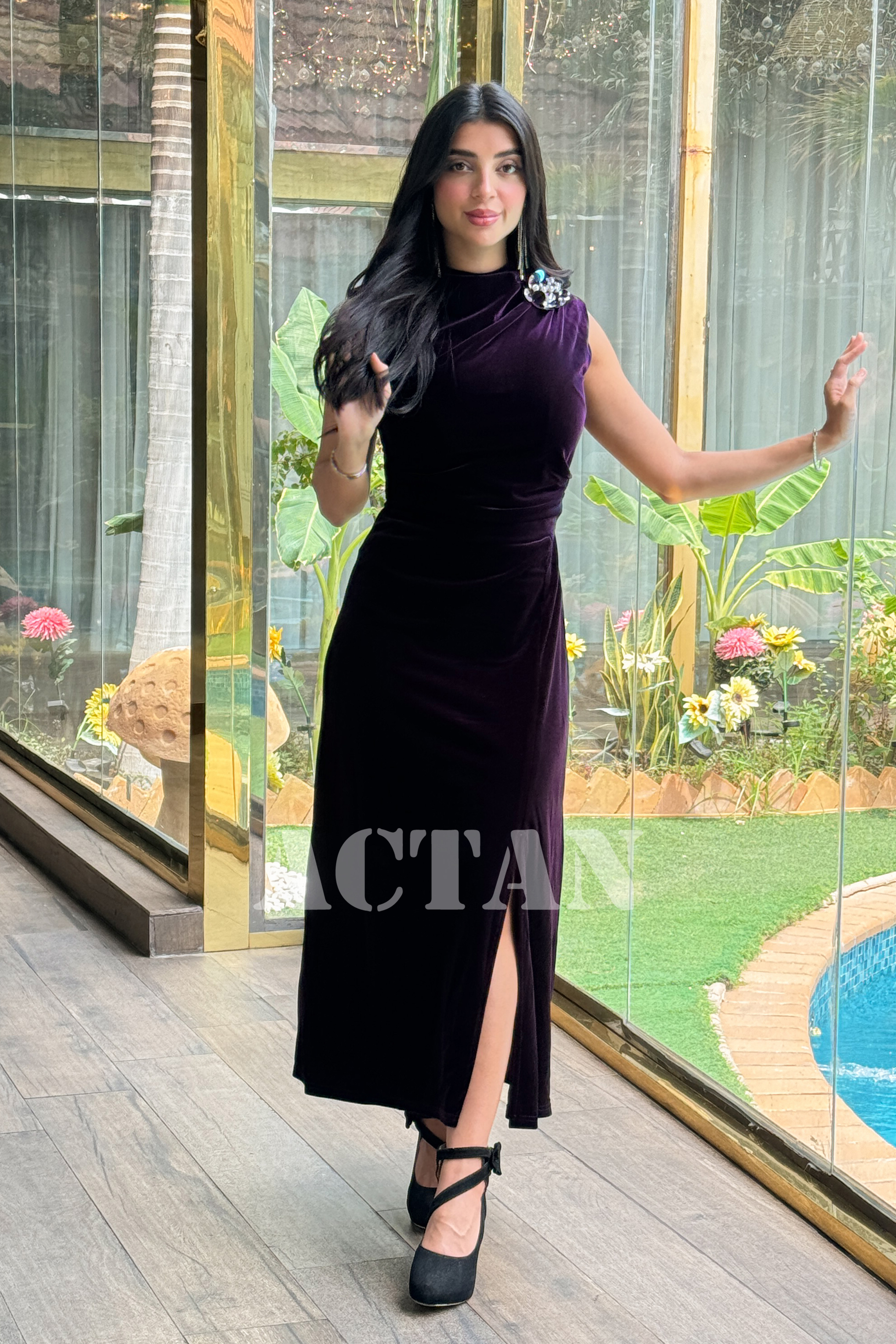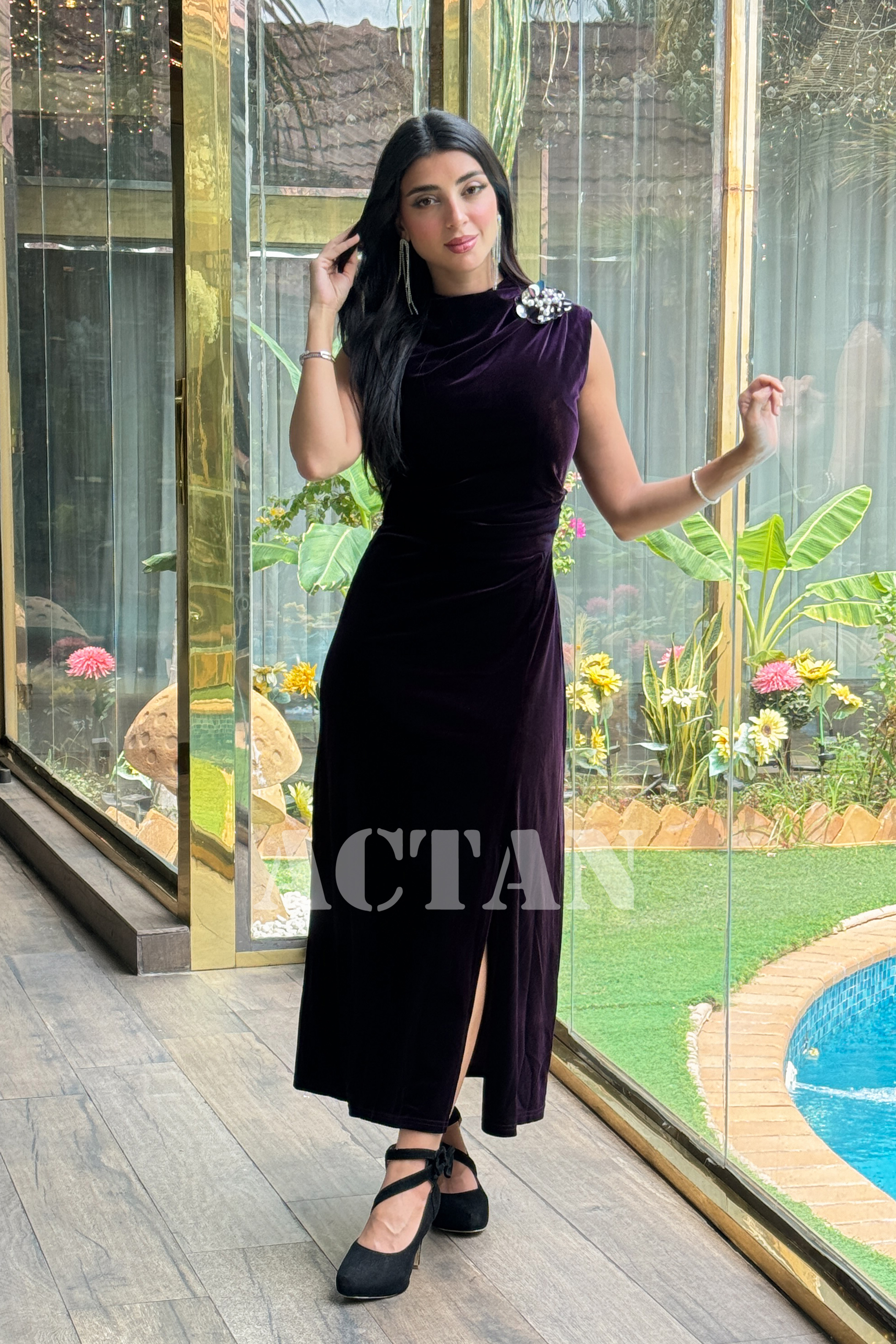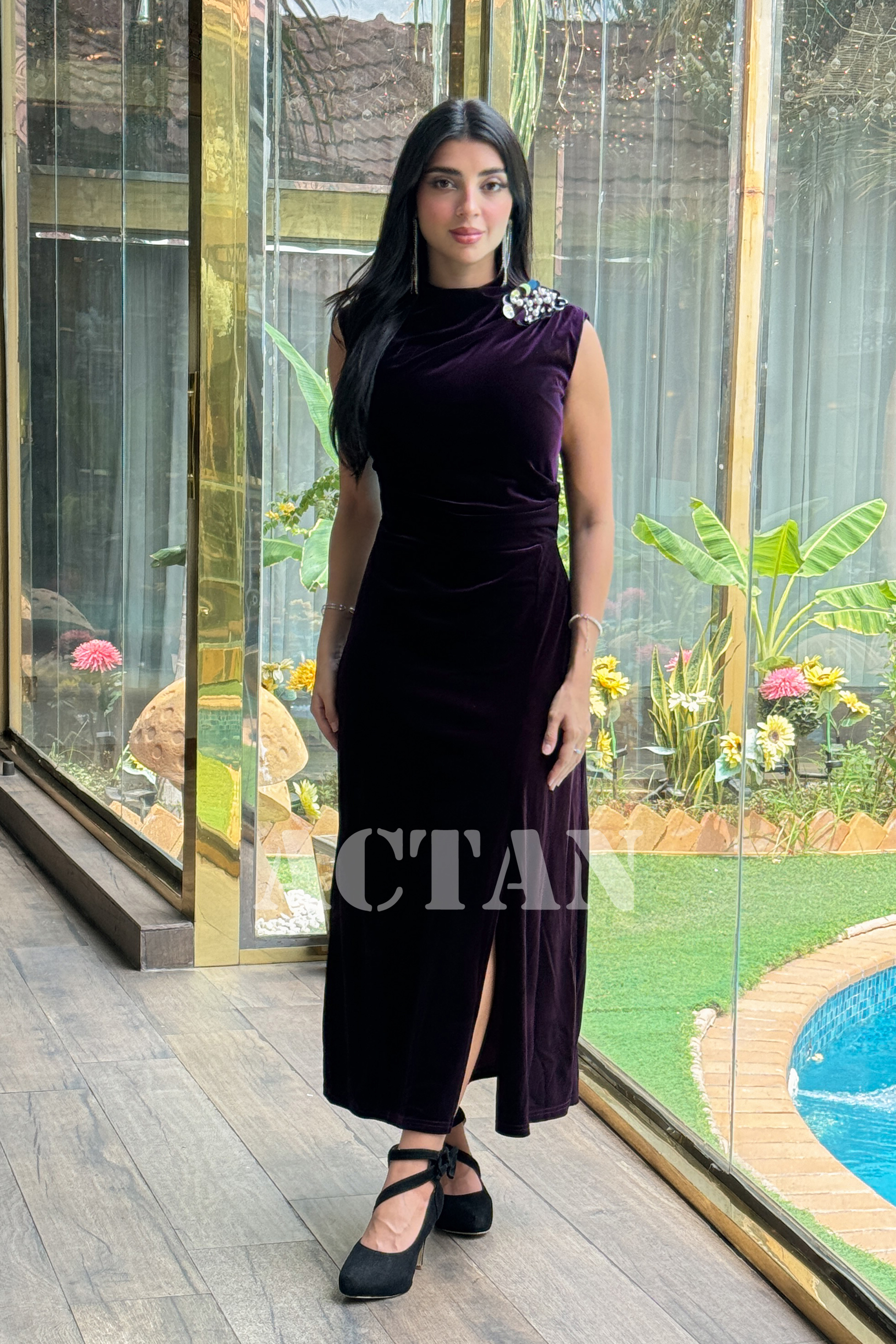 نوع القصة: فستان مخملي بقصة ضيقة مزين ببروش بفتحة من الجانب