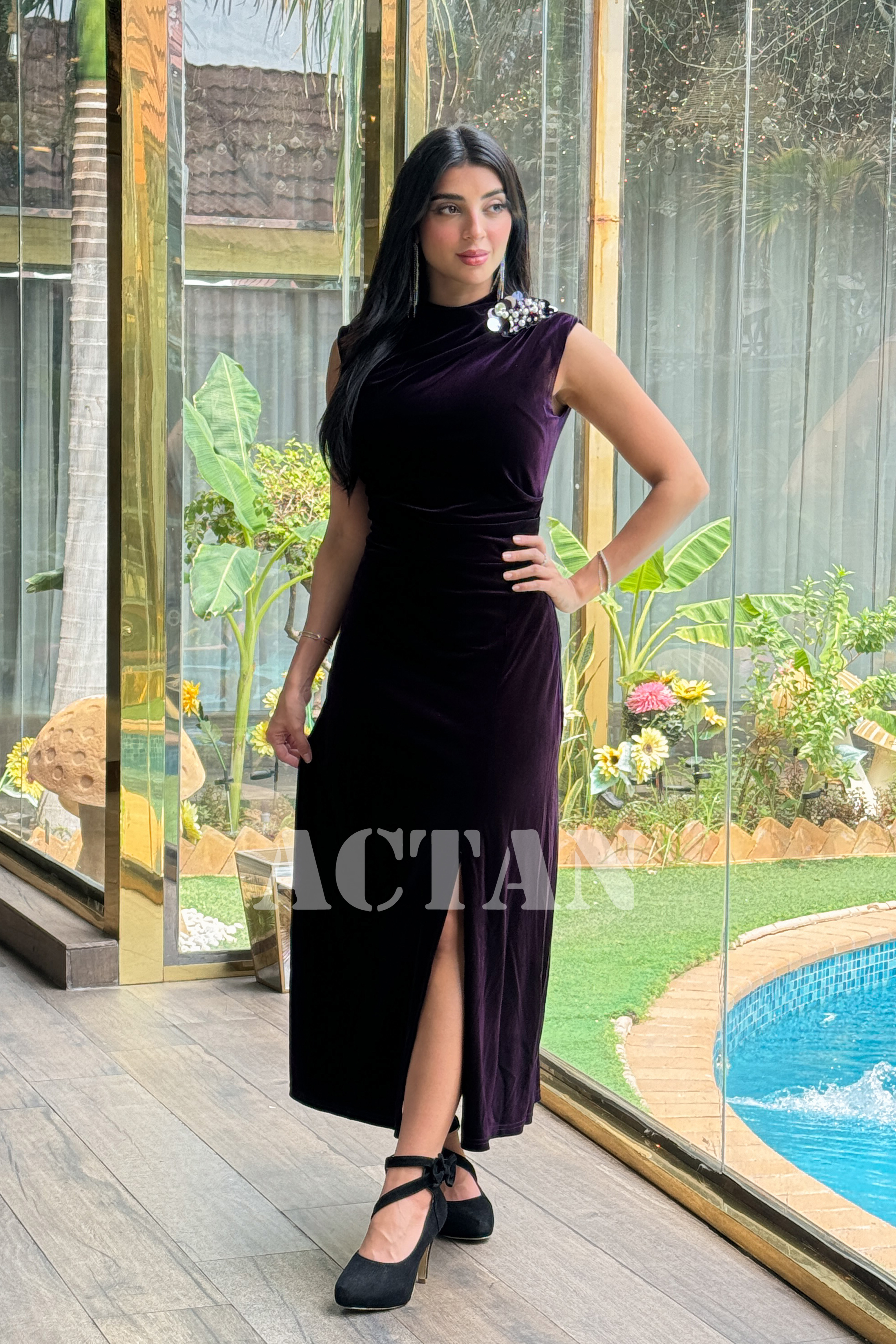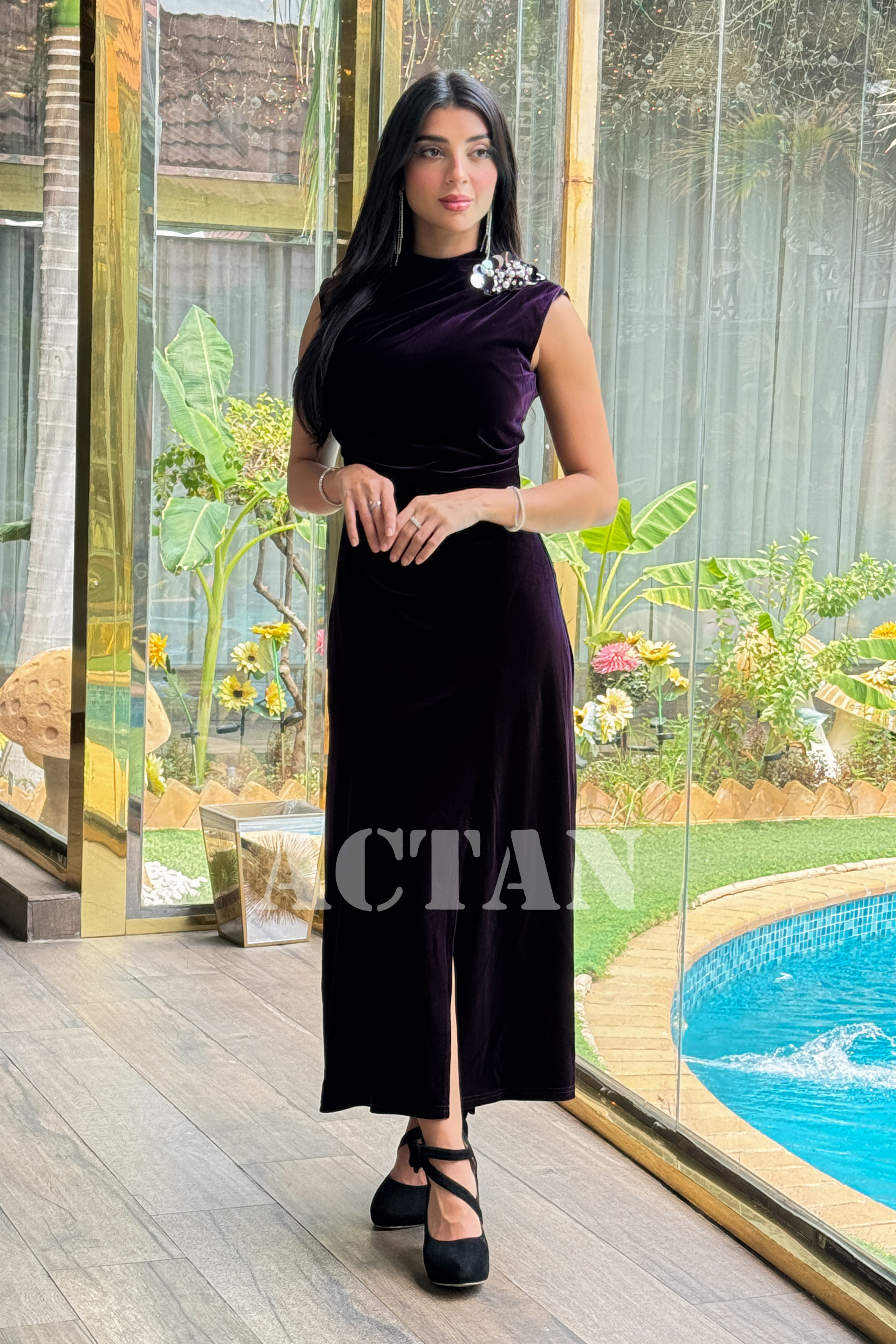 فستان مخملي بقصة ضيقة مزين ببروش لون بنفسجي