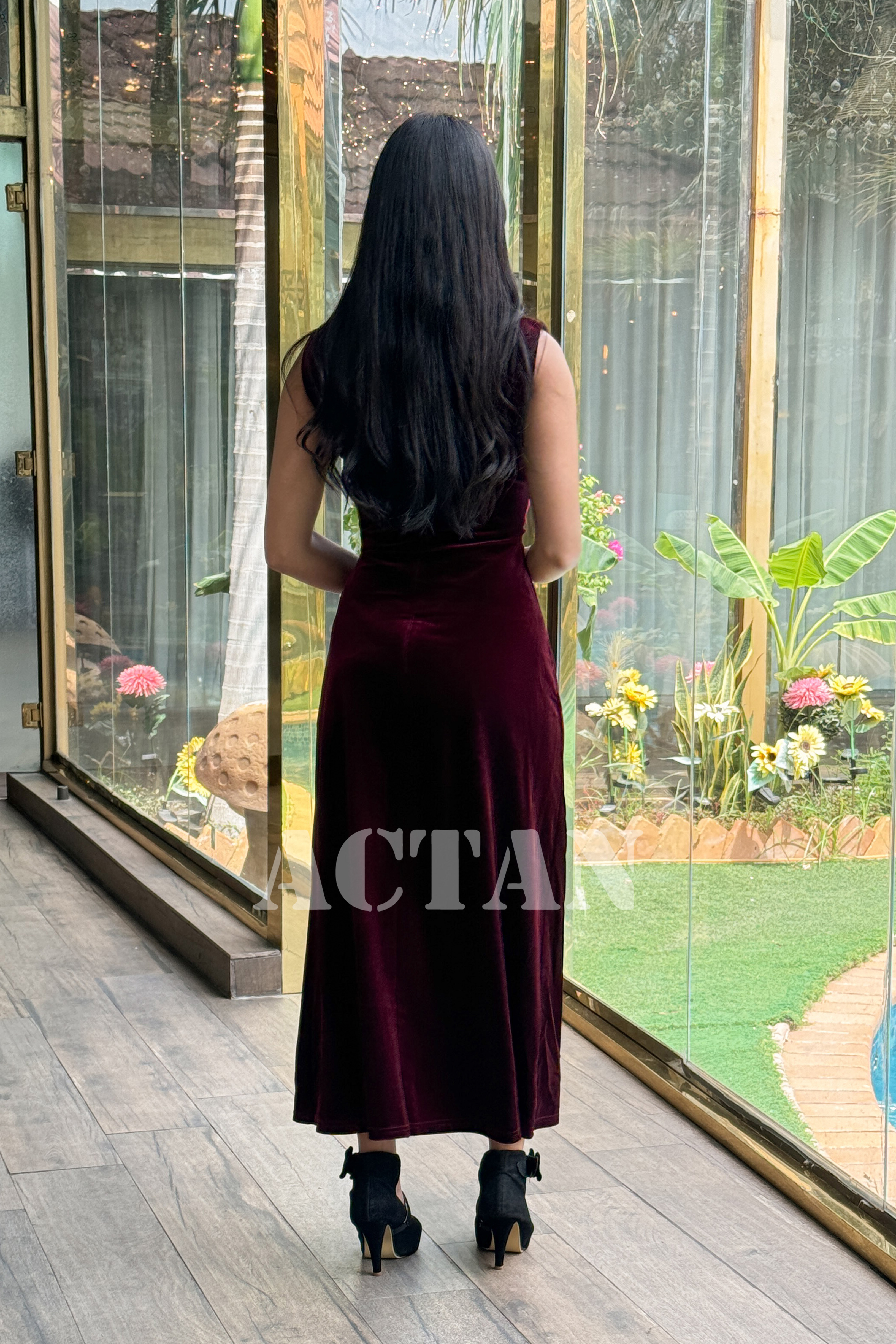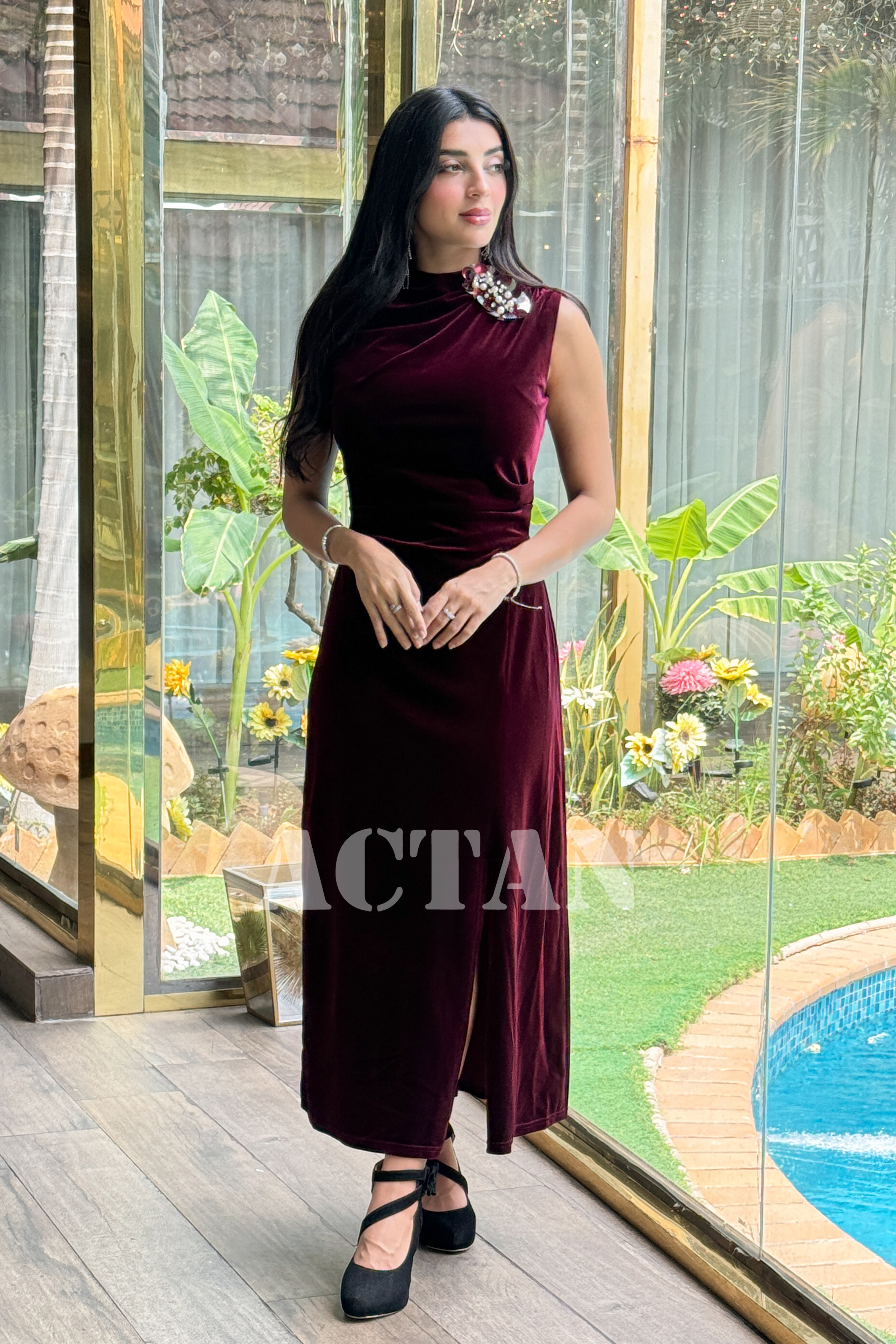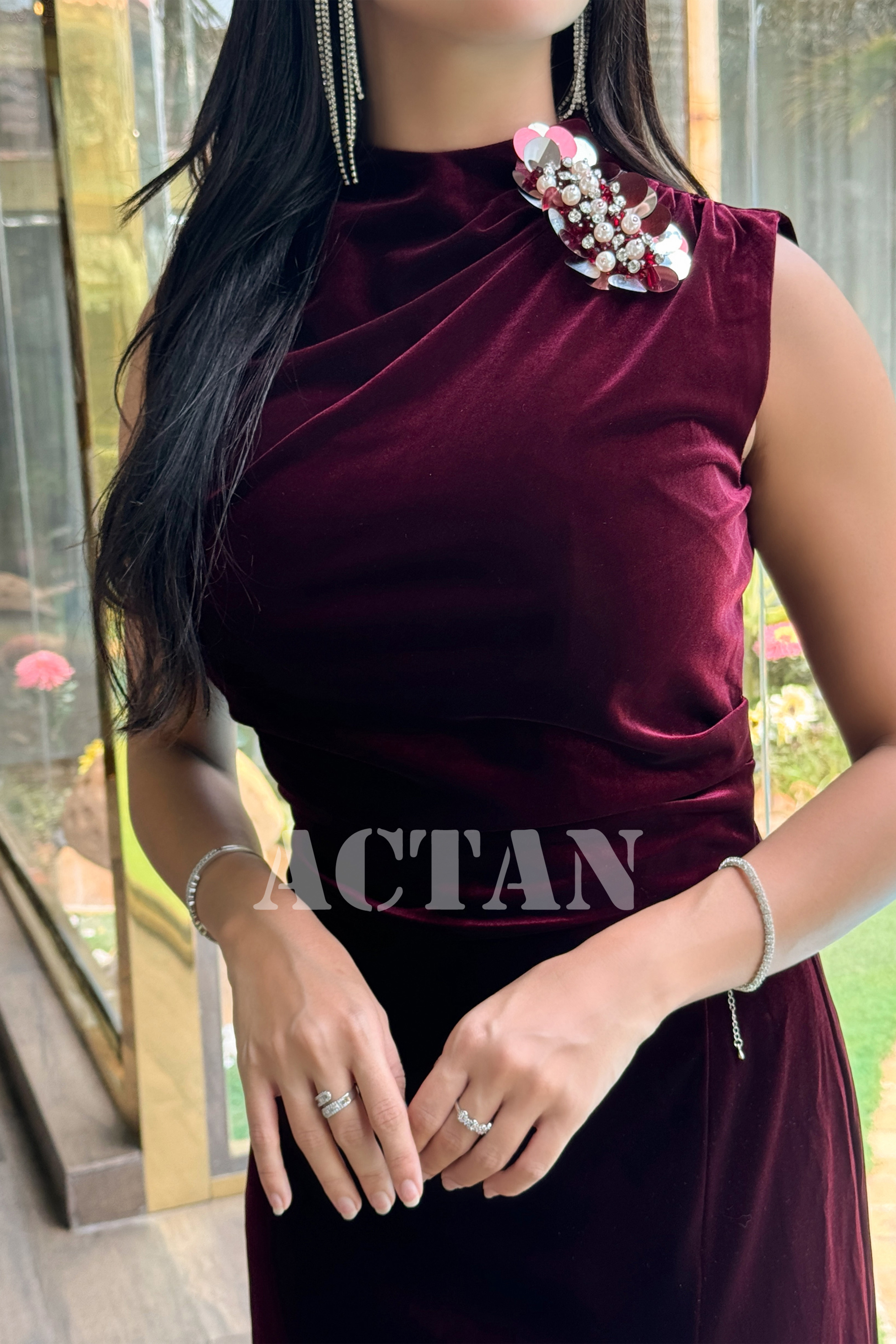 فستان مخملي بقصة ضيقة مزين ببروش لون عنابي