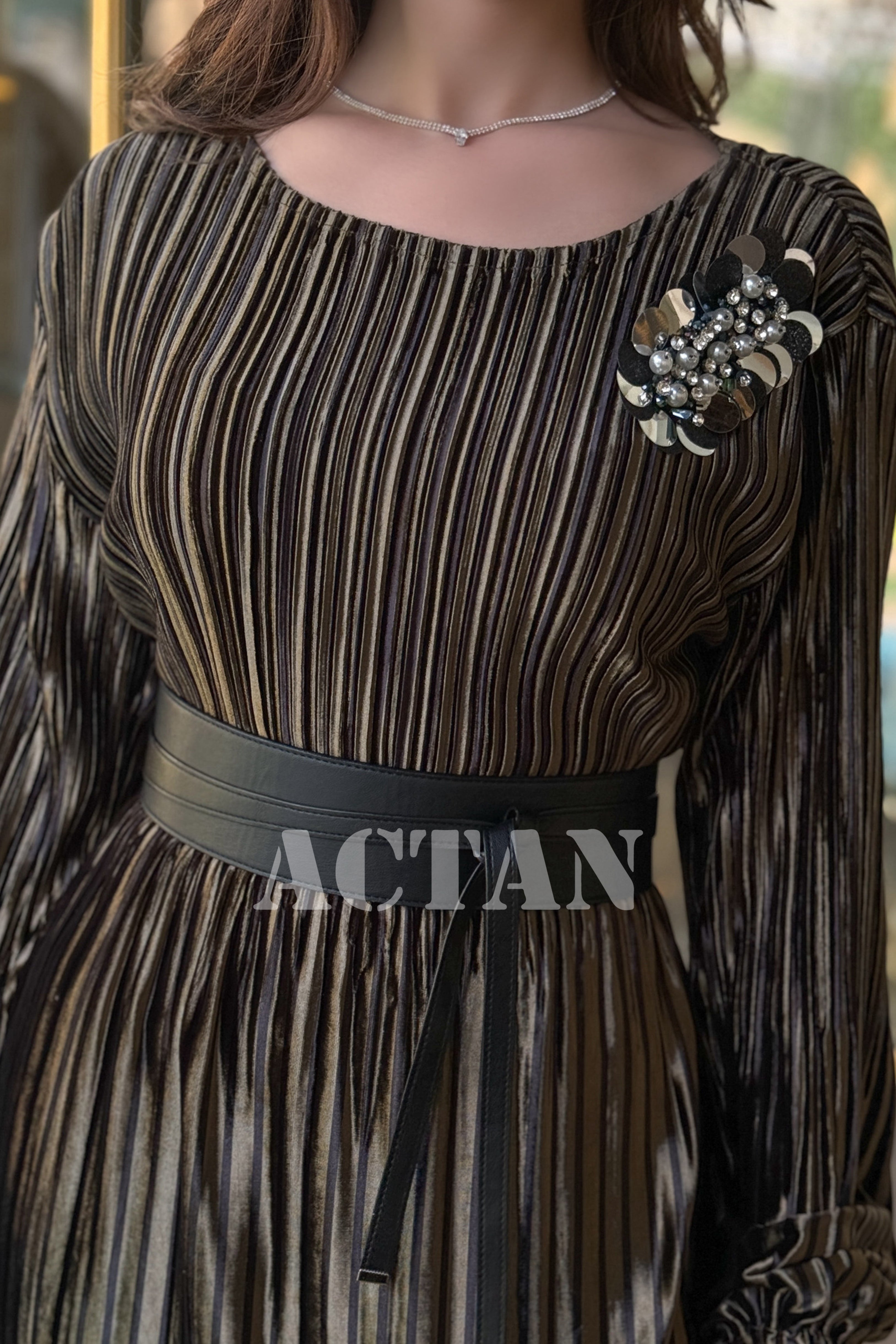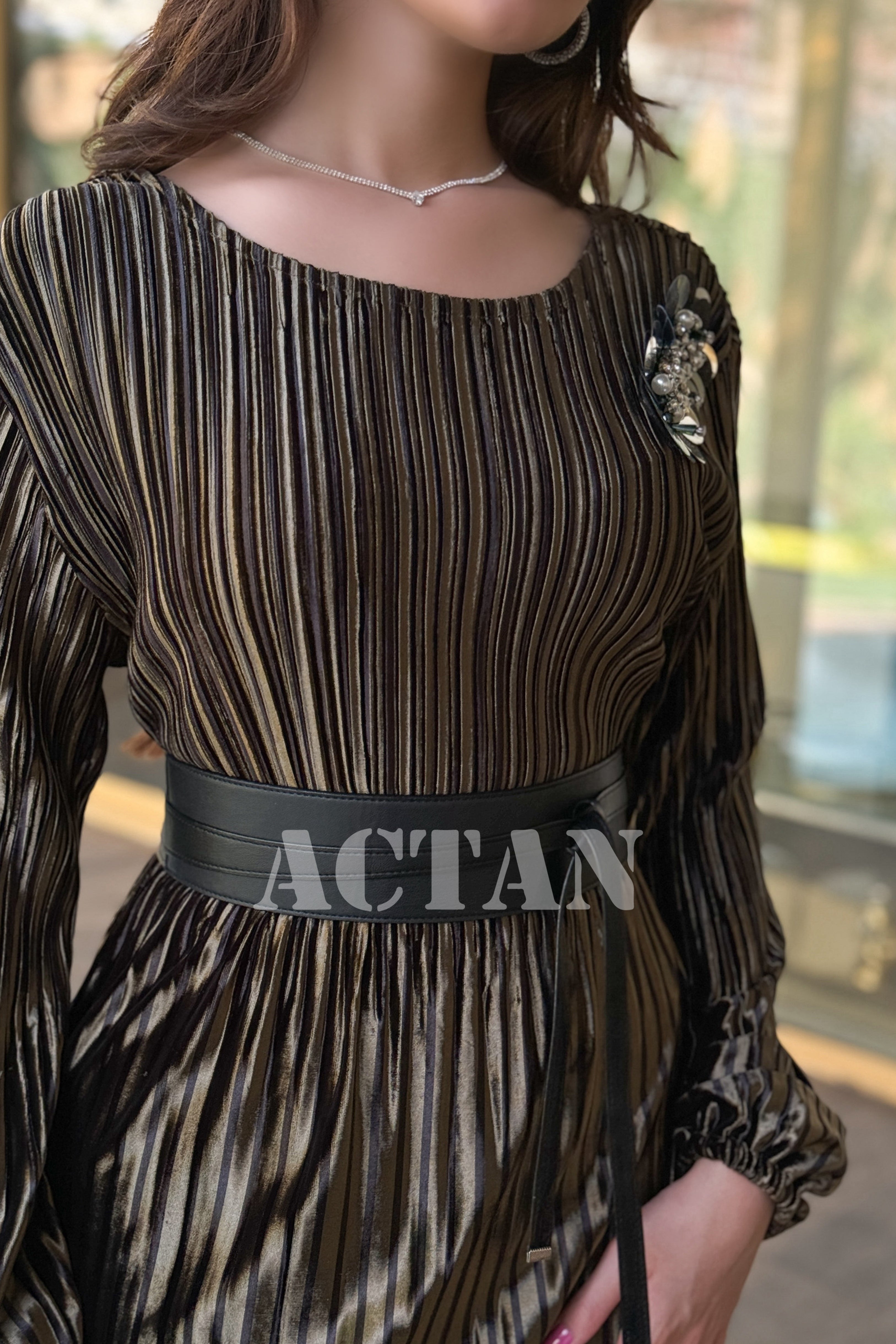 - نوع القصة: فستان مخملي بليسية مخطط مع حزام لف وبروش