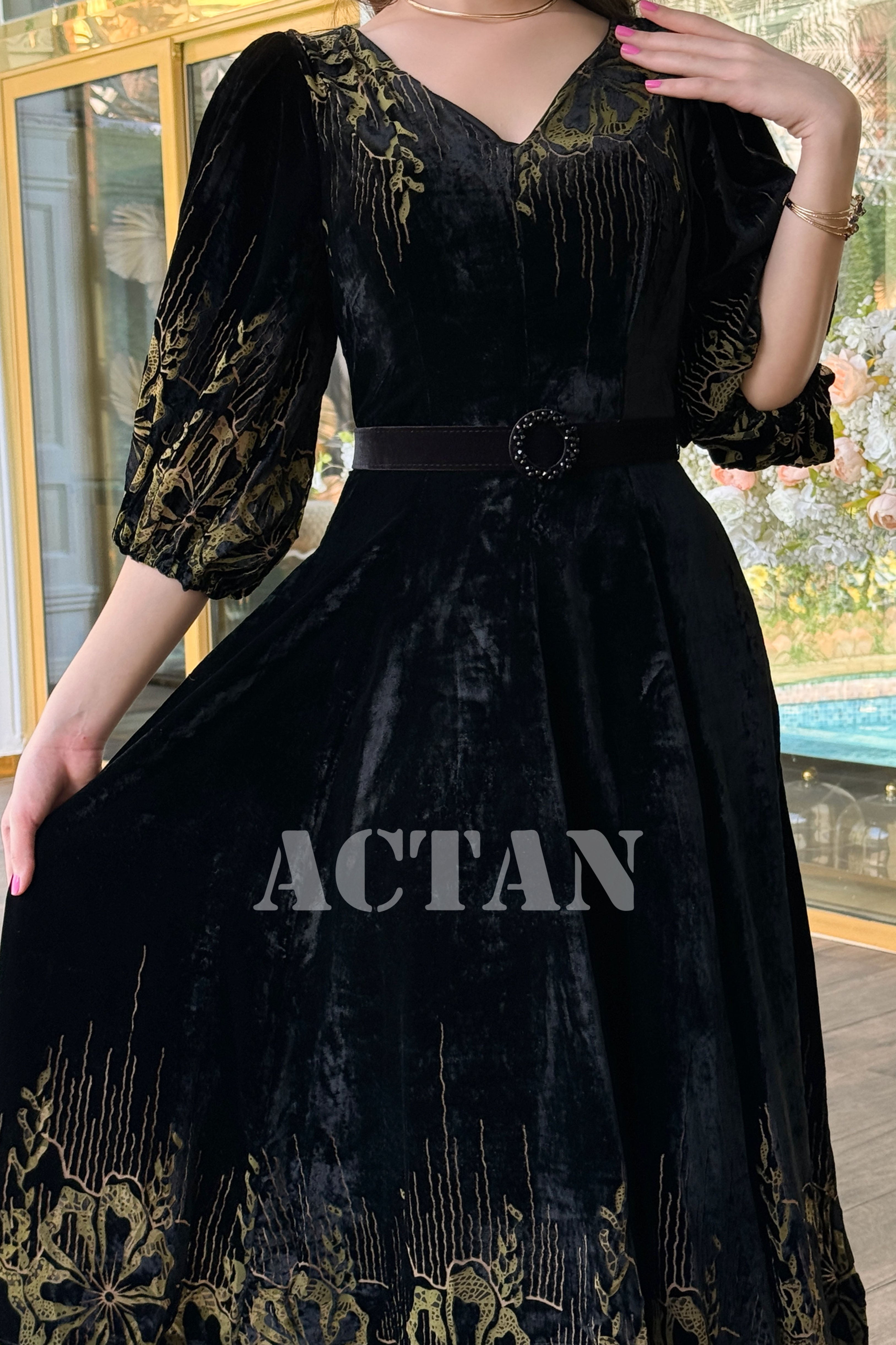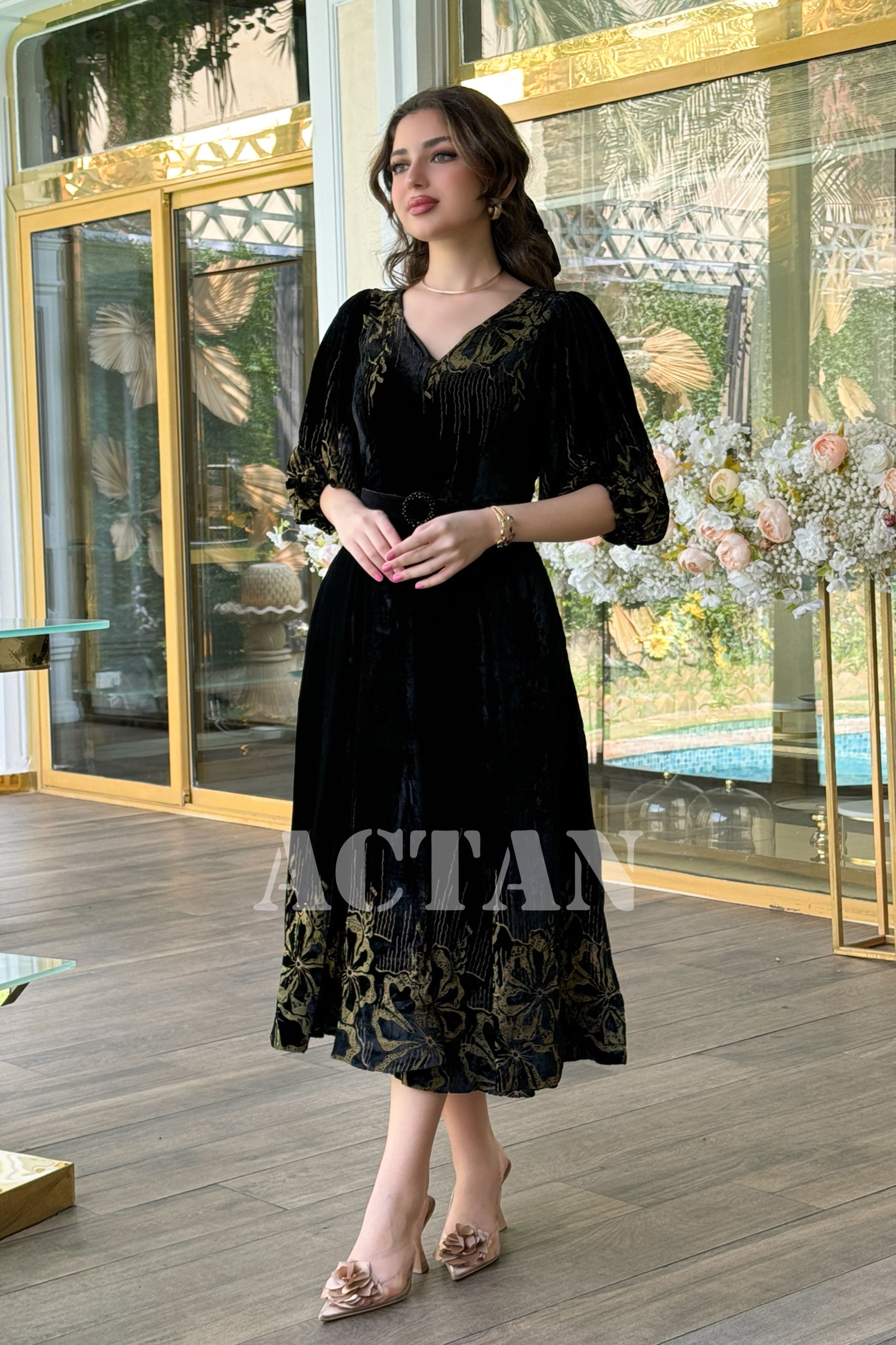 نوع التصميم: فستان مخملي ميدي بنقشة زهور