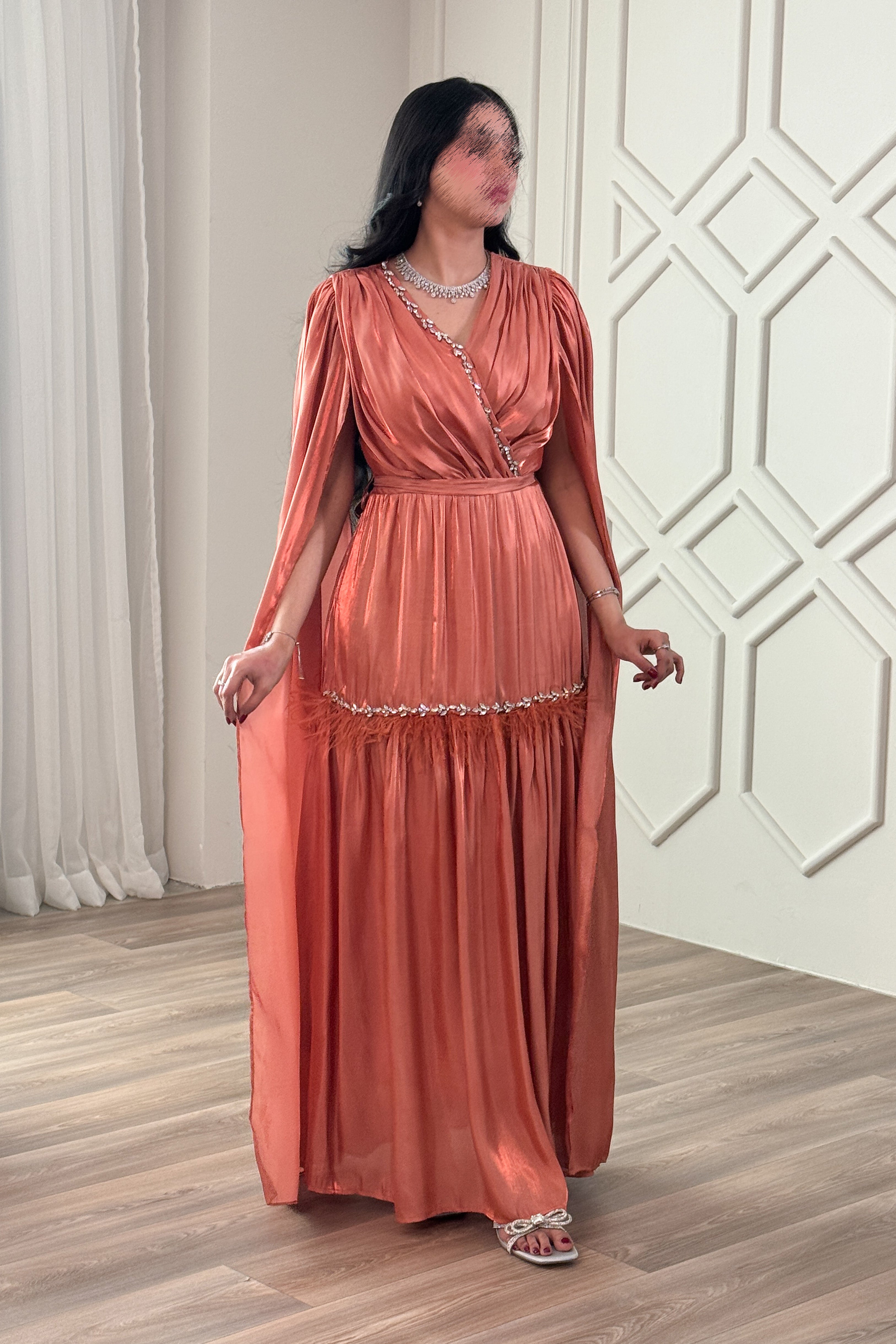 فستان ميتاليك مطرز بكريستال بتصميم كيب لون اورنج