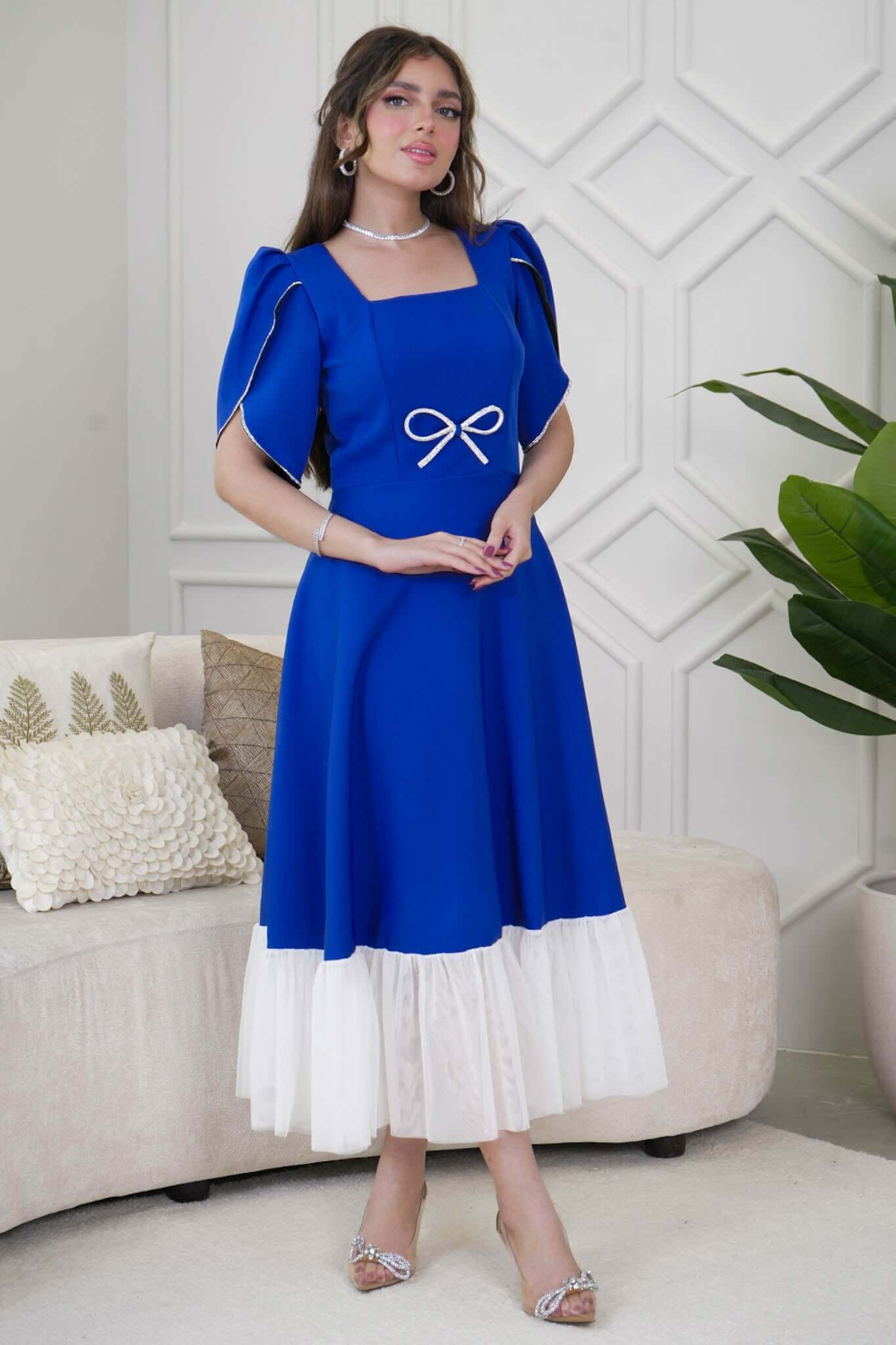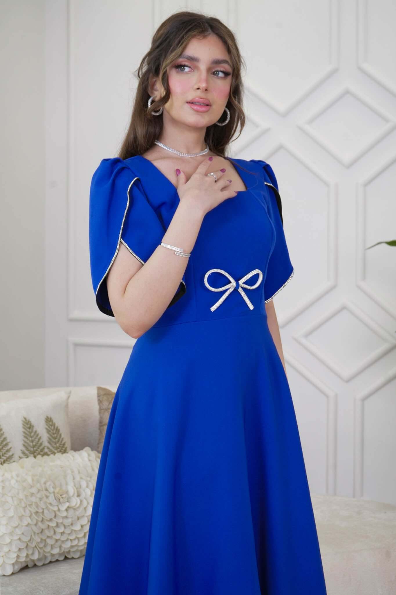 فستان ميدي بأكمام قصيرة مزينة بفصوص لون ازرق