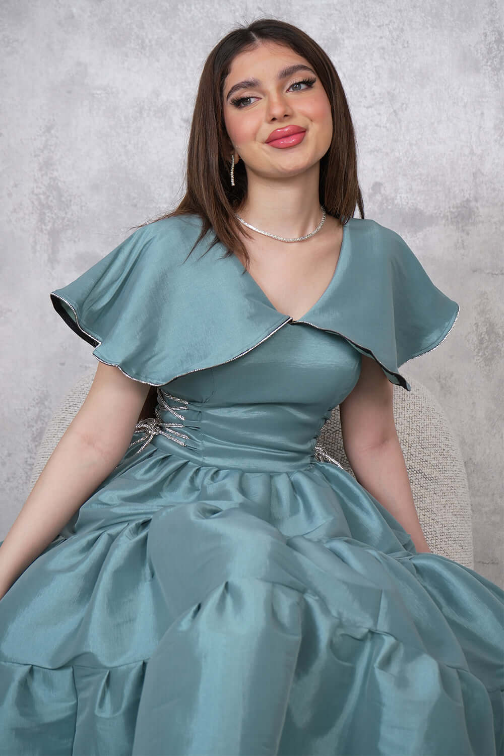 : فستان ميدي كلوش برباط من الجانب بياقة V مطوية وأكمام قصيرة