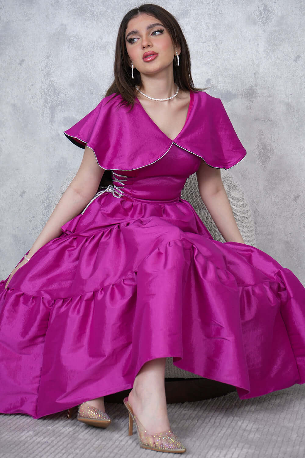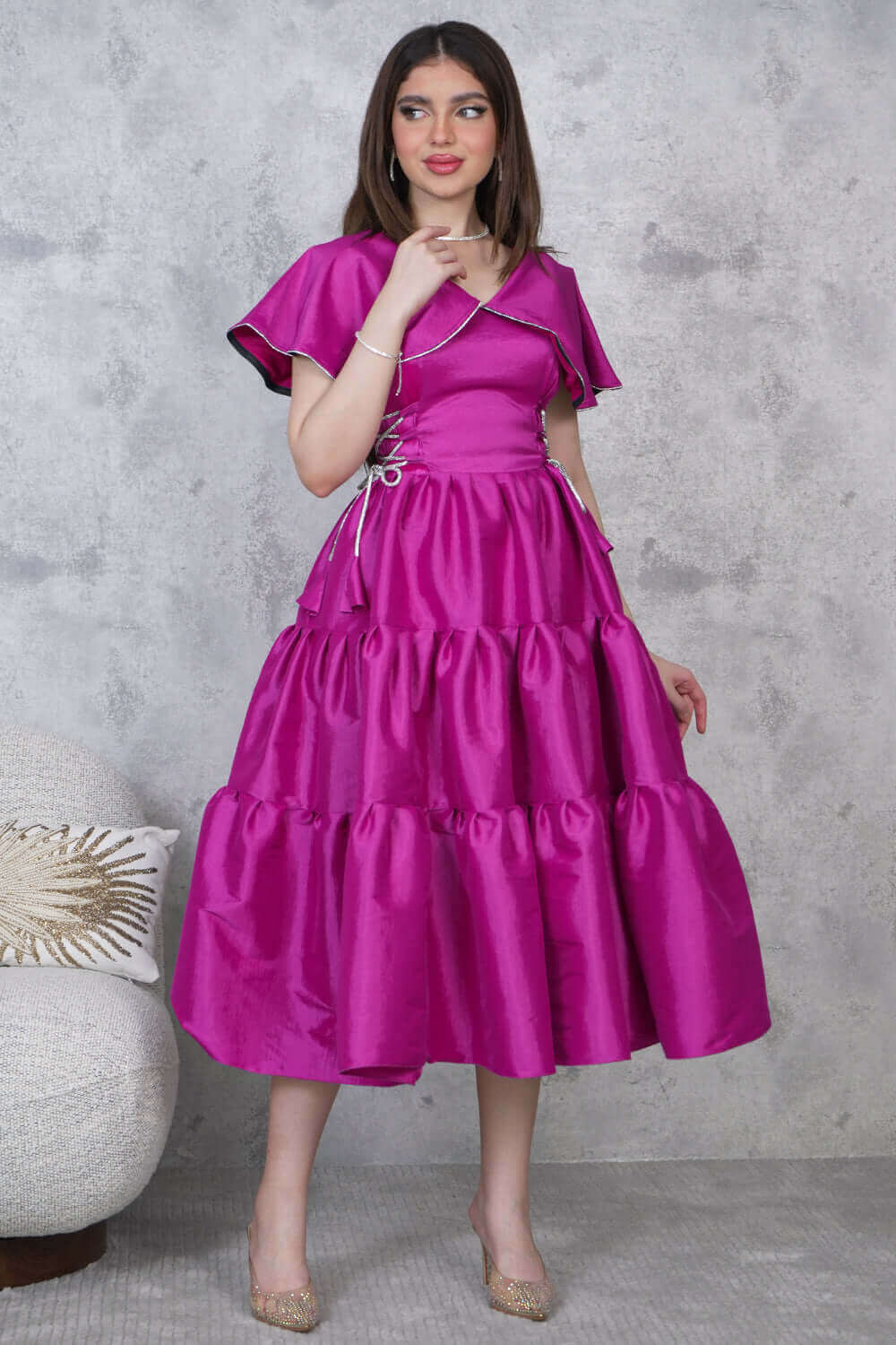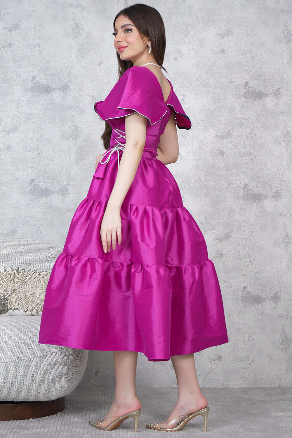 : فستان ميدي كلوش برباط من الجانب بياقة V مطوية وأكمام قصيرة