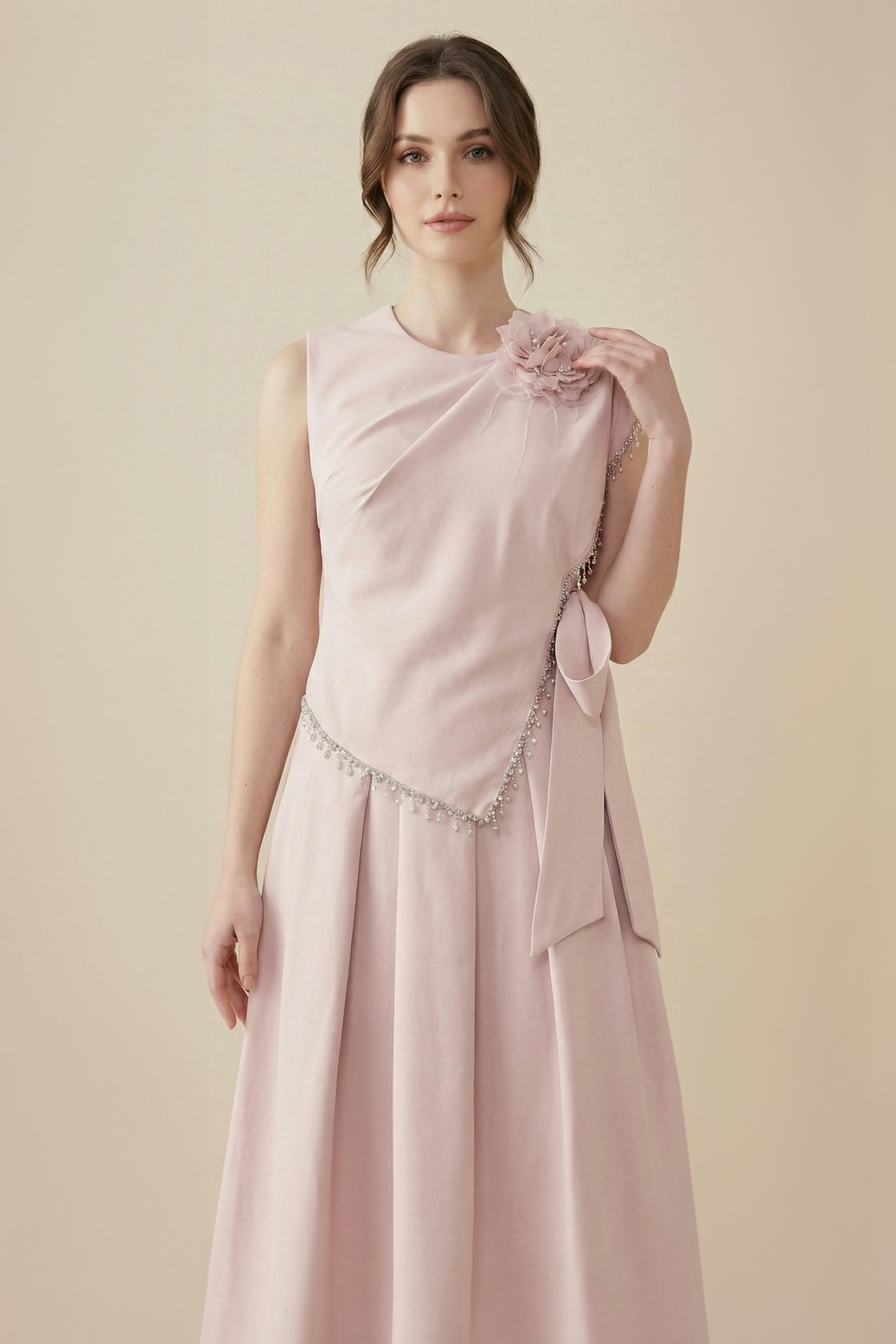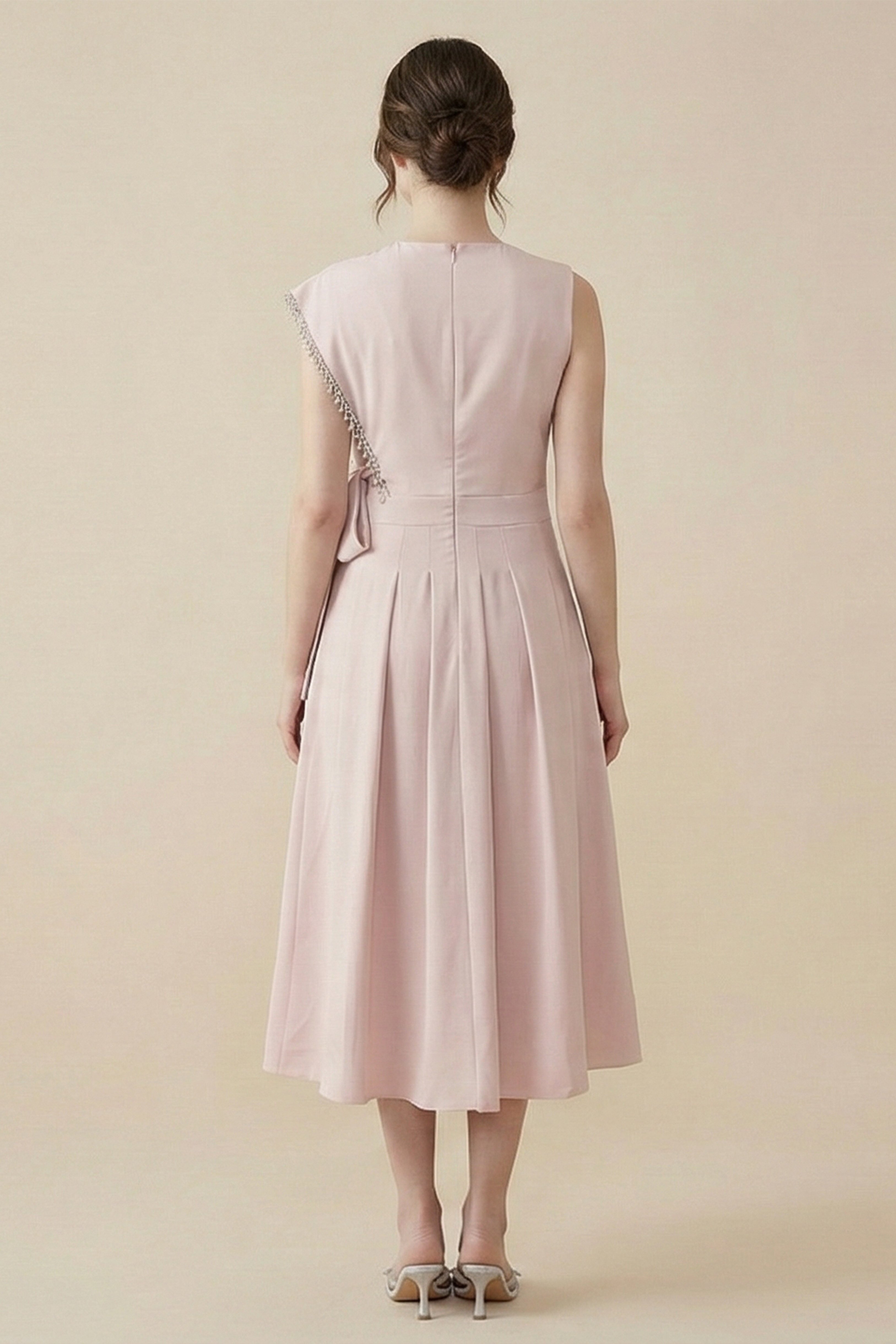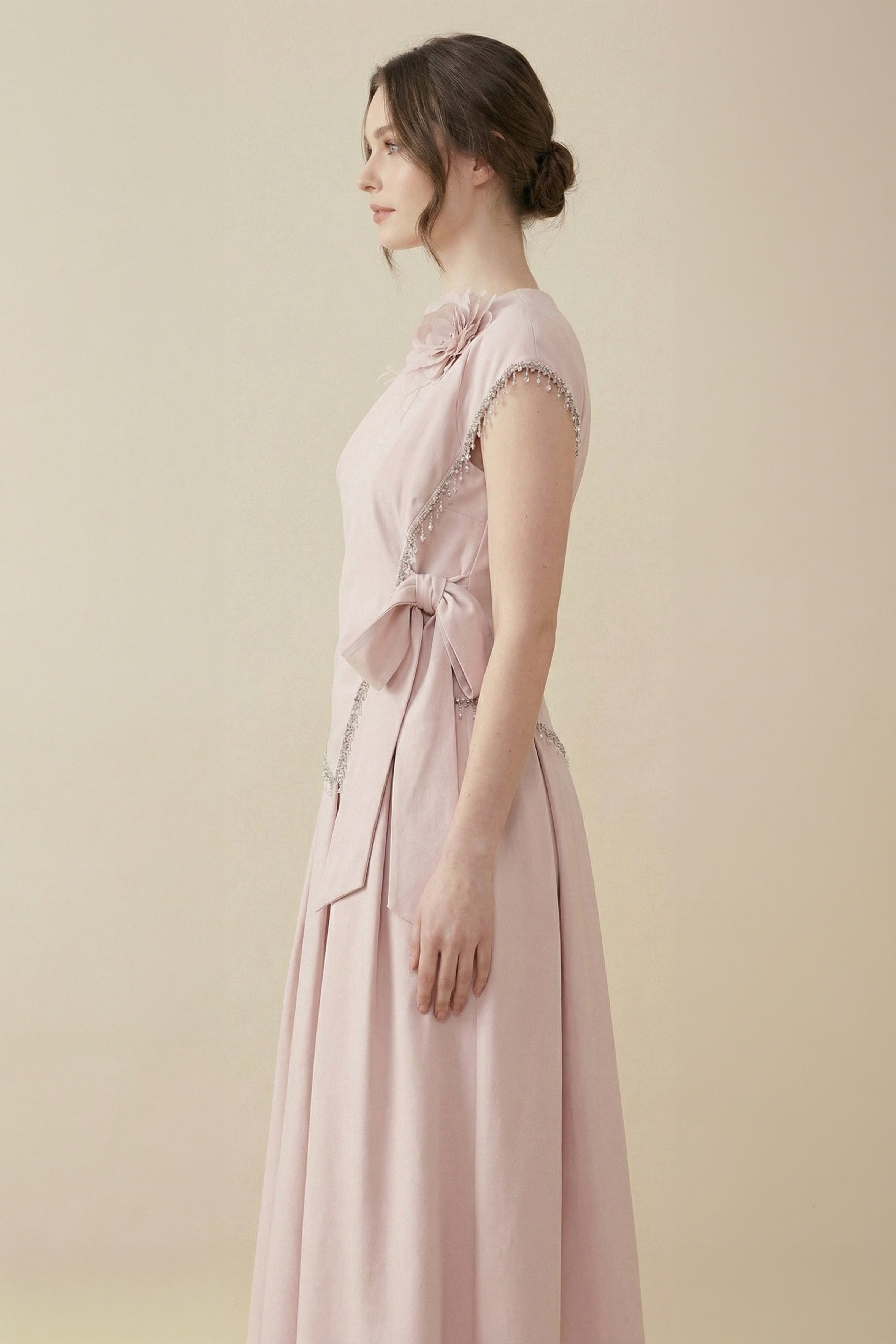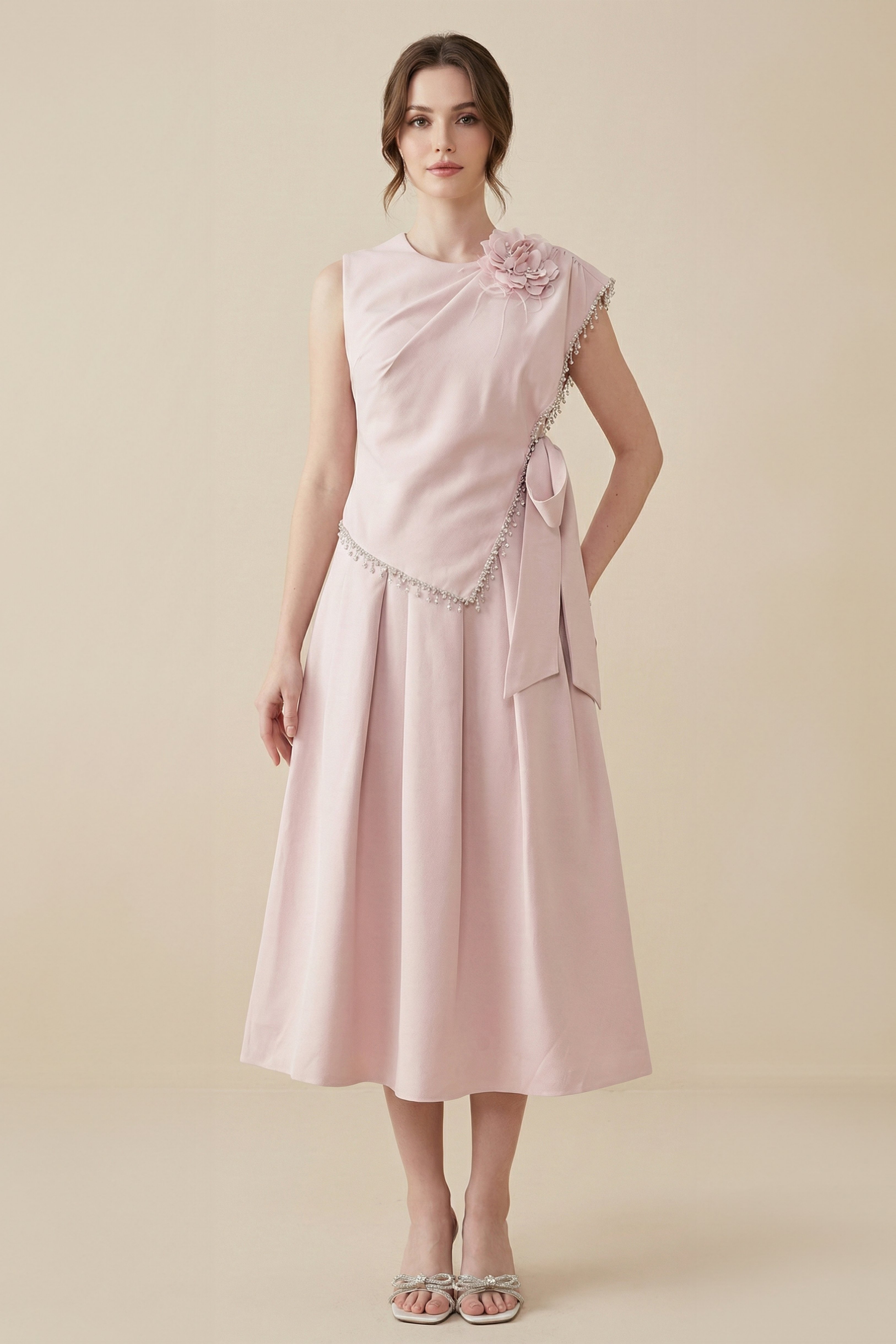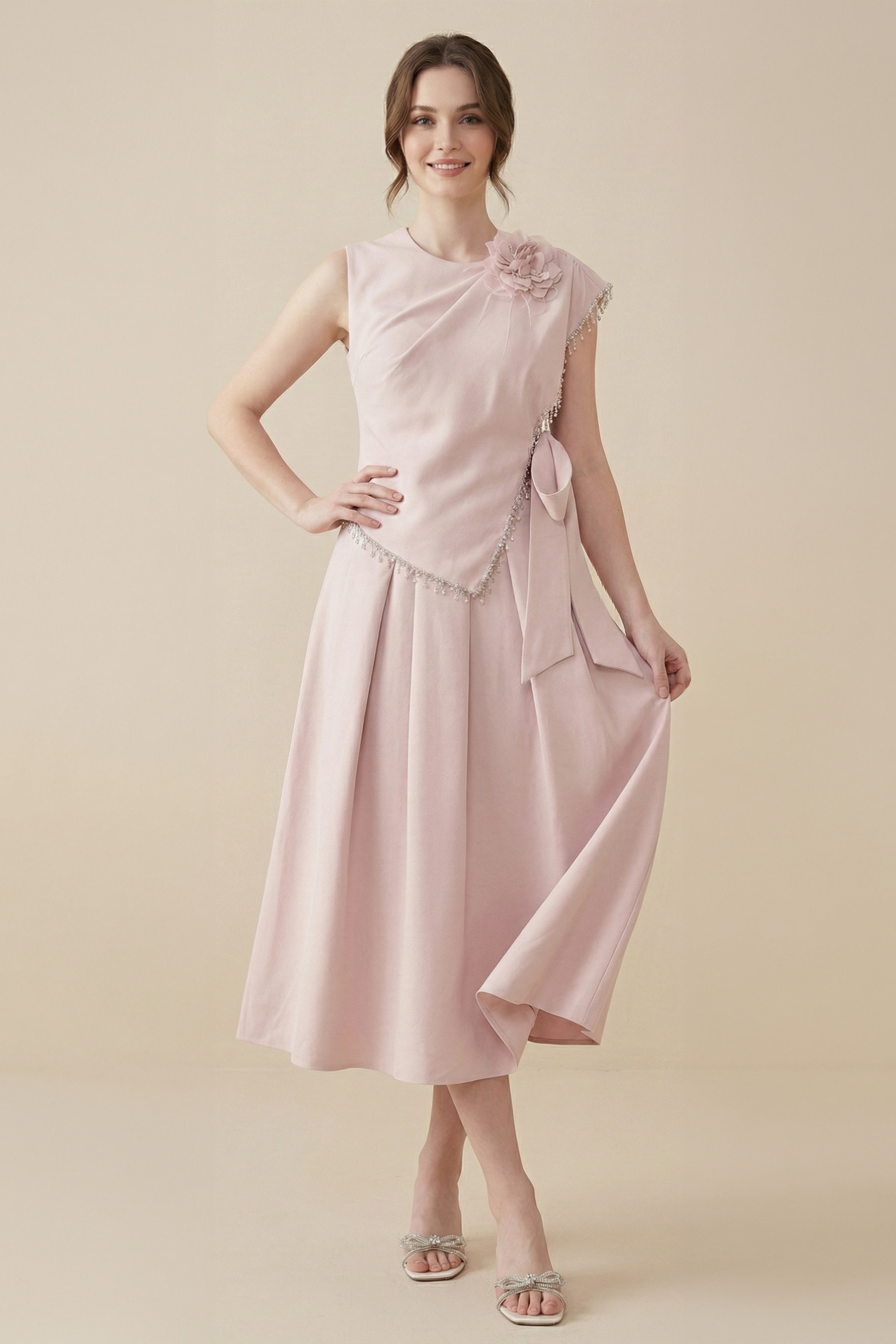 فستان ميدي بربطة مزين ببروش ورد لون وردي