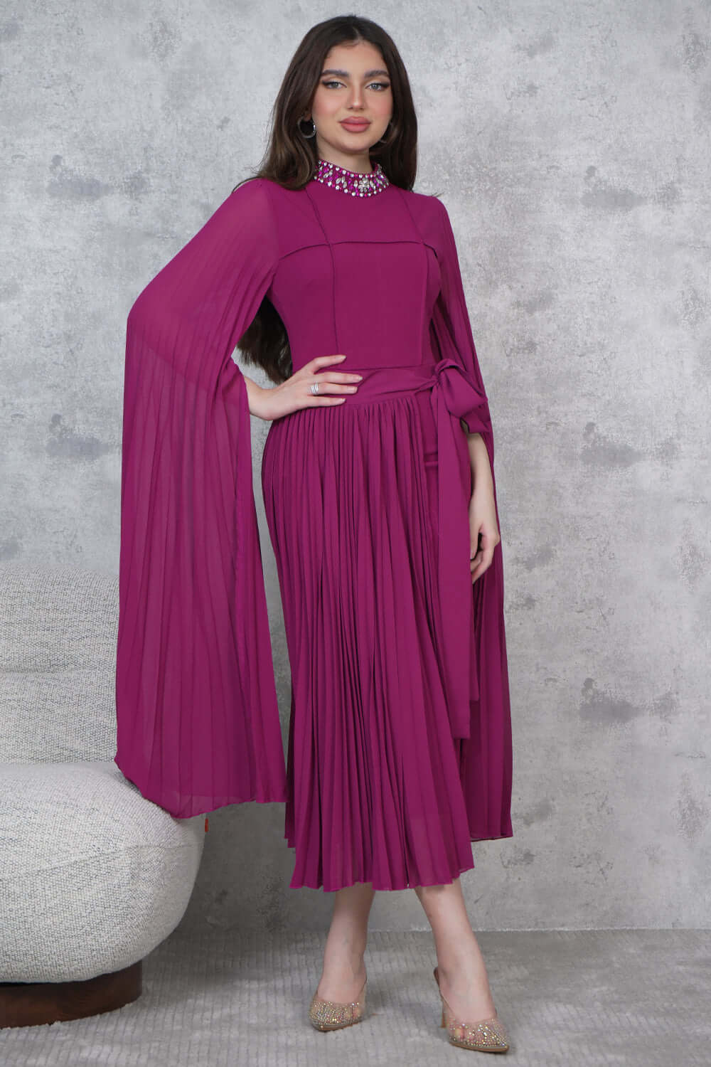 فستان ميدي قطعتين مع تنورة لف بليسيه وأكمام كيب طويلة بياقة مرتفعة