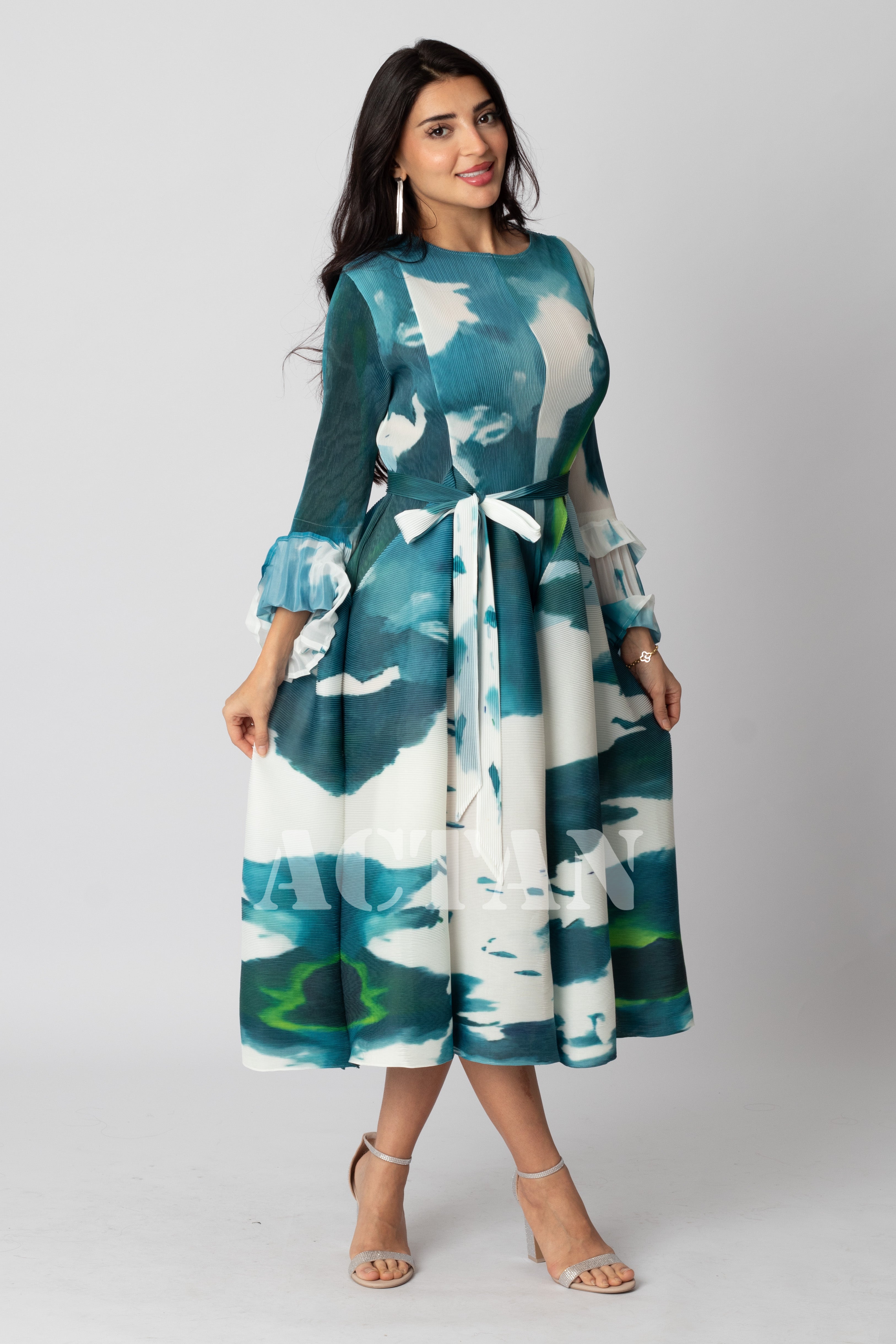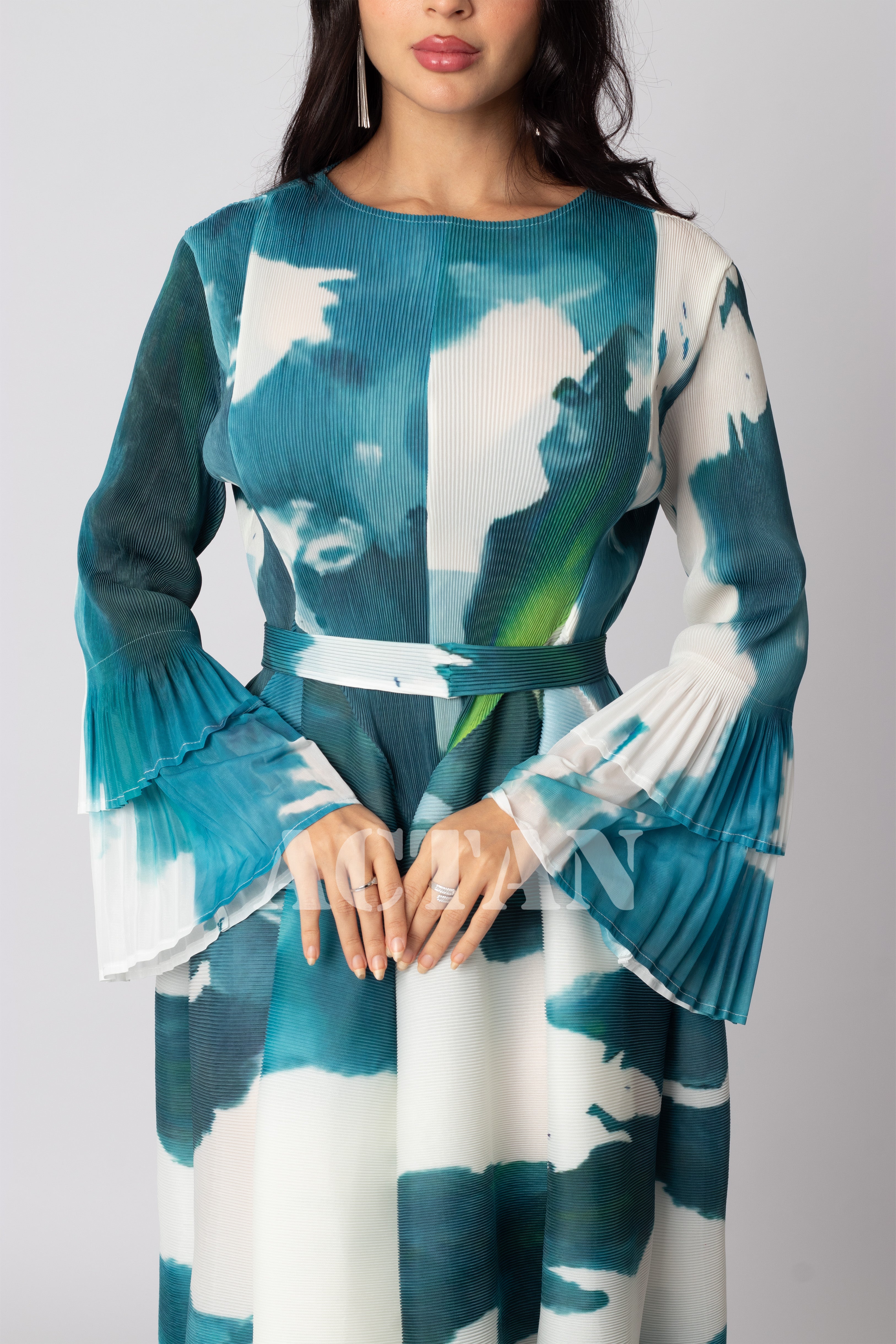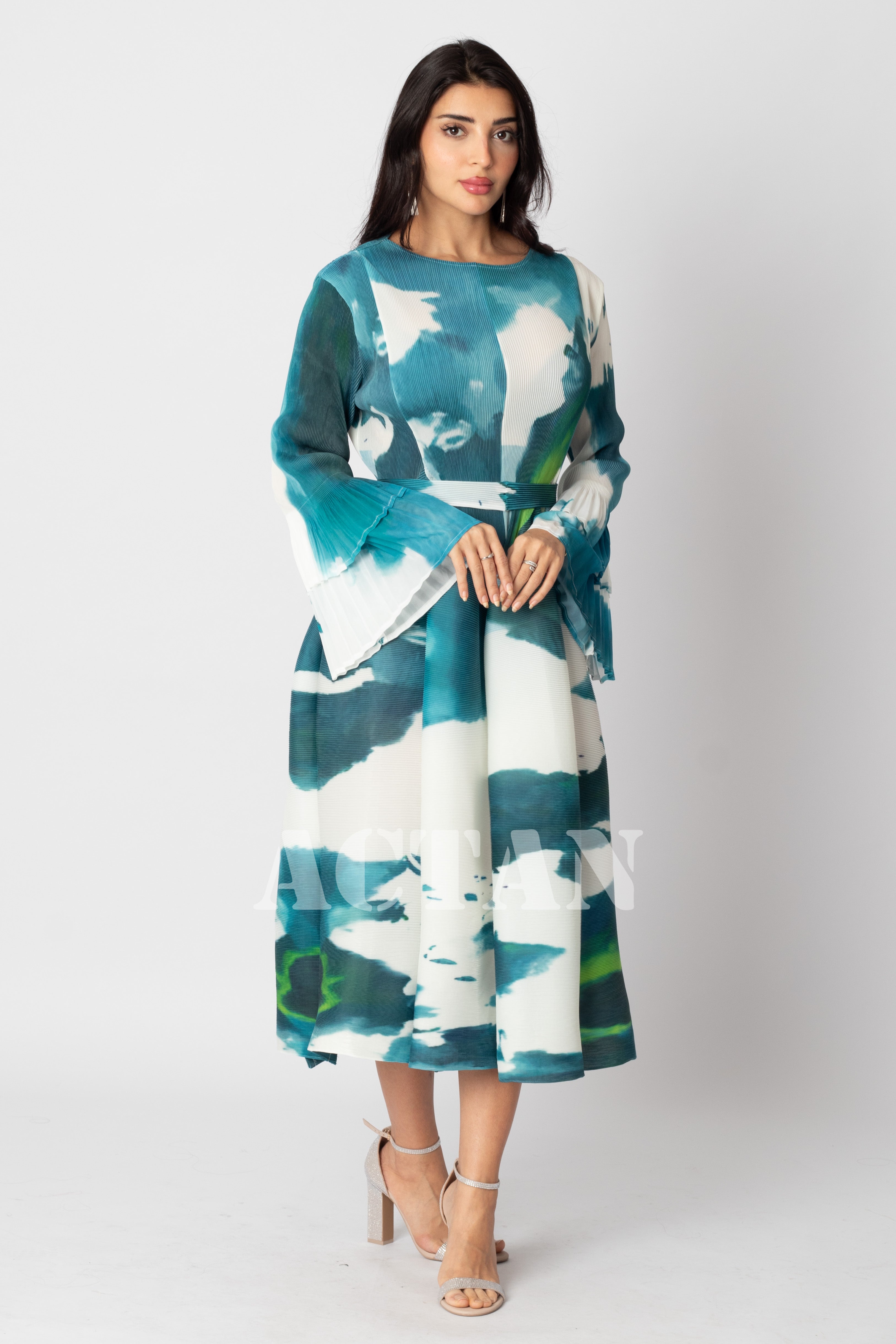 نوع القصة: فستان ميدي بليسيه مطوي بطبعة جرافيك بأكمام طويلة