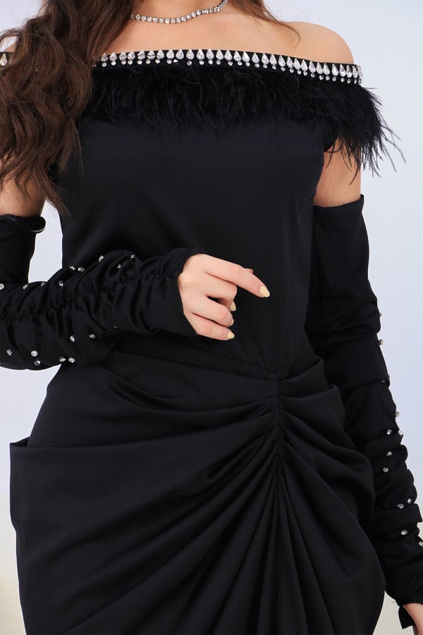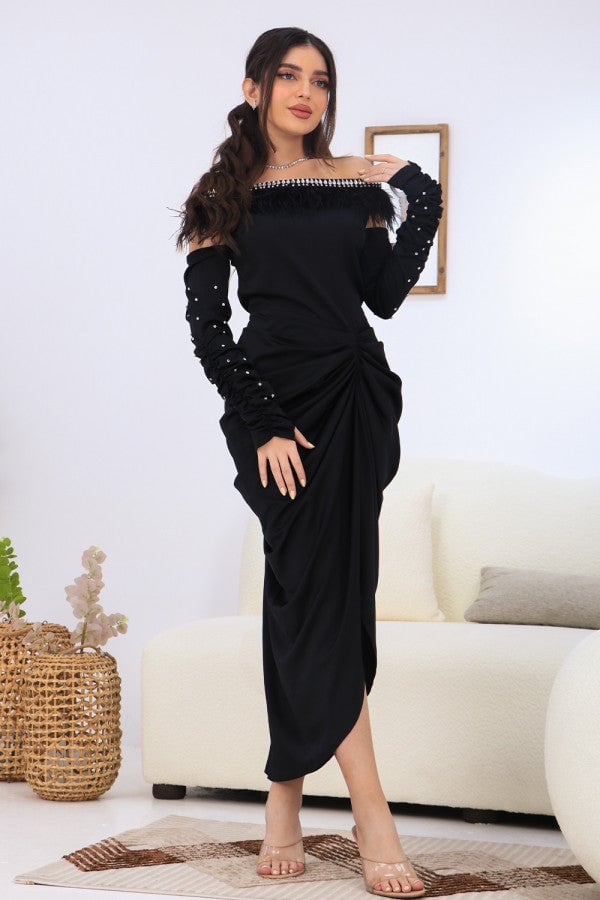فستان ميدي بياقه مطرزه ومزينه بريش لون اسود