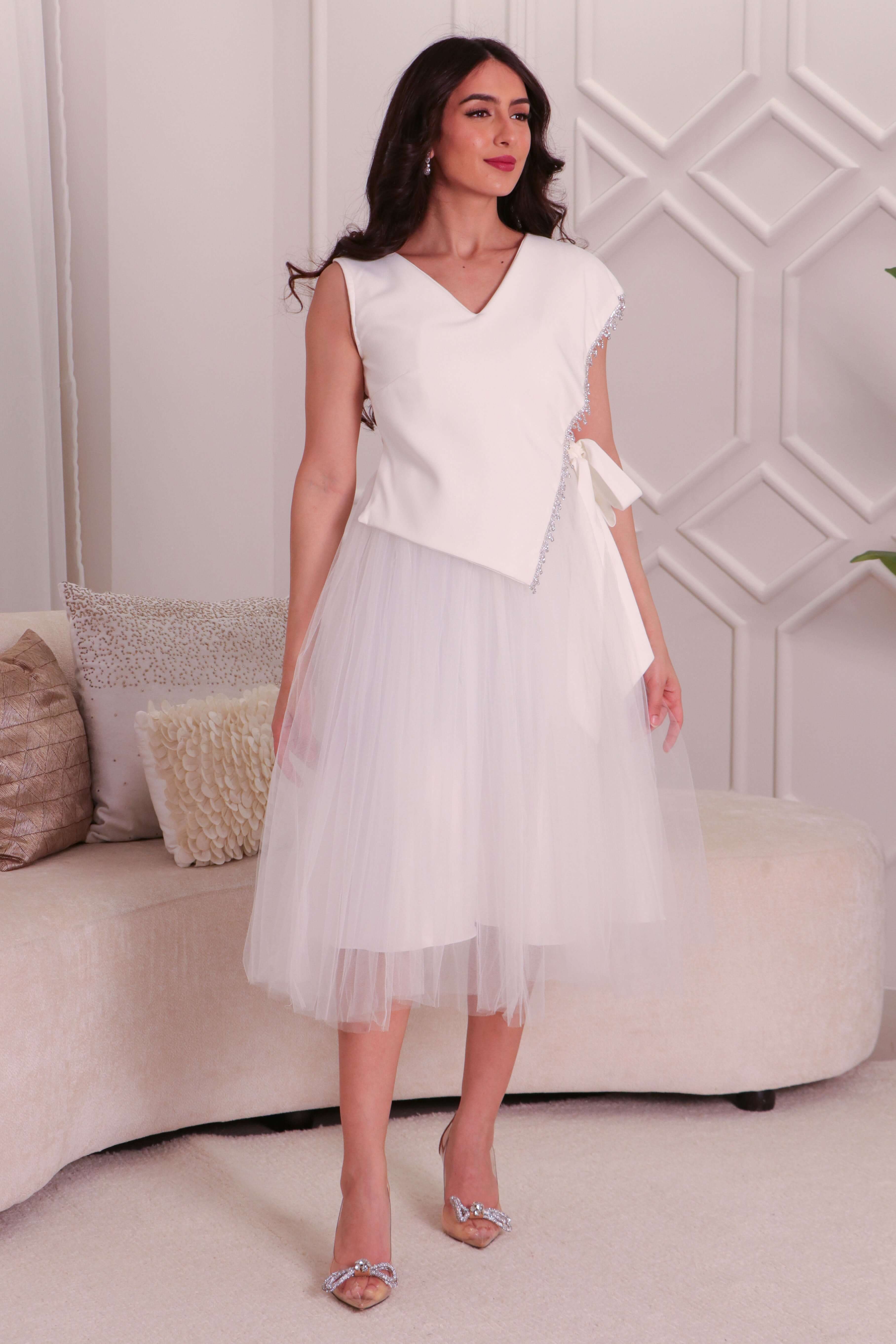 : فستان ميدي تول بربطة من الجانب مزين بالكريستال