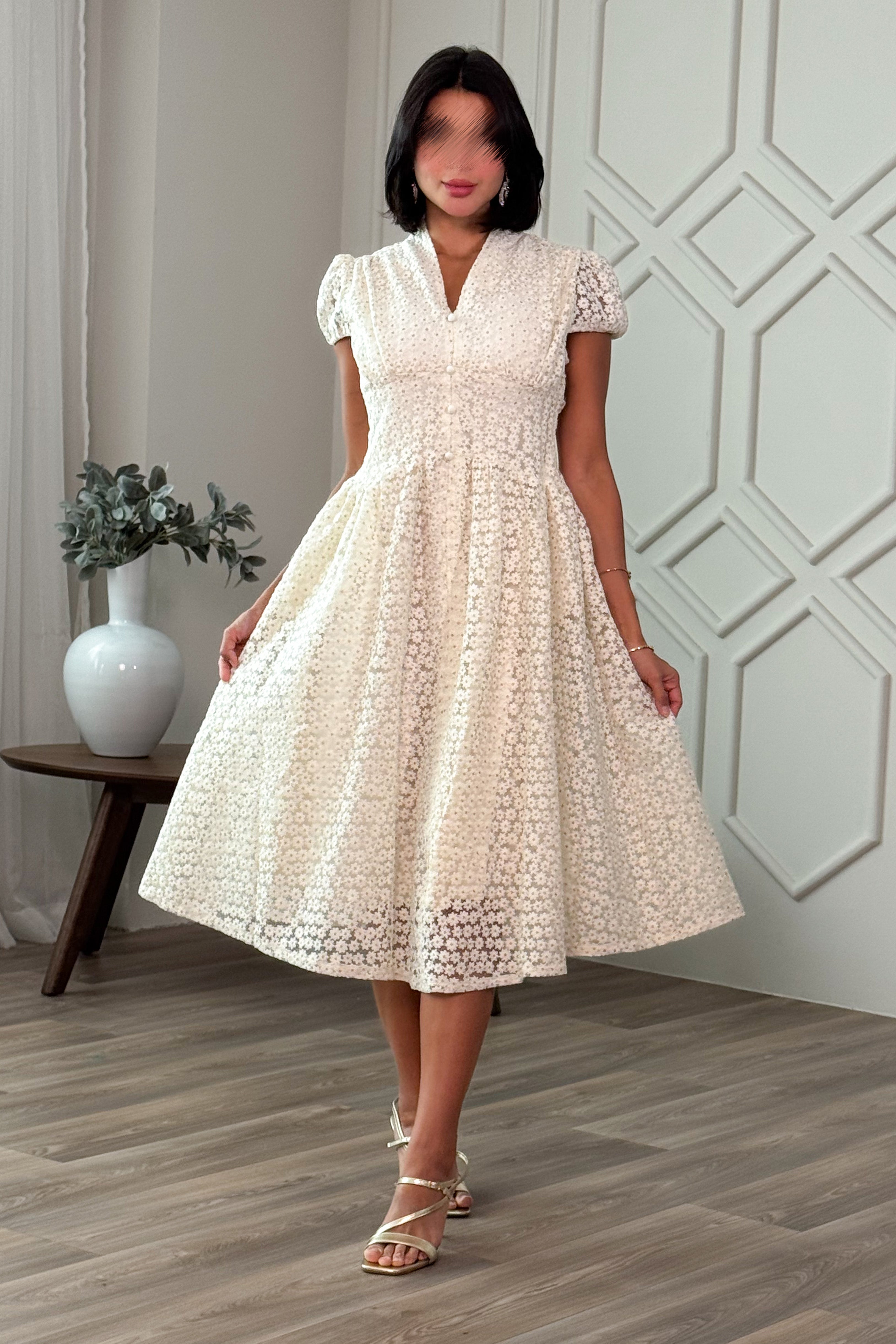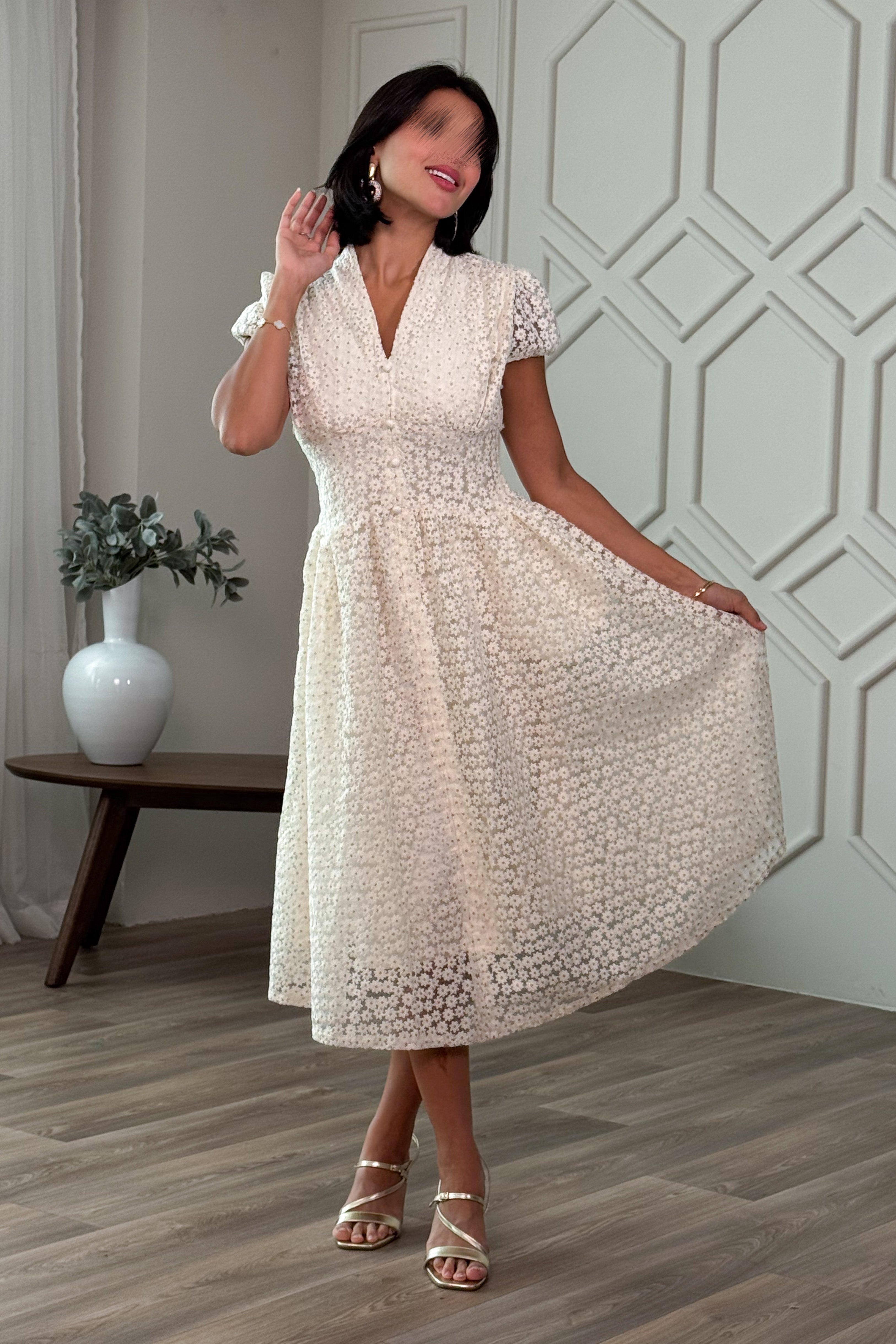 فستان ميدي كلوش مورد بأكمام قصيرة وياقة V