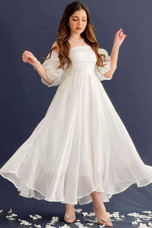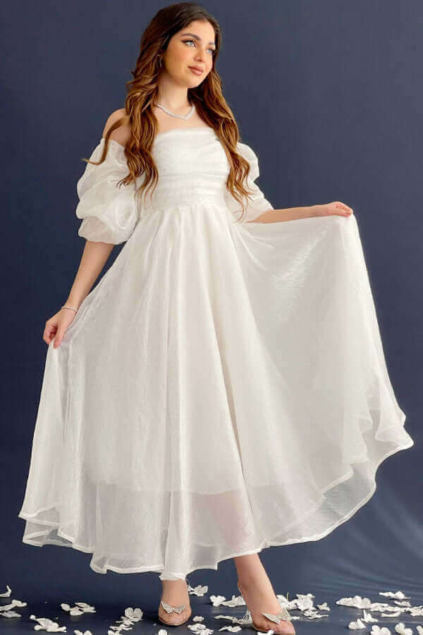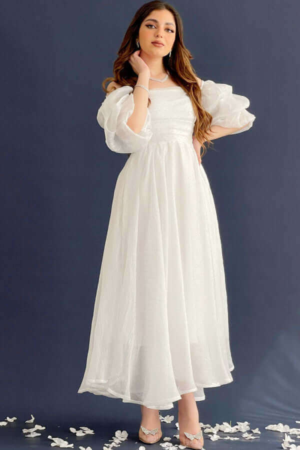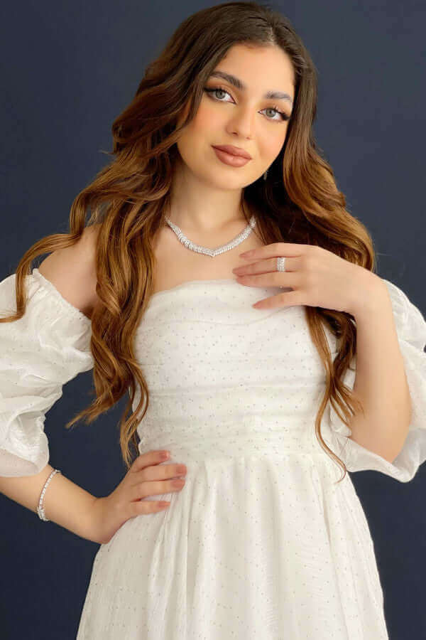 الخامة شيفون نمط منقط نوع التصميم فستان ناعم اكمام بف نوع القصة طويل قصة دائريه كلوش لبصدر درابيه واكمام بف بوديكون المناسبة خروج حفله او سهره الخصر زم كلوش الياقة تب الاكمام كتف نازل بف بوديكون التمدد غير قابل لتمدد ارشادات العناية قابل للغسيل والكي بدرجة حراره منخفضه طول المودل