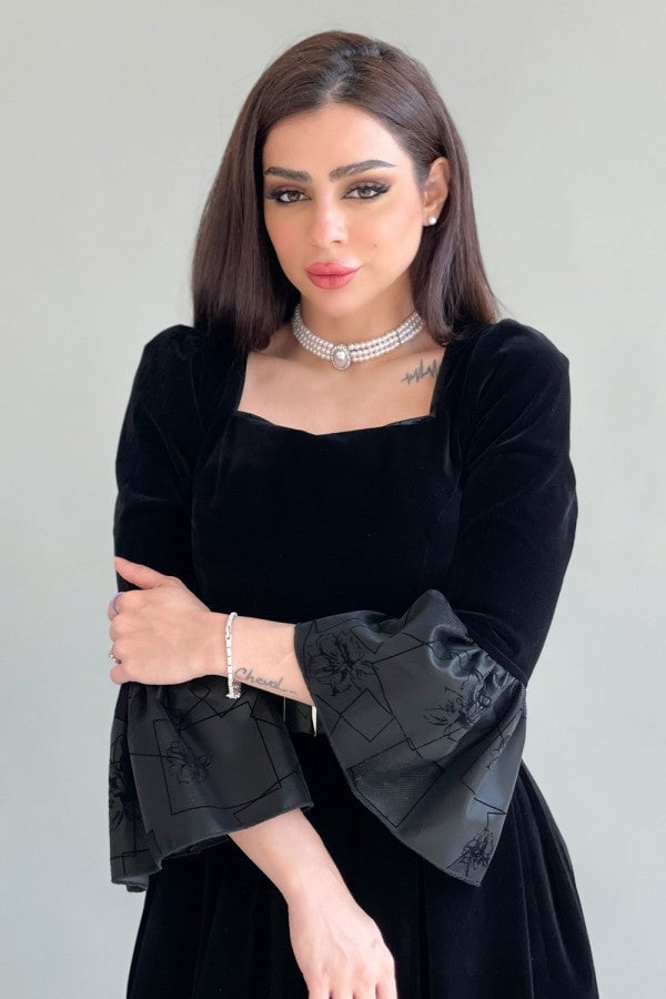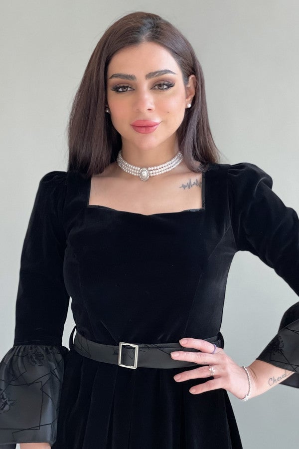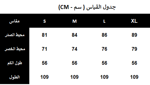 - نوع القصة: قصير، مزموم عند الخصر كلوش بحزام جلد، وياقة مربعة، وأكمام حيران