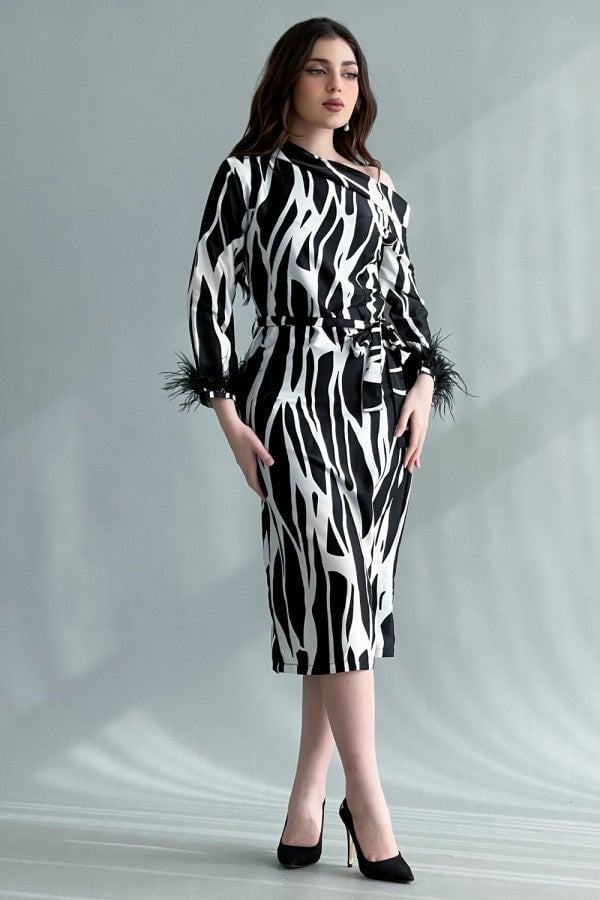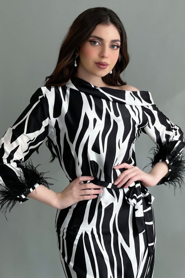 فستان ون شولدر مزين بريش لون ابيض مع اسود