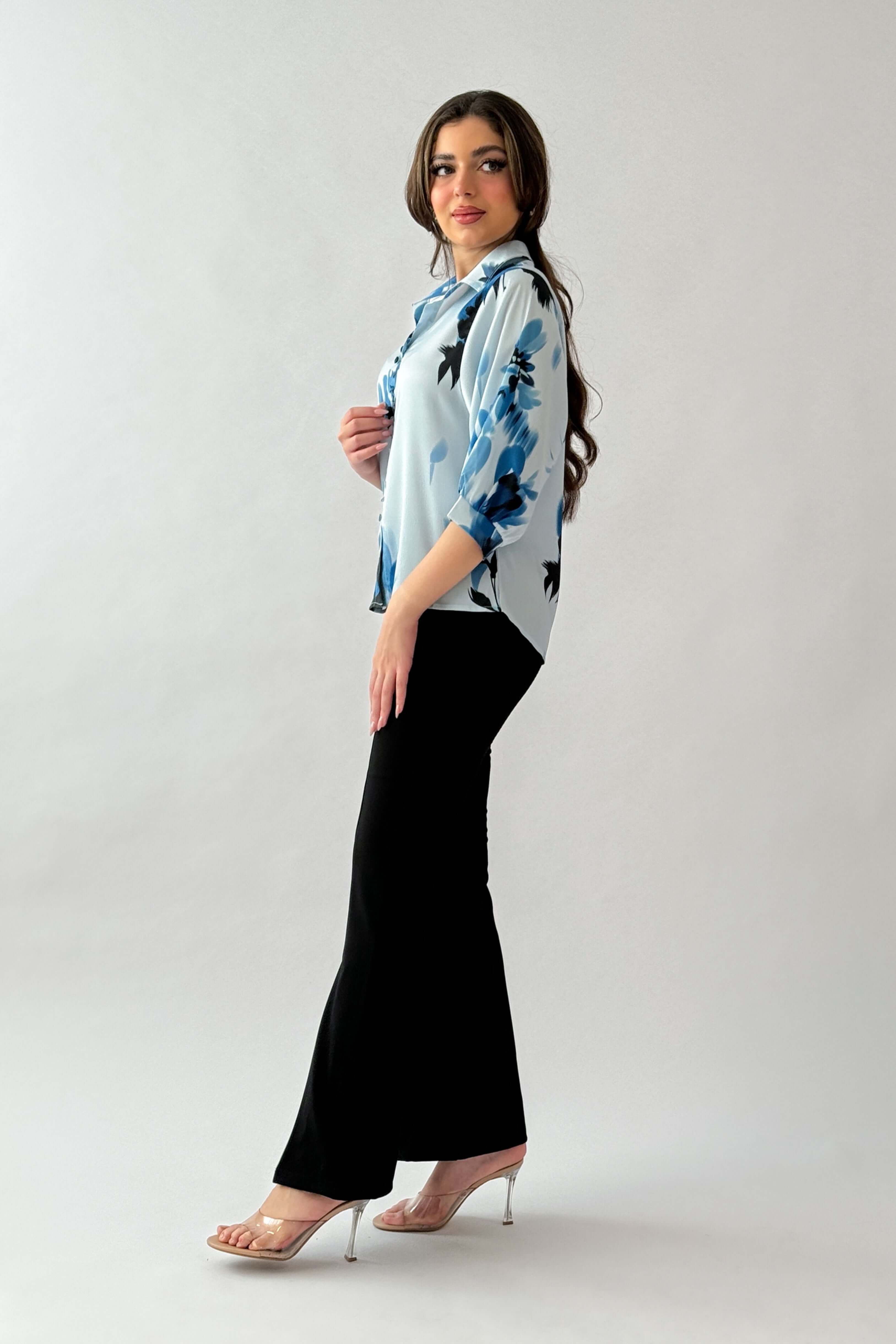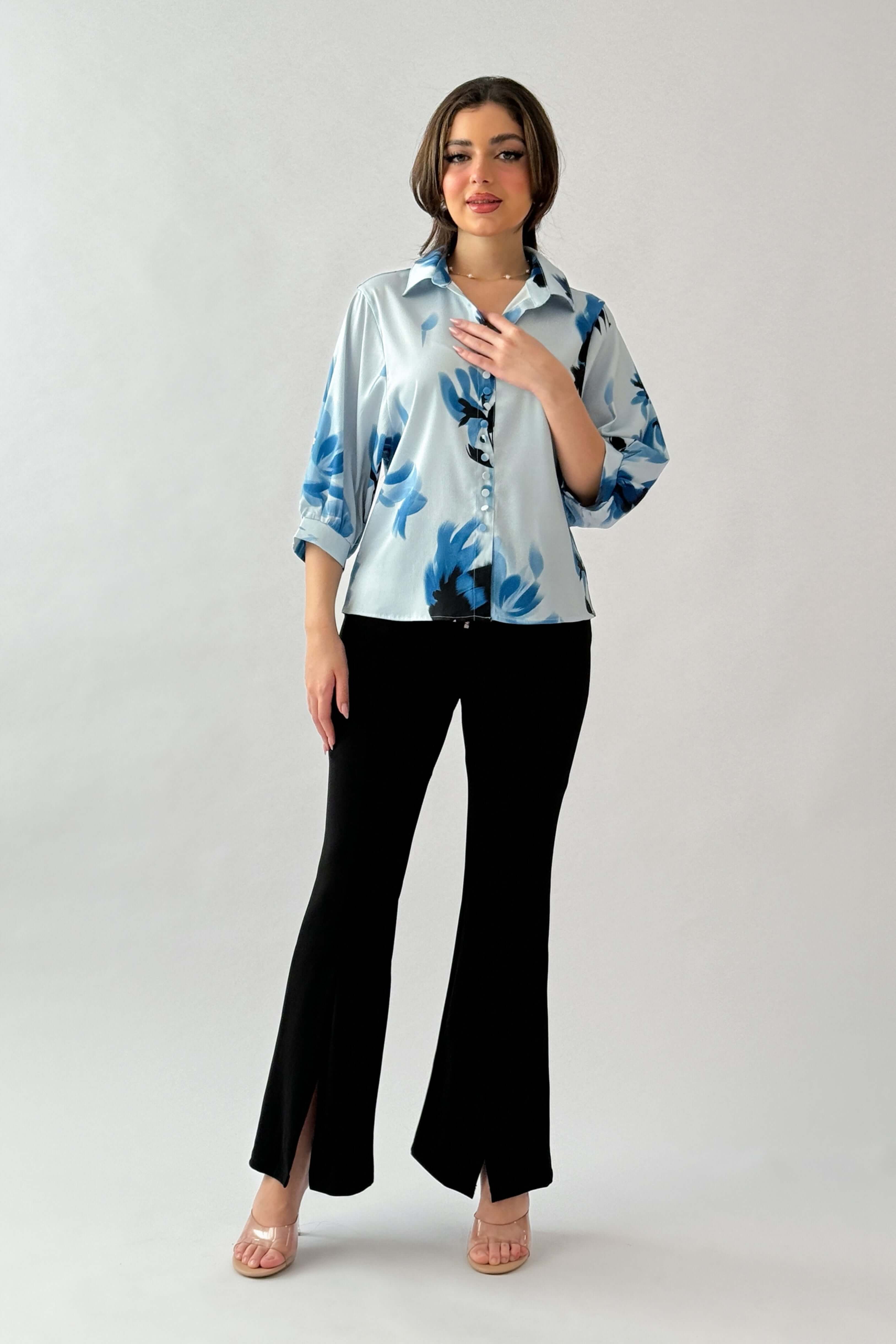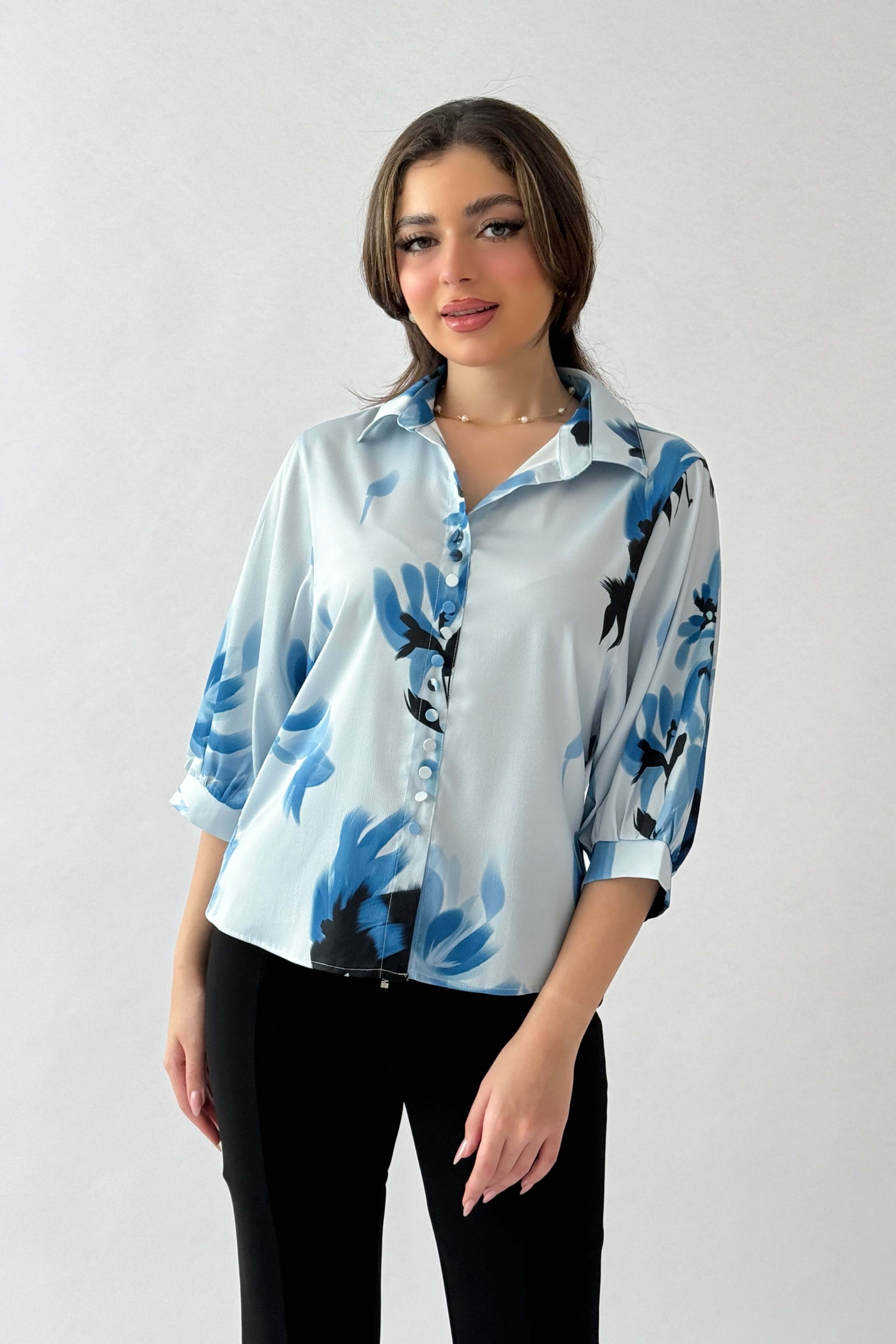 قميص ساتان بطبعة ورد بأكمام 3\4 لون ازرق
