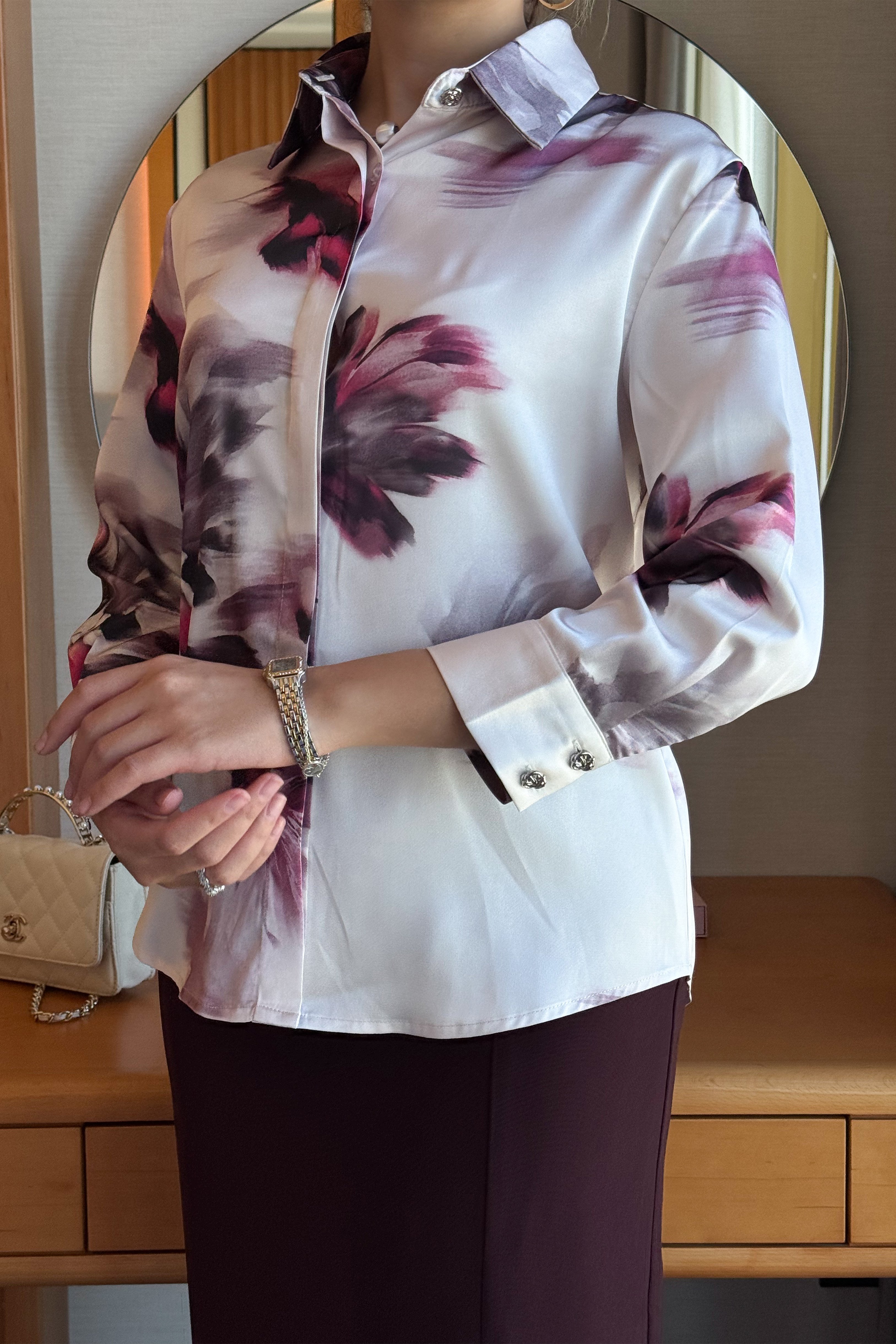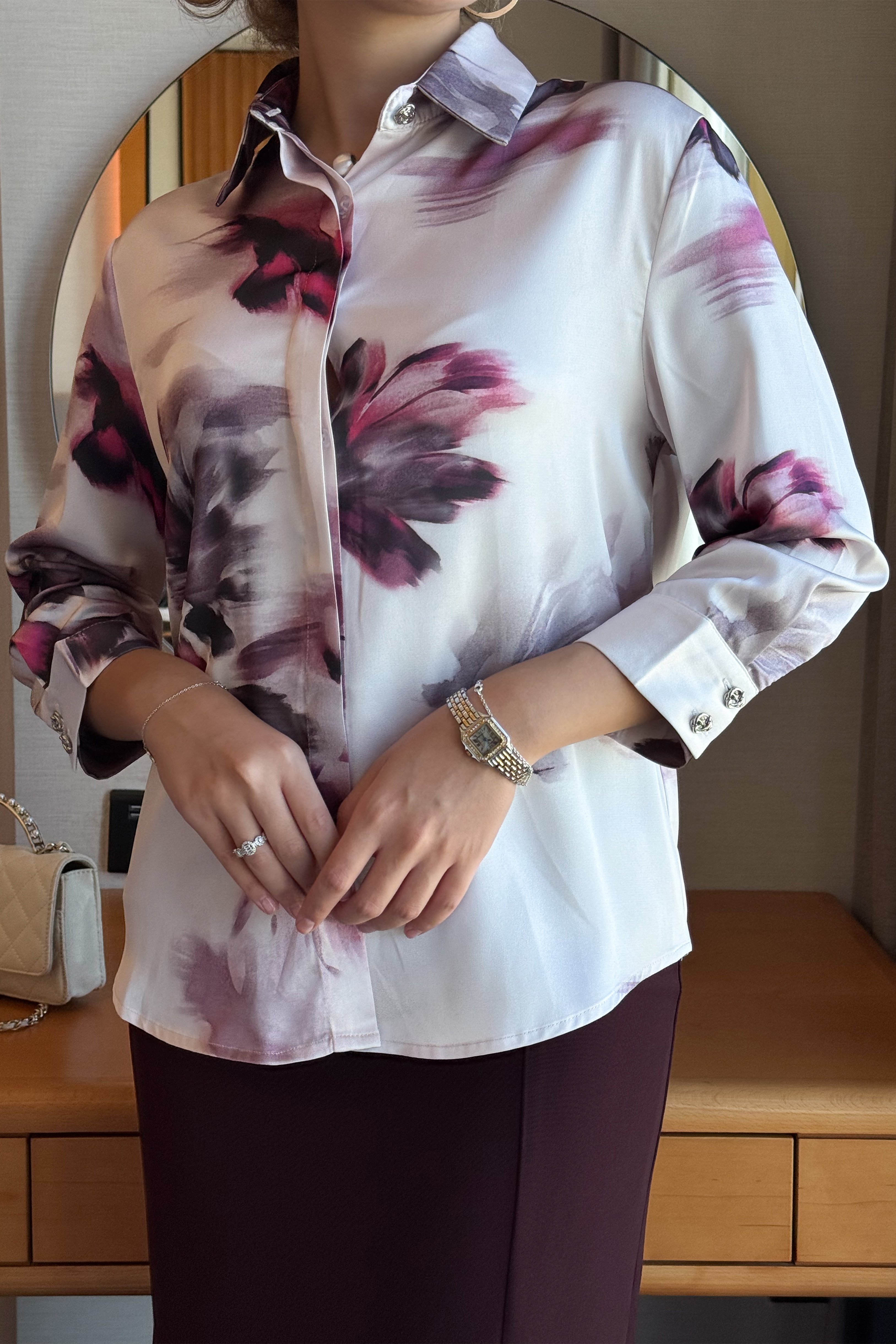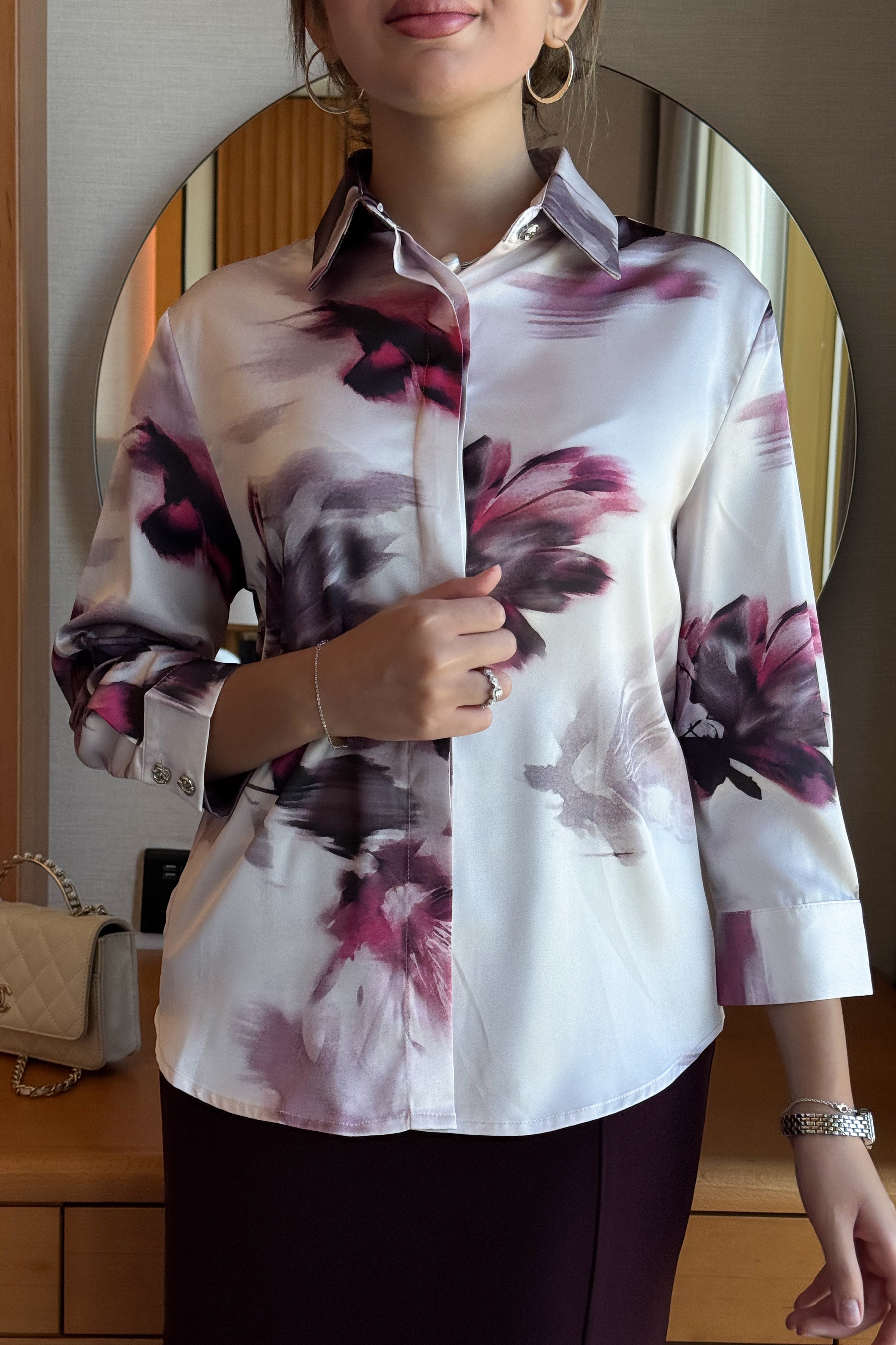 قميص ساتان بورود بياقة مطوية وأكمام طويلة