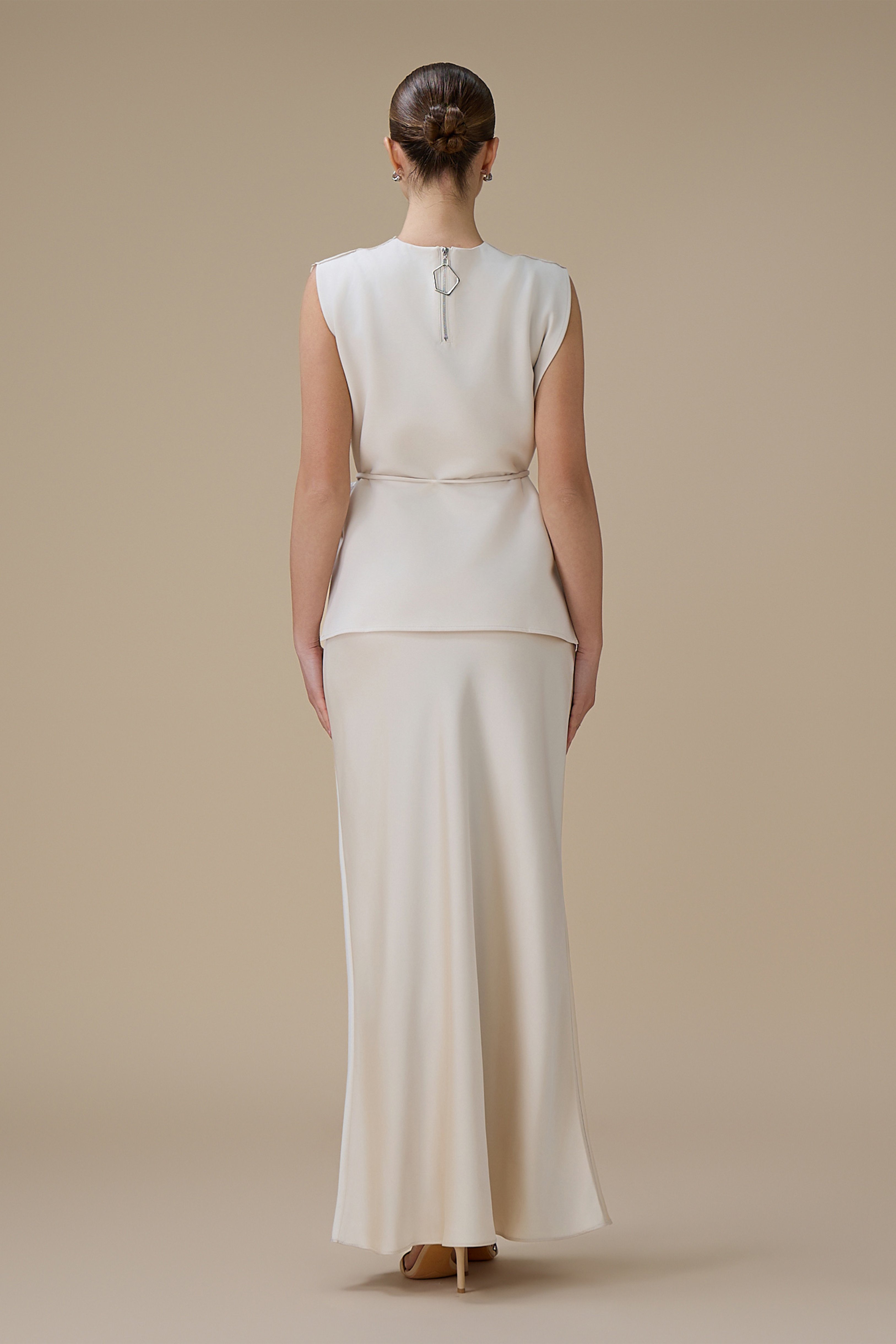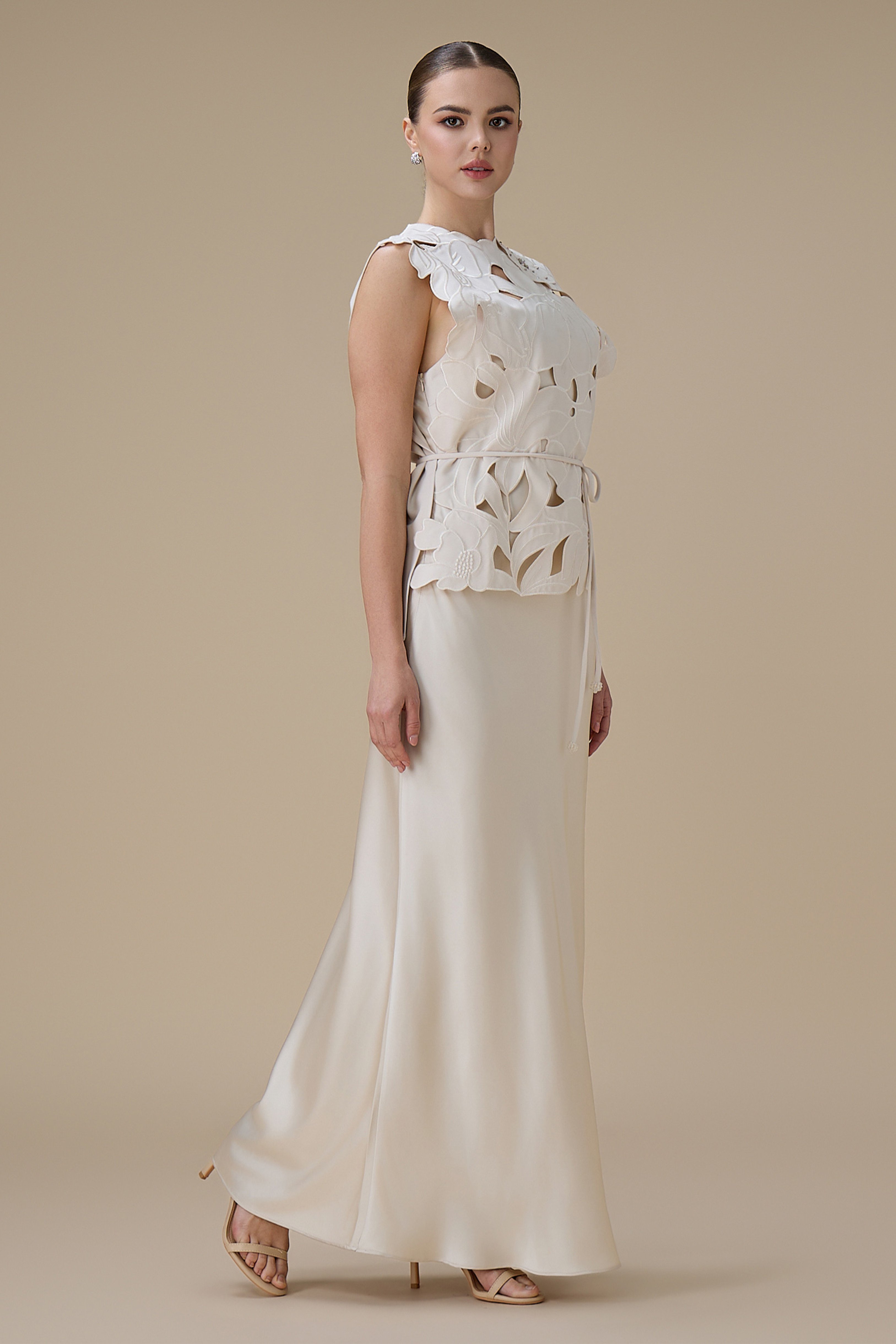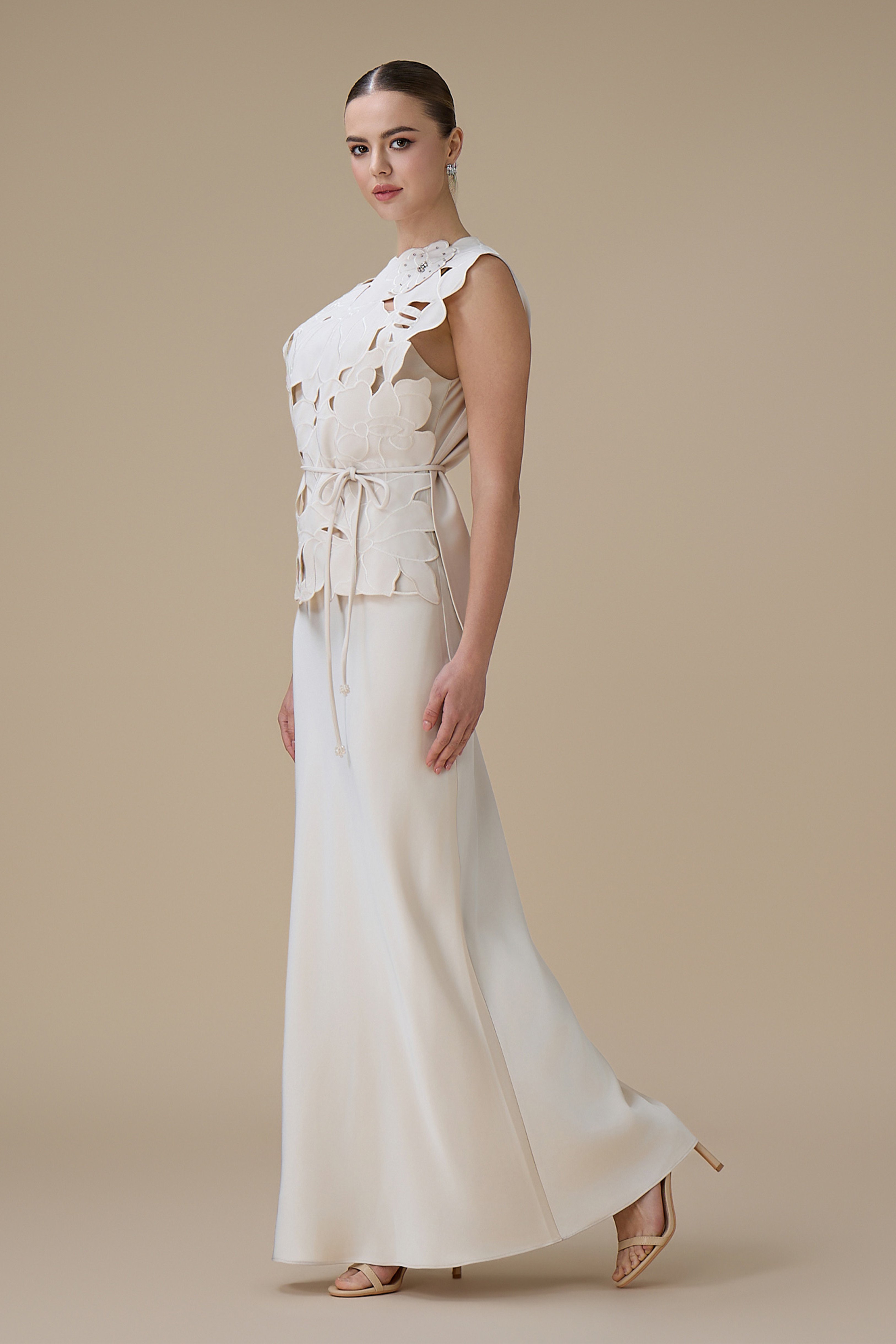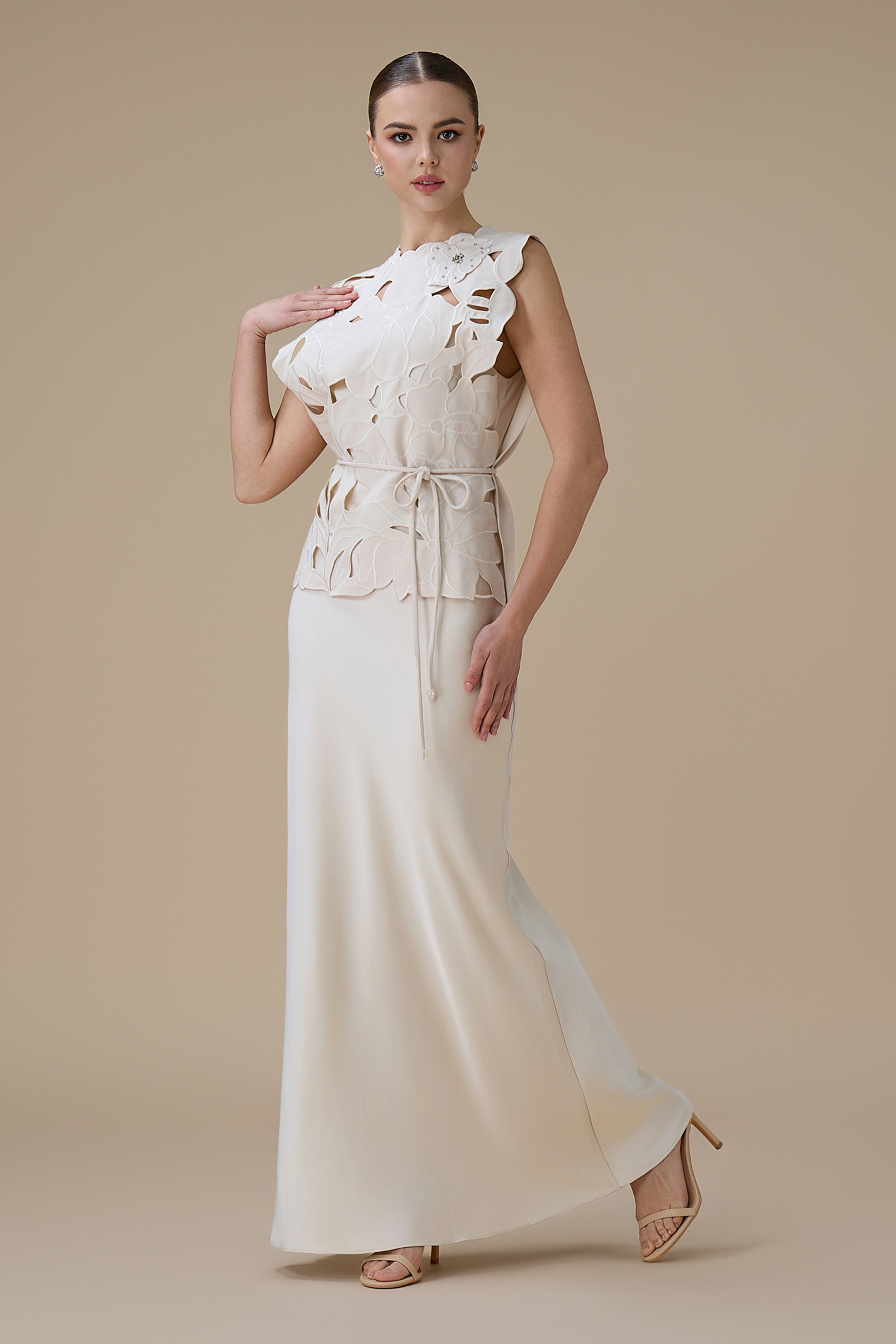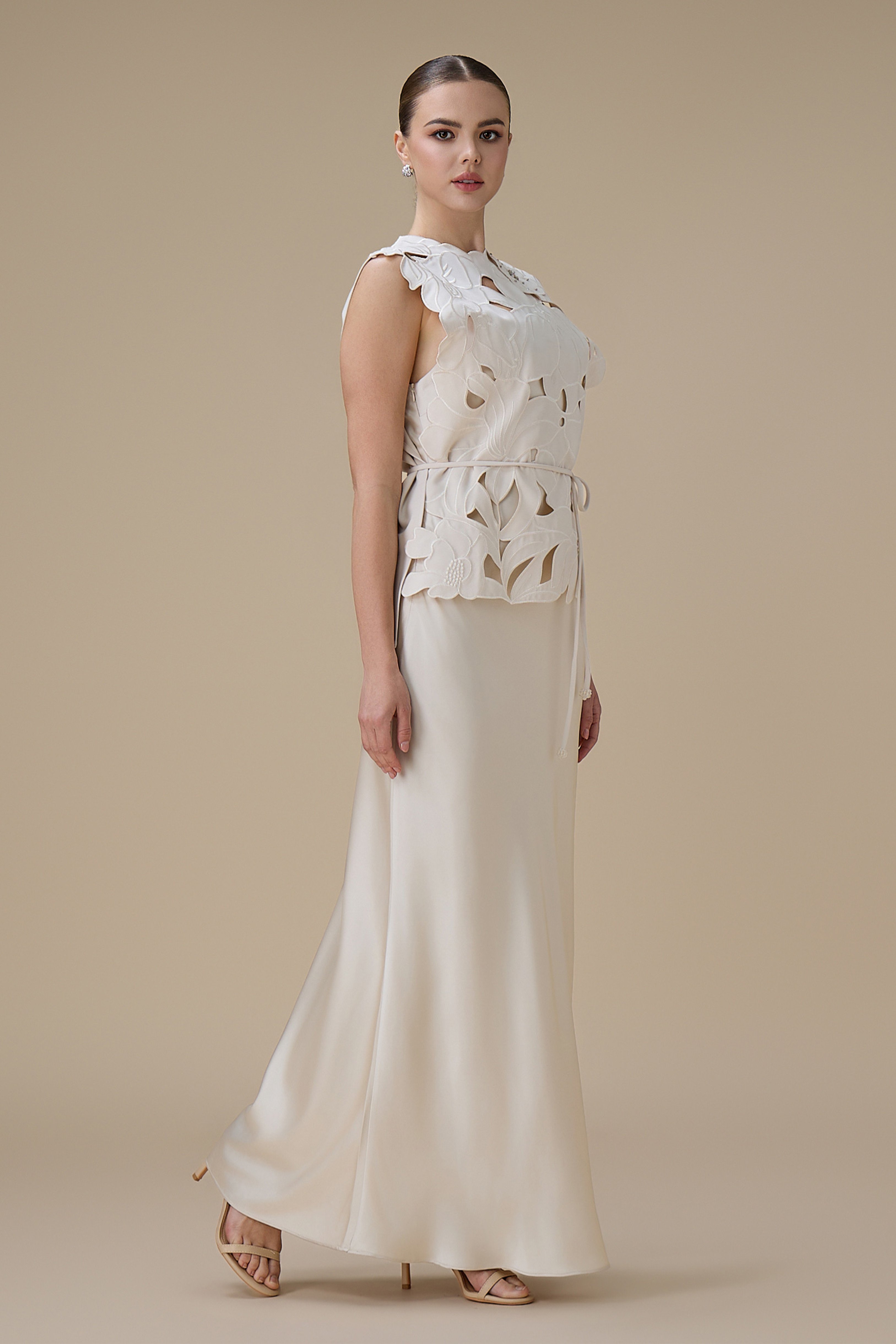 نوع القصة: فستان سكري طويل من قطعتين بتطريز ثلاثي الأبعاد برباط عالخصر بدون أكمام