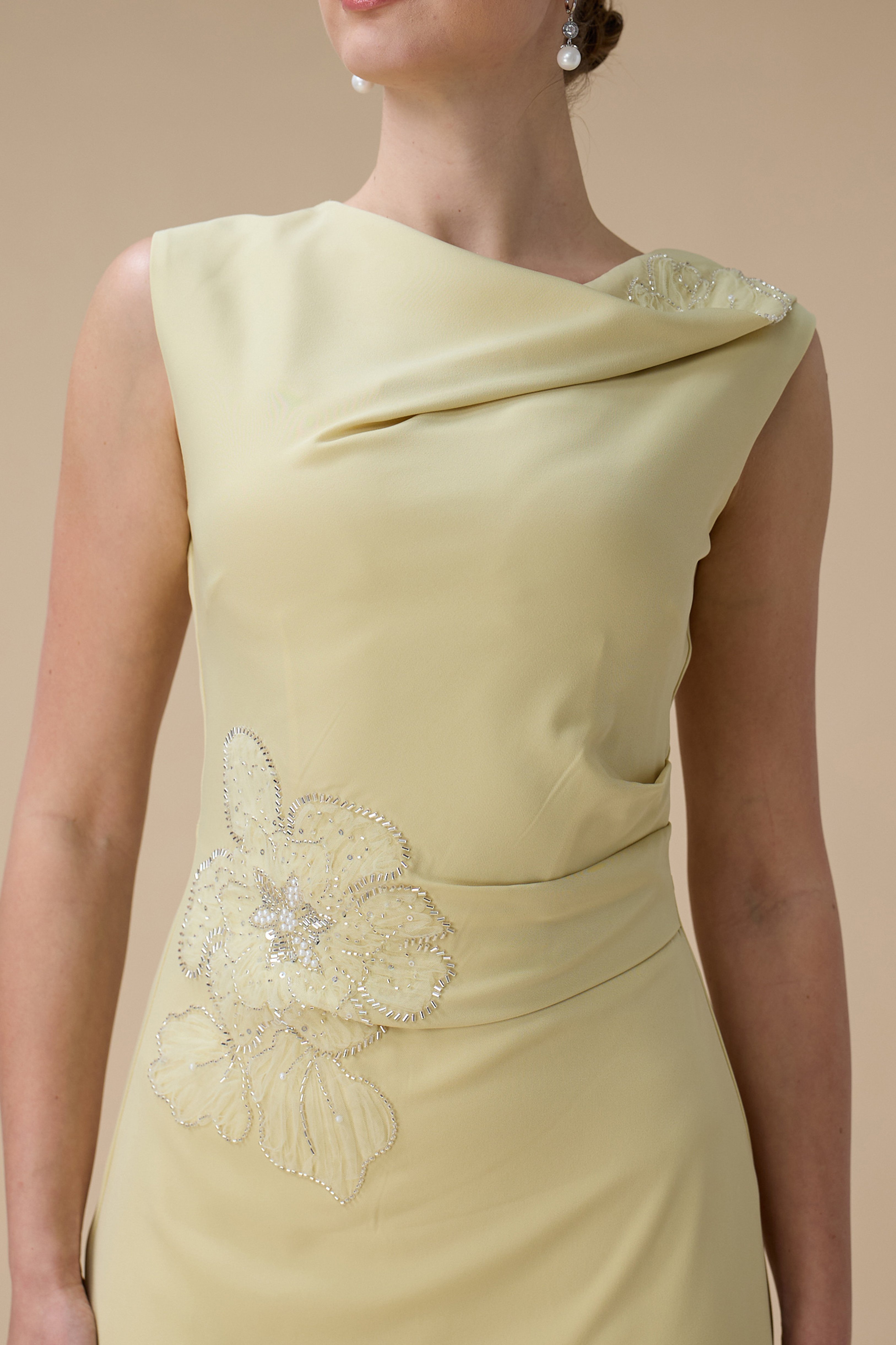 نوع القصة: فستان ماكسي بلون أصفر مع تطريز زهري بياقة غير متماثلة