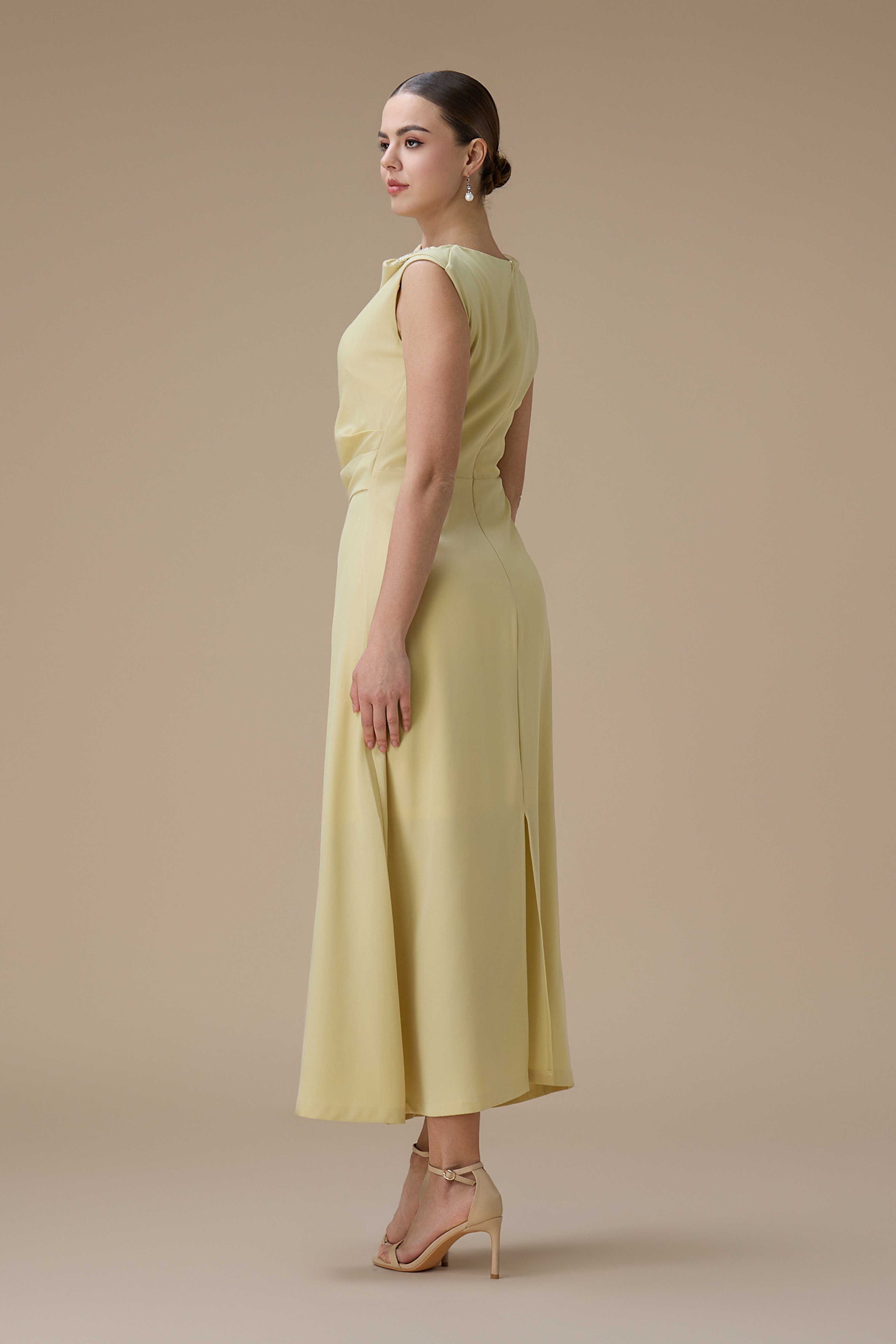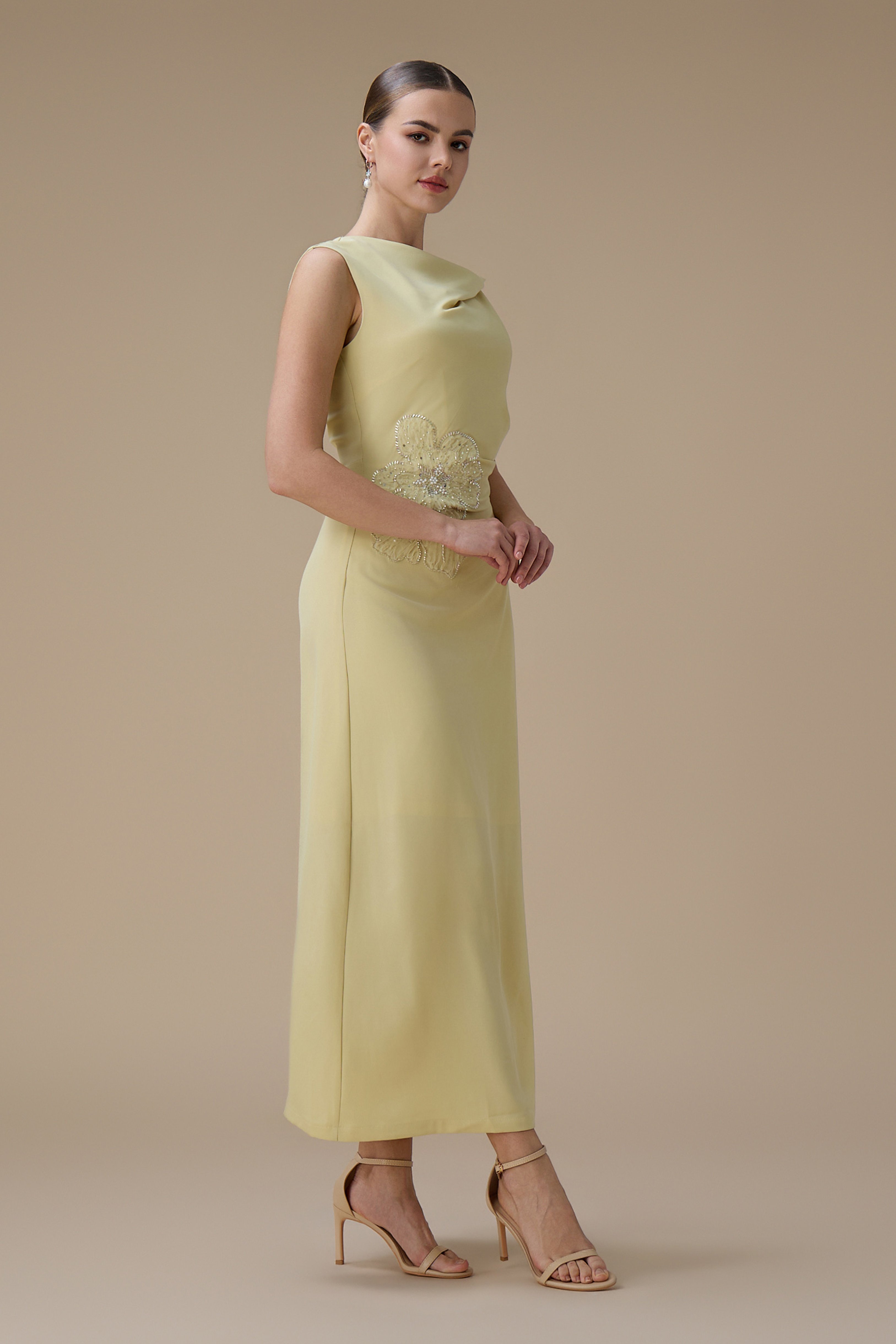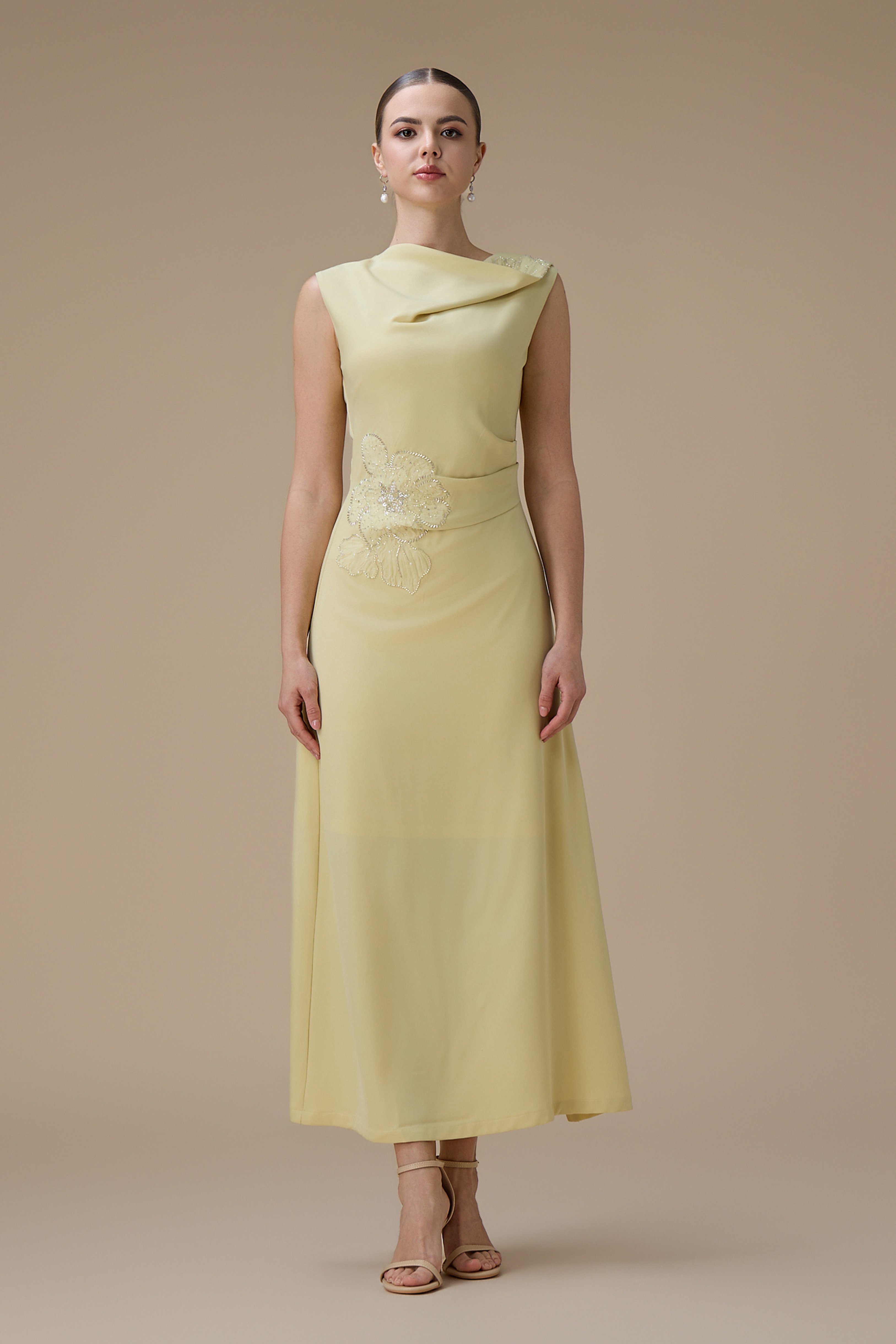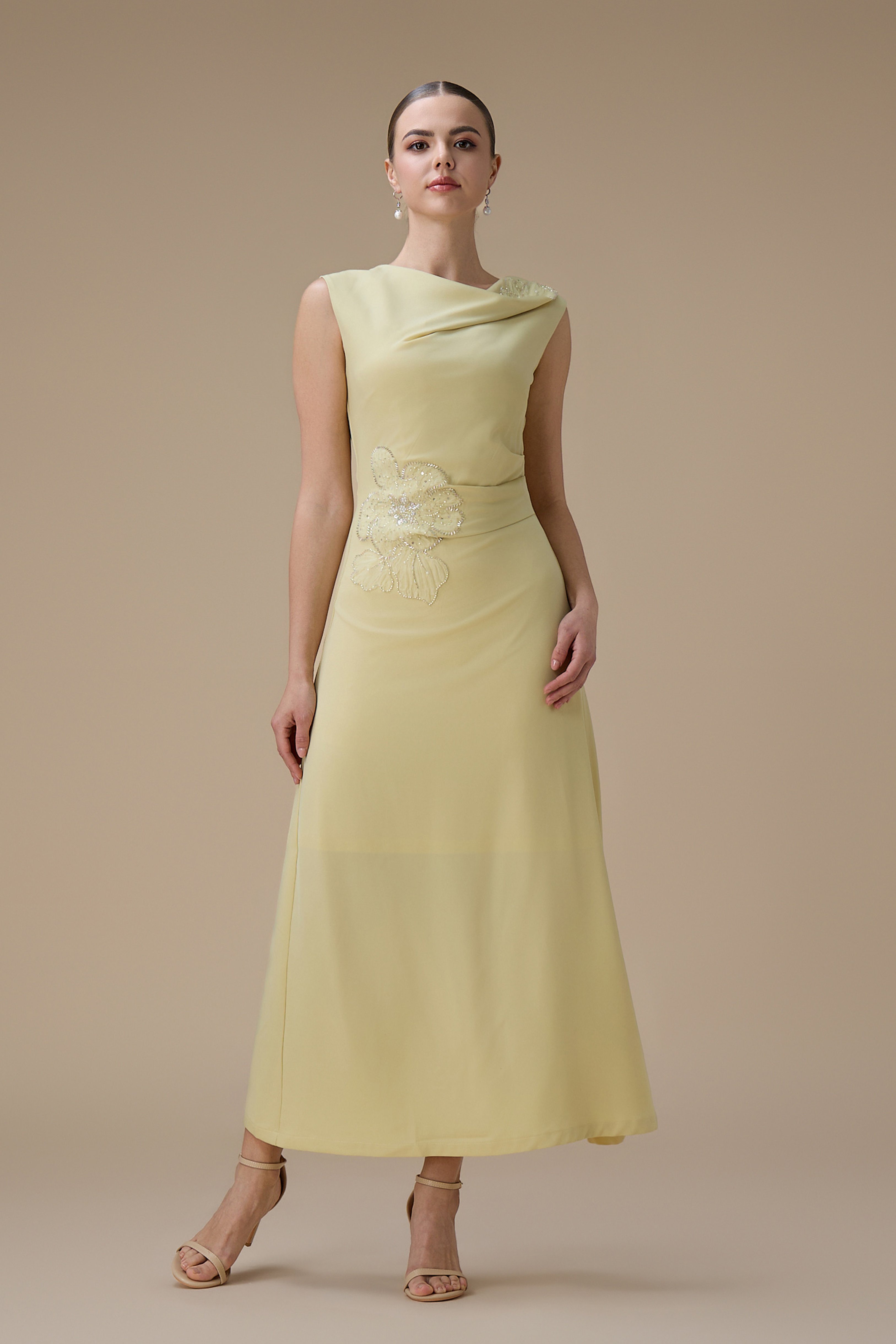 فستان ماكسي بلون أصفر مع تطريز زهري