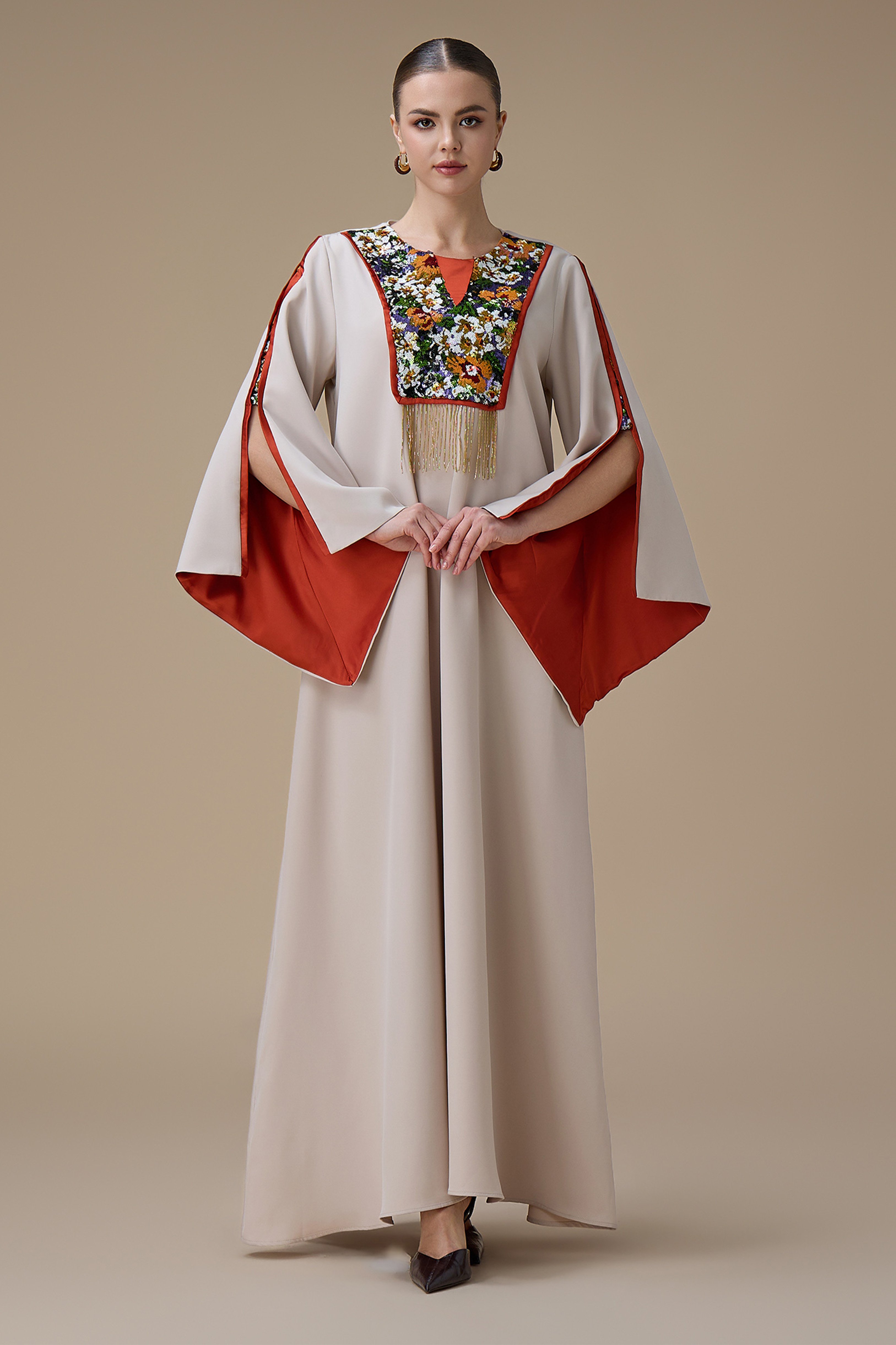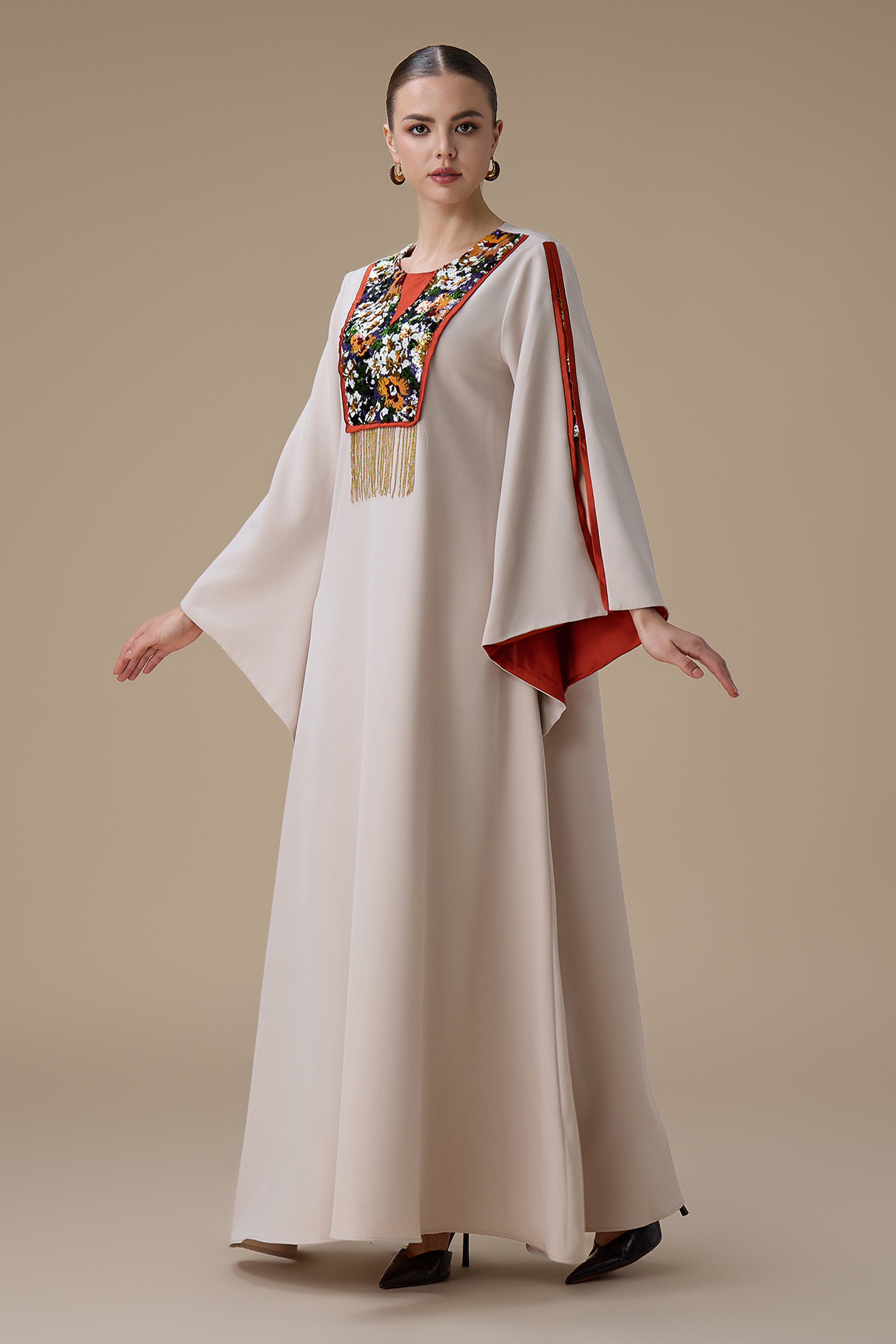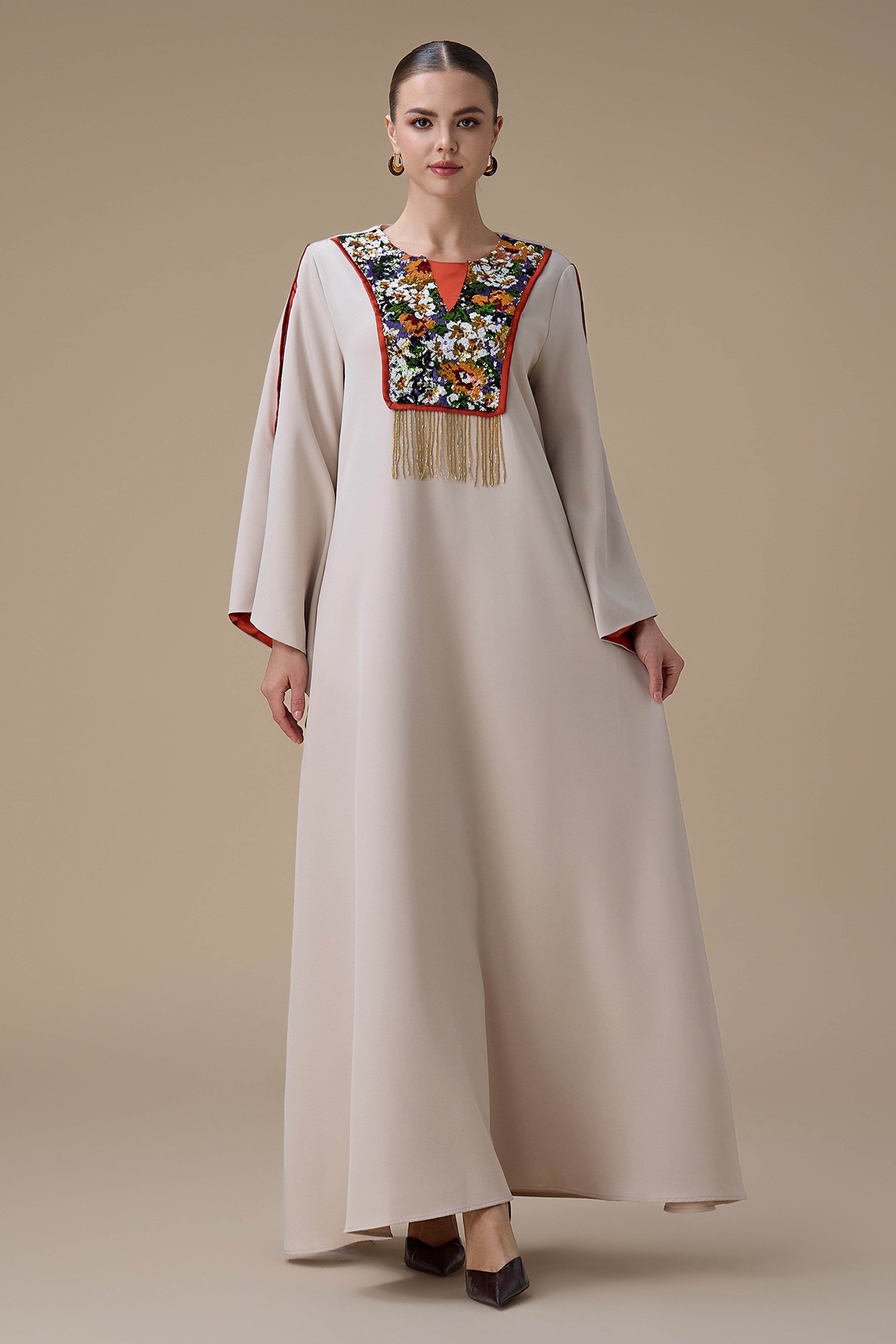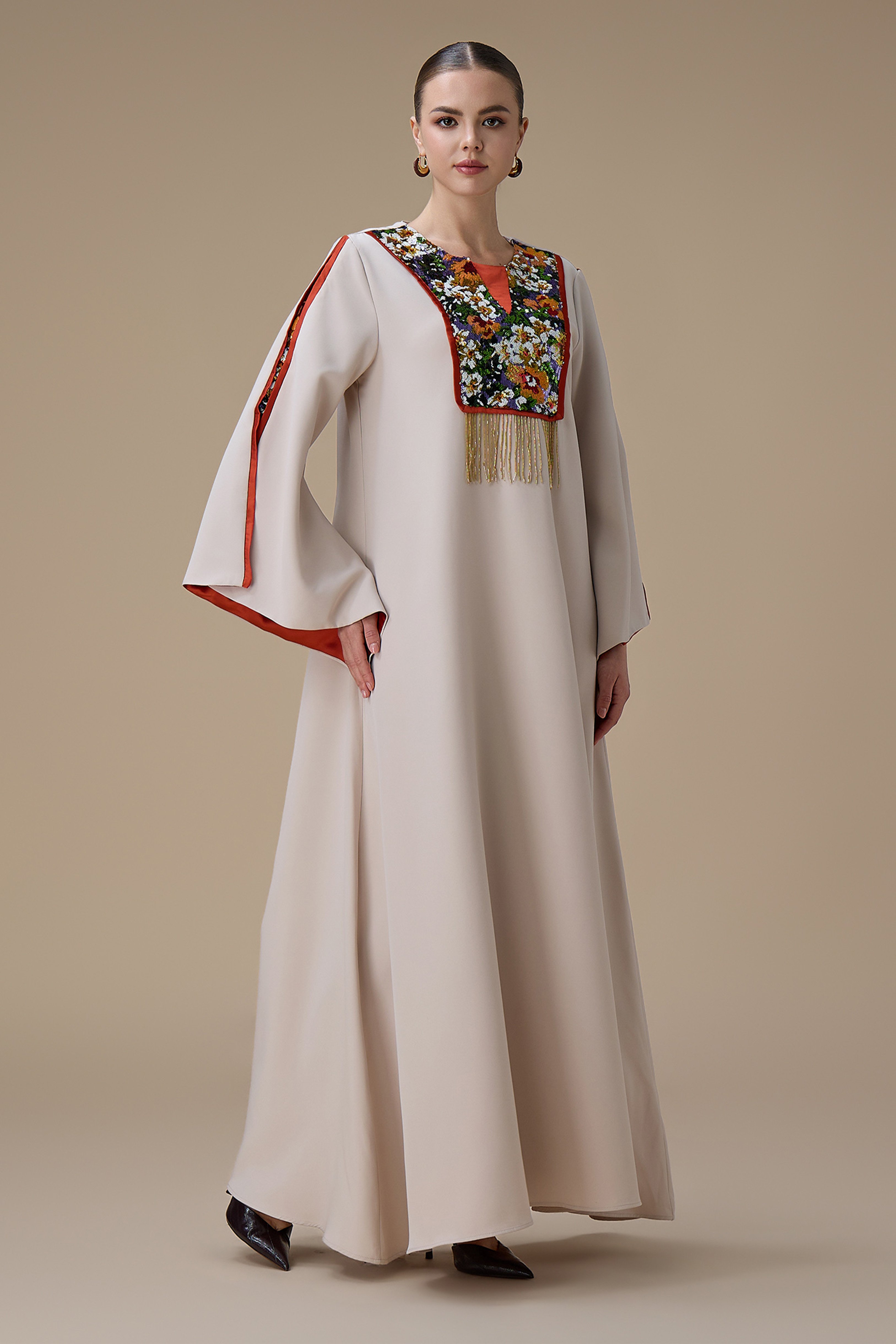 جلابية طويلة بيج بتطريز انيق ملون
