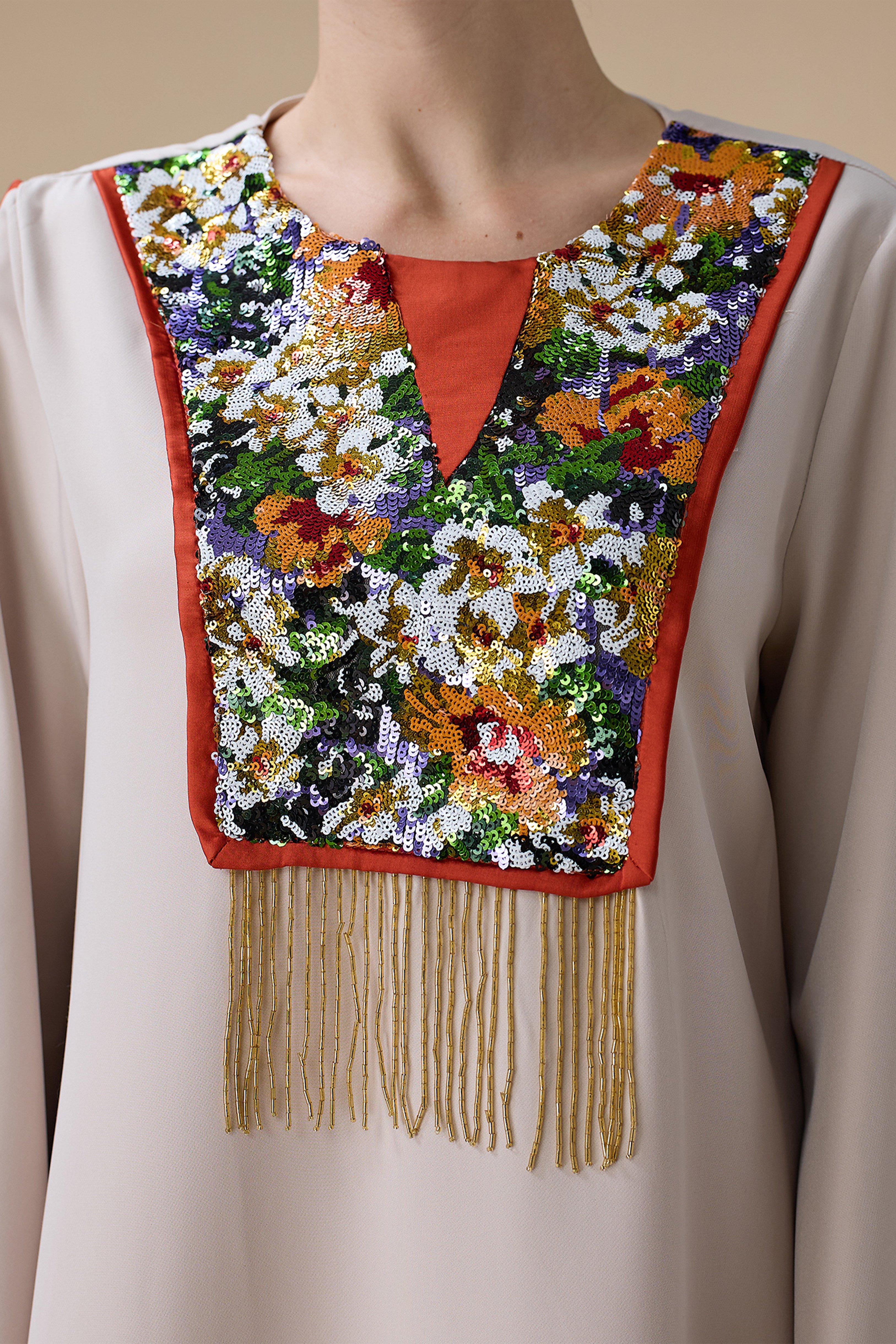 تُعد هذه القطعة من أجمل الجلابيات الملونة التي تجمع بين البساطة والفخامة، حيث يأتي اللون البيج الهادئ مع تطريز ملون أنيق ليمنحك إطلالة أنثوية راقية تناسب مختلف الأذواق.