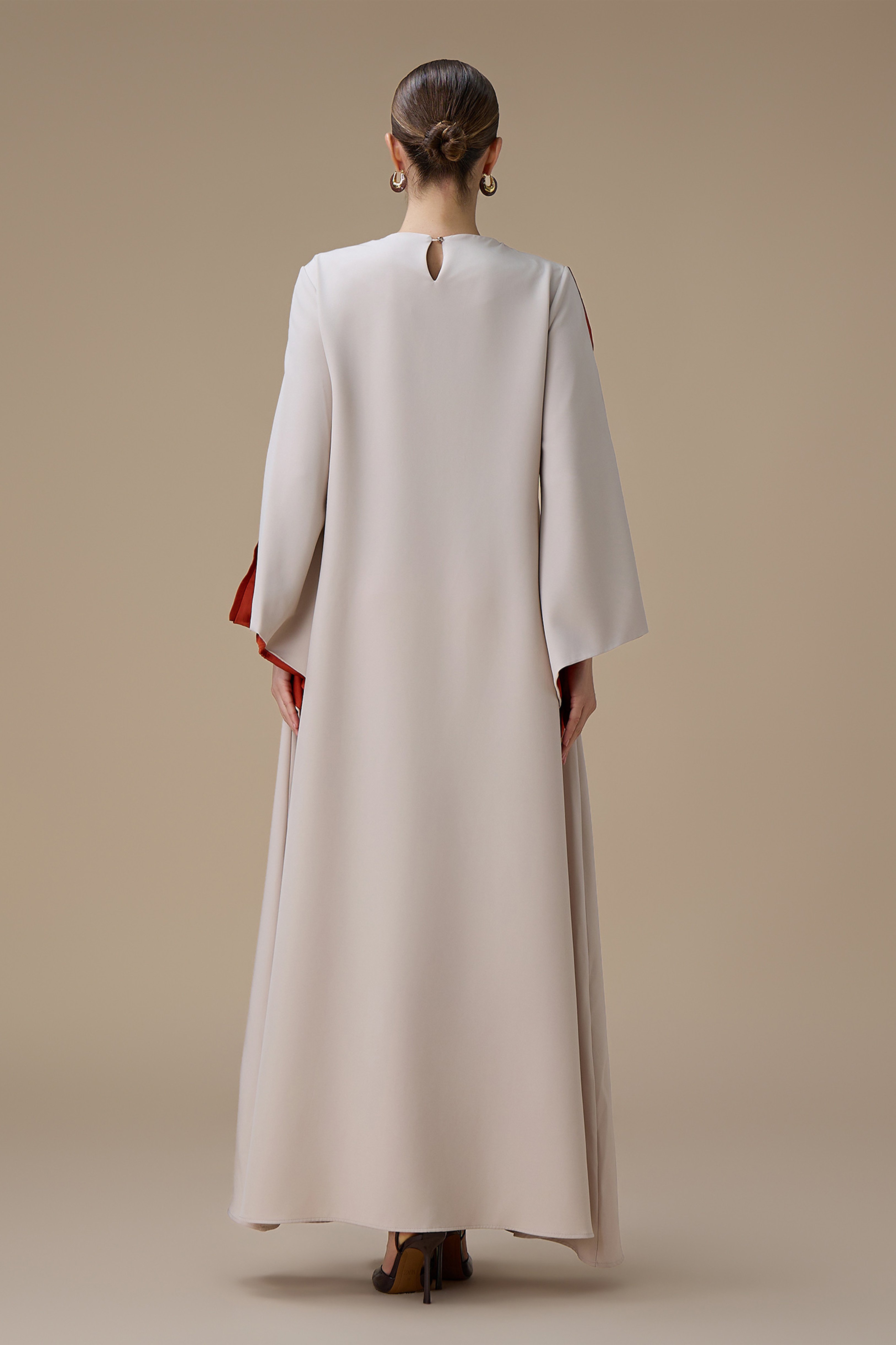 تتميز الجلابية بقصة طويلة واسعة تمنحك راحة مثالية وأناقة واضحة، مع أكمام طويلة فضفاضة تضيف لمسة انسيابية ناعمة، وياقة دائرية تزيد من بساطة التصميم ورقيه.