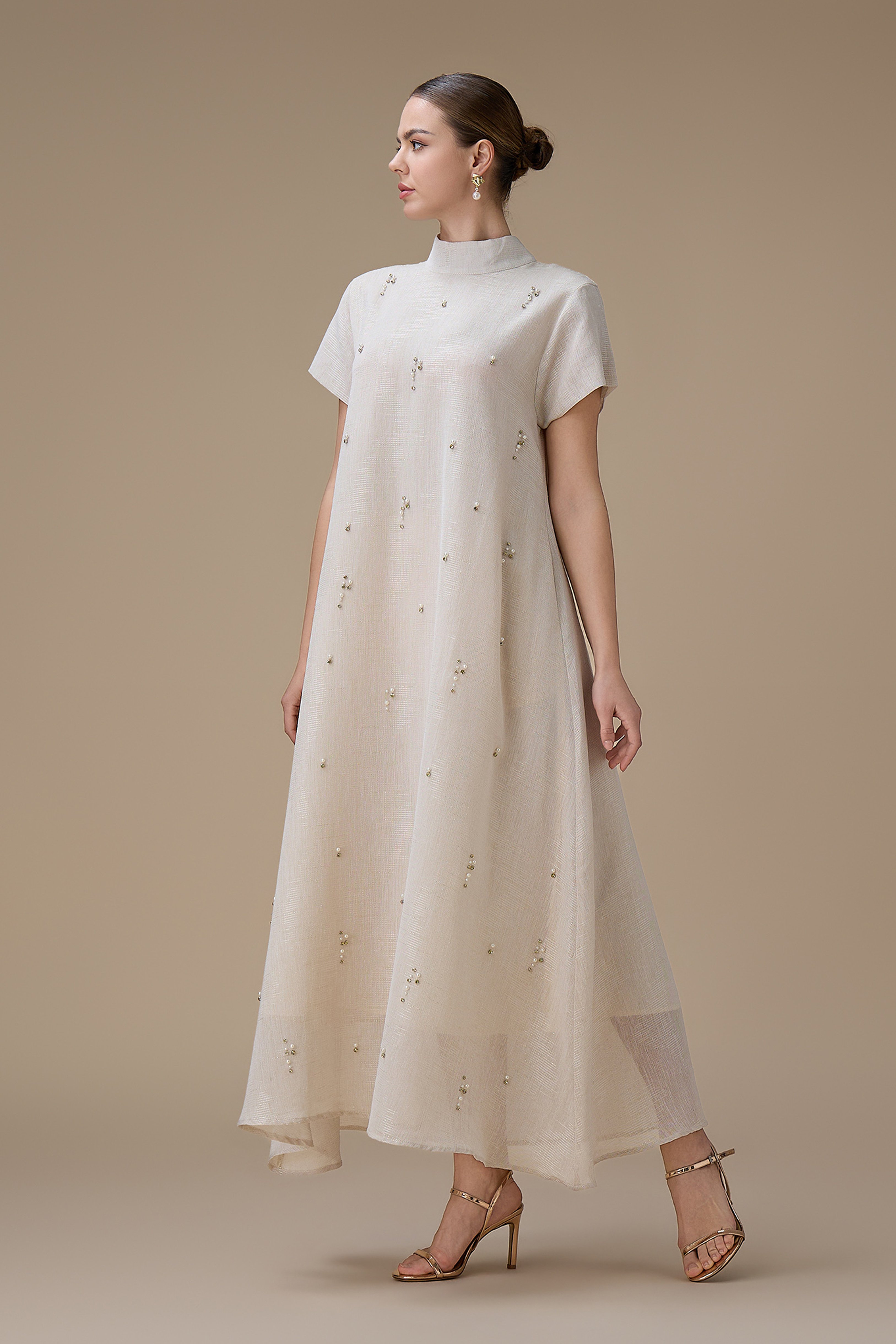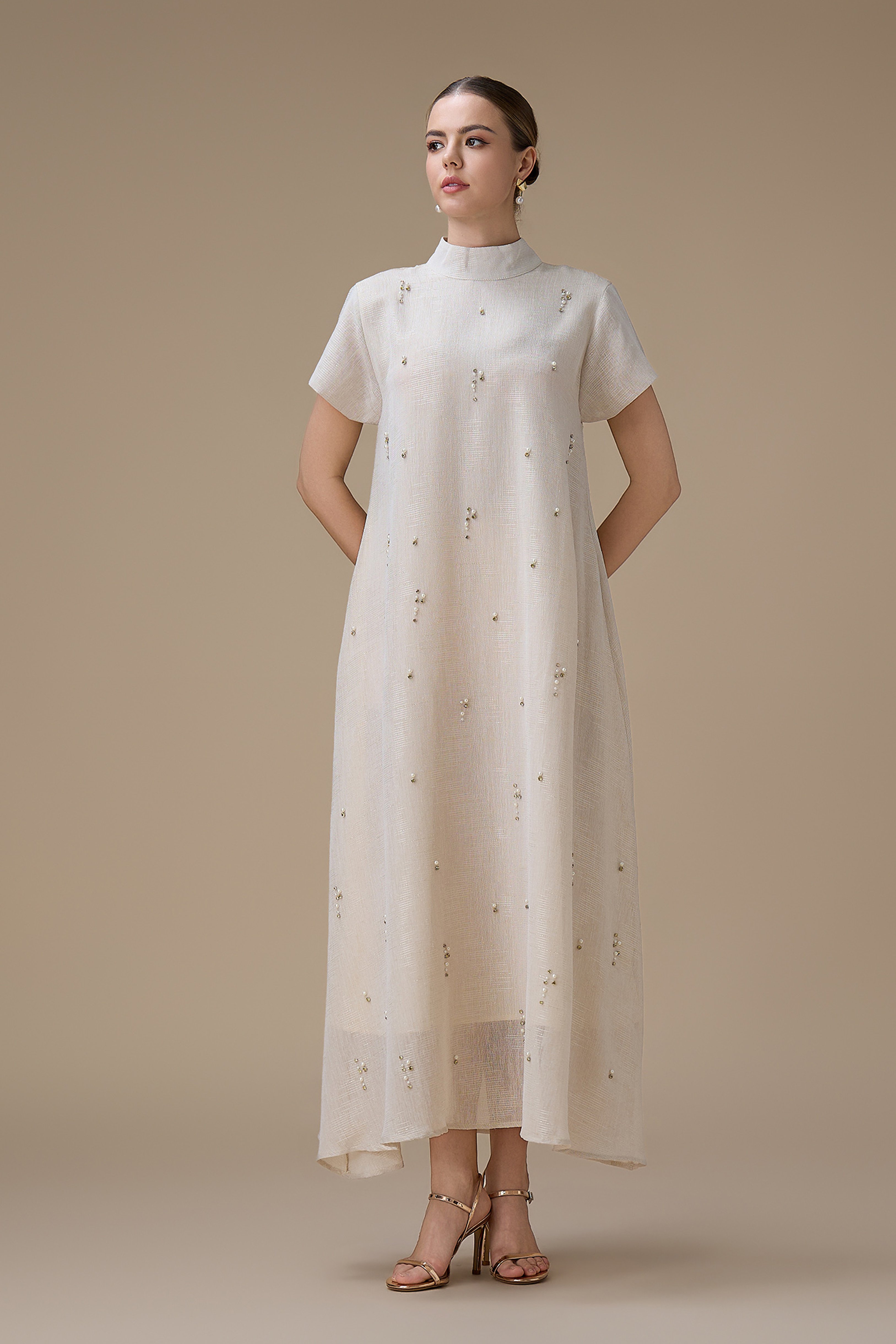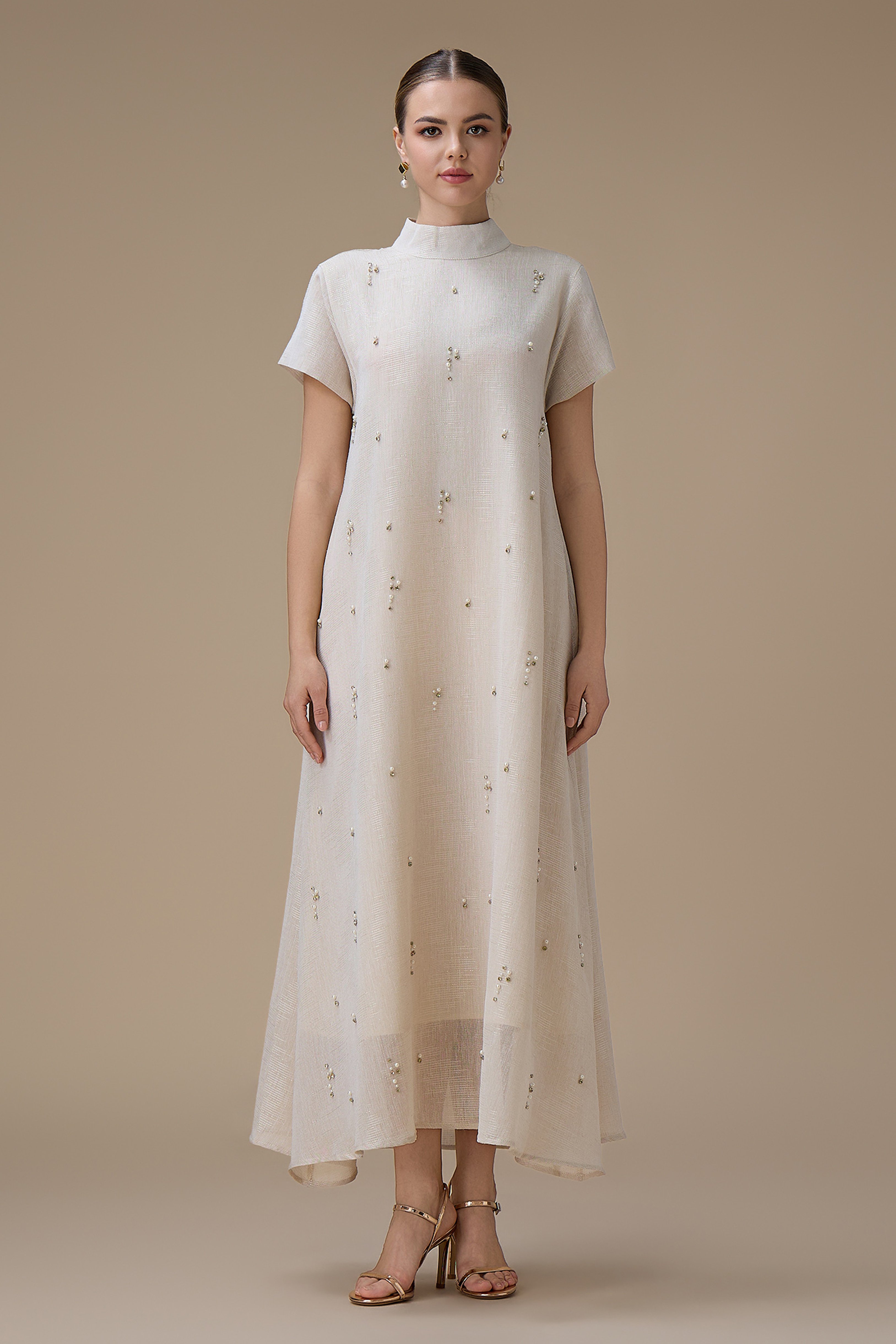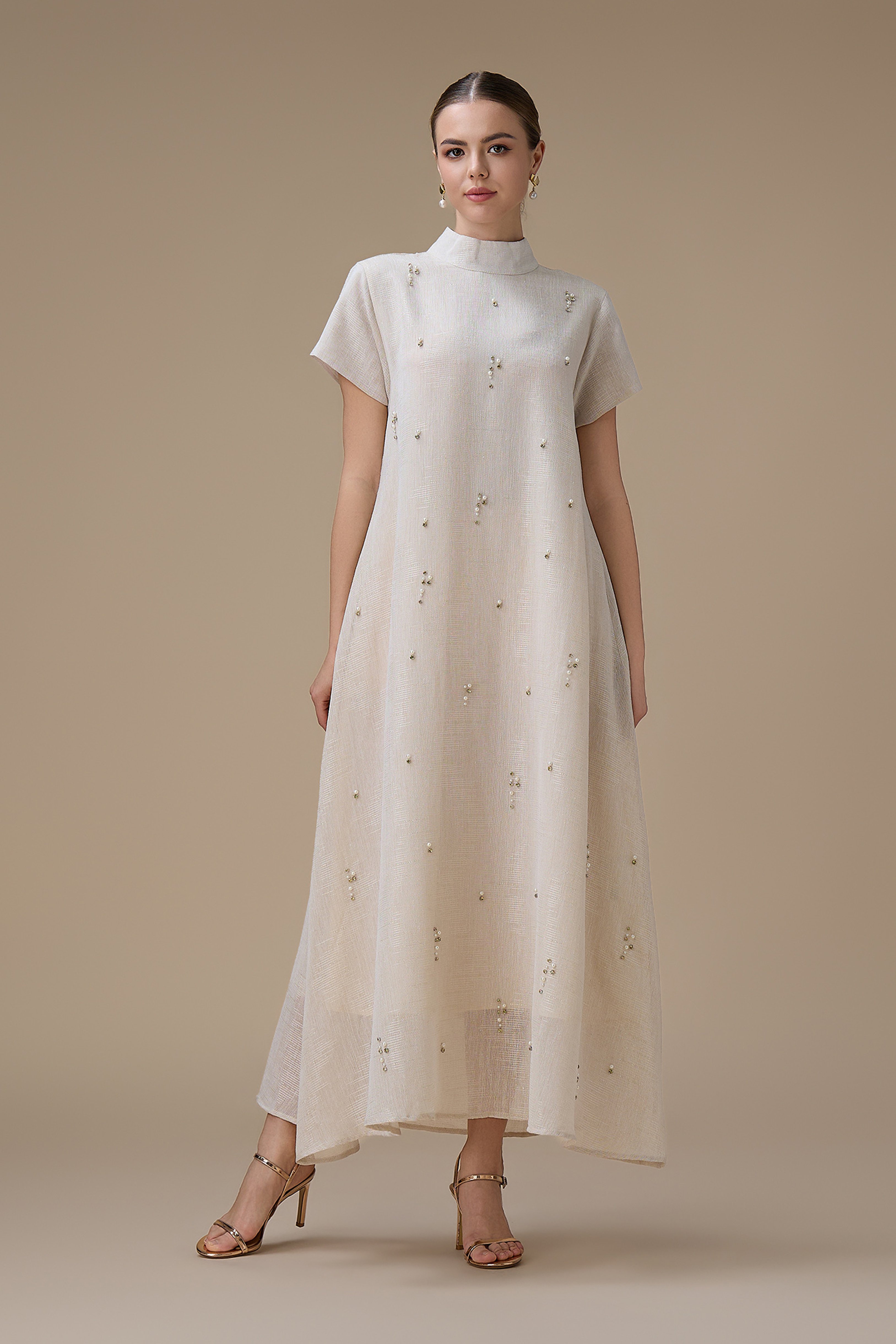 جلابية طويلة أنيقة بتطريز لؤلؤ ناعم مع ياقة عالية وأكمام قصيرة