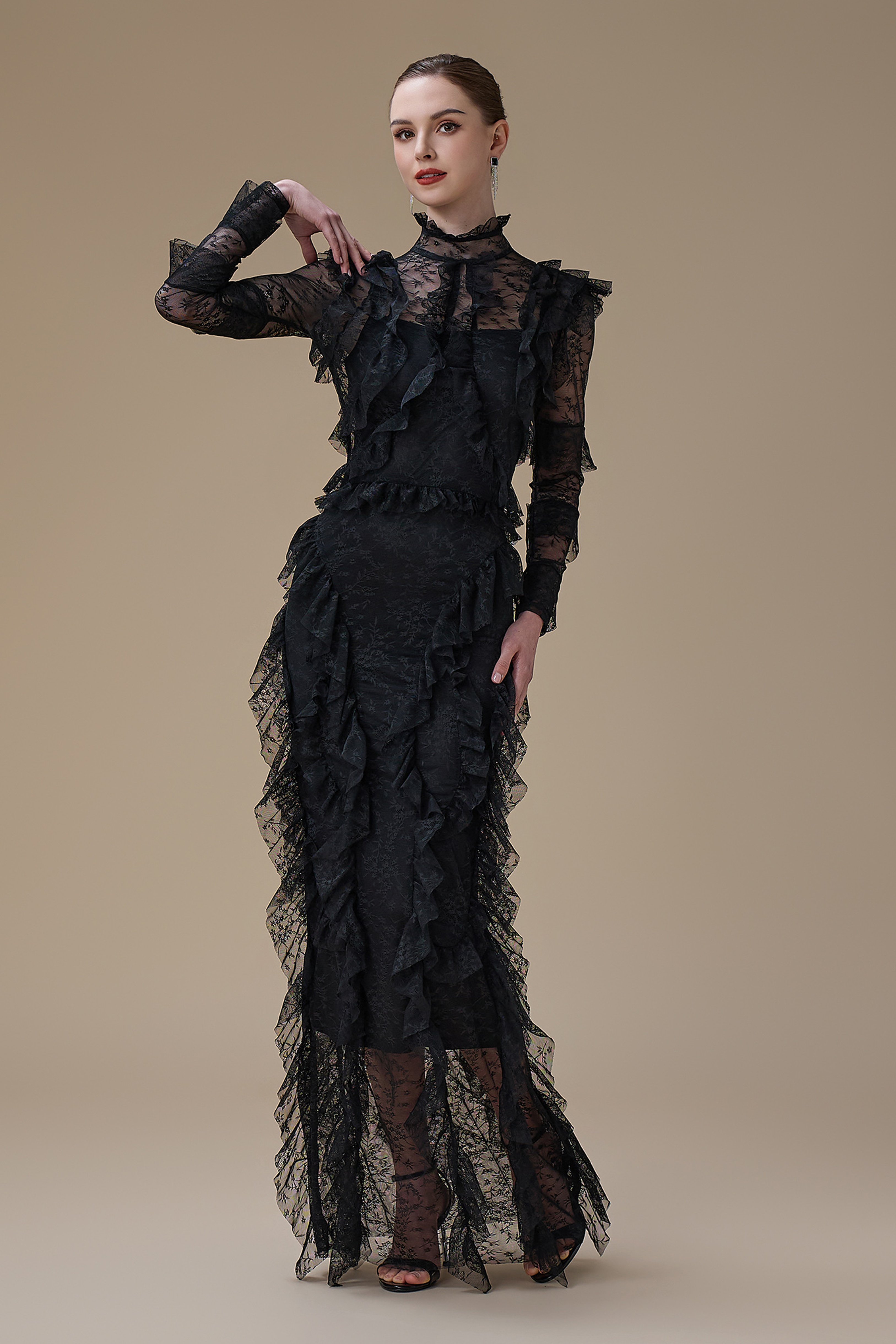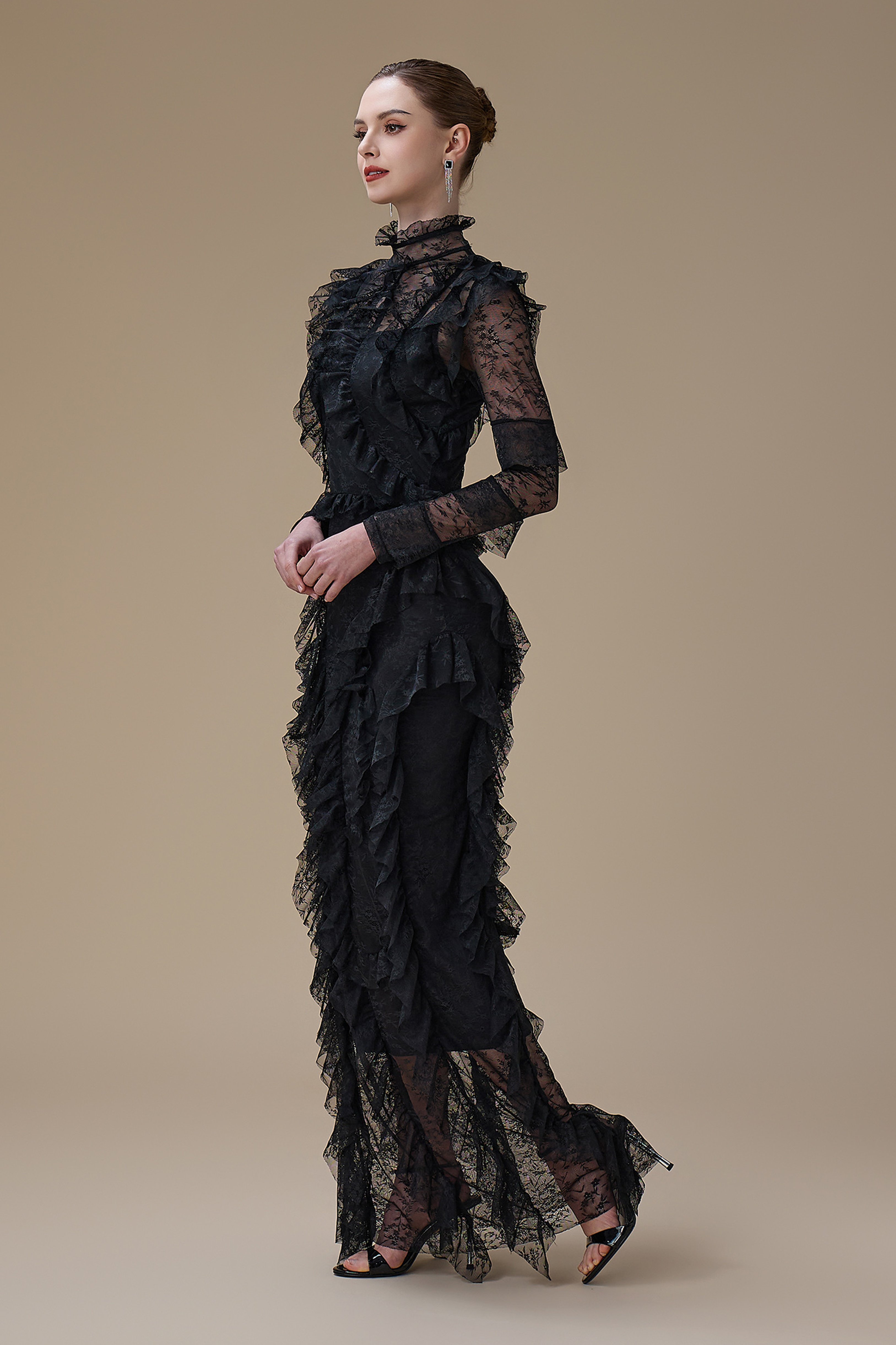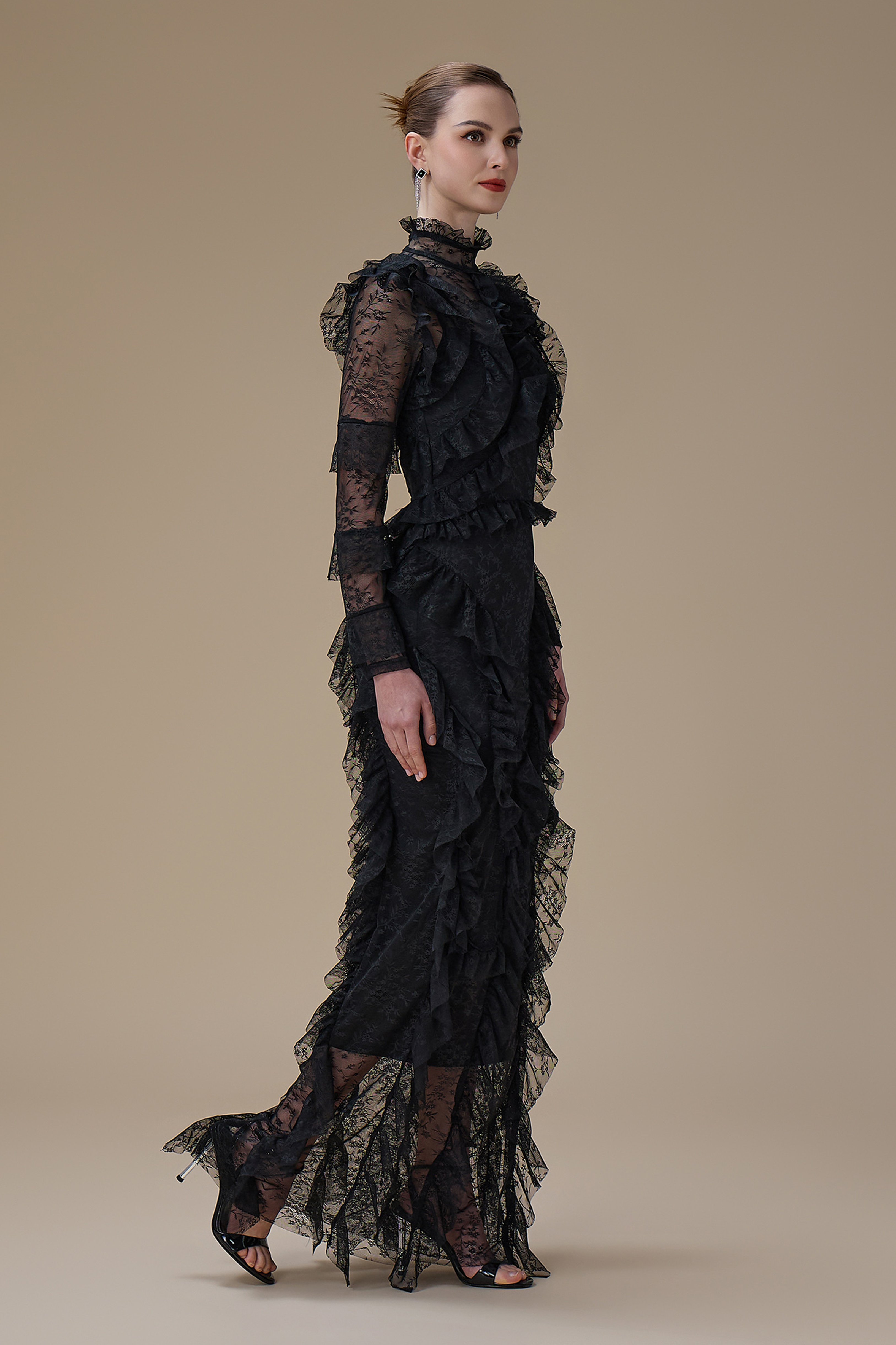 نوع القصة: فستان اسود طويل دانتيل بتفاصيل كشكش وياقة مرتفعة