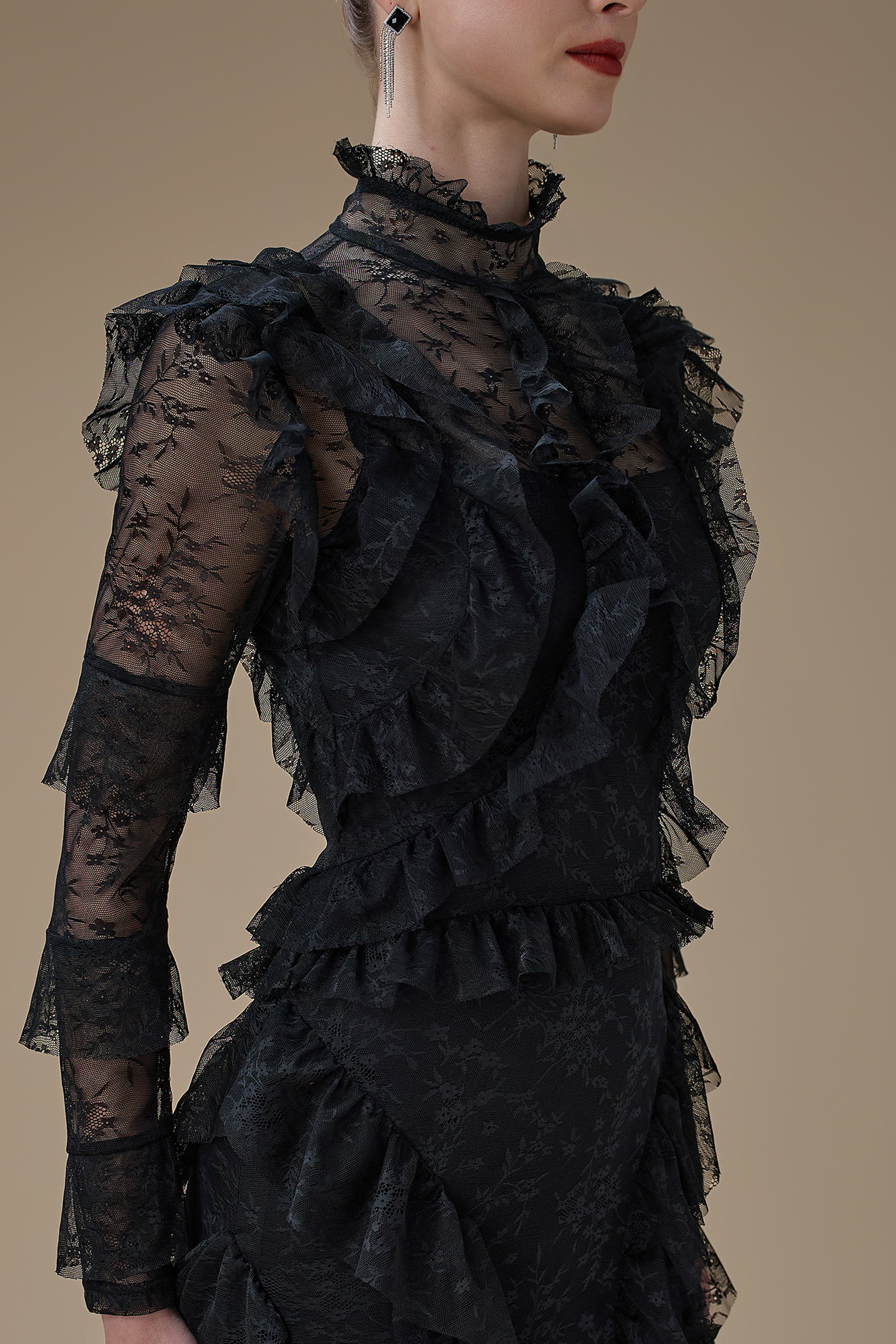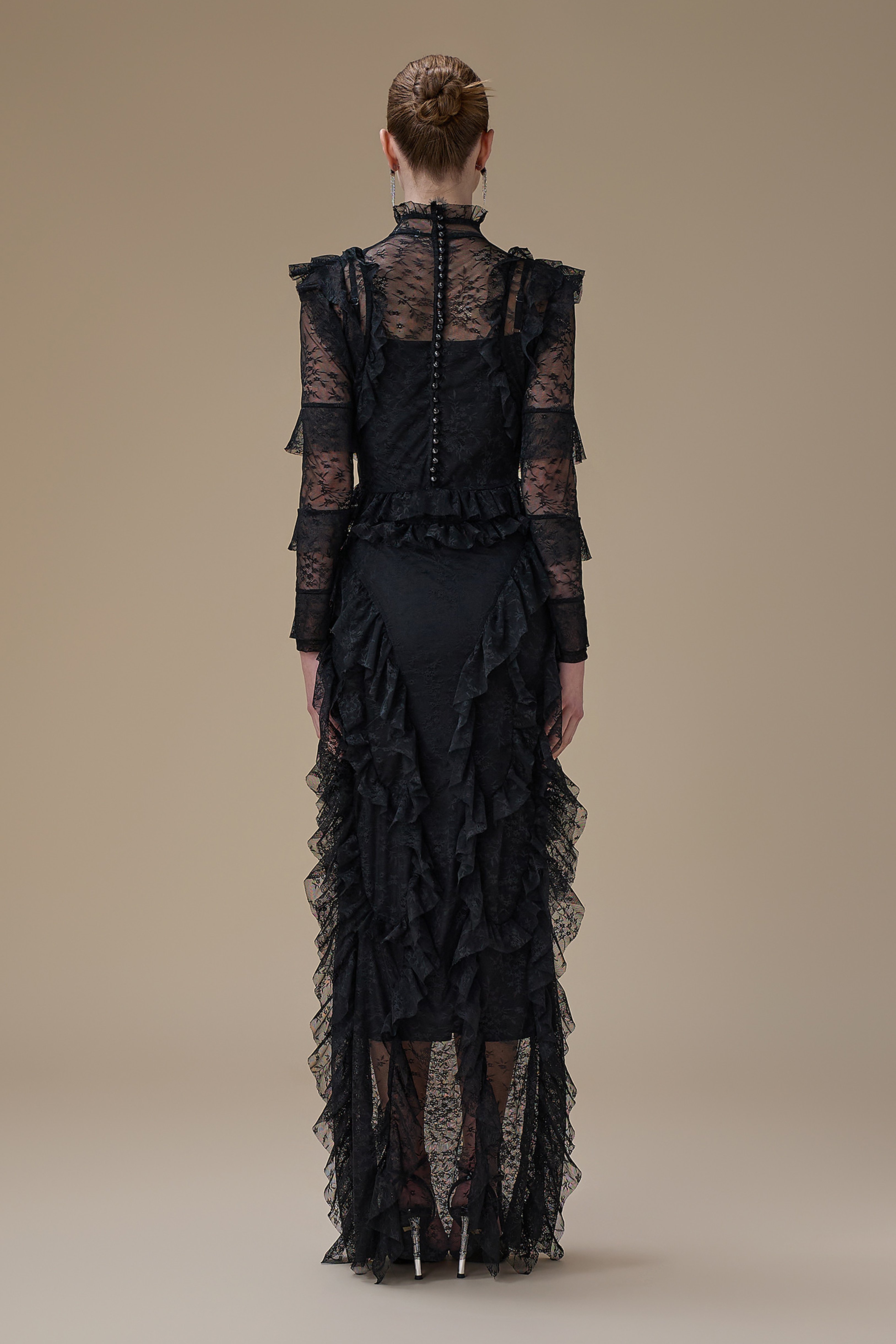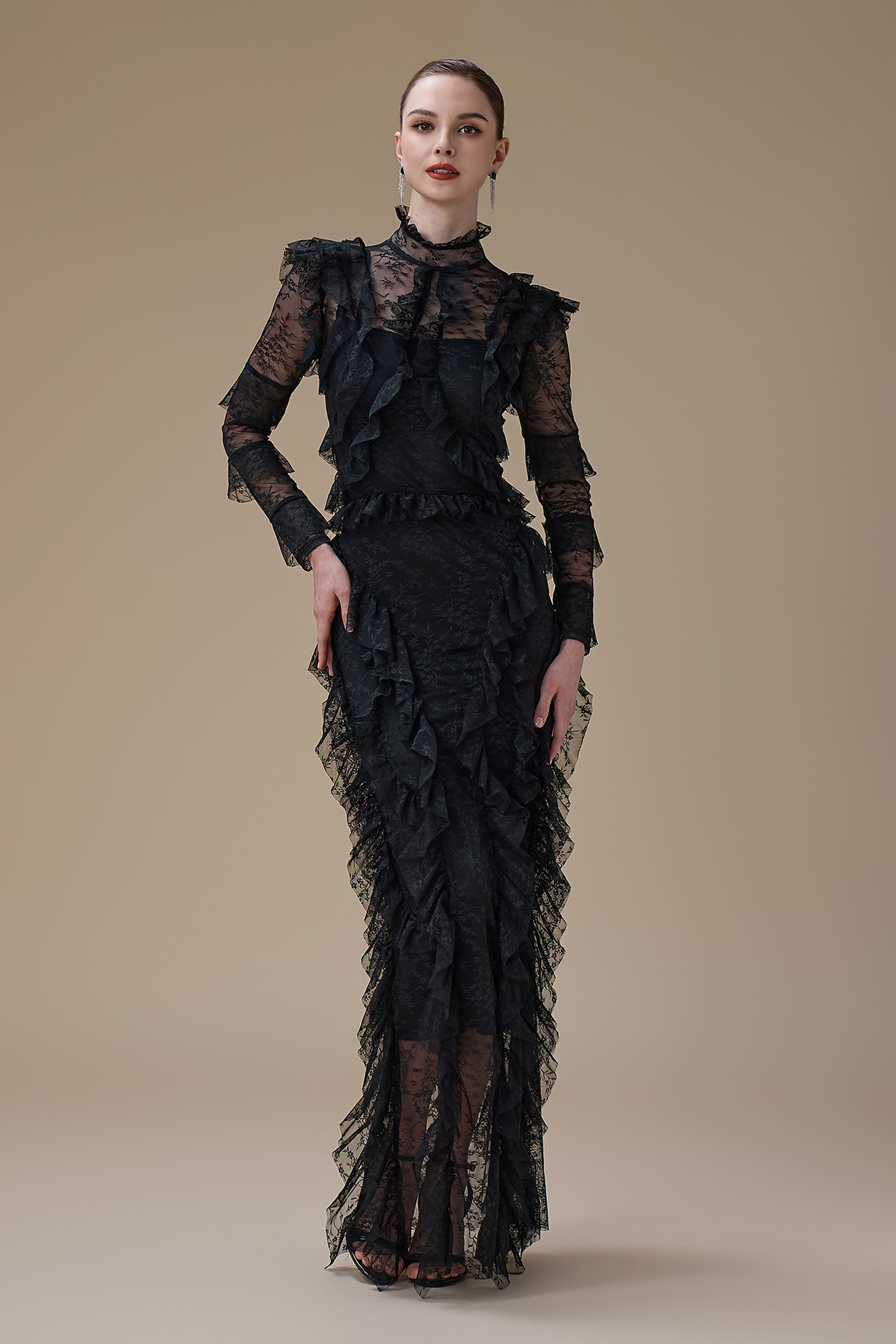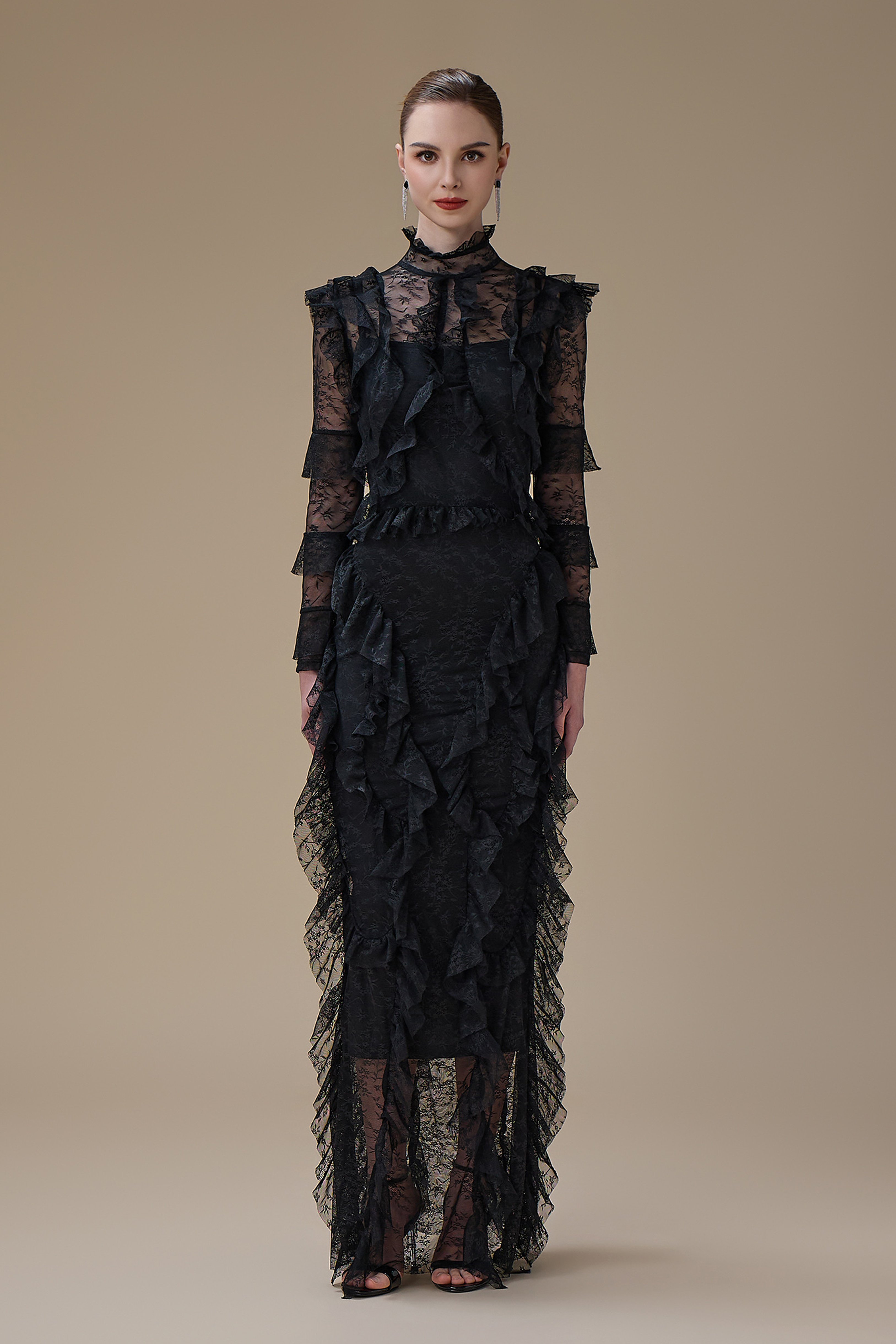 نوع القصة: فستان اسود طويل دانتيل بتفاصيل كشكش وياقة مرتفعة