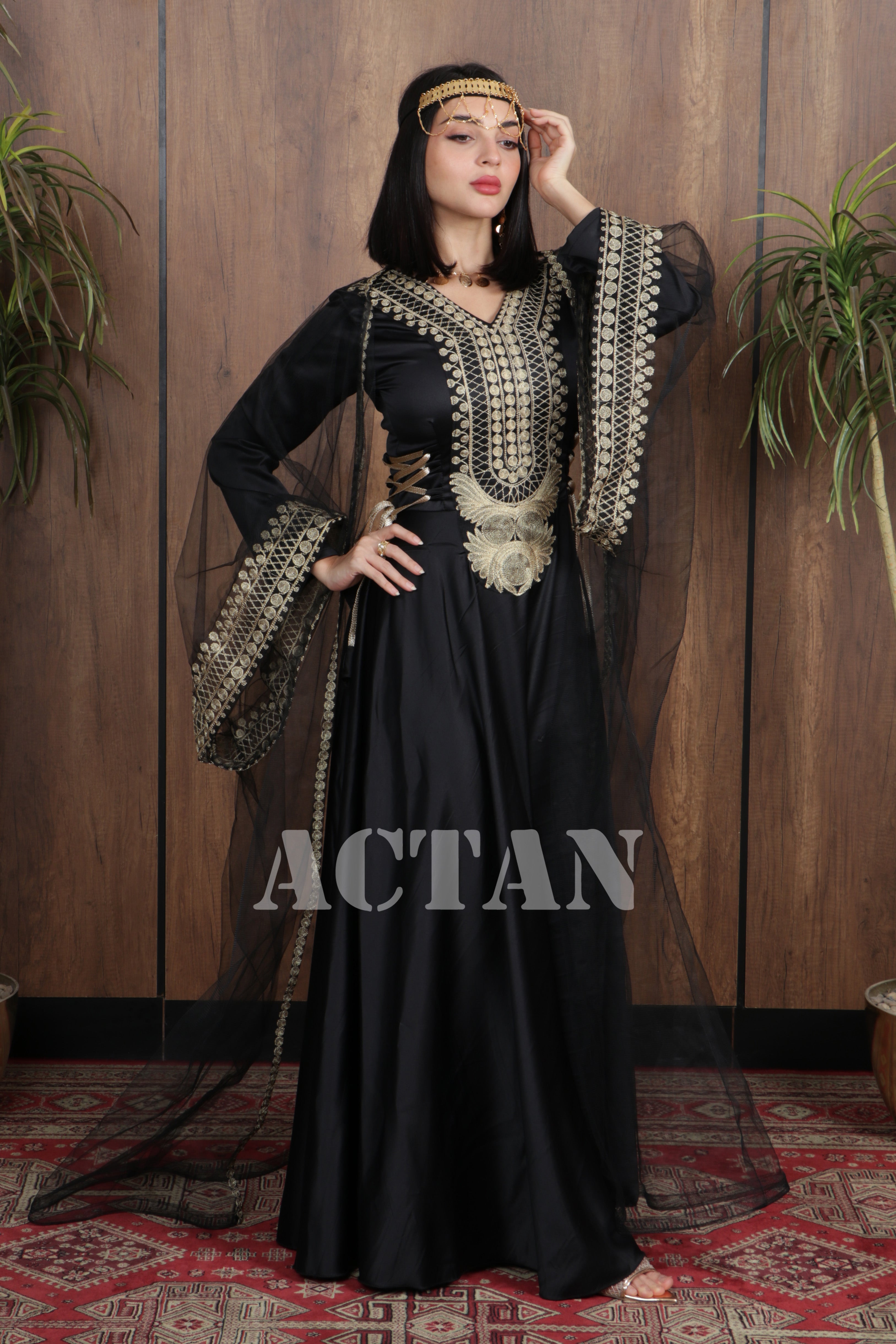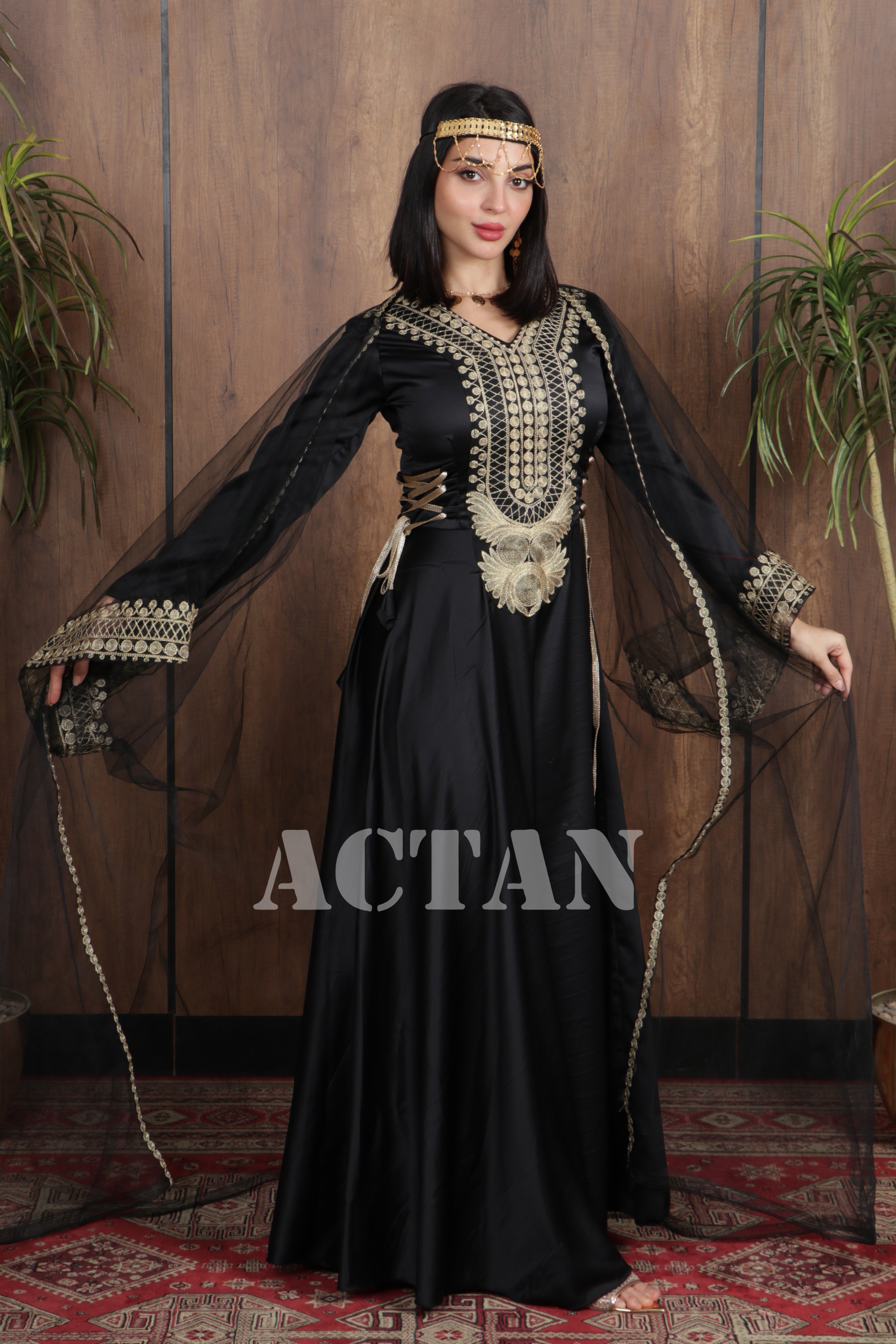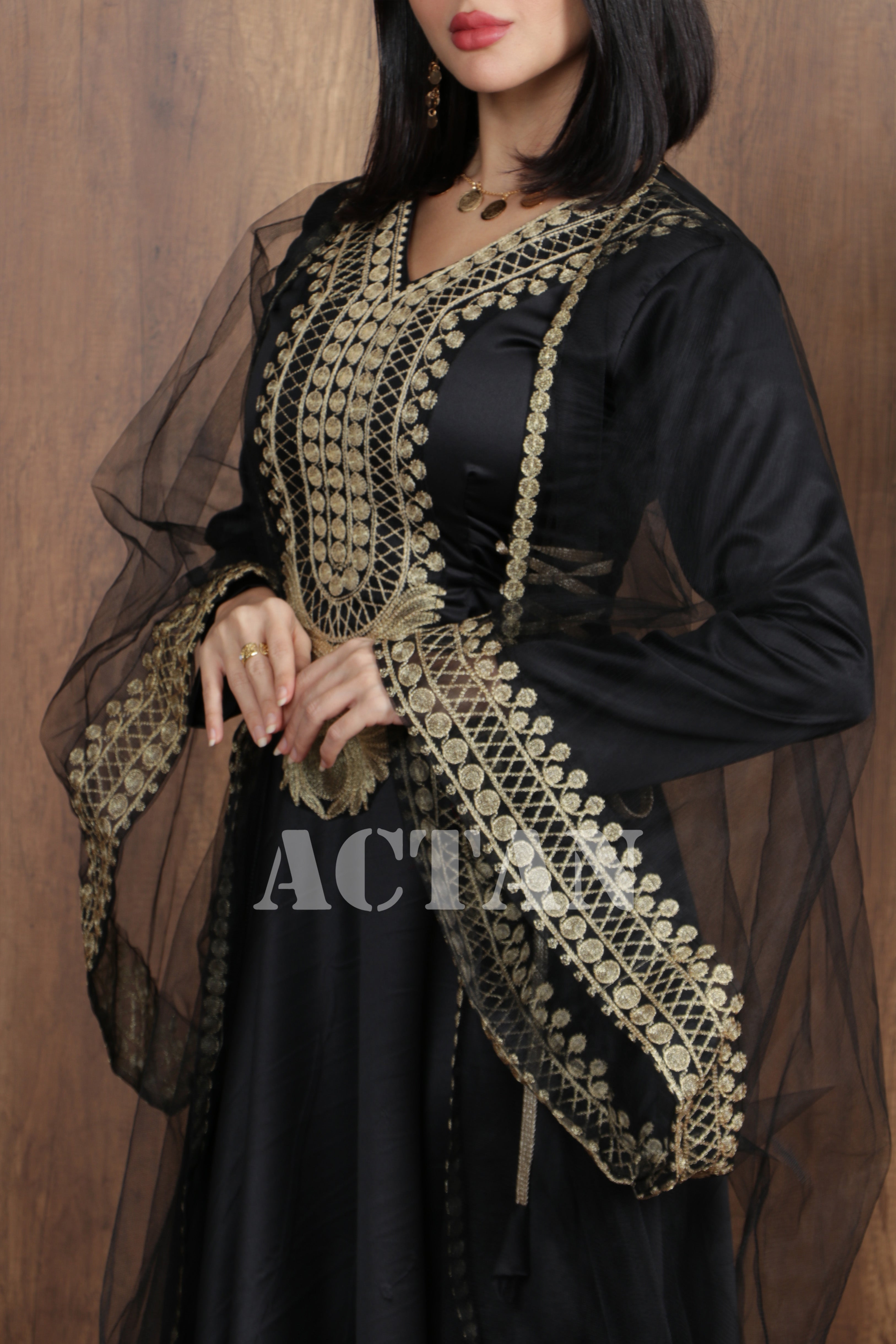 نوع القصة: جلابية طويلة مطرزة برباط جانبي مع رداء تل وأكمام طويلة بياقة على شكل V