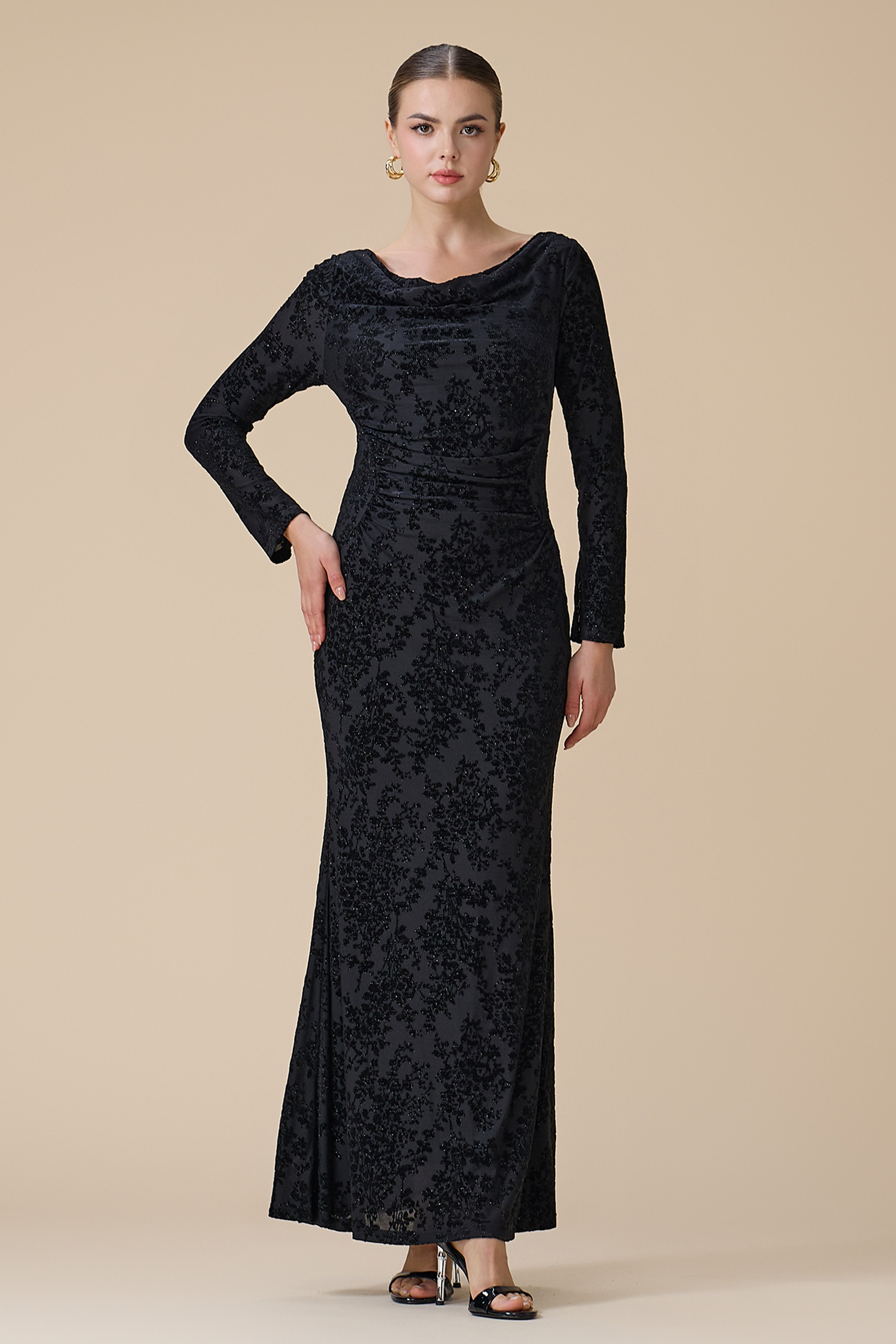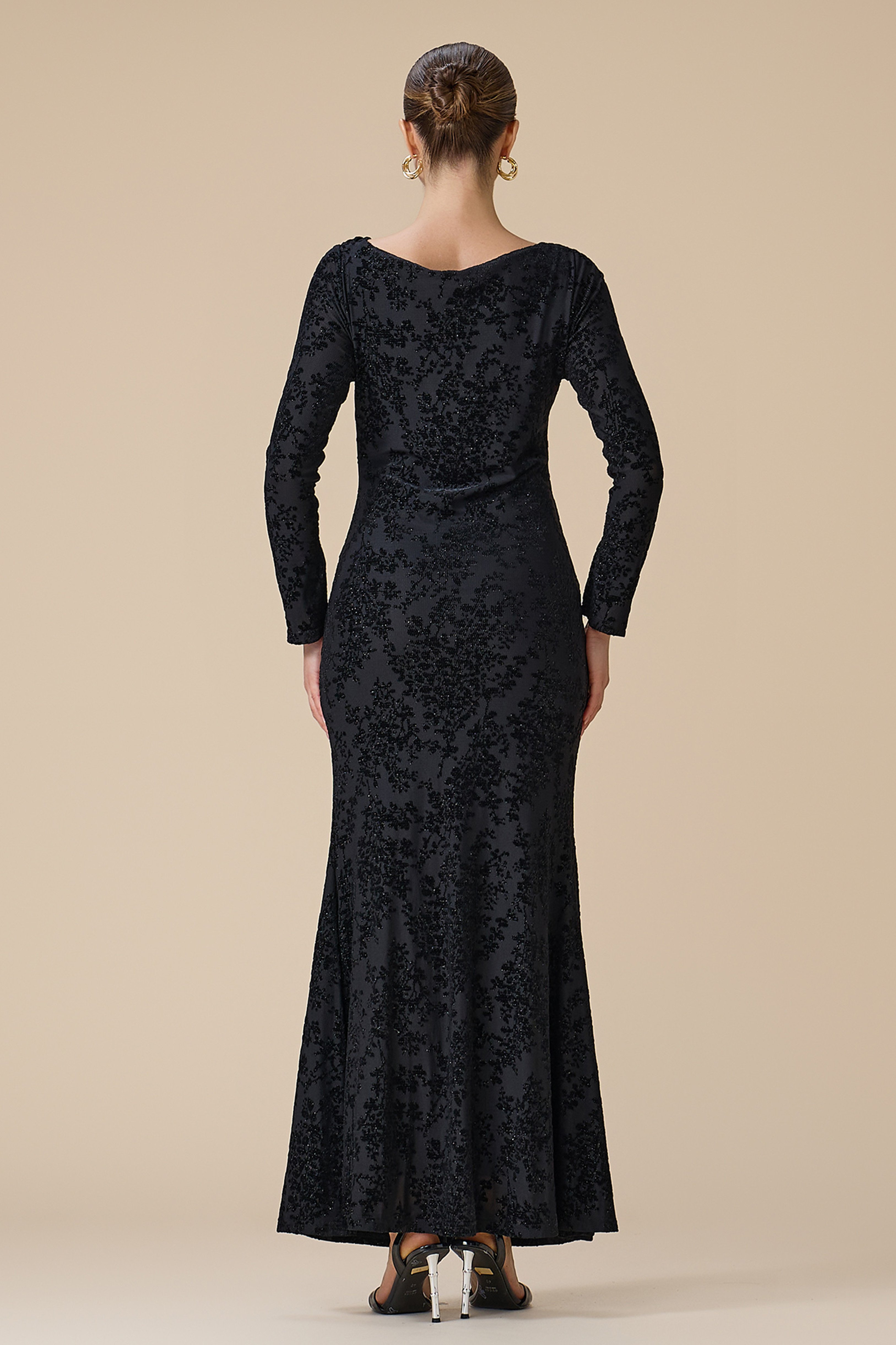 فستان طويل من المخمل الأسود المشجّر بقصة مخصّرة وتمدد مريح، بياقة درابيه مستديرة وأكمام طويلة