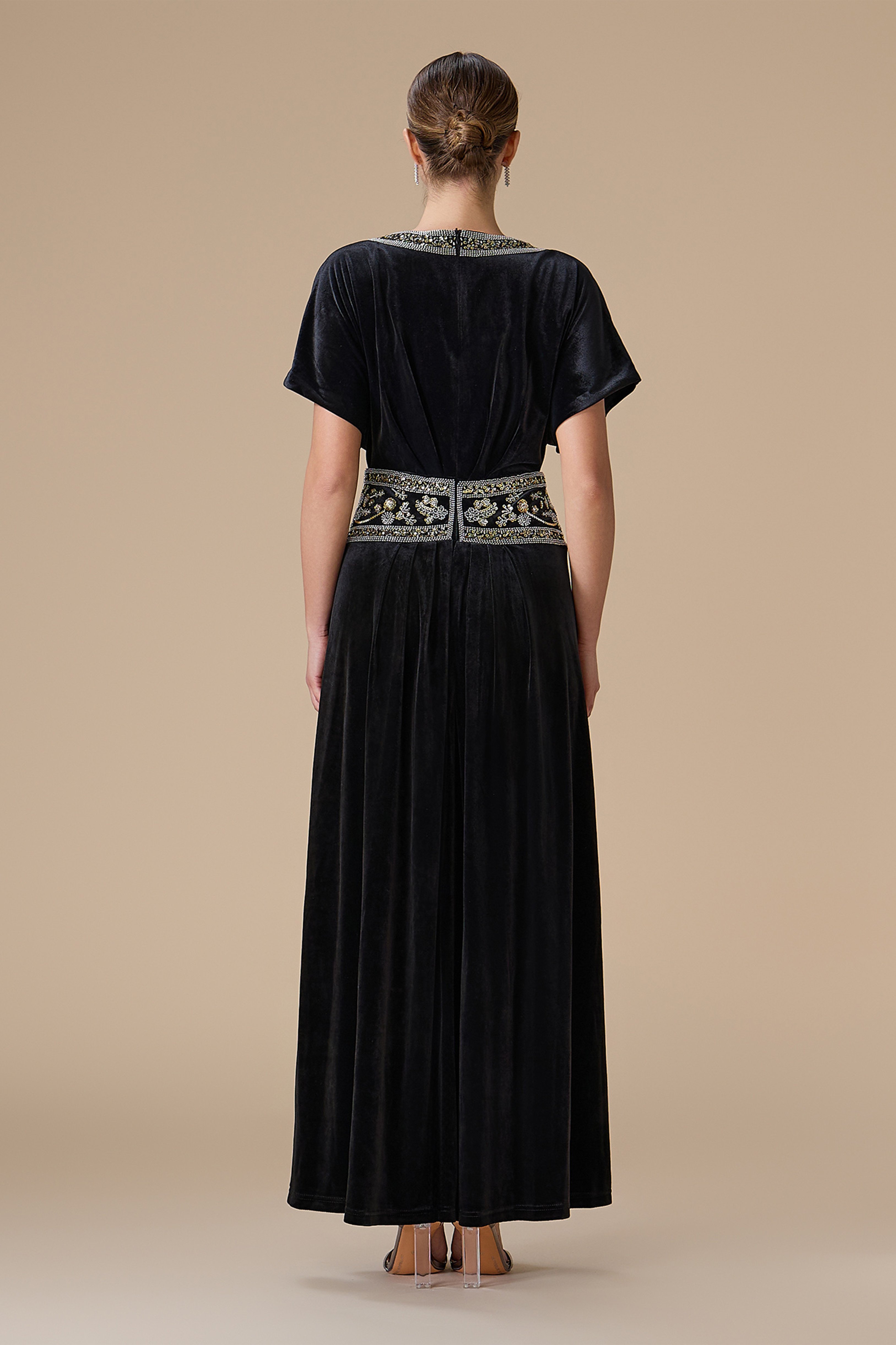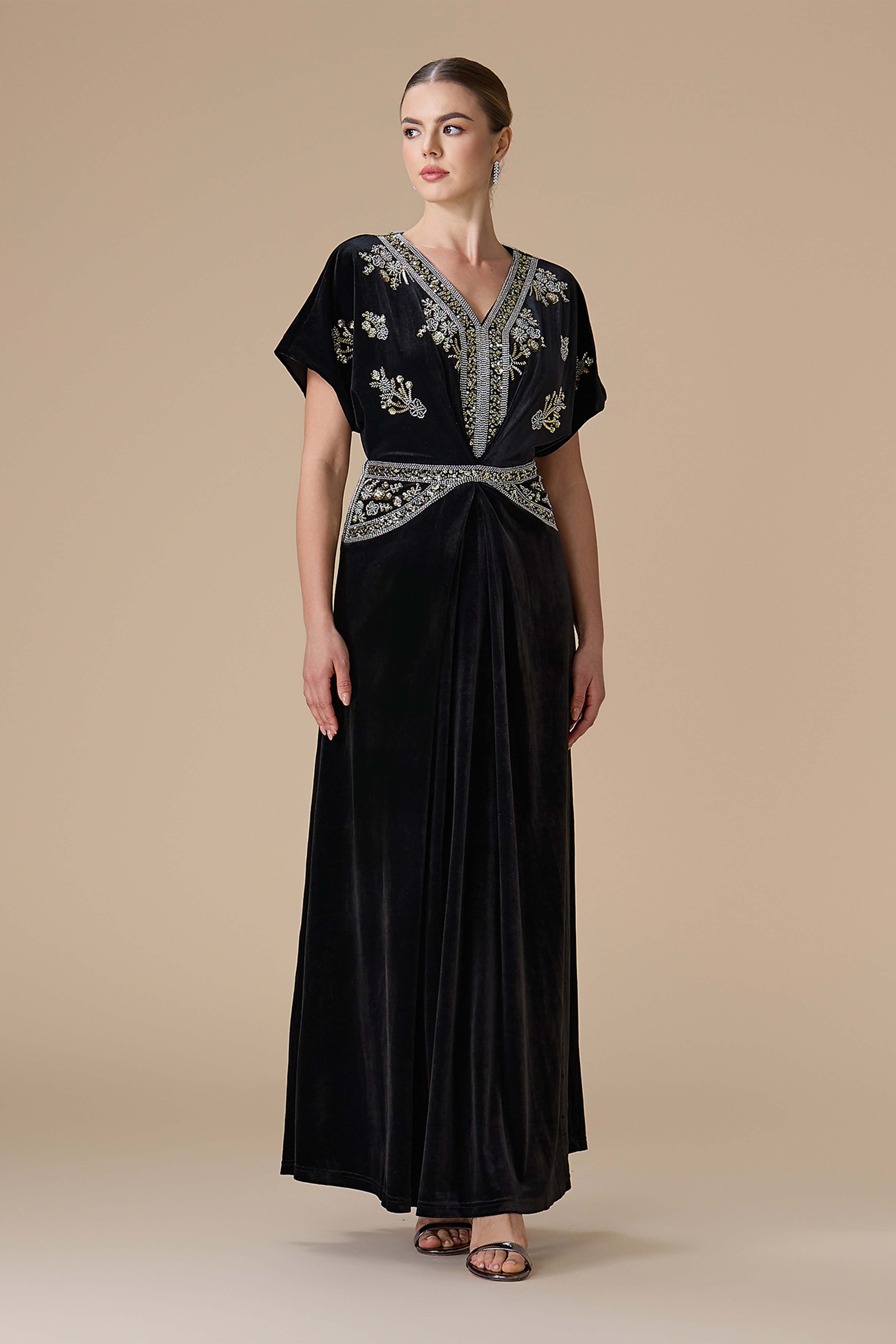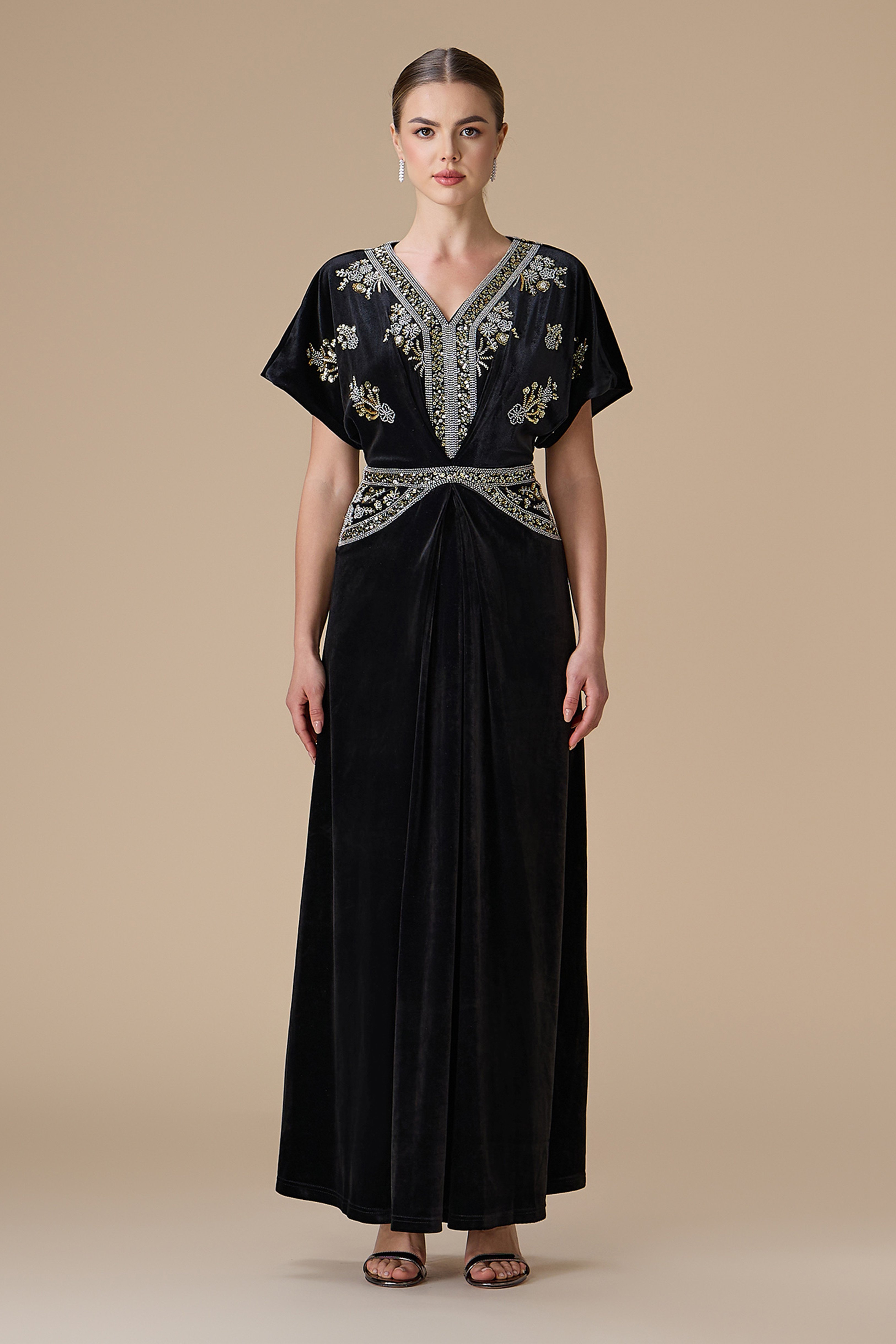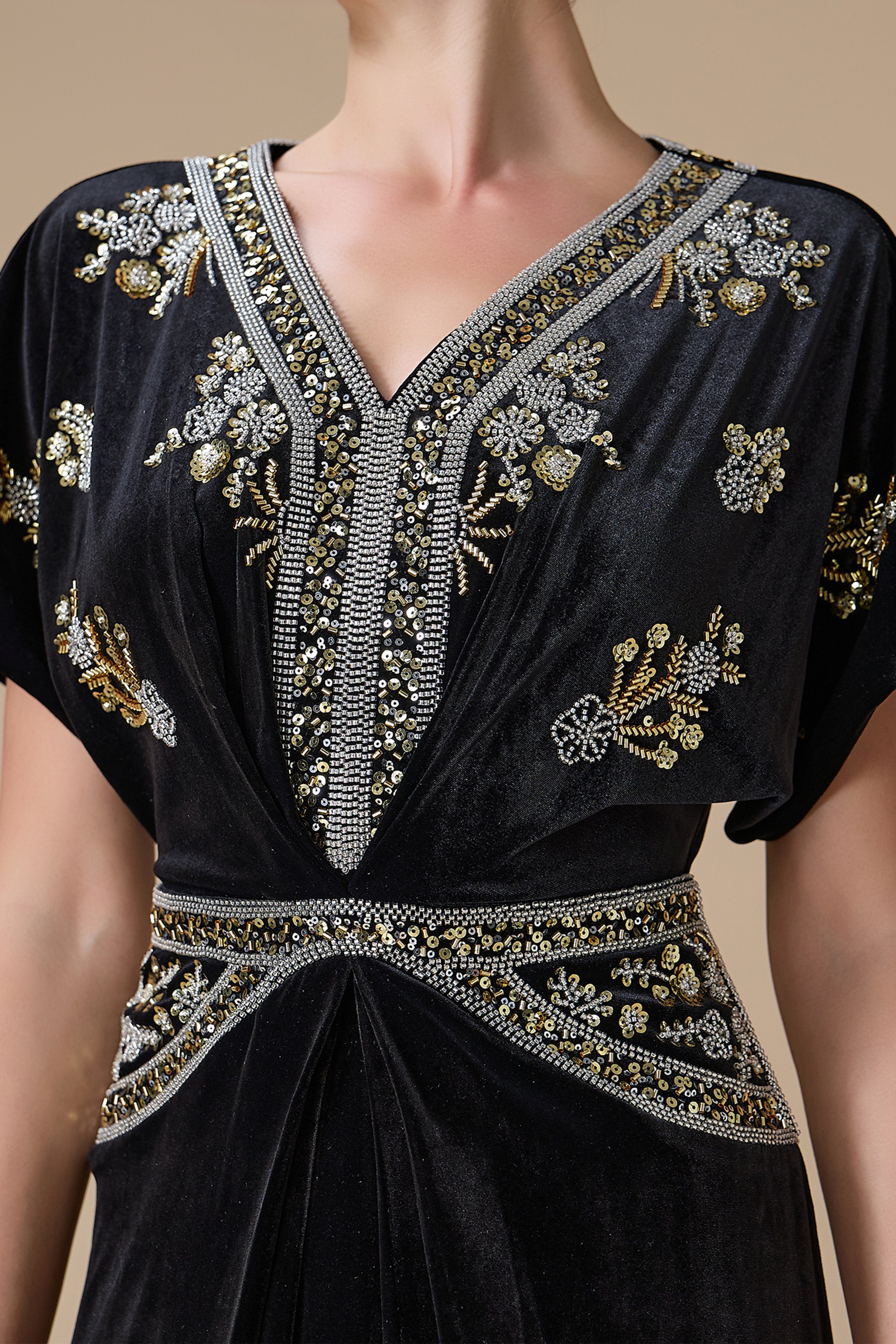 • نوع القصة: فستان أسود طويل مخمل مزين بتطريزات موردة بأكمام قصيرة واسعة بكسر ناعمة