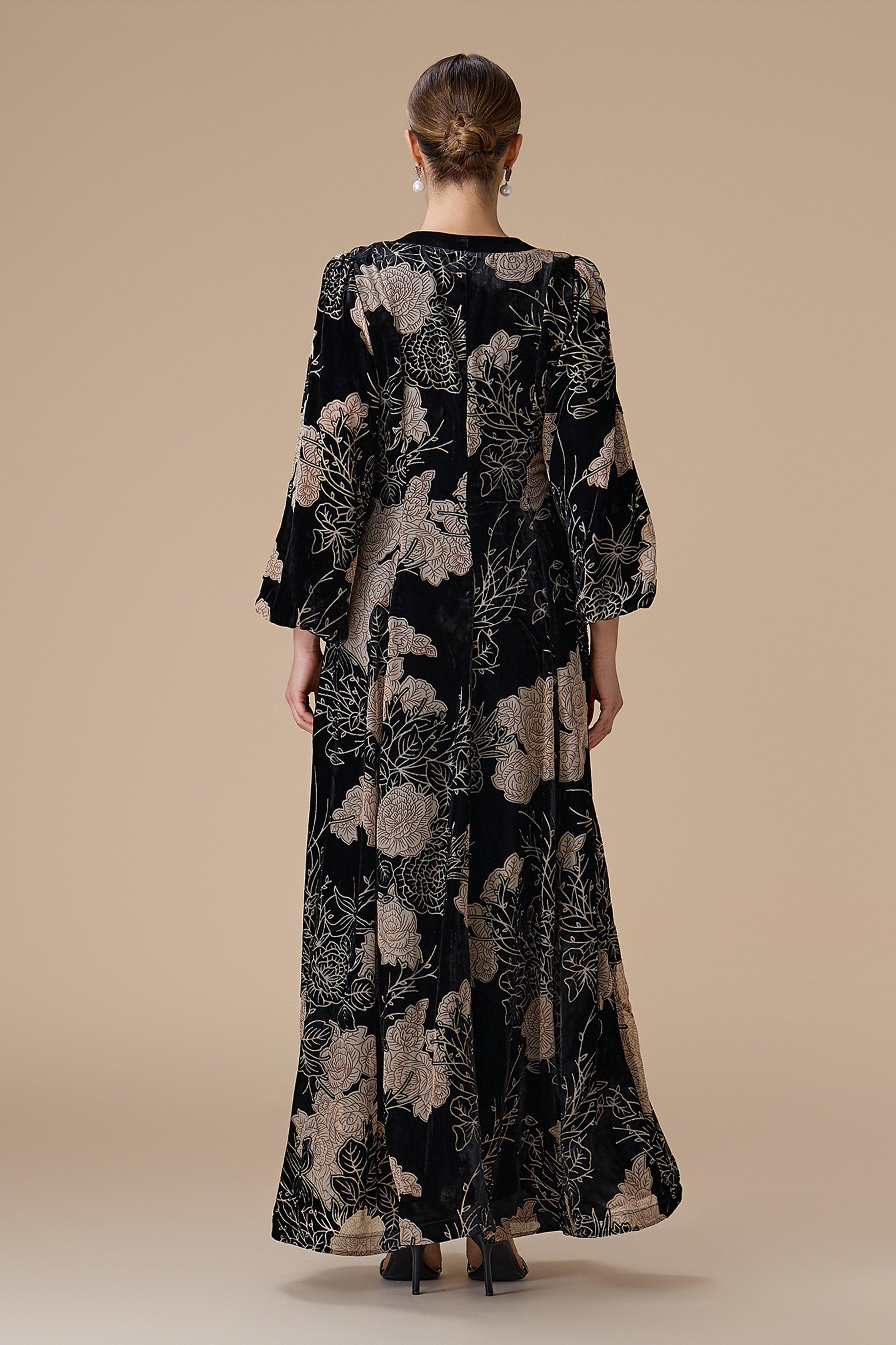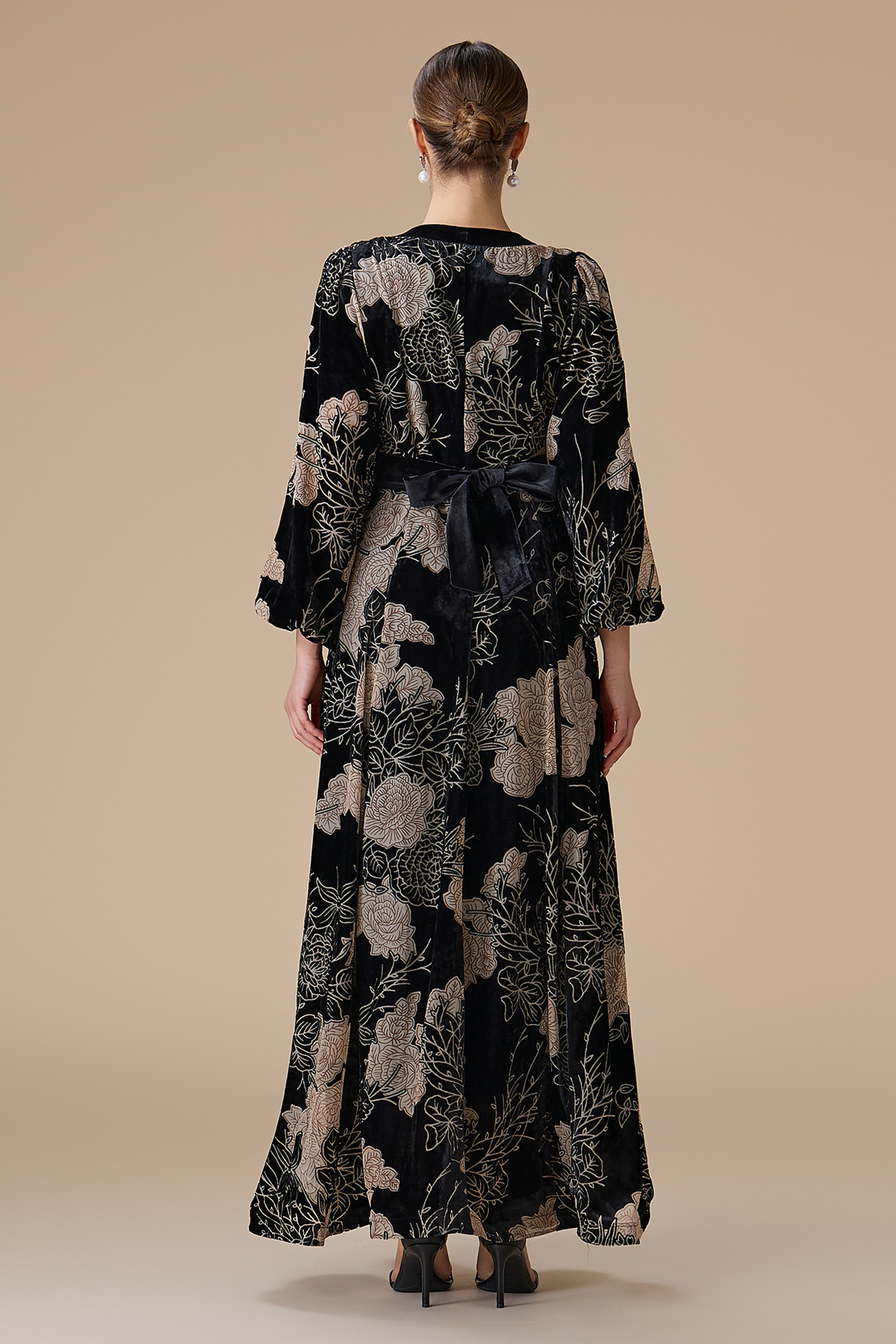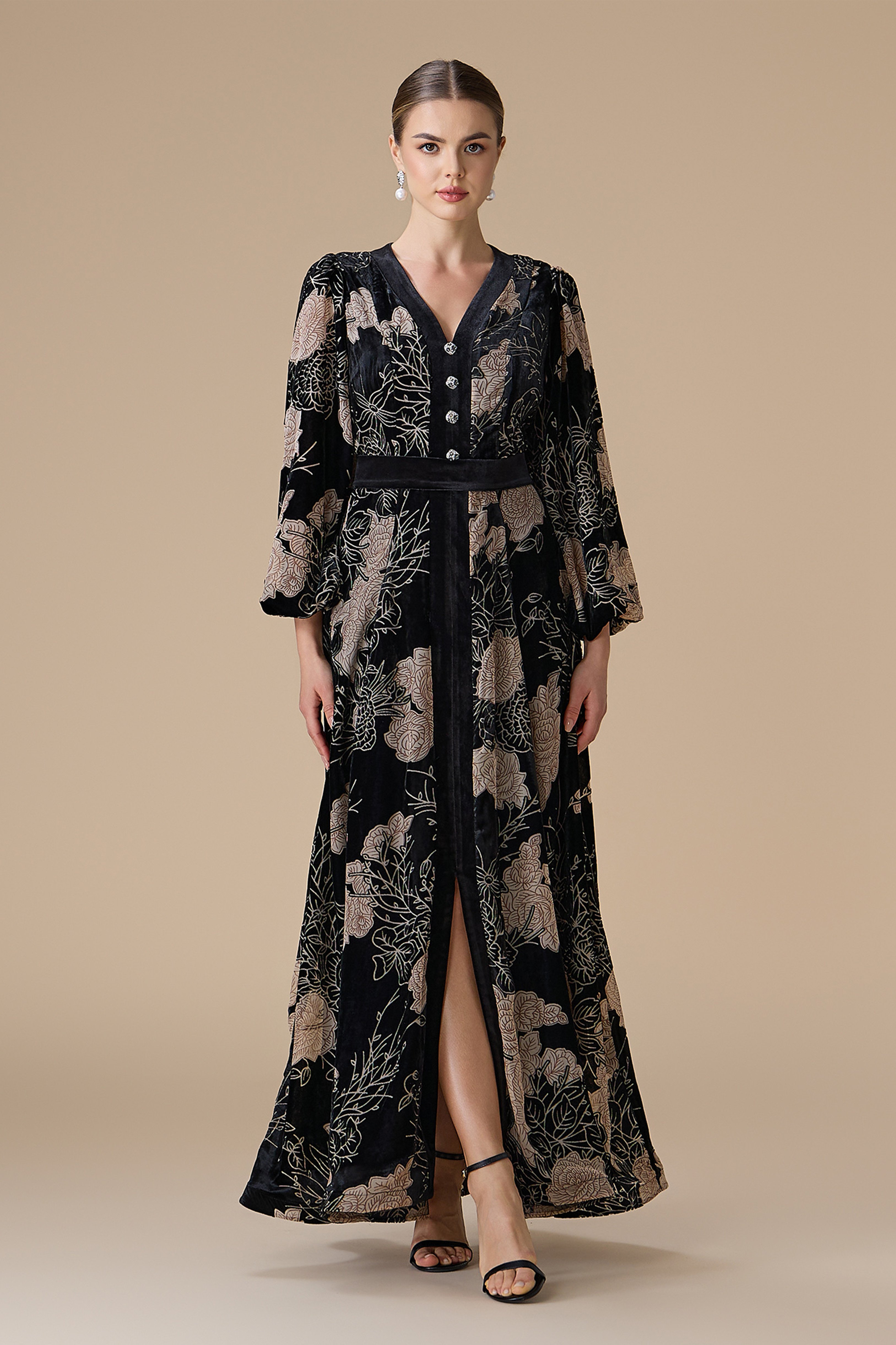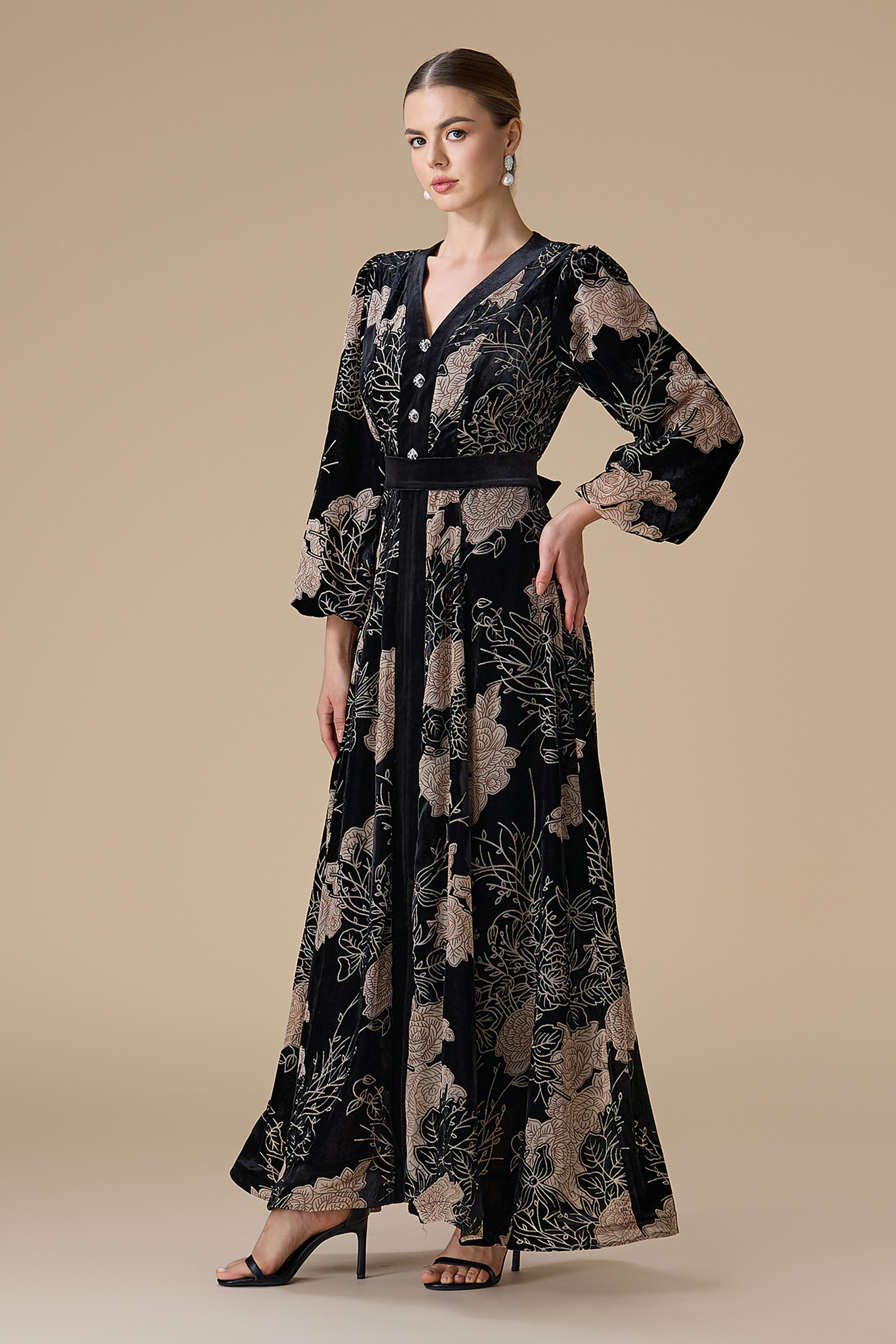 فستان طويل من المخمل الأسود بطبعة ورود، مزود بأزرار أمامية وحزام يحدد الخصر، بياقة V وأكمام واسعة منفوخة