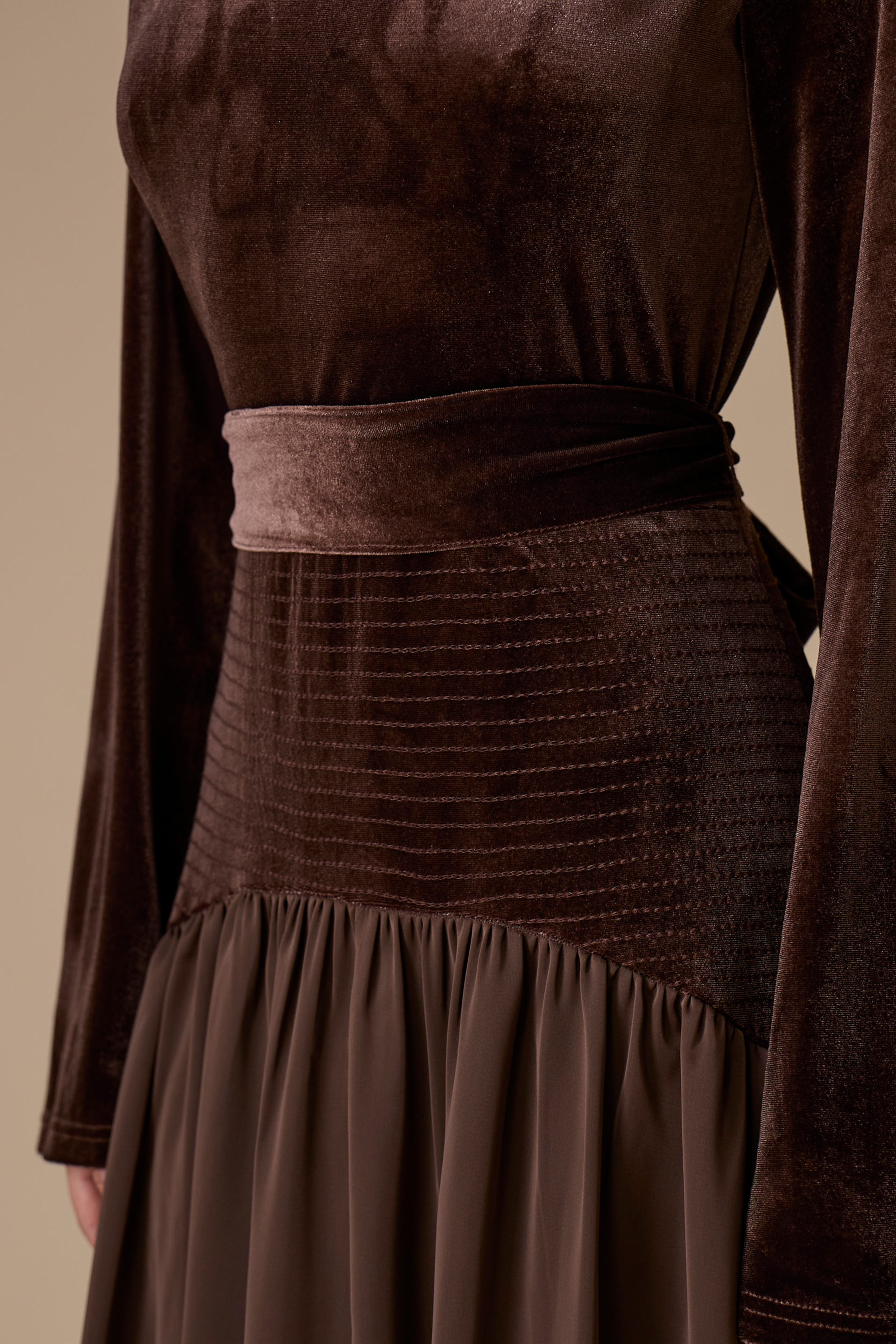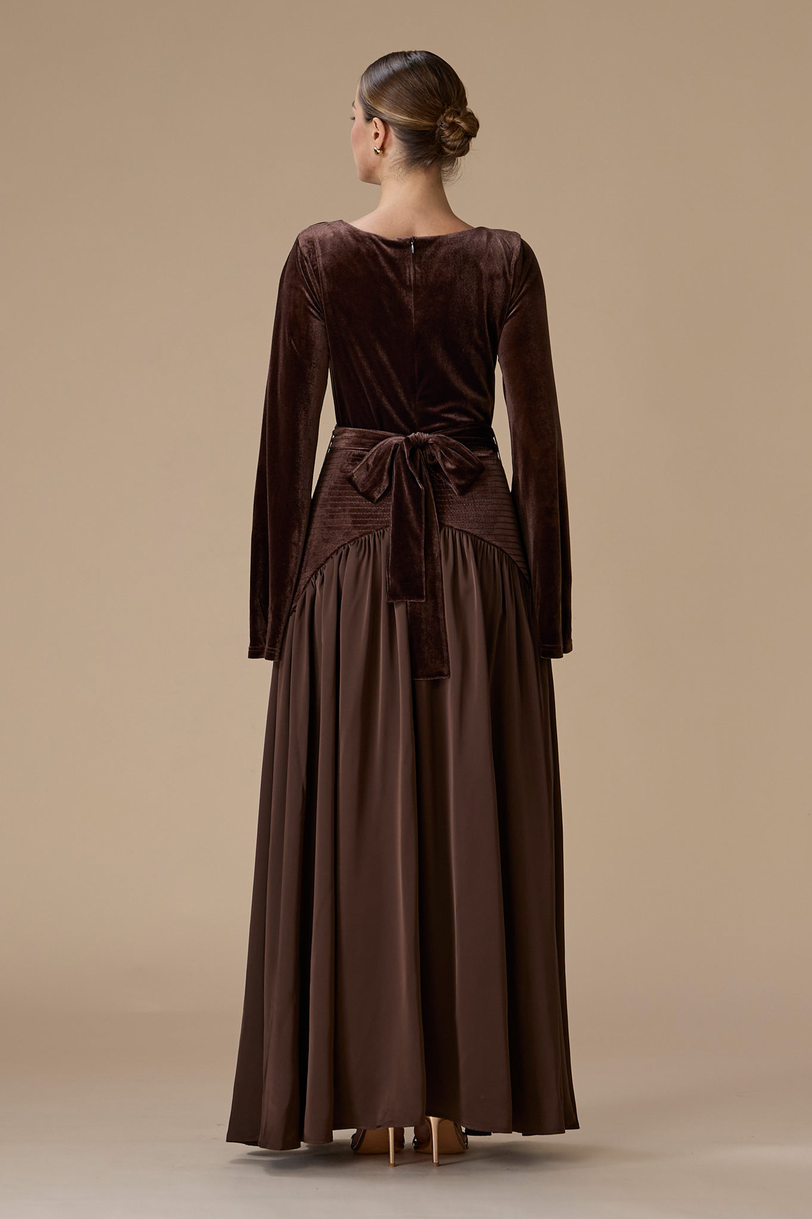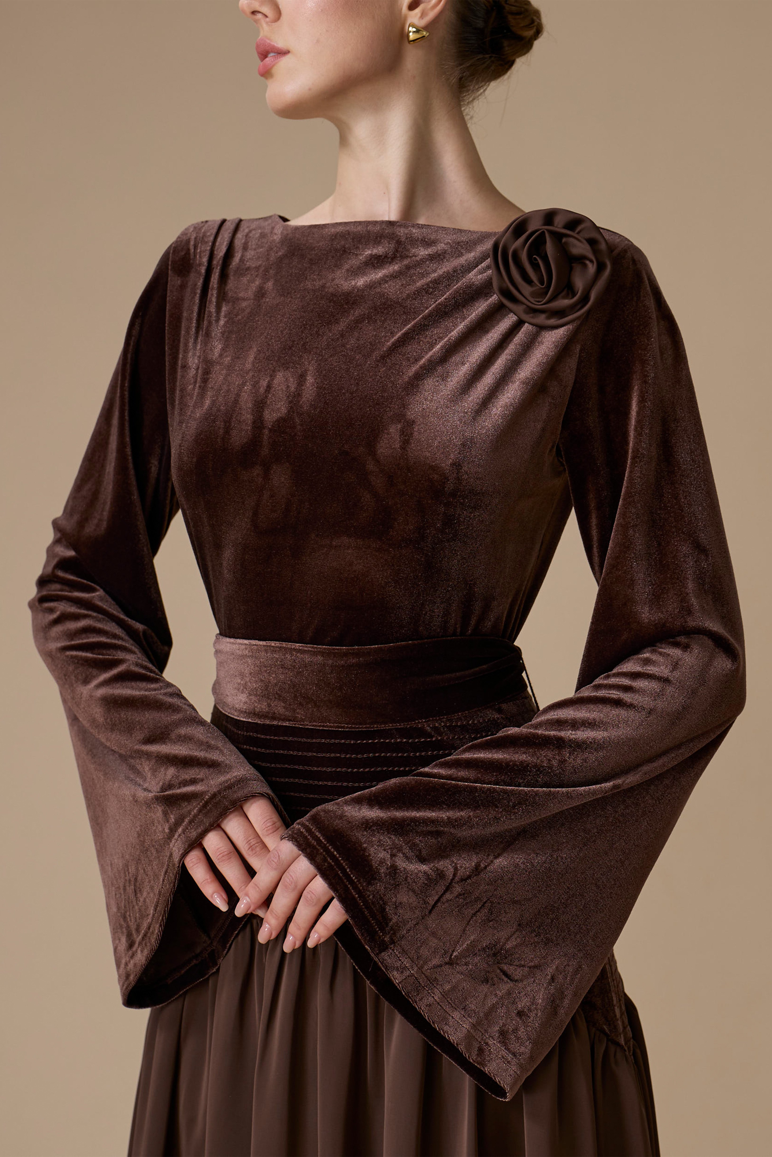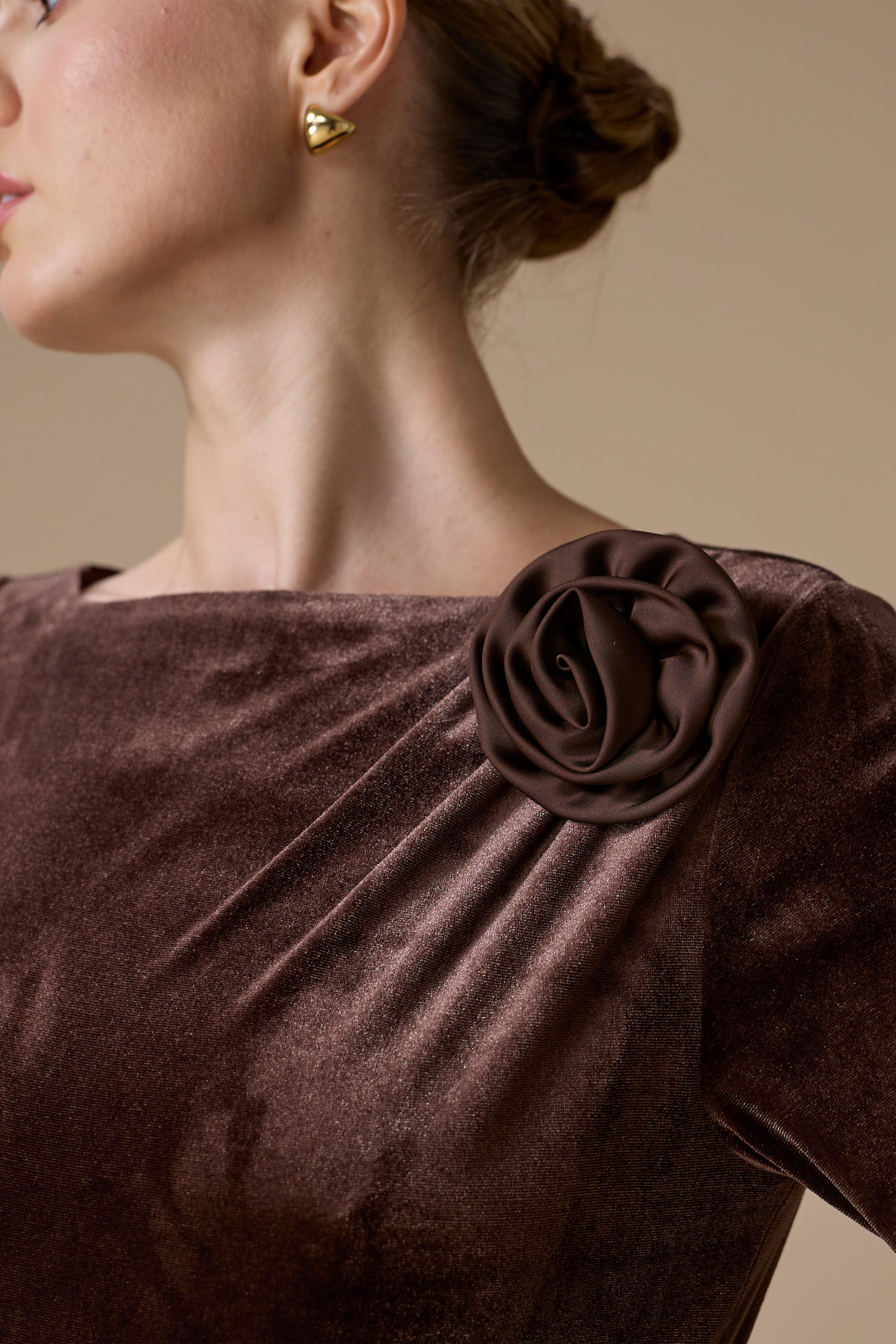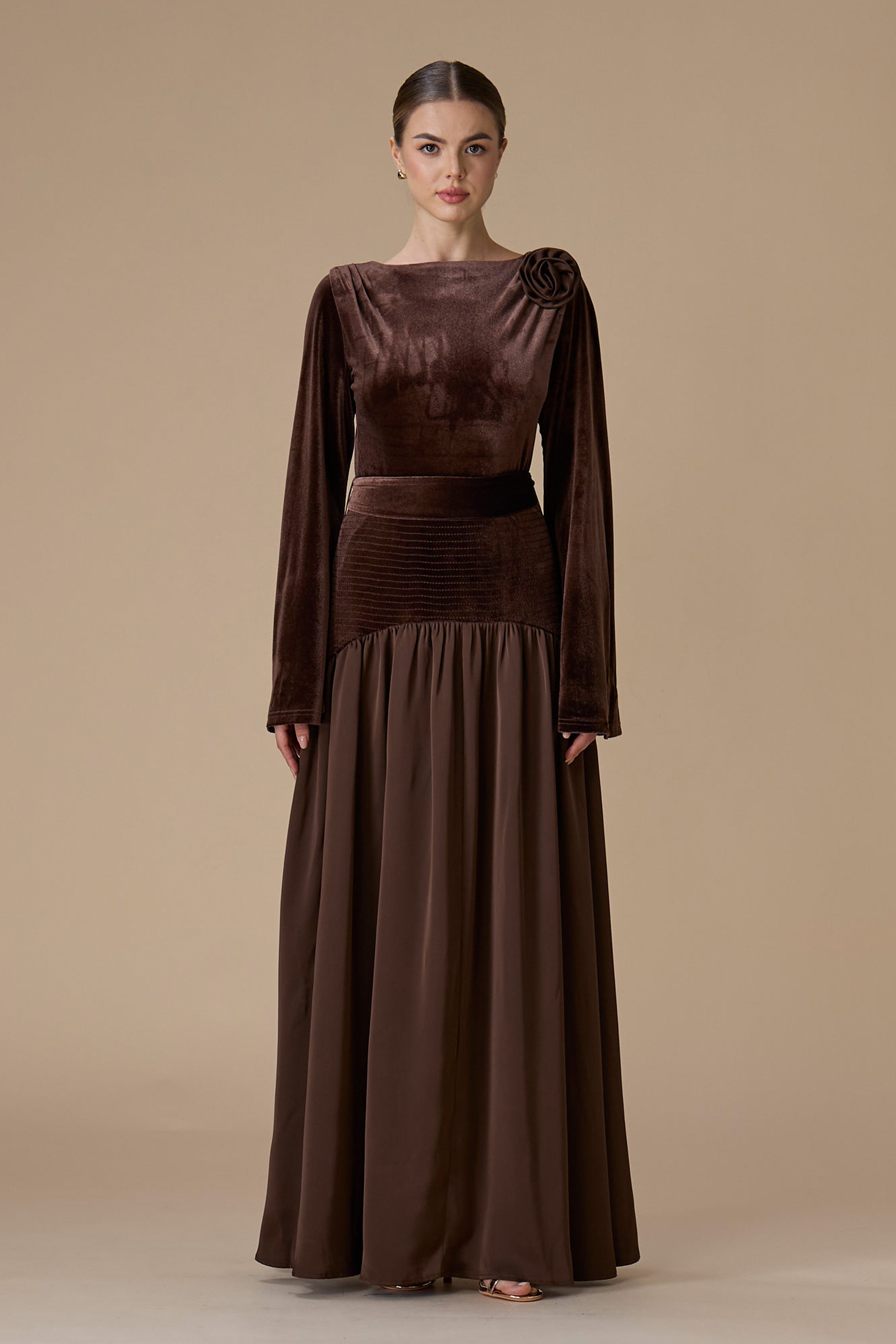فستان بني طويل انسيابي مزين بوردة على الكتف، بأكمام طويلة وواسعة، بياقة دائرية مغلقة مع حزام عريض يحدد الخصر