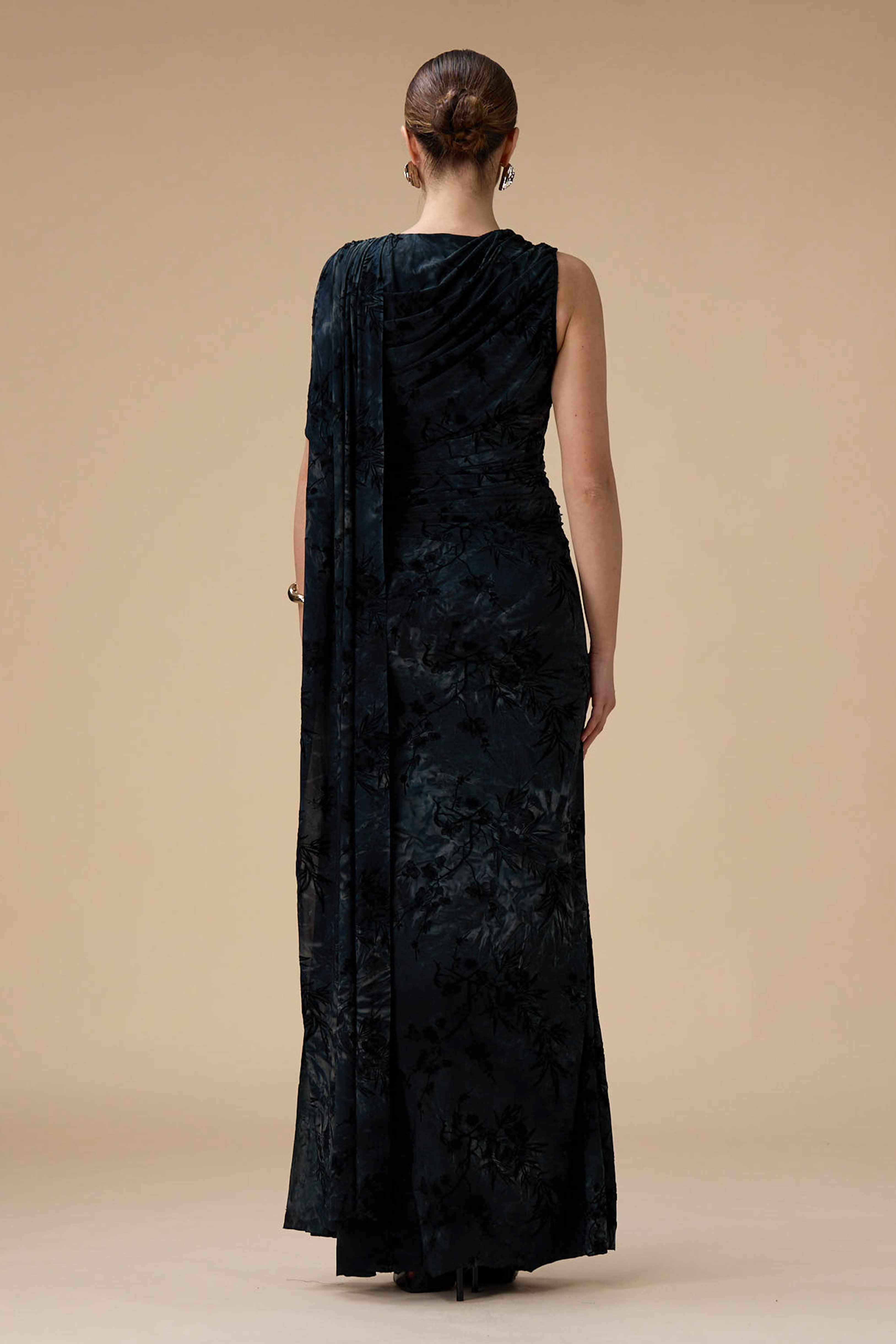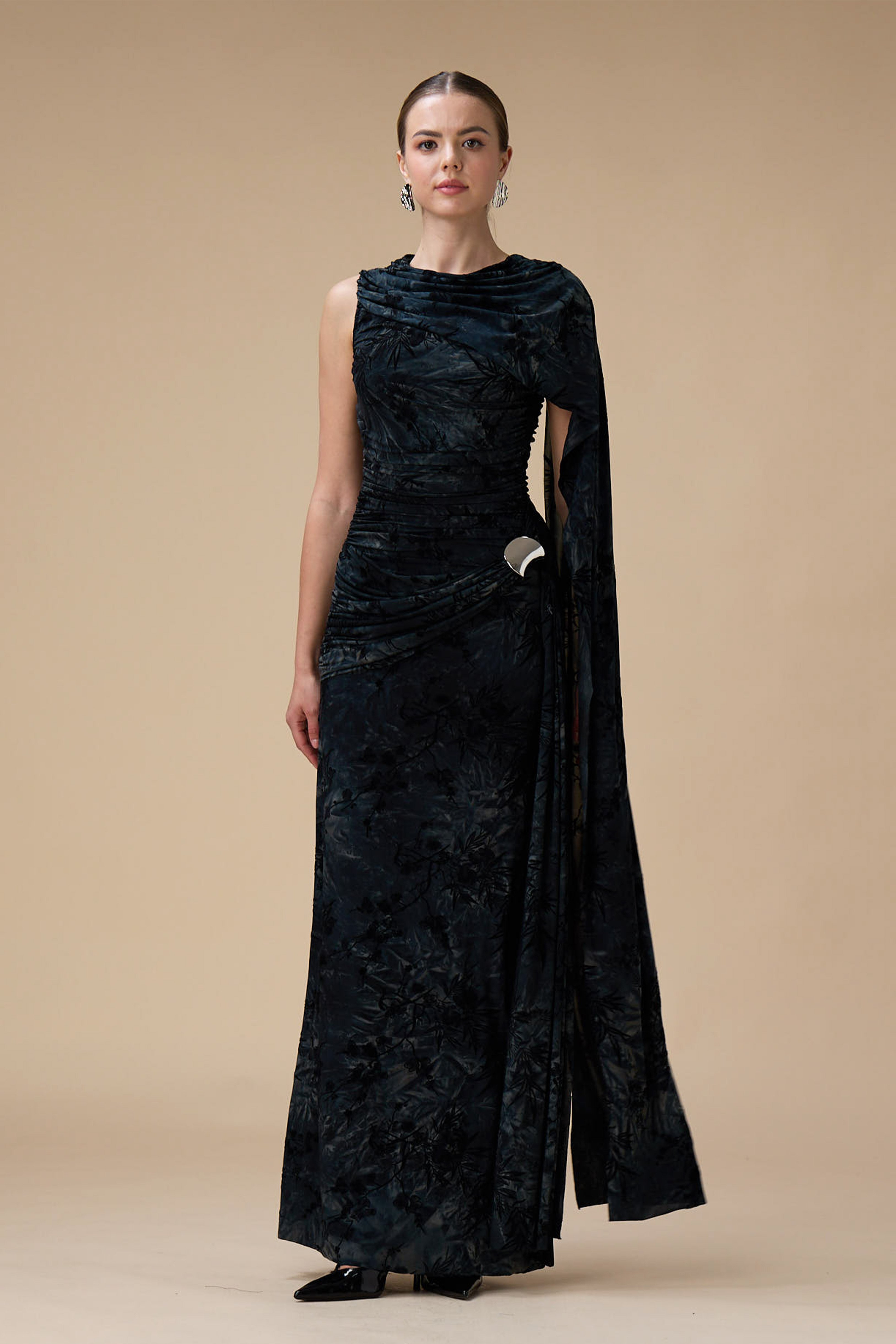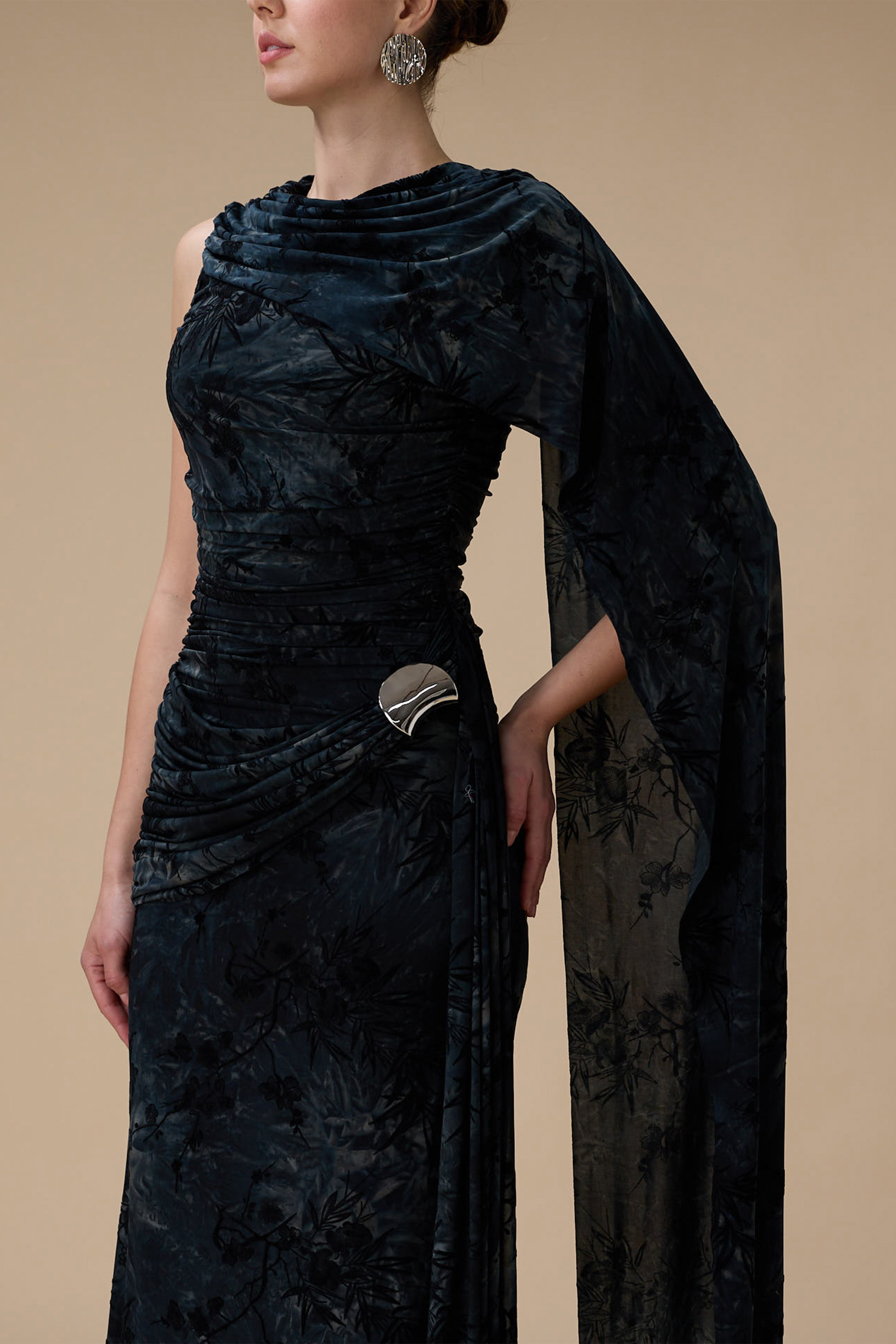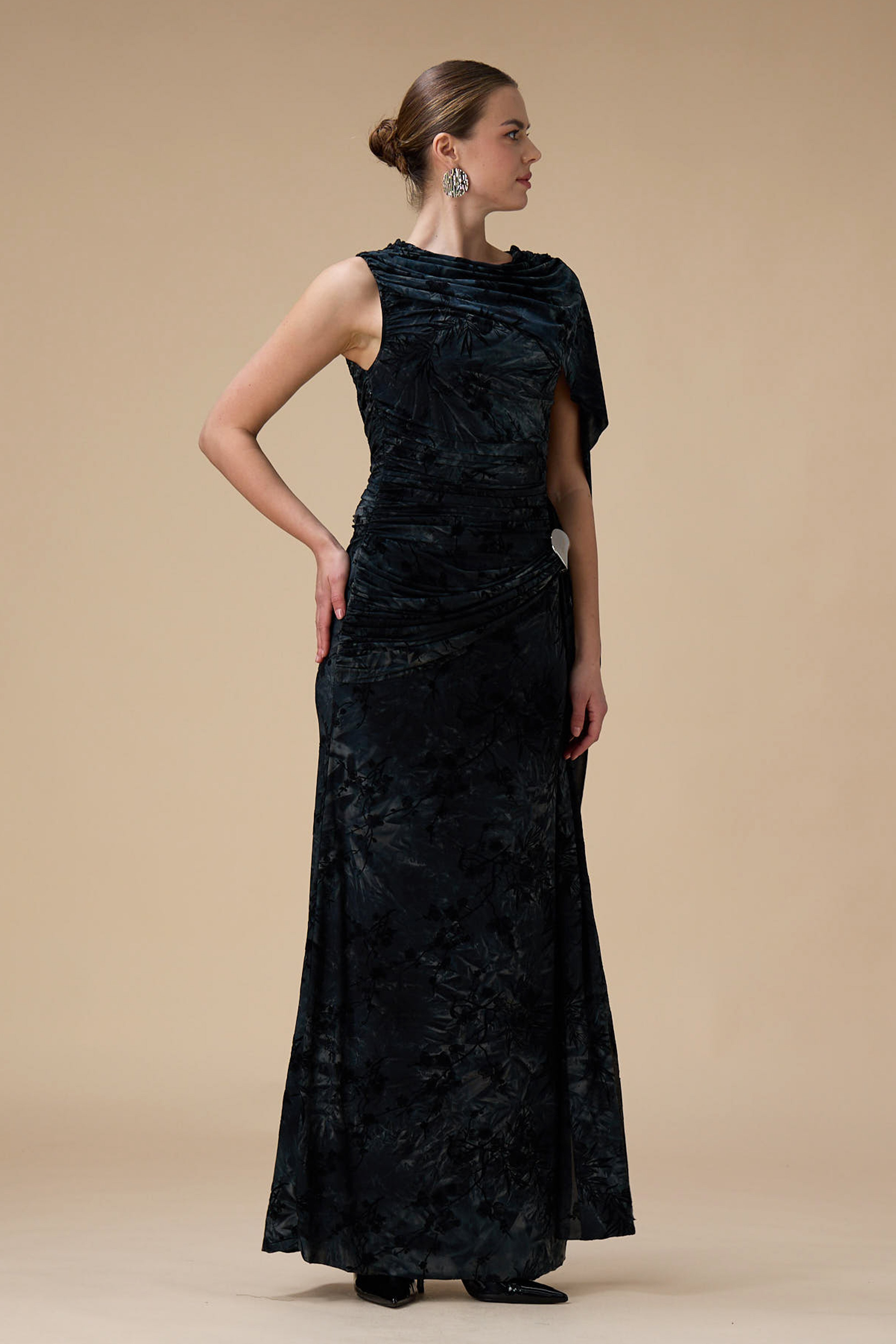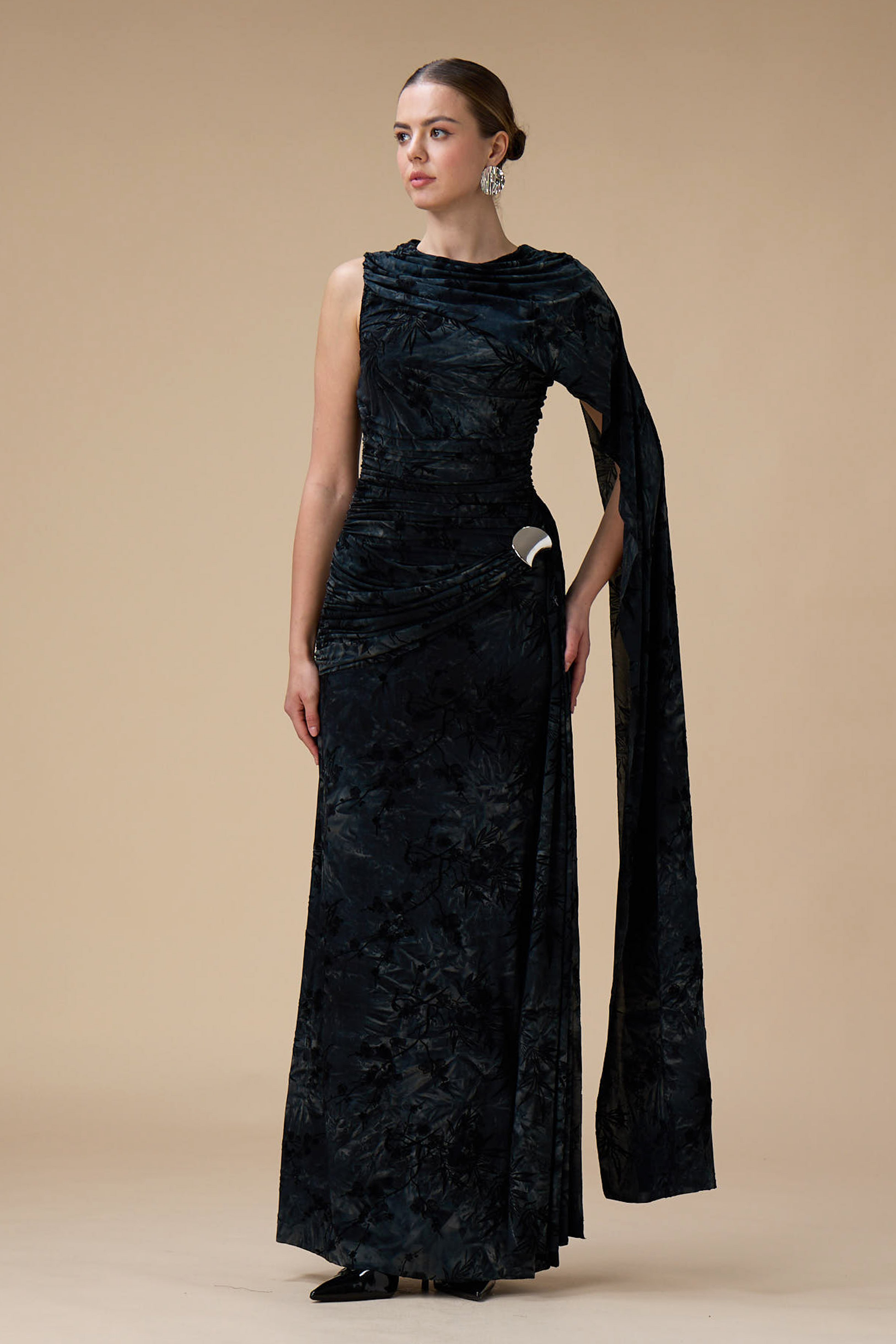 فستان أسود طويل مخملي بكتف واحد مع شال جانبي