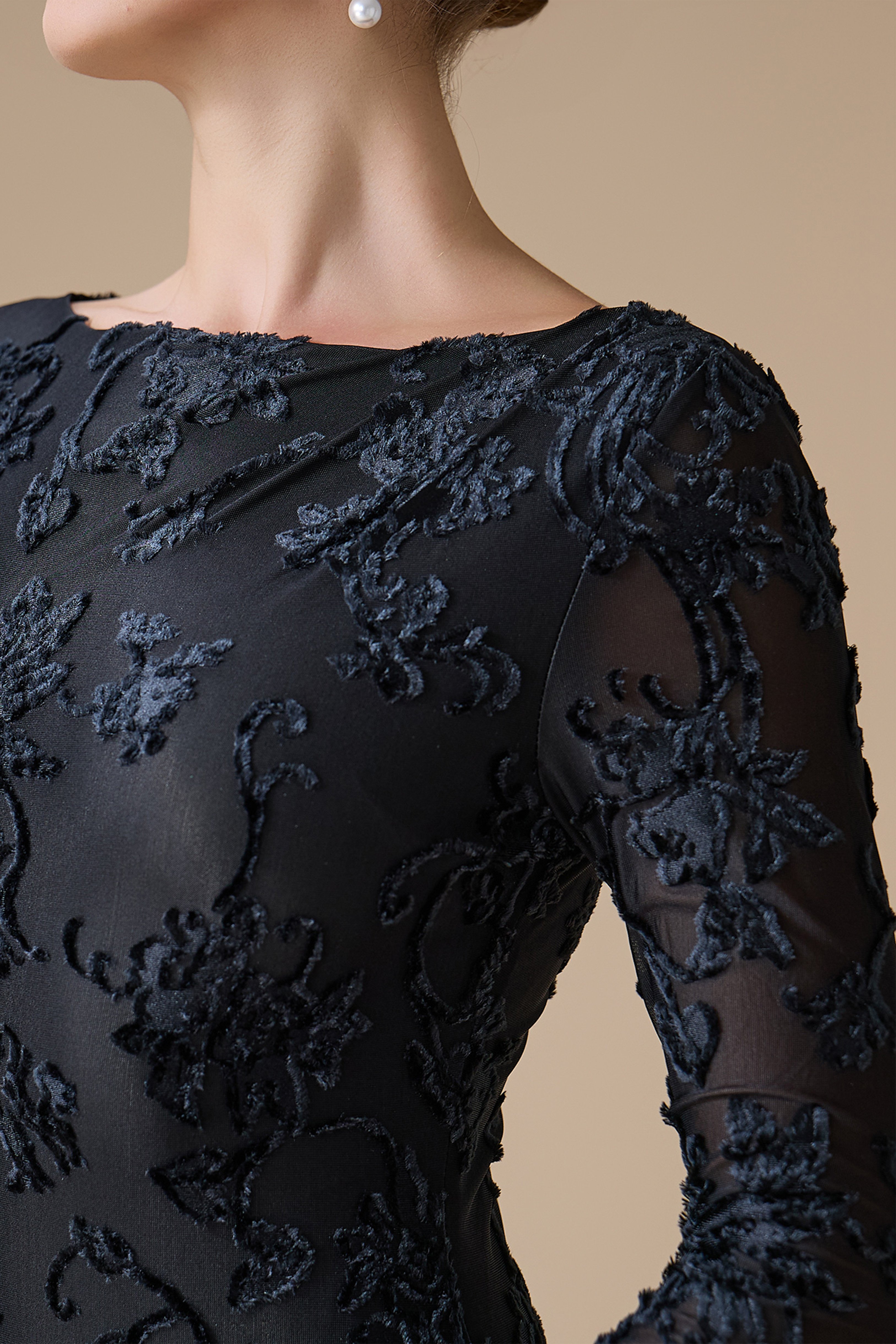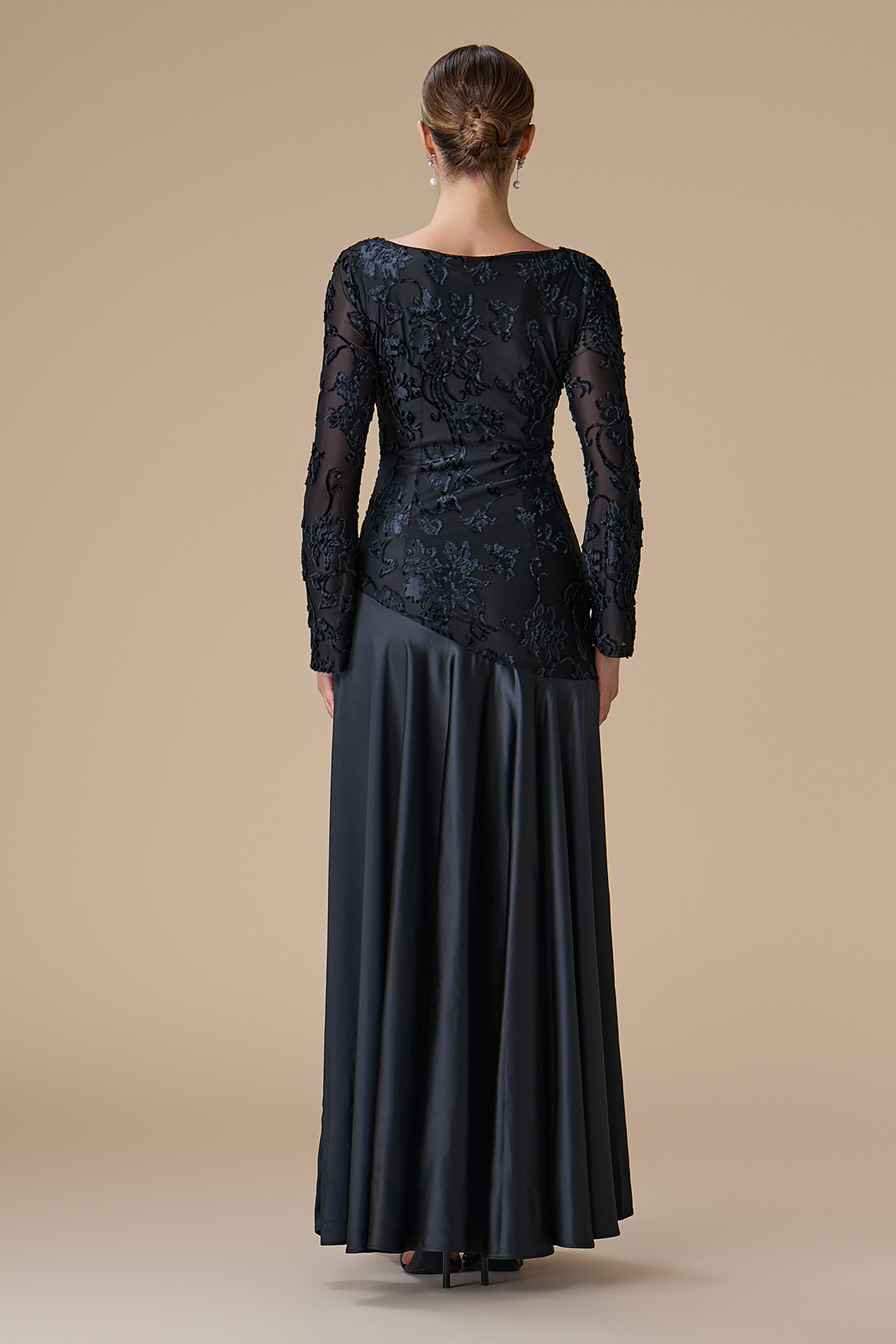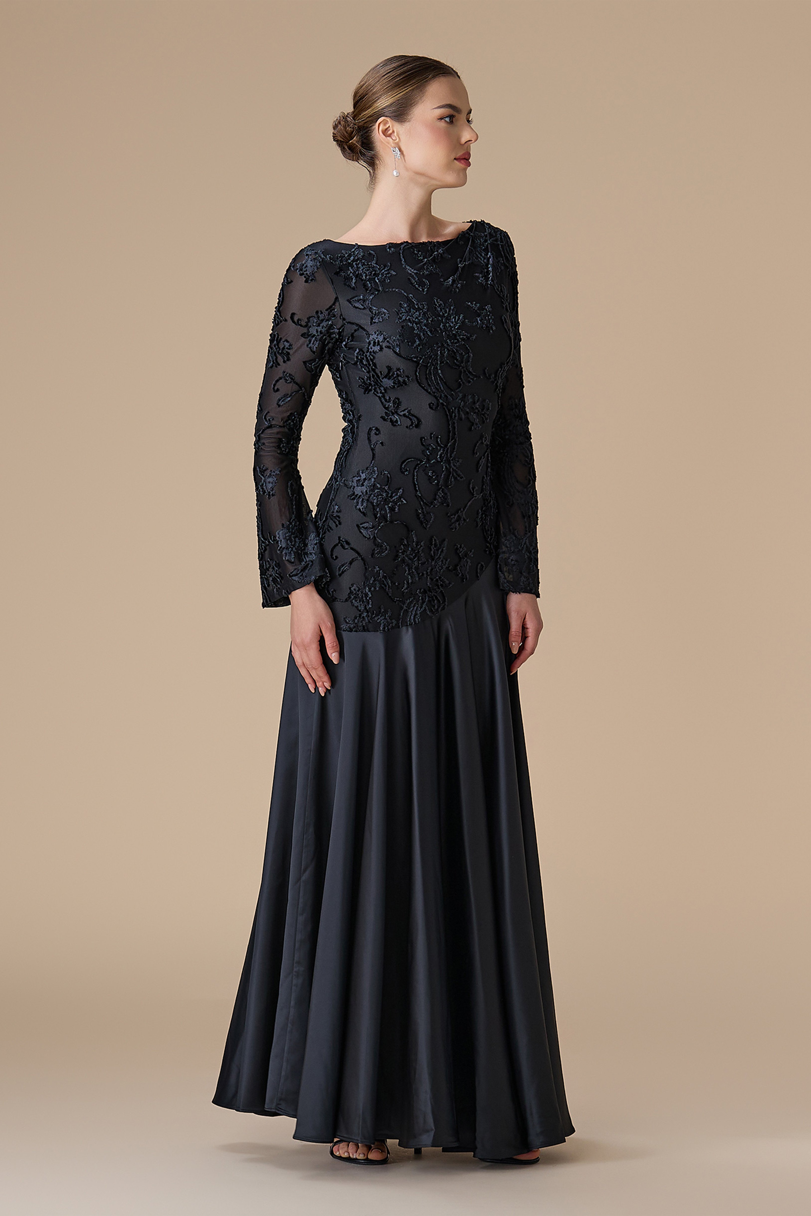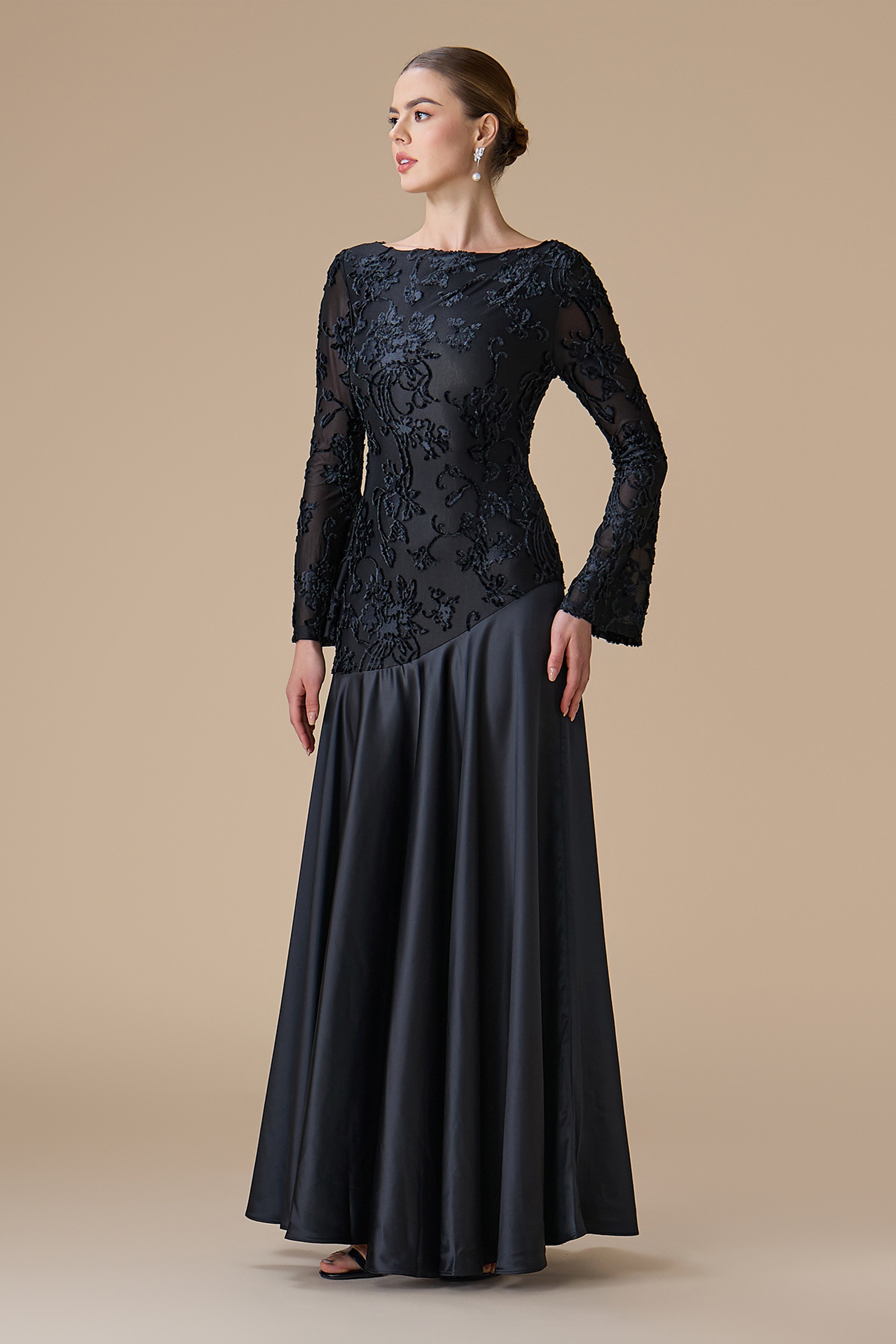 • نوع القصة: فستان طويل من المخمل والساتان بقصة A-Line مشجّرة، بياقة مستديرة، وأكمام طويلة ضيقة، مع خصر مخصّر وتمدد مريح