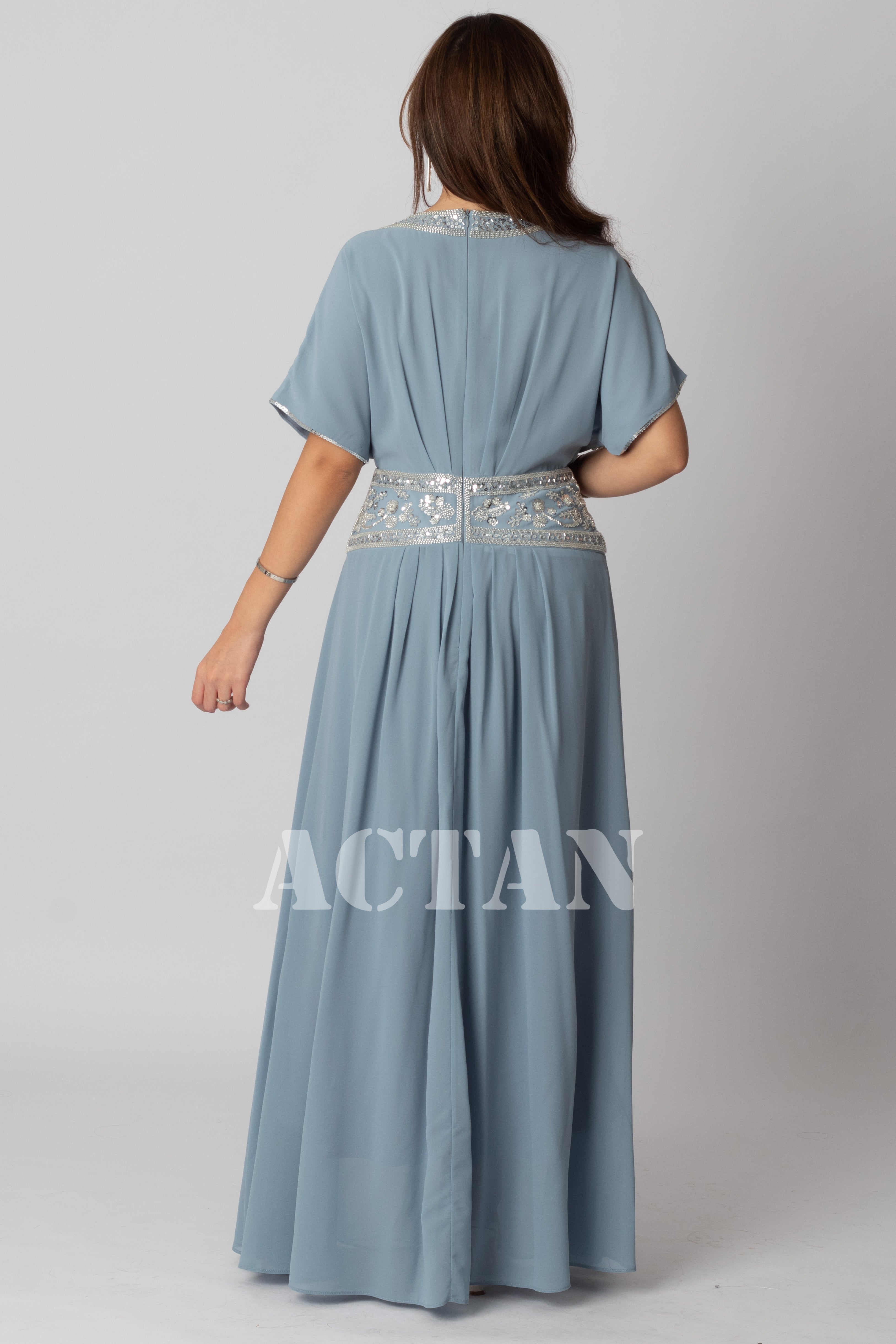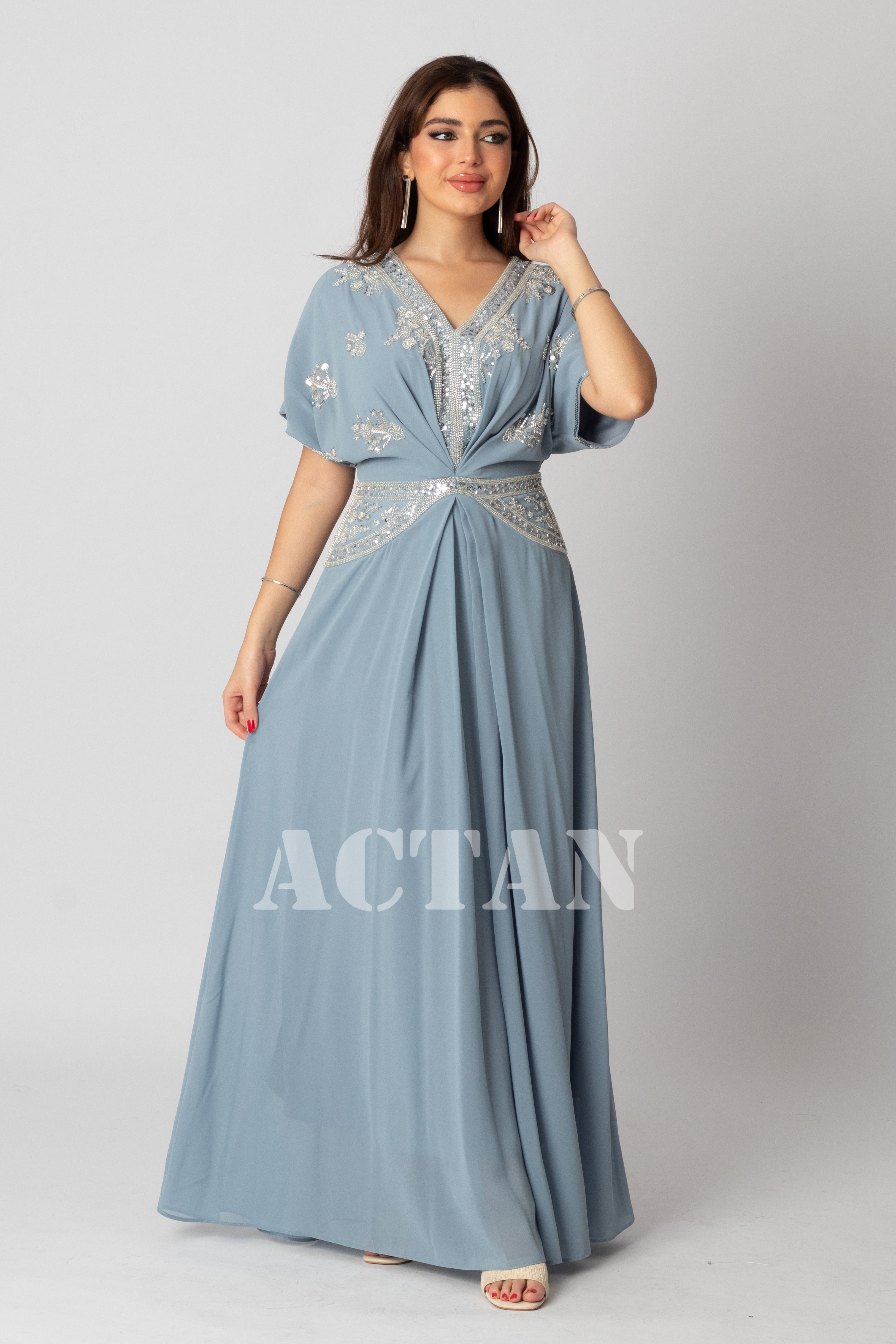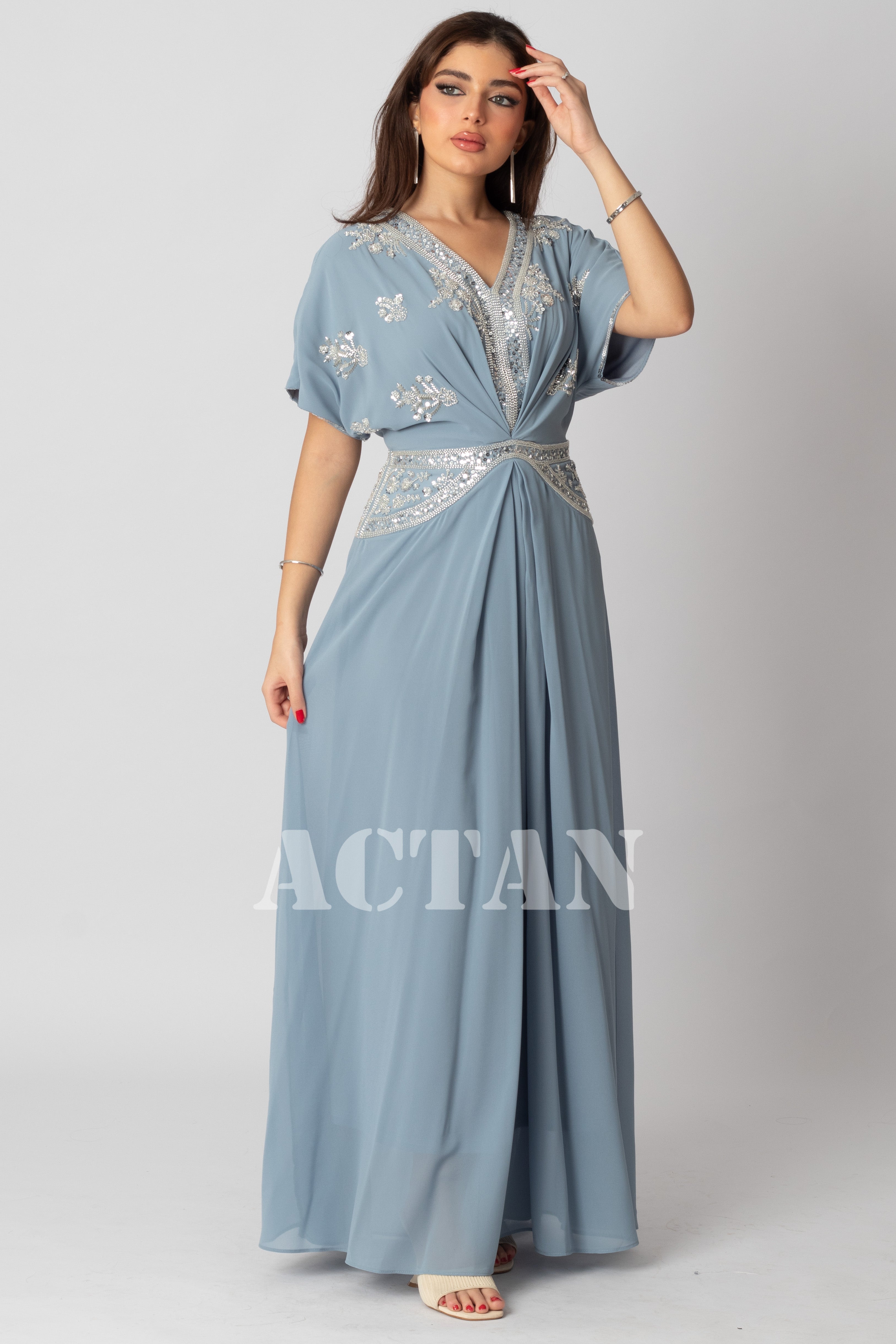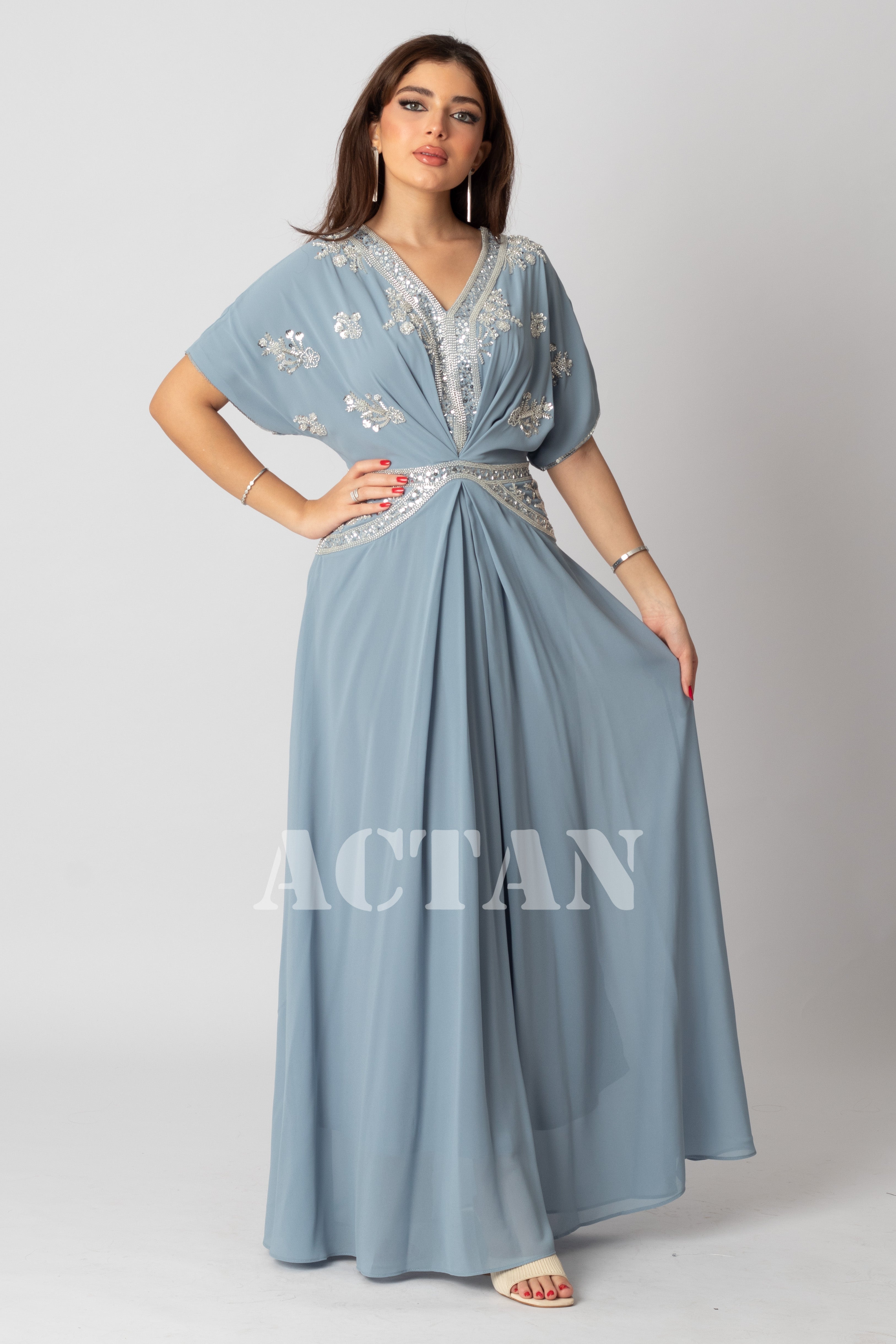 • نوع القصة: جلابية شيفون مزينة بترتر وخرز بأكمام قصيرة وياقة V